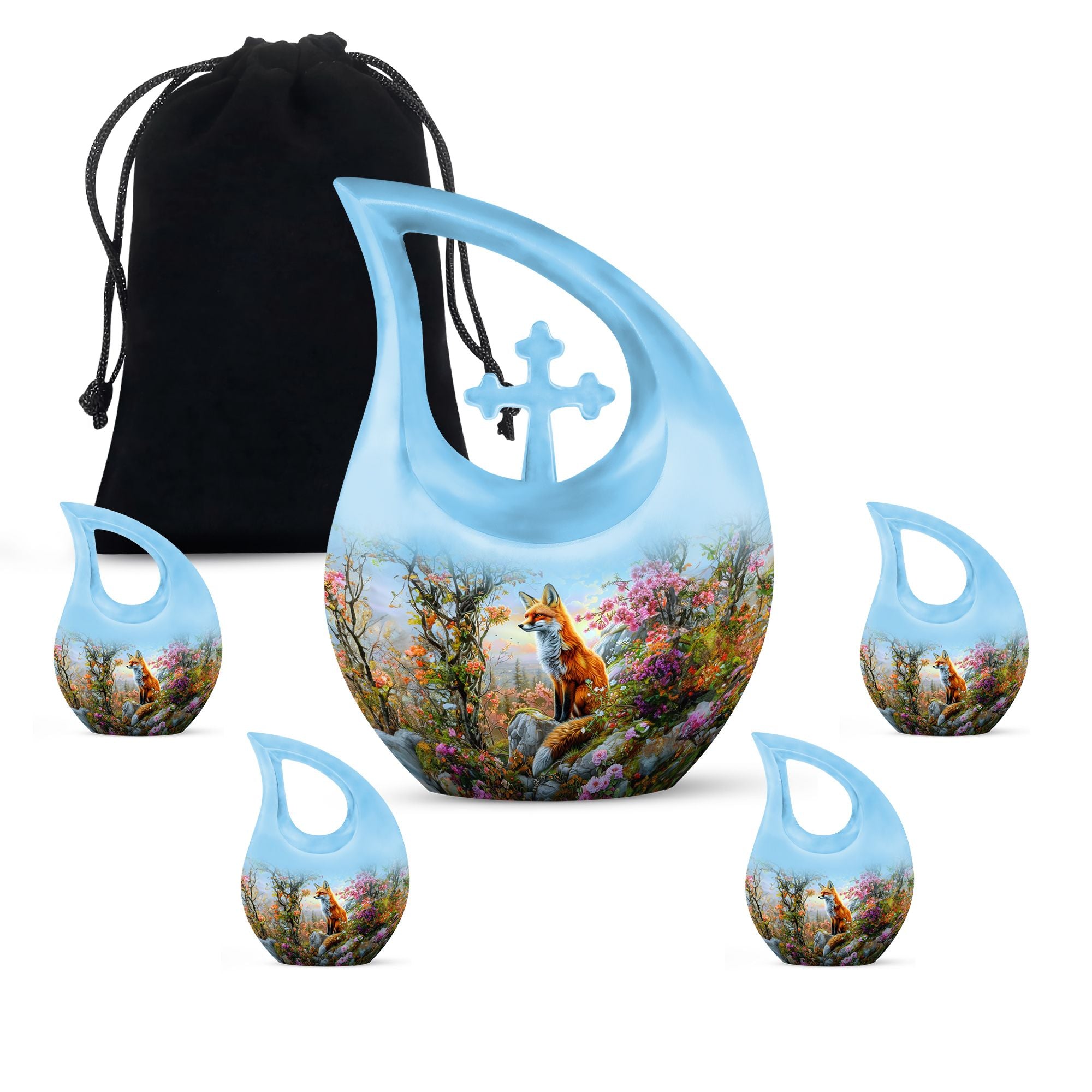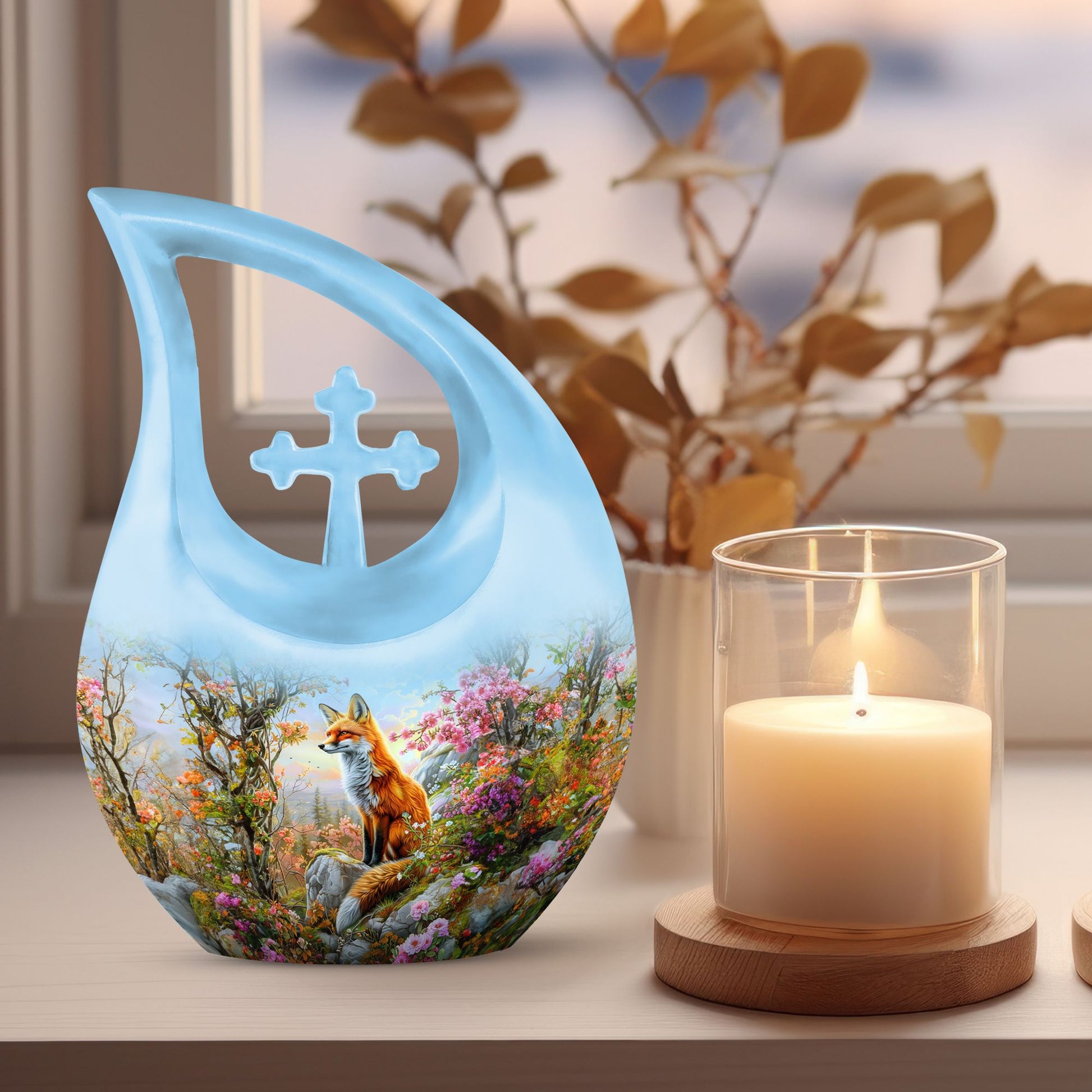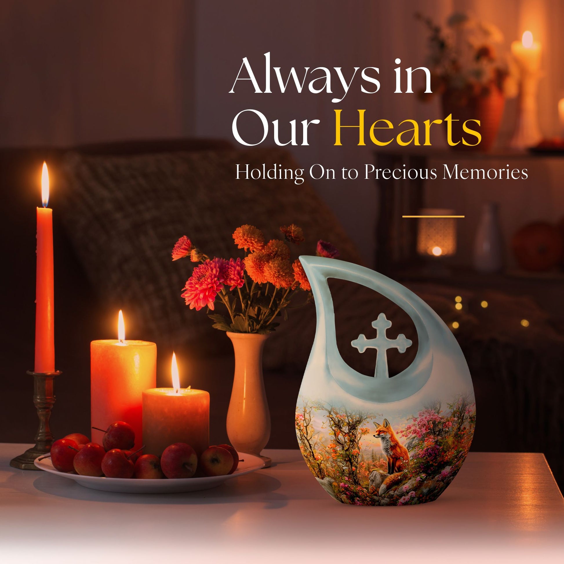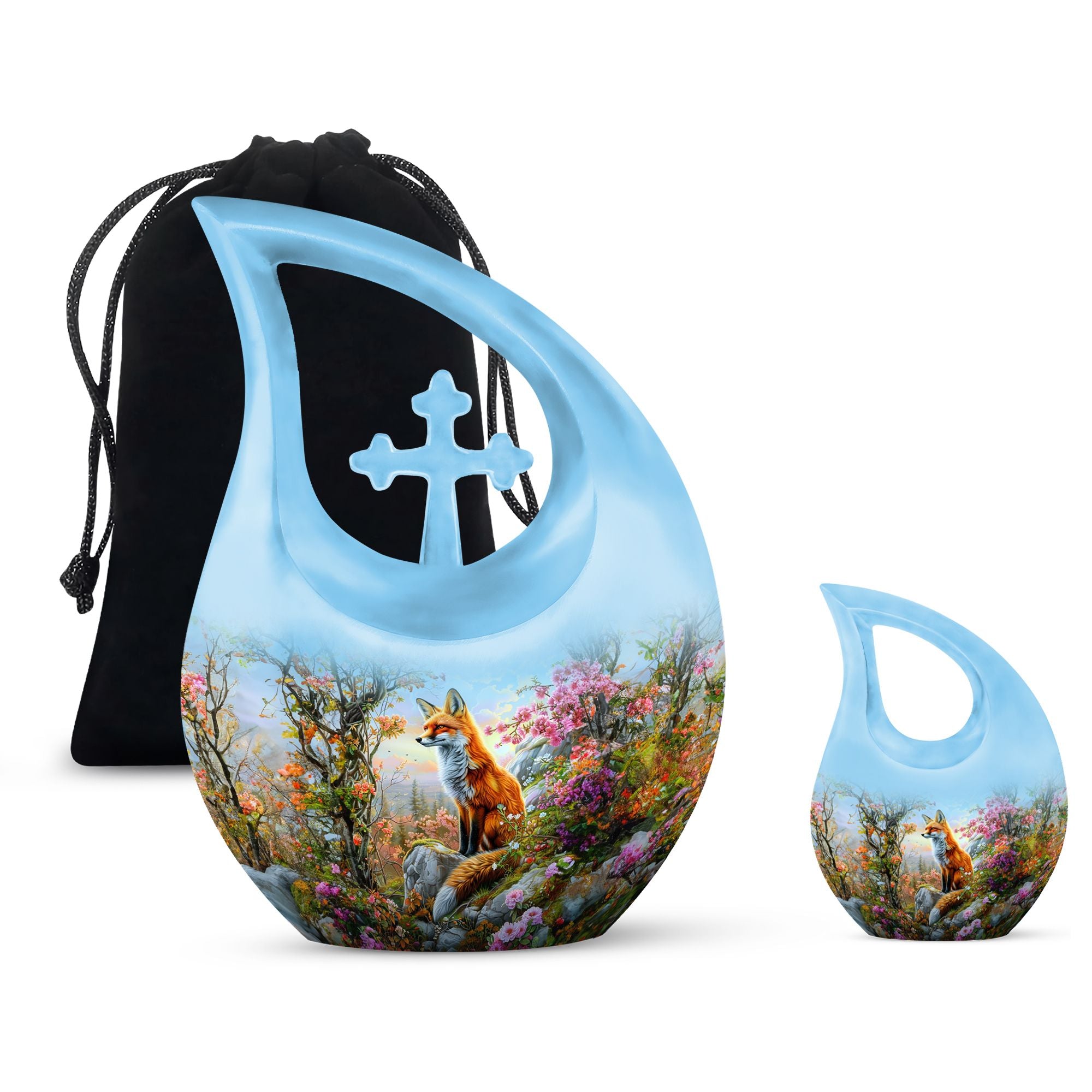 Honoring a loved one in a meaningful way becomes stress-free with our 'Fox Urn'. This affordable cremation and burial urn stands at an impressive 10 inches tall, resonating an exceptional blend of emotional warmth and devotion. Our Large urn, weighing 3.3 pounds, is designed with an elegant 'Cross Drop' theme that captures the solemn essence of the memorial ceremony. The robust aluminium build ensures the urn resonates with the longevity of your love and memories. It has the capacity to contain up to 200 cubic inches of ashes, securely housed in a complimentary velvet pouch provided in the package. Making it more personable, we offer customization options, where you can engrave the names of your loved ones. The Fox Urn transcends from being a cremation keepsake to a cherished treasure enhancing the memorial experience. Its aesthetics and functionality make it ideal for those in search of ashes keepsake or small urns for cremation ashes.