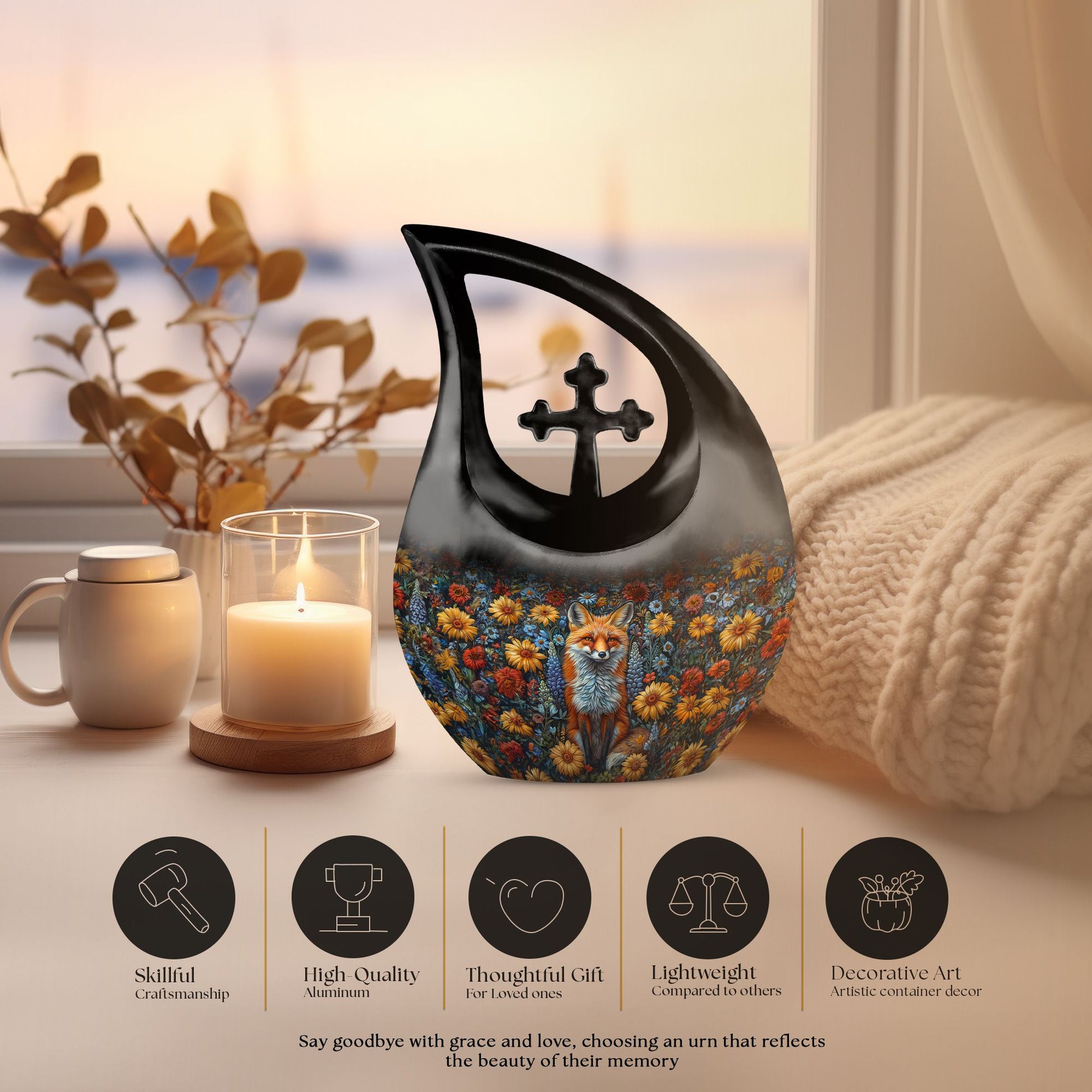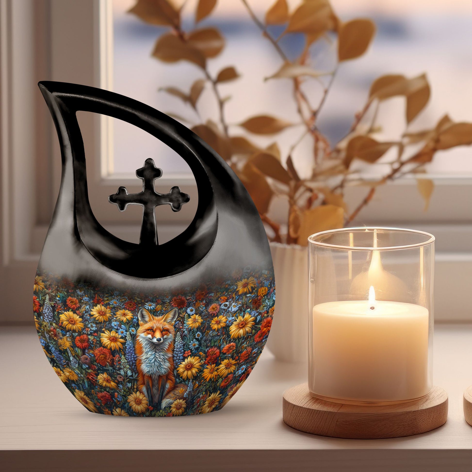 Honor your loved one's memory with our Fox Urn, a large 10 Inch memorial urn designed to preserve the memory of your treasured ones impeccably. Known as the 'Cross Drop', this aluminium made urn exhibits exceptional craftsmanship and durability. In addition, it offers a capacity of 200 cubic inches to securely contain the ashes of your loved ones after a respectful memorial ceremony. The product package comes with a velvet pouch for containment of ashes, symbolizing dignity and respect. Weighing 3.3 pounds with dimensions of 10 inches in height, it holds its position firmly, being a sustainable piece of remembrance. Personalize this memorial urn with engraved names as a tribute to your departed. Also known as Mini Urn, this product is a blend of affordability and quality, making it a preferred choice in the category of Keepsake urns, Custom urns for ashes, and Companion urns. The Fox theme adds a serene and spiritual touch to this large urn, augmenting its aesthetic appeal while serving its prime purpose.