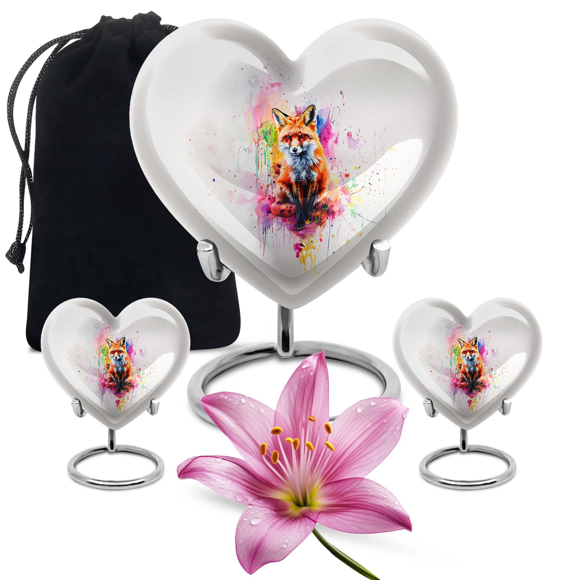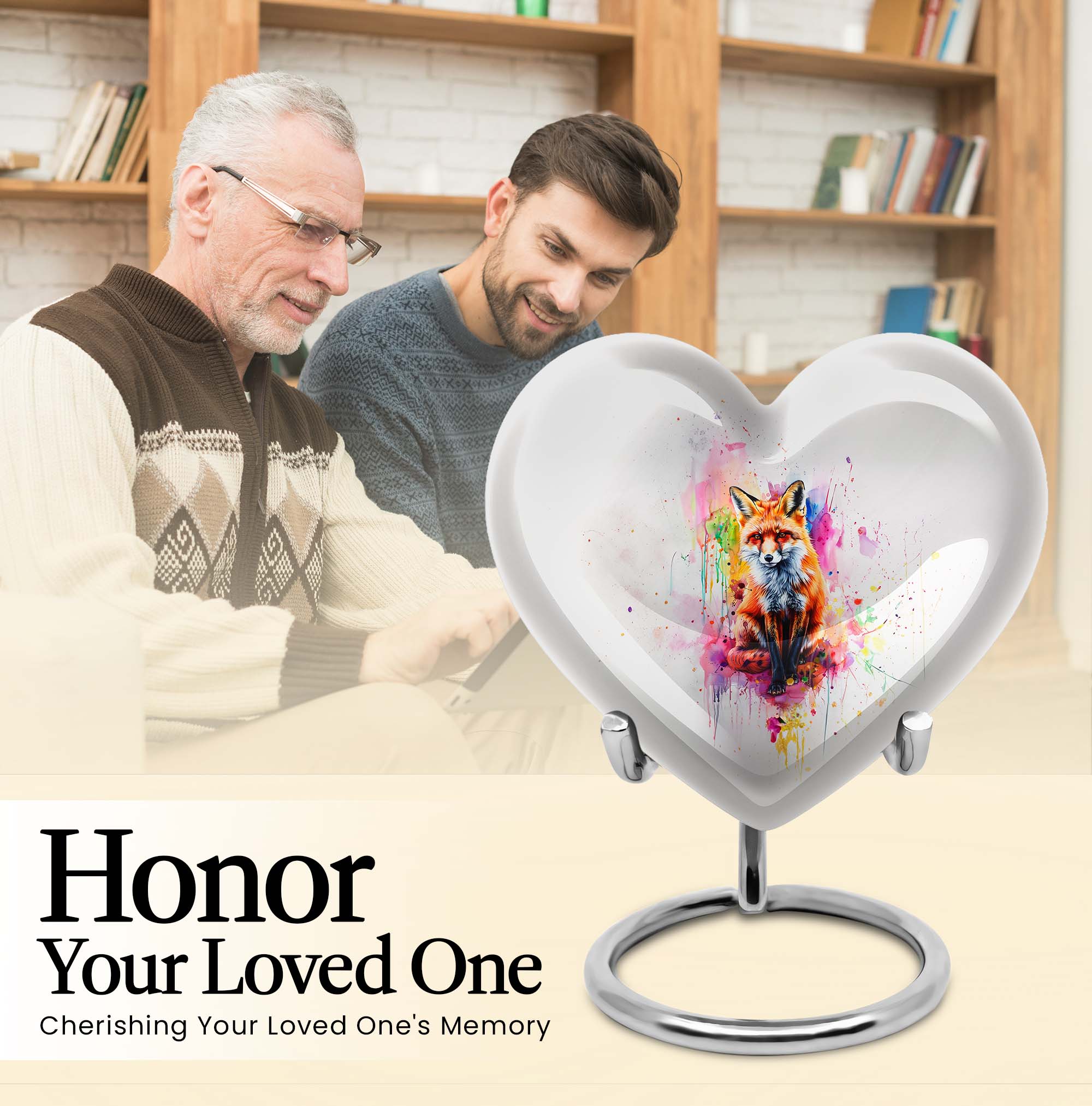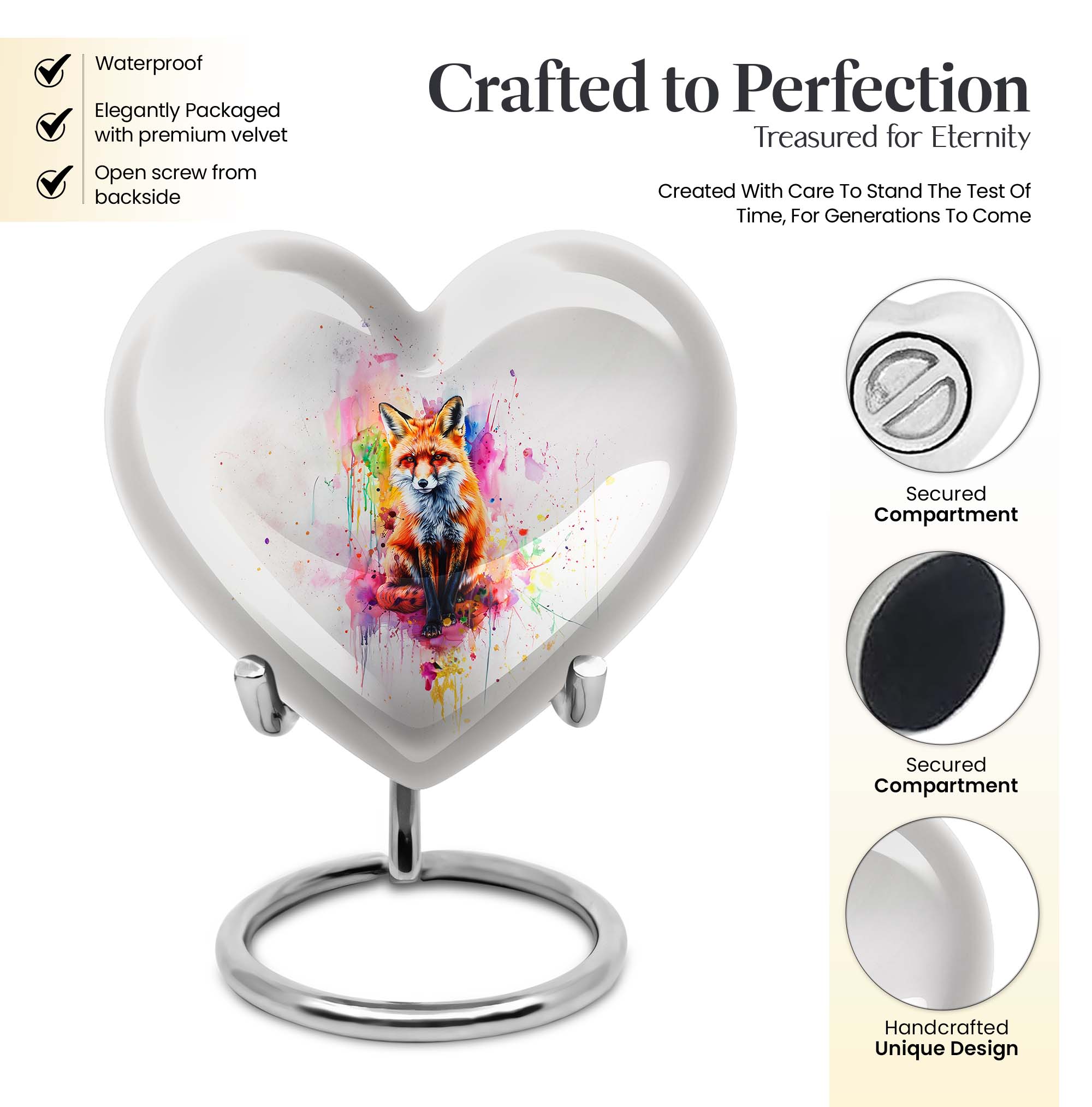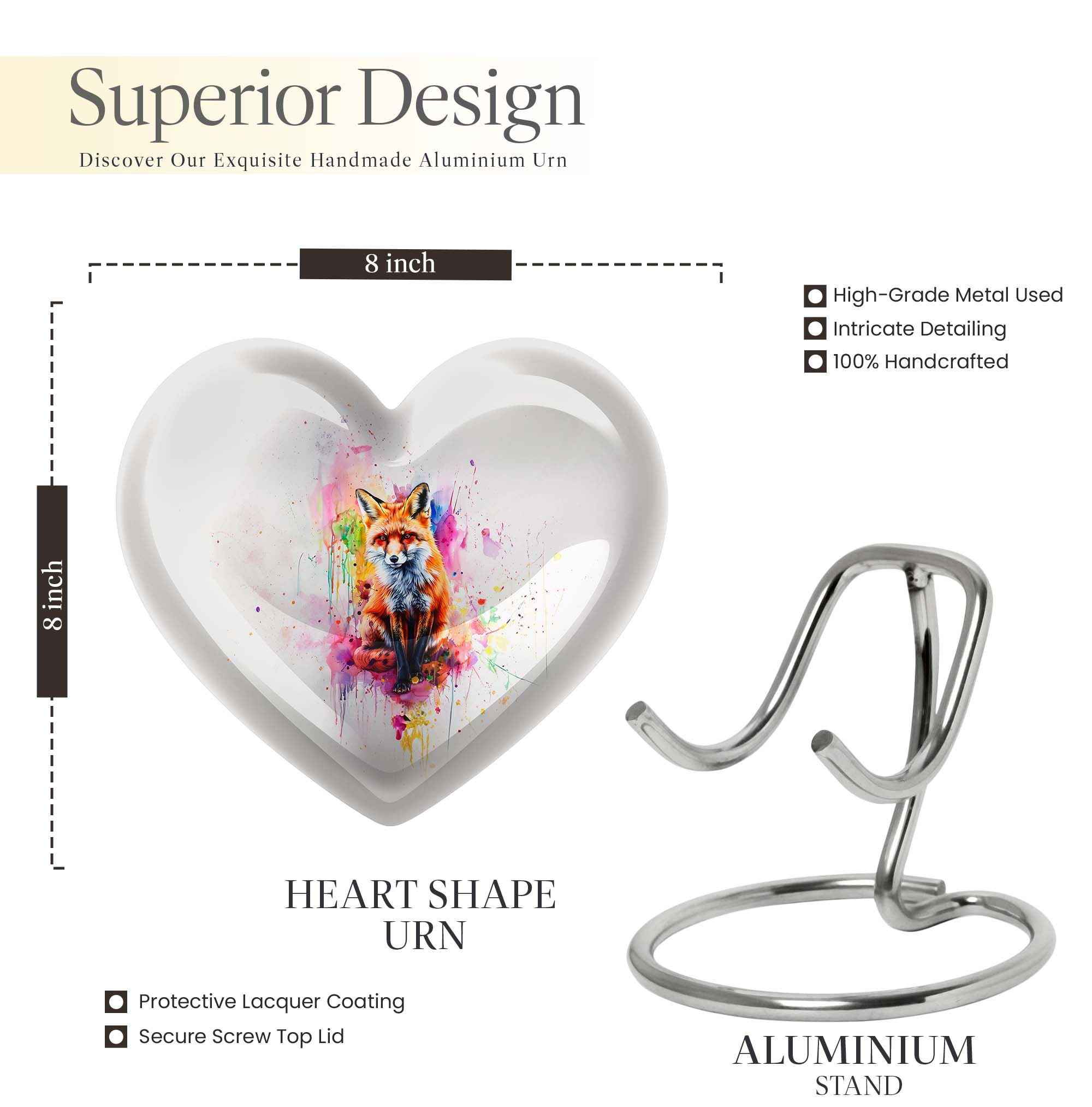 Introduce an element of serenity into your memorial ceremonies with the exquisite Heart Urn. Perfectly suited for both adults and seniors, this elegantly handcrafted Fox Urn radiates tranquility and love. With an attractive Butterfly Theme, it's more than just a cremation urn, it's a keepsake that honors and celebrates a loved one's life. This Aluminium urn stands tall at 10 inches, bearing a weight of 3.3 pounds with the capacity to contain 200 cubic inches of ashes. Ideal for large urns seekers, it effortlessly combines functionality with beauty. It also allows customization; you can personalize it with engraved names, adding a unique touch to your commemoration. Succulently packaged in a plush velvet pouch, it ensures secure containment and storage of the ashes. Whether you're in need of funeral urns for human ashes or looking for an elegant home funeral decor, this memorial urn offers a sanctuary of remembrance. Note: The design does not define its value, but the comfort and serenity it offers do.