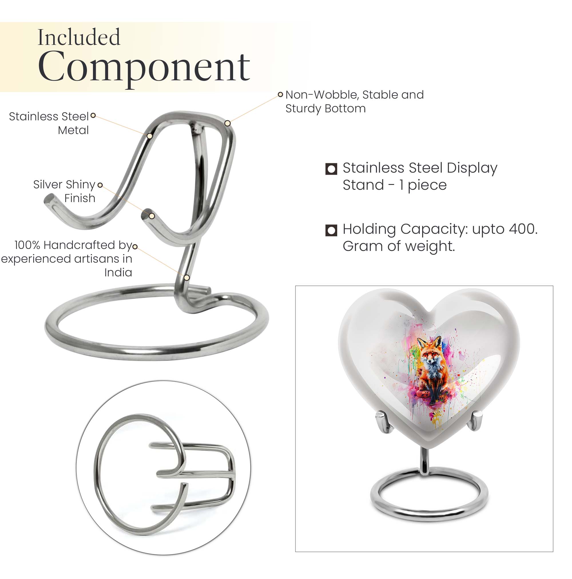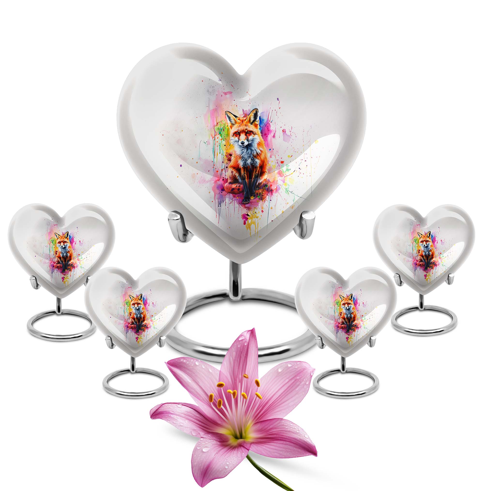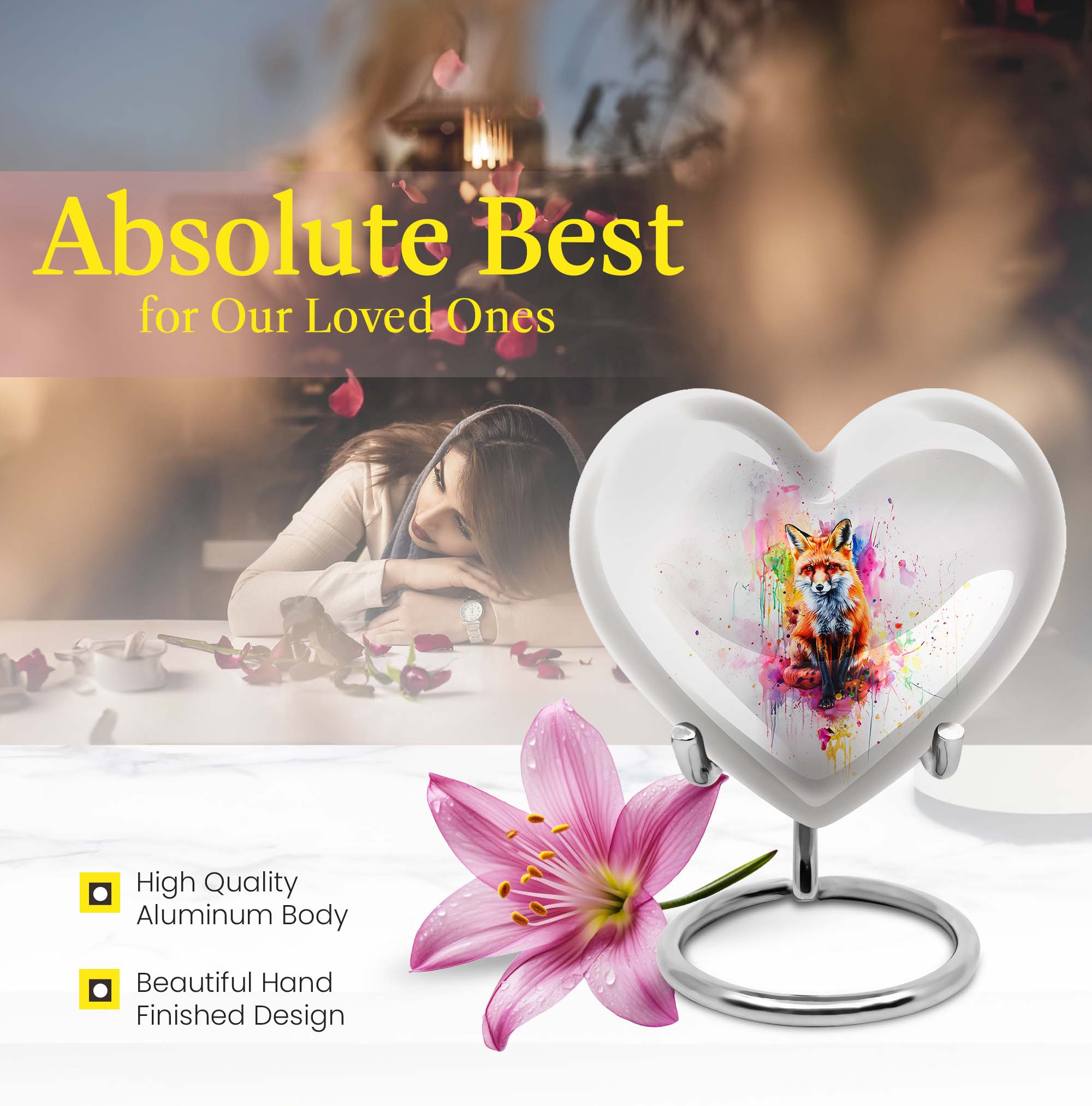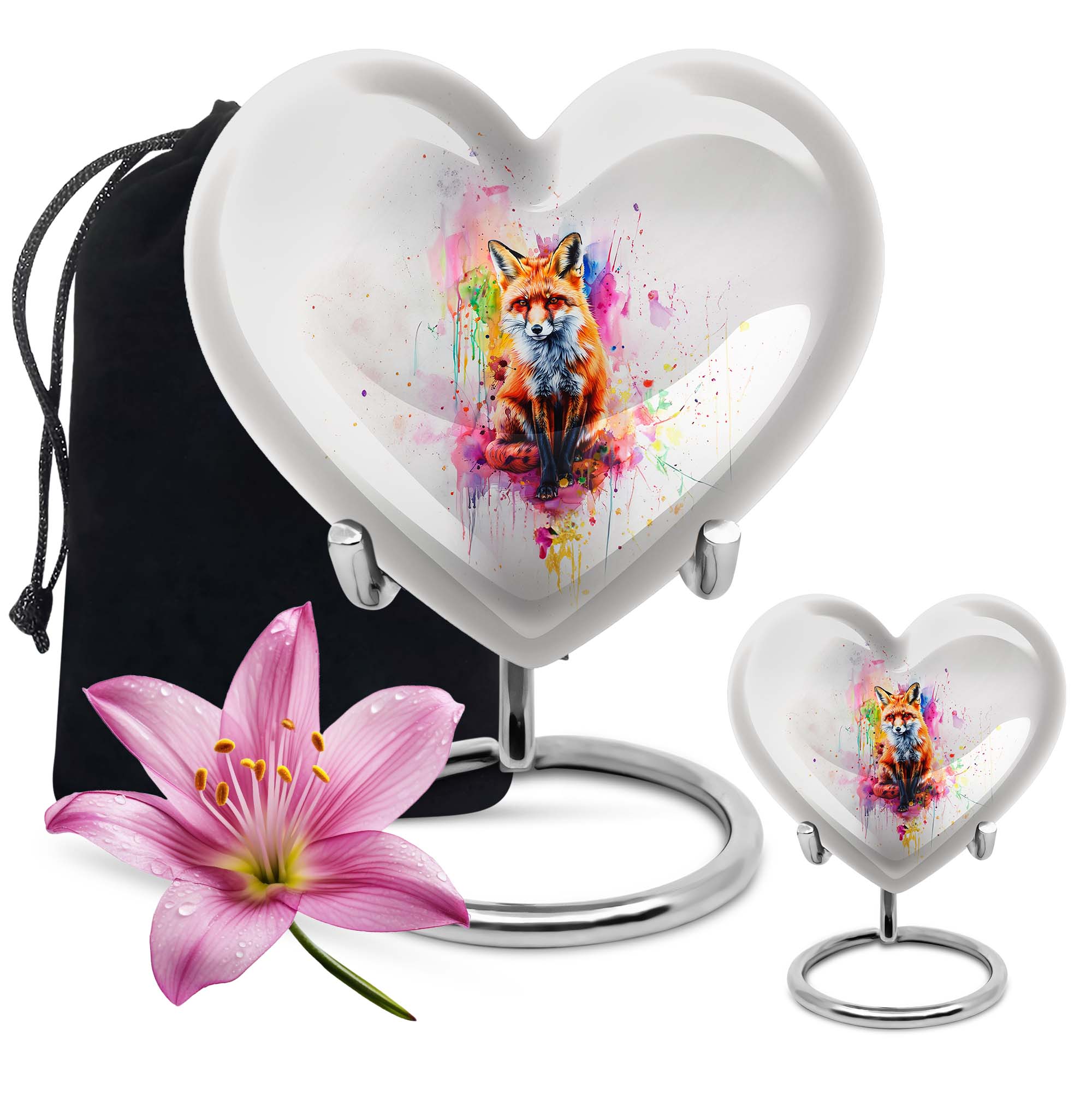 Introduce an element of serenity into your memorial ceremonies with the exquisite Heart Urn. Perfectly suited for both adults and seniors, this elegantly handcrafted Fox Urn radiates tranquility and love. With an attractive Butterfly Theme, it's more than just a cremation urn, it's a keepsake that honors and celebrates a loved one's life. This Aluminium urn stands tall at 10 inches, bearing a weight of 3.3 pounds with the capacity to contain 200 cubic inches of ashes. Ideal for large urns seekers, it effortlessly combines functionality with beauty. It also allows customization; you can personalize it with engraved names, adding a unique touch to your commemoration. Succulently packaged in a plush velvet pouch, it ensures secure containment and storage of the ashes. Whether you're in need of funeral urns for human ashes or looking for an elegant home funeral decor, this memorial urn offers a sanctuary of remembrance. Note: The design does not define its value, but the comfort and serenity it offers do.
