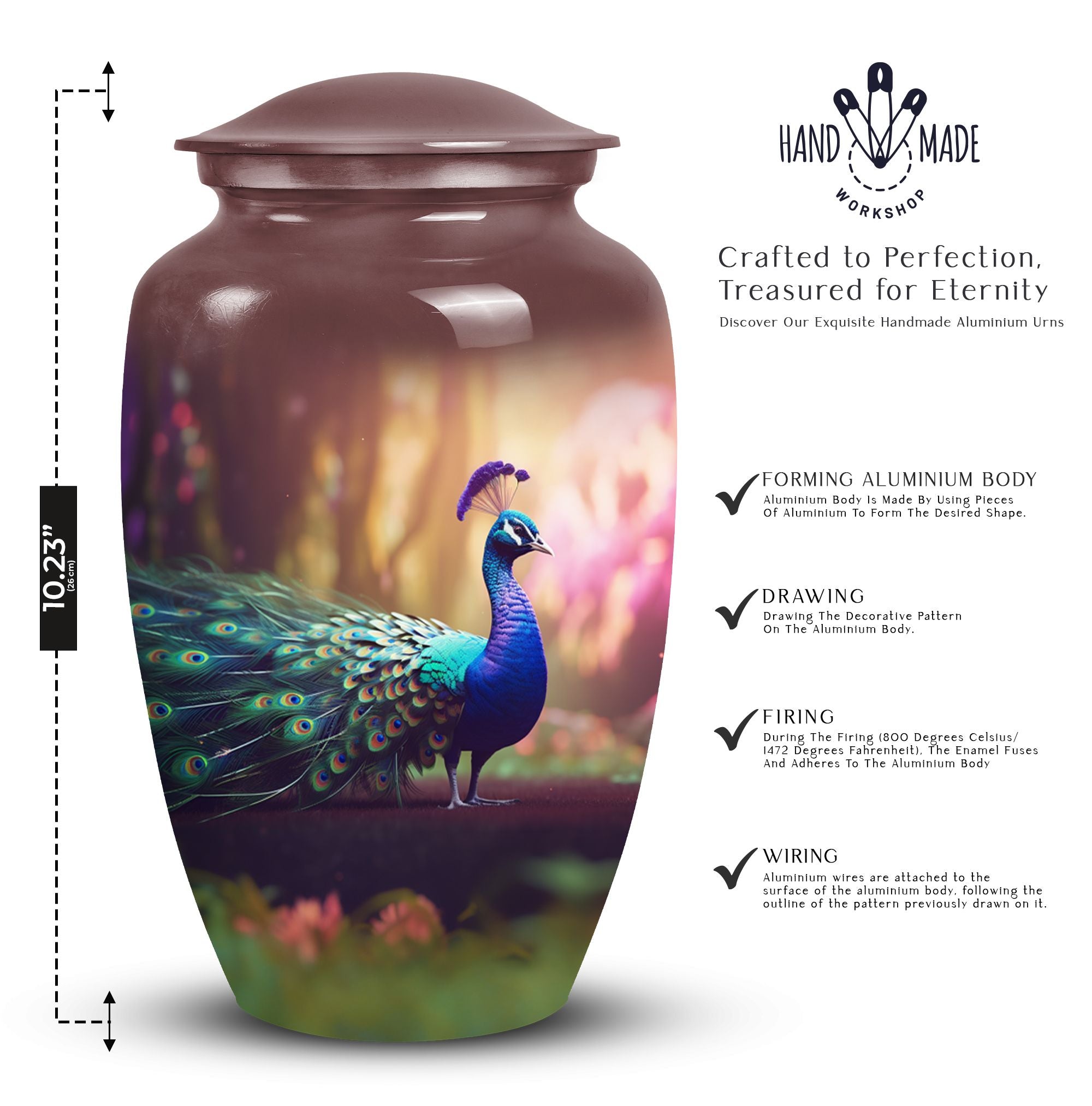 Discover an exquisite piece that sanctifies memories and honors your dearly beloved with this Peacock urn. This cremation urn, designed for an adult male, becomes a respectful and holy abode for the earthly remnants of your loved ones. Being more than mere burial urns, they embody love and remembrance, fostering a unique connection with the departed. Perfectly suitable as a possession for female adults as well, these urns are meticulously crafted to store cremains with absolute sanctity. Combining the ceremonial significance and visually appealing aesthetics of the peacock, these urns for human ashes become a testament to life and love beyond the physical realm. Tailored to hold cremated remains in a respectful way, these treasured urns underscore the profound pathos of losing a loved one while offering a comforting symbol of remembrance. So significant, so personal, these funeral urns encompass the aura of your loved one, eternally preserving their essence.