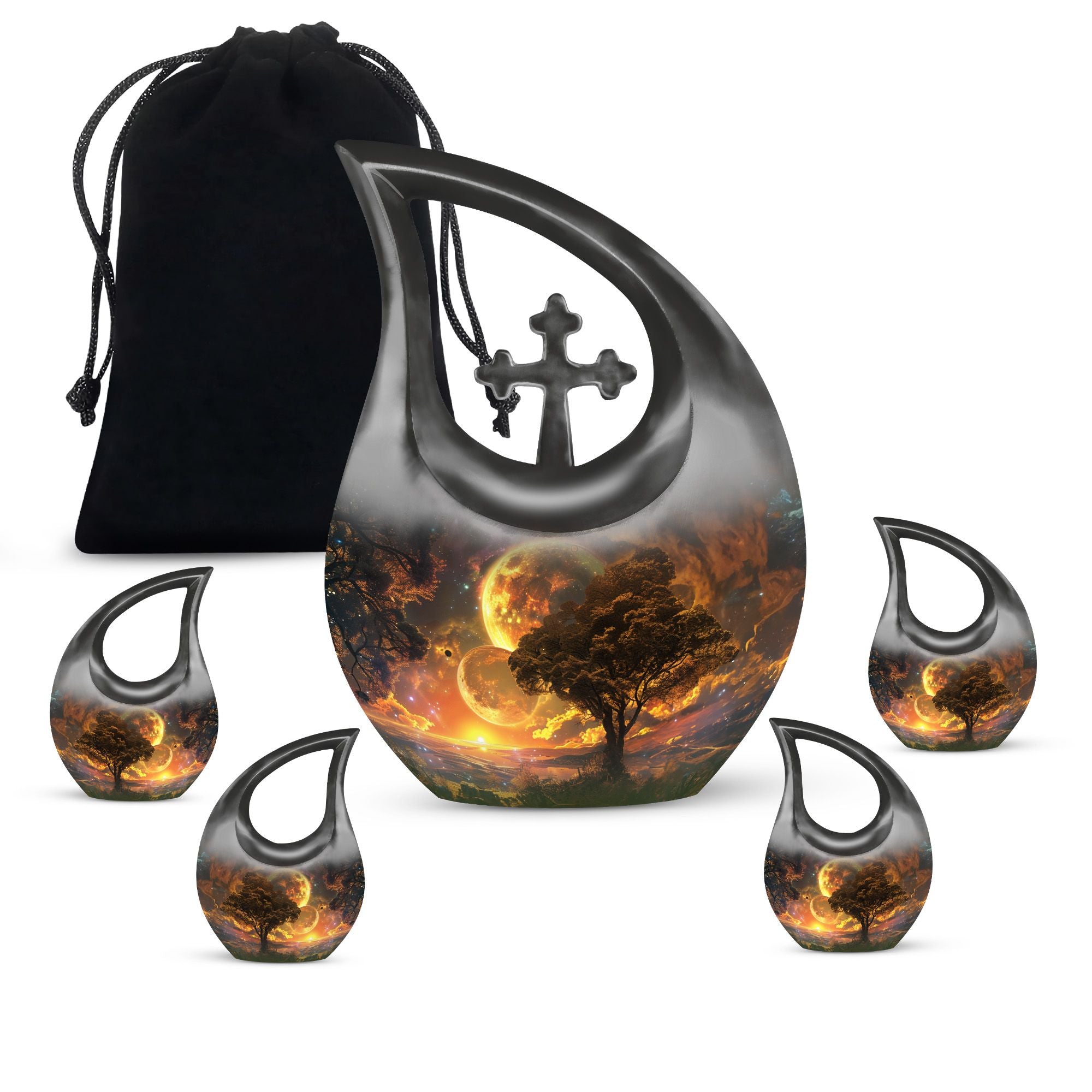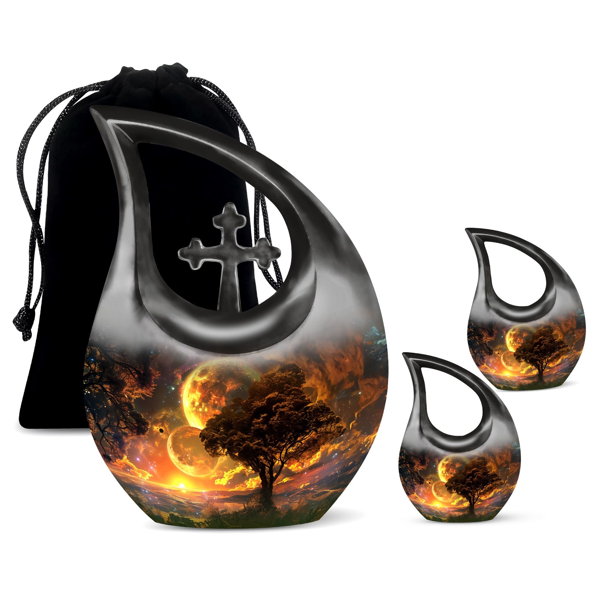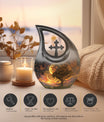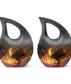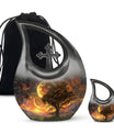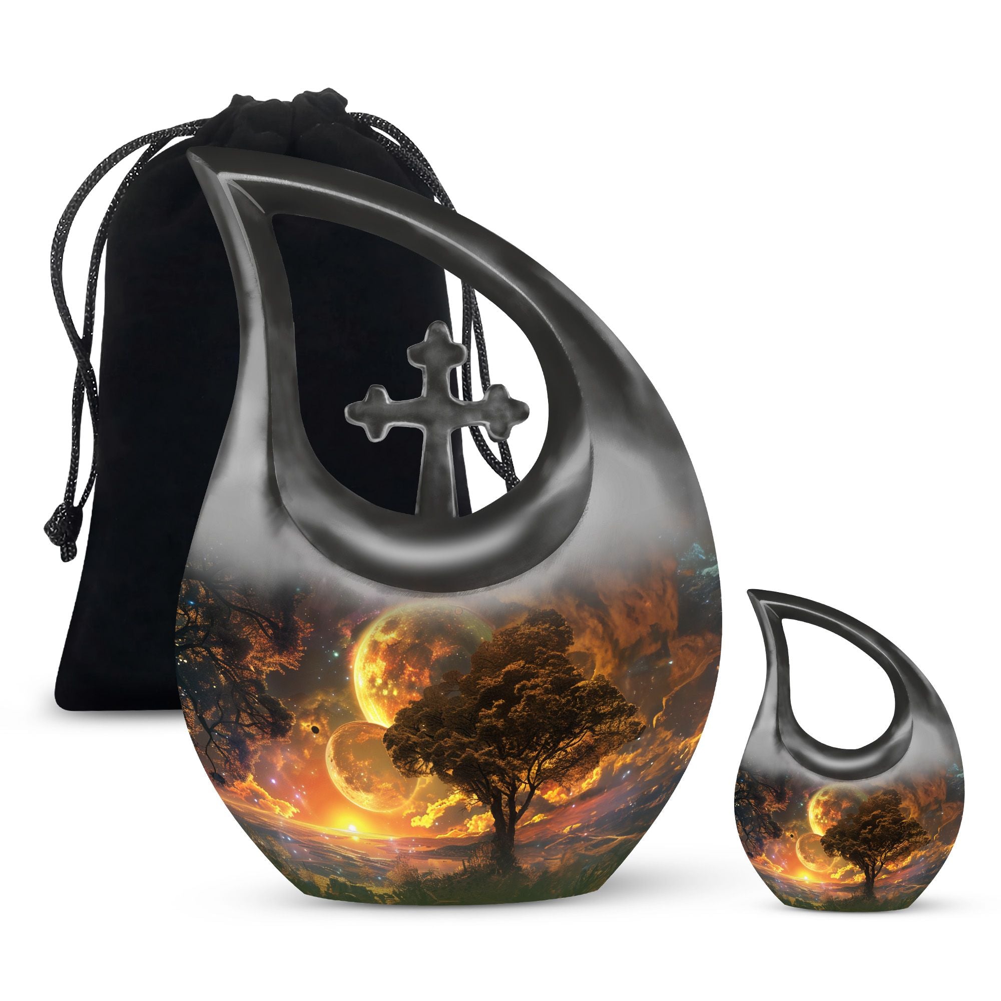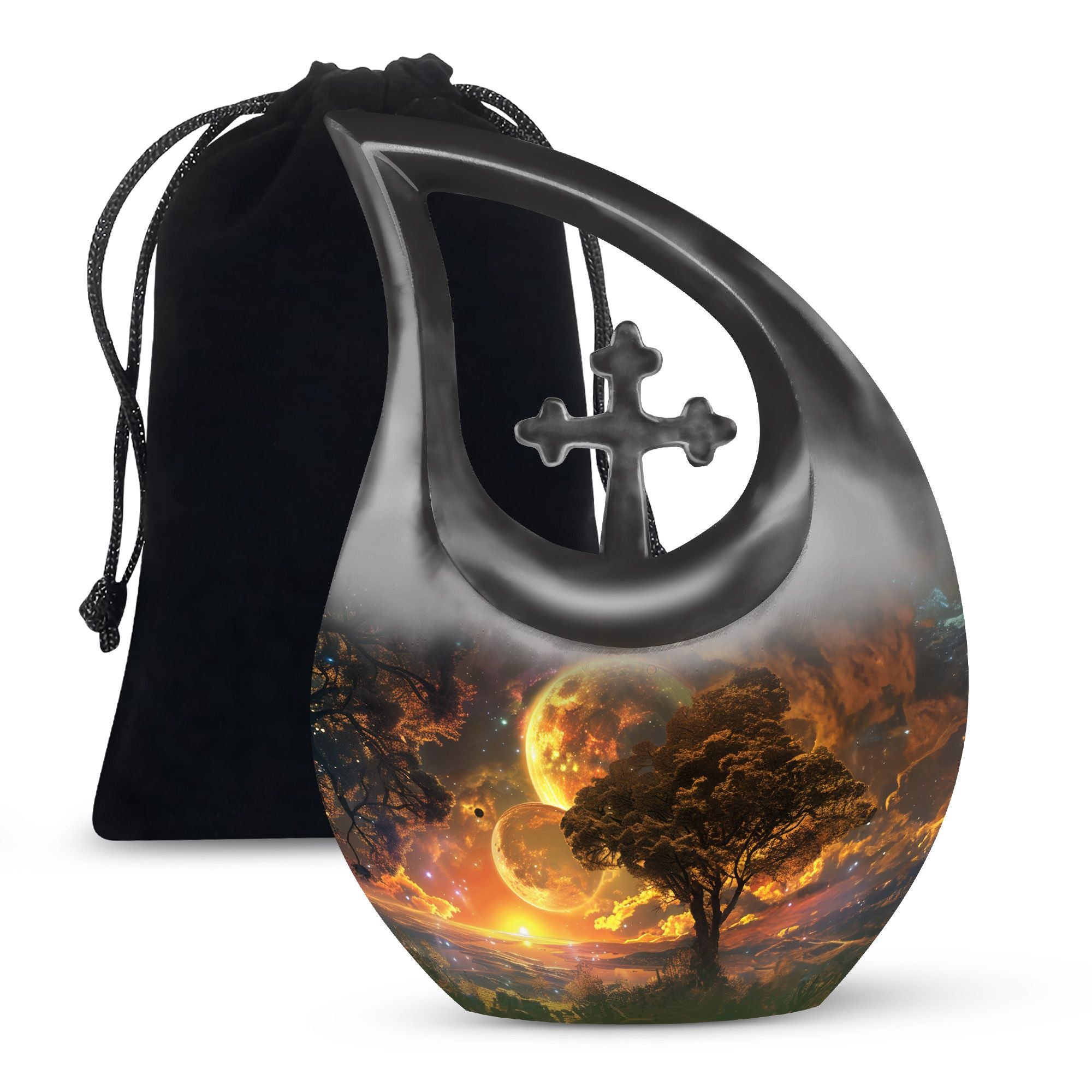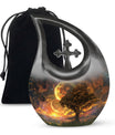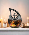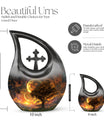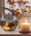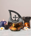 Embodying the grandeur and deep mystery of a galactic dreamscape, this Cremation Urn Vault is a the ultimate dignified and respectful homestead for your loved one's ashes. The 10-inch, Large Urn, crafted meticulously from sturdy, high-grade Aluminium, demonstrates a grace and charm that's unmatched. Its 3.3 pounds weight underscores its robustness ensuring lasting security, and with an impressive capacity of 200 cubic inches, it provides ample space for a good volume of ashes. One of the standout facets of this creation is the 'Cross Drop' theme that adorns it, invoking a tranquil, faith-filled aura. Further adding a personal touch, it enables you to personalize the urn with engraved names, making it a truly unique memorial piece. Your purchase includes a velvet pouch for containment of ashes - a tender, final touch to an already remarkable item. This product is as respectful a tribute as it gets for your departed loved ones. Incorporate the Galactic Dreamscape Urn into your memorial ceremonies for a tribute that's both unique and heartfelt. Keywords: Galactic Dreamscape Urn, memorial urns, urn for ashes, unique cremation keepsakes, cremation caskets, special urns