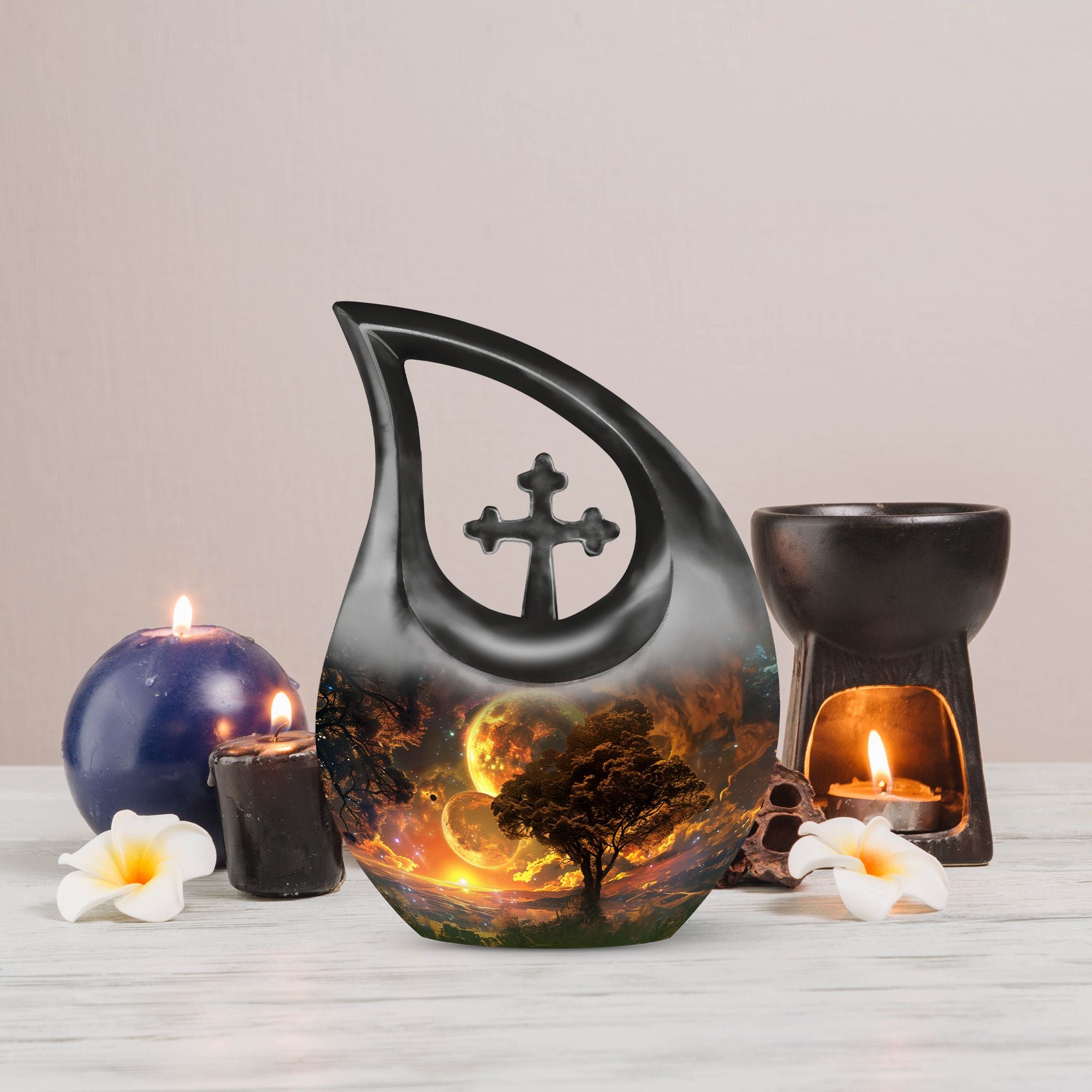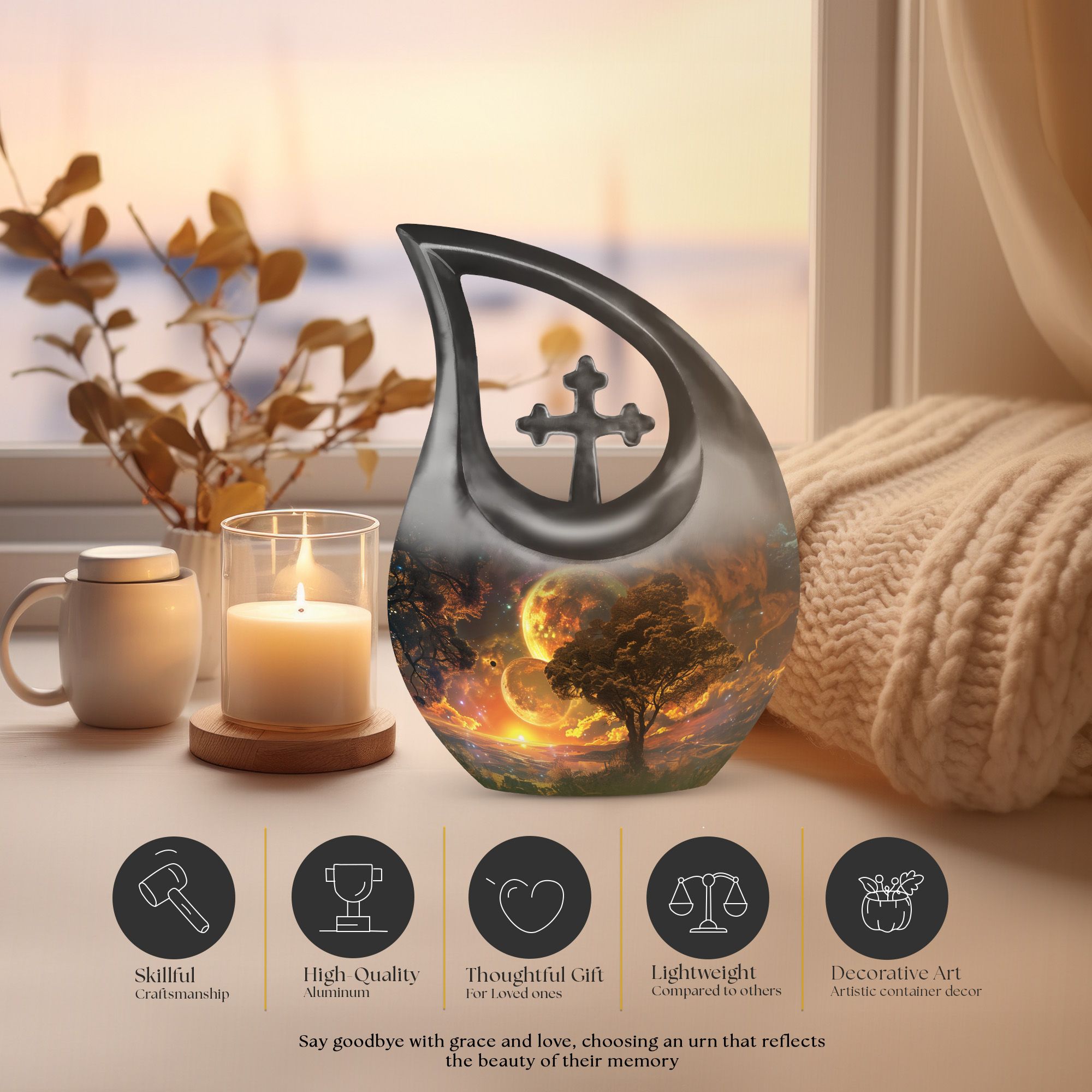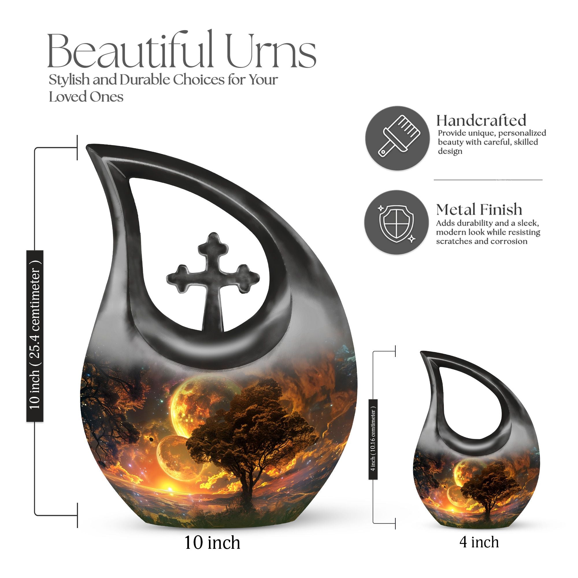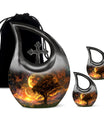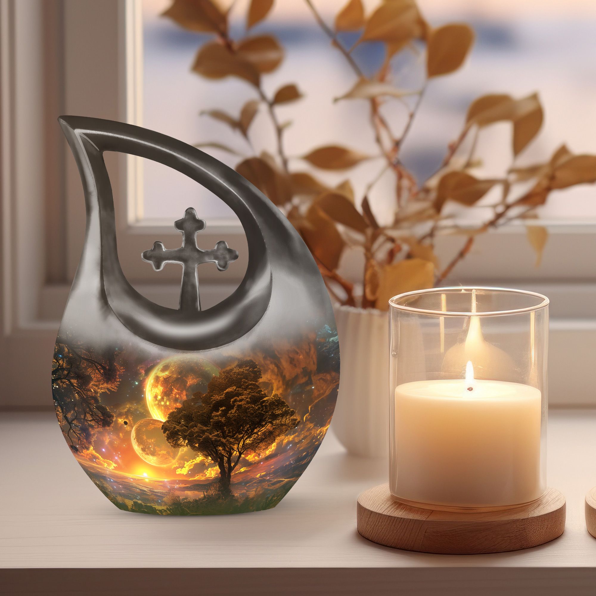 Embodying the grandeur and deep mystery of a galactic dreamscape, this Cremation Urn Vault is a the ultimate dignified and respectful homestead for your loved one's ashes. The 10-inch, Large Urn, crafted meticulously from sturdy, high-grade Aluminium, demonstrates a grace and charm that's unmatched. Its 3.3 pounds weight underscores its robustness ensuring lasting security, and with an impressive capacity of 200 cubic inches, it provides ample space for a good volume of ashes. One of the standout facets of this creation is the 'Cross Drop' theme that adorns it, invoking a tranquil, faith-filled aura. Further adding a personal touch, it enables you to personalize the urn with engraved names, making it a truly unique memorial piece. Your purchase includes a velvet pouch for containment of ashes - a tender, final touch to an already remarkable item. This product is as respectful a tribute as it gets for your departed loved ones. Incorporate the Galactic Dreamscape Urn into your memorial ceremonies for a tribute that's both unique and heartfelt. Keywords: Galactic Dreamscape Urn, memorial urns, urn for ashes, unique cremation keepsakes, cremation caskets, special urns