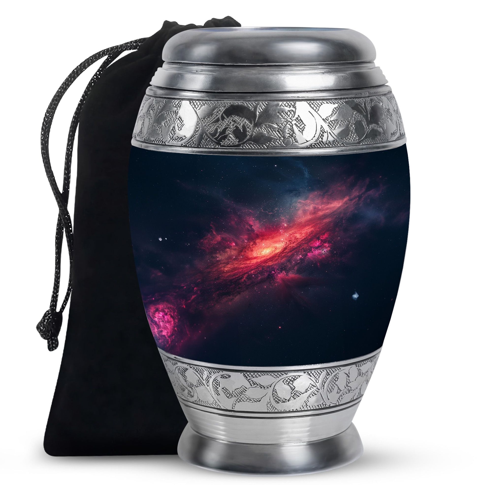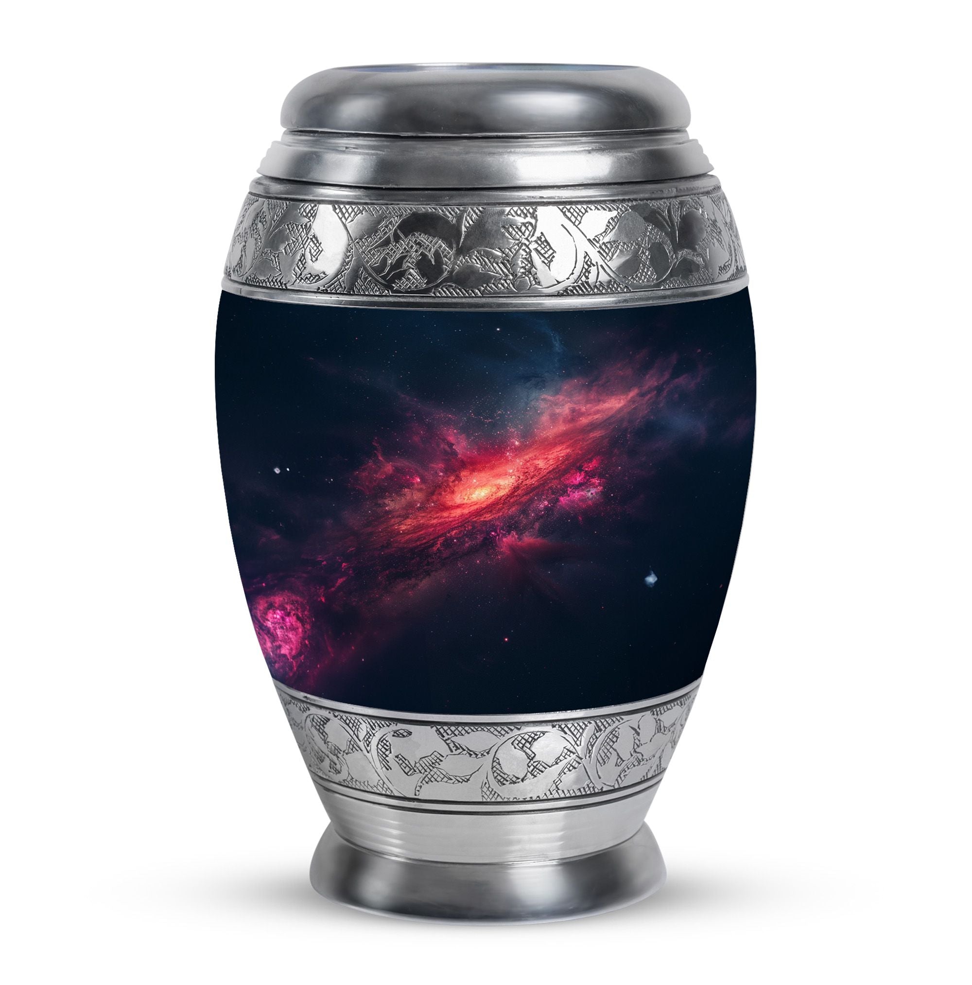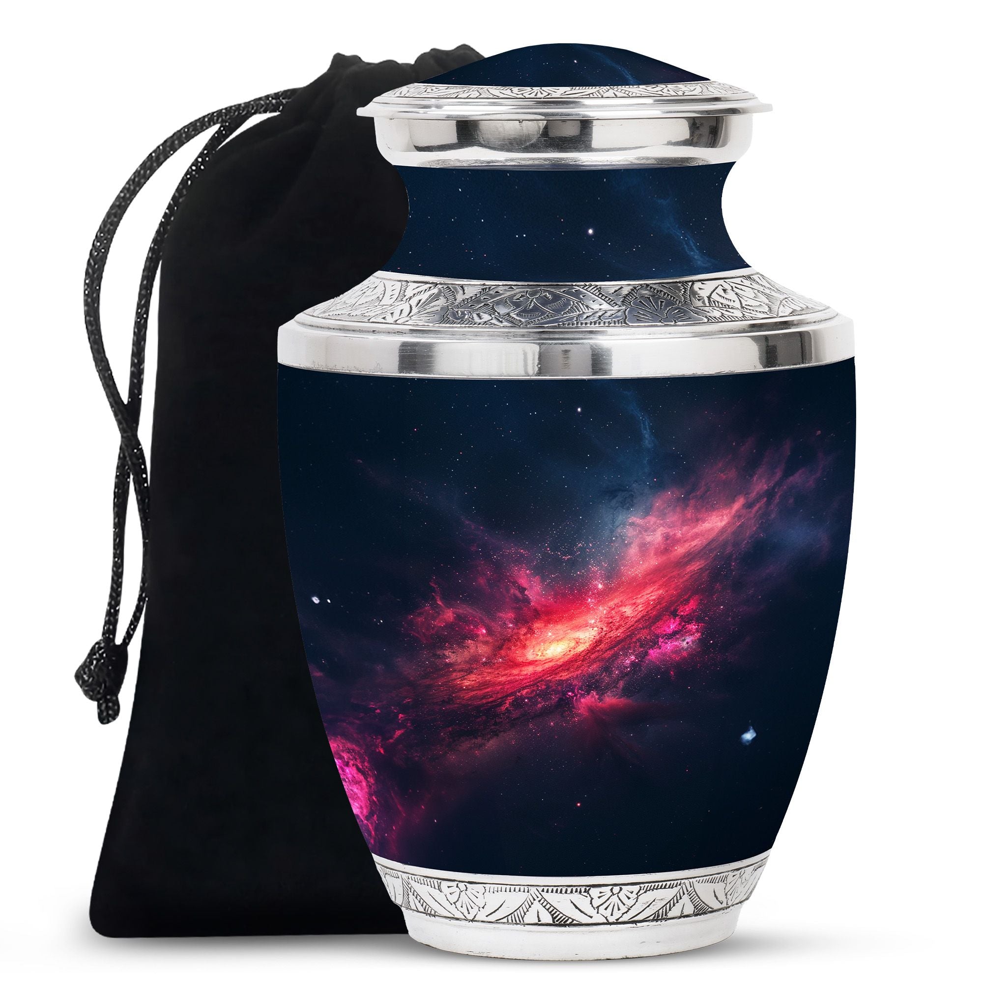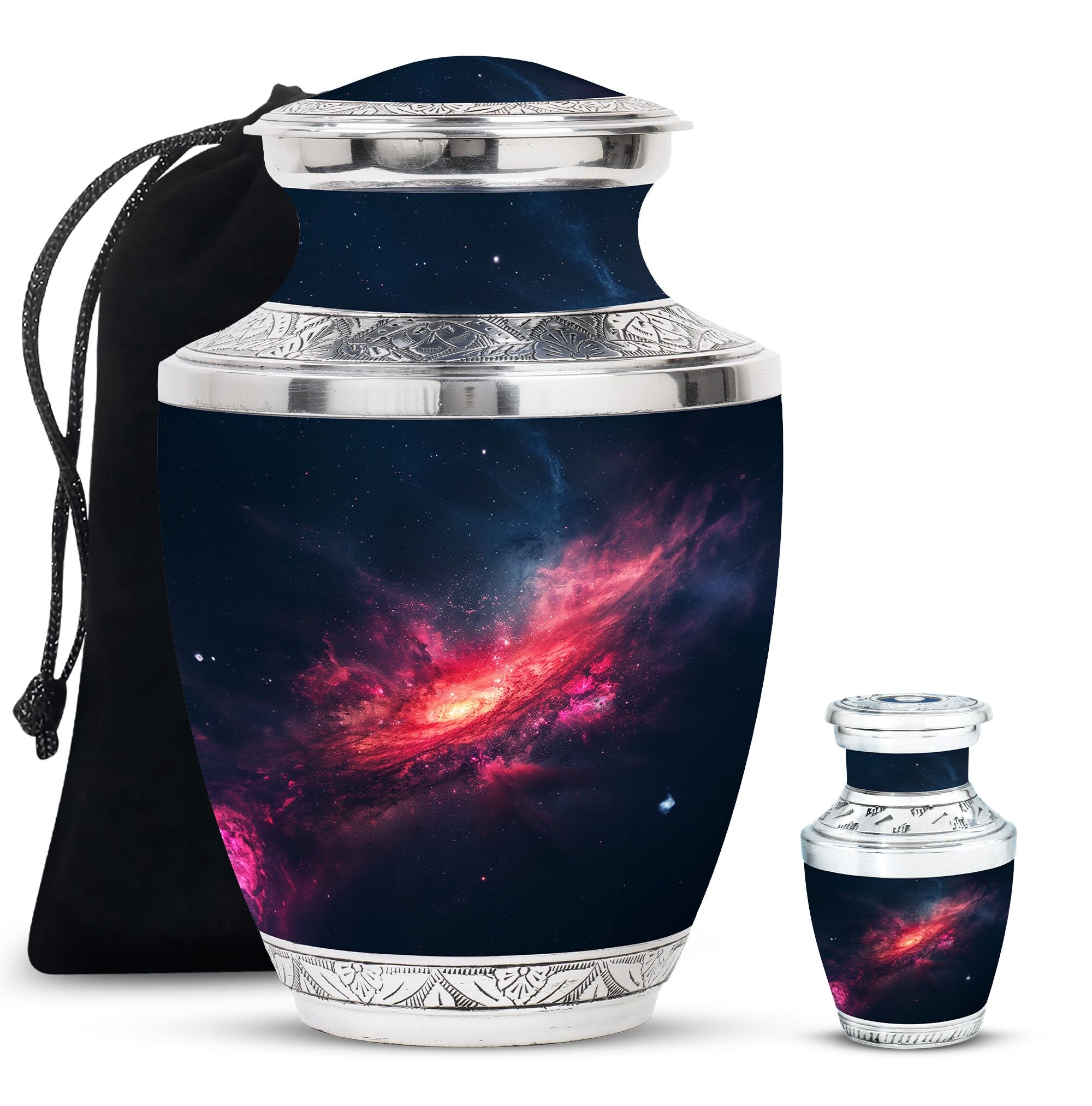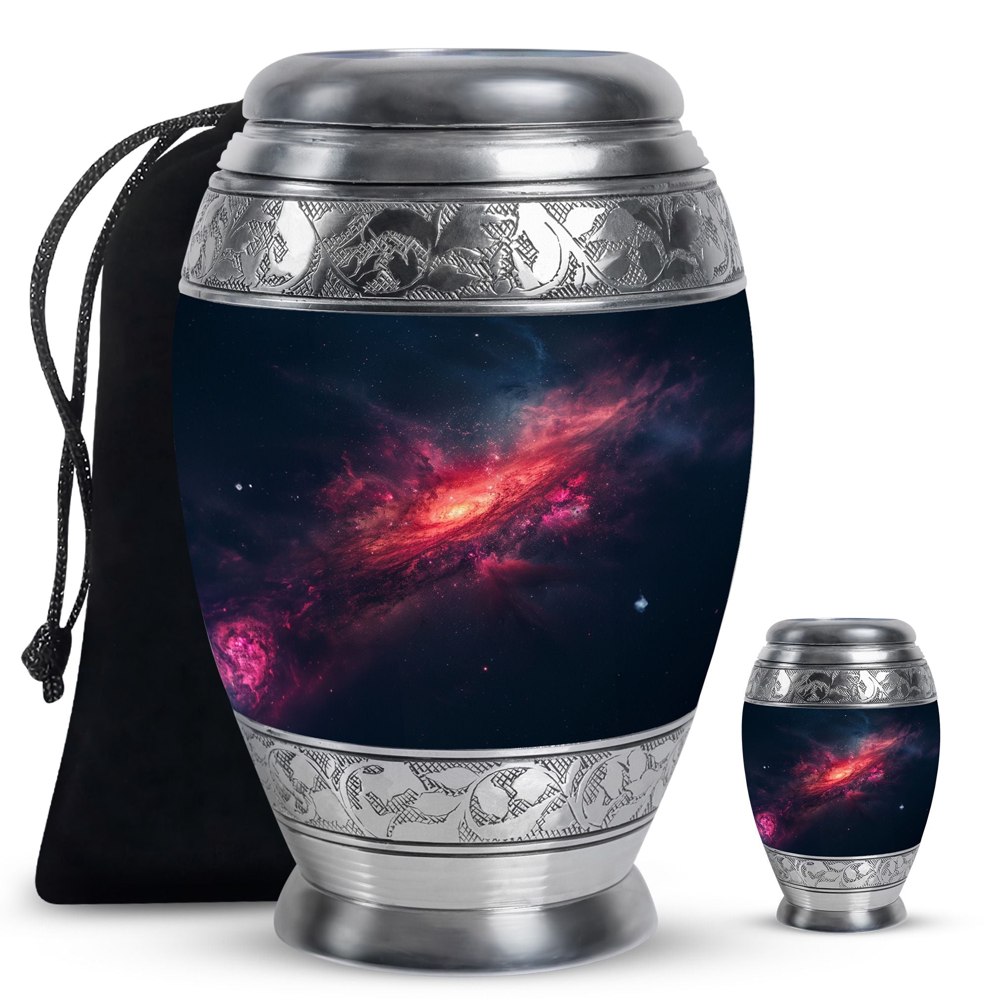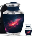 Crafted with care, this urn combines artistry and durability, making it a meaningful choice for families. Designed from high-quality aluminum, it showcases a galaxy-inspired theme, adding elegance to any setting. Suitable as both funeral cremation urns for ashes and part of a cremation urns large & small combo, it can serve as the primary vessel or be paired with small funeral urns for family keepsakes. This funeral adult urn ensures security with its screw-top lid while offering beauty and grace in every detail.