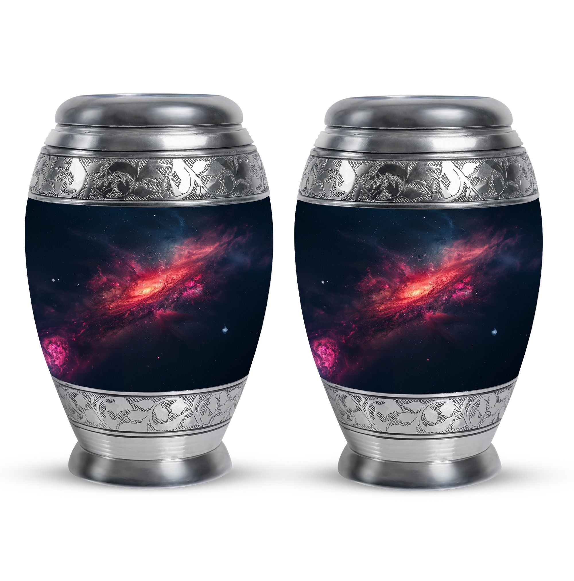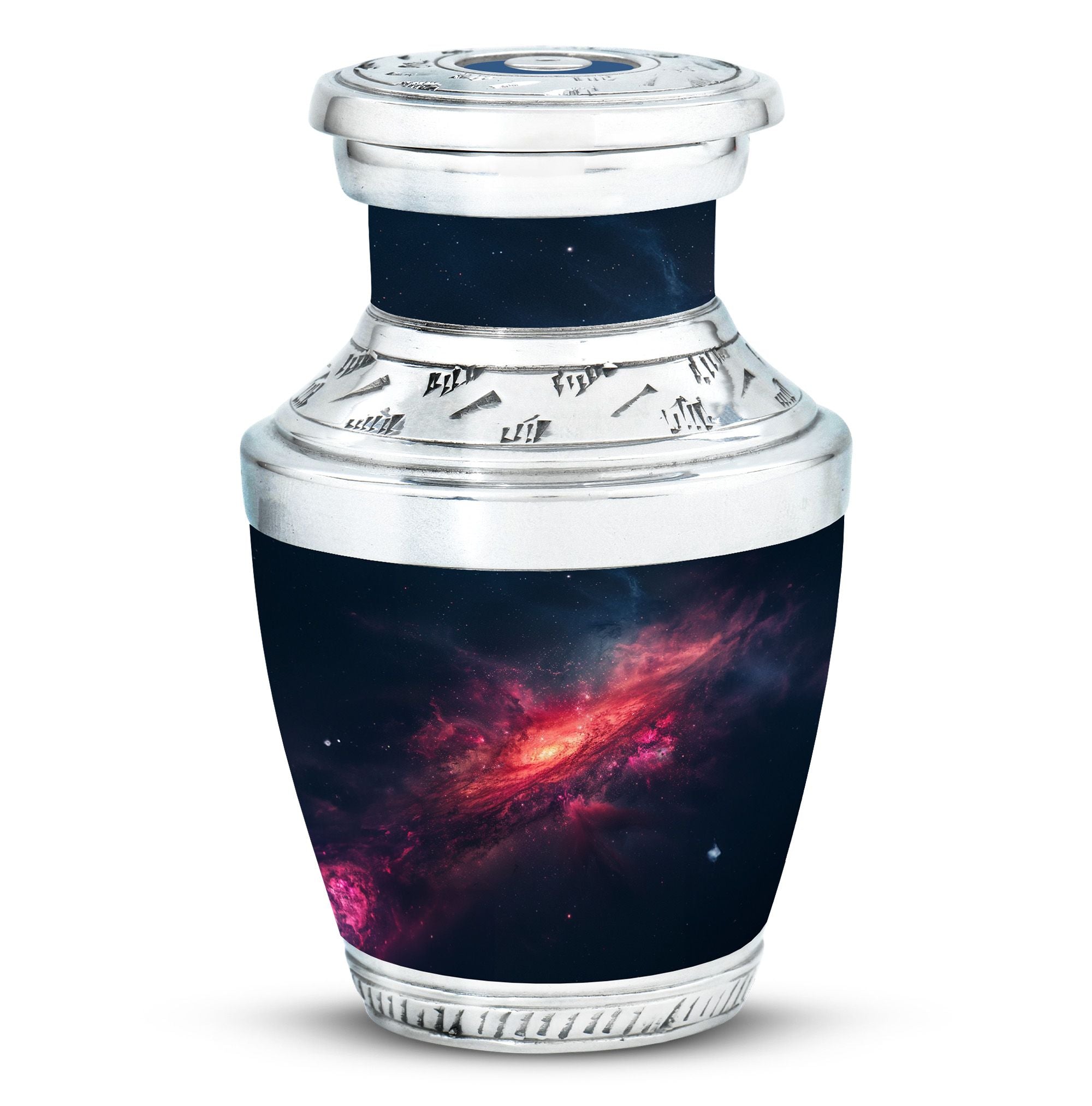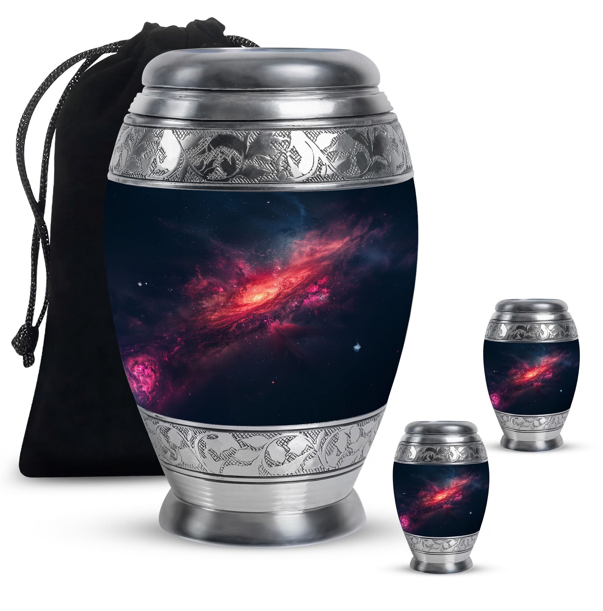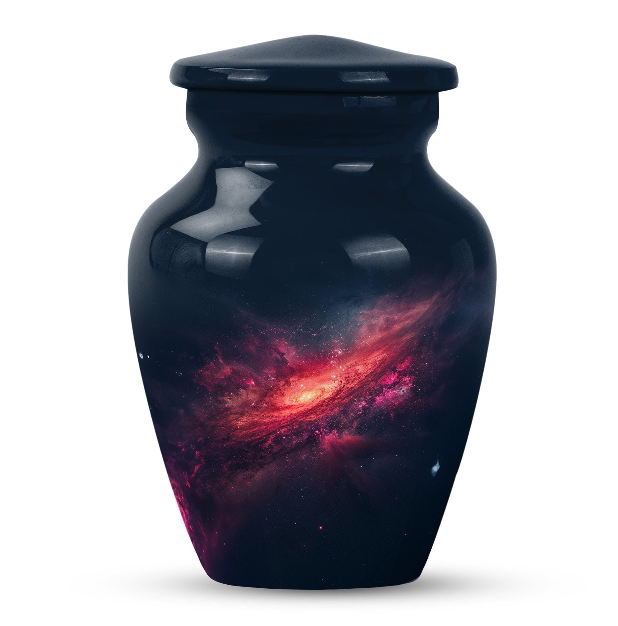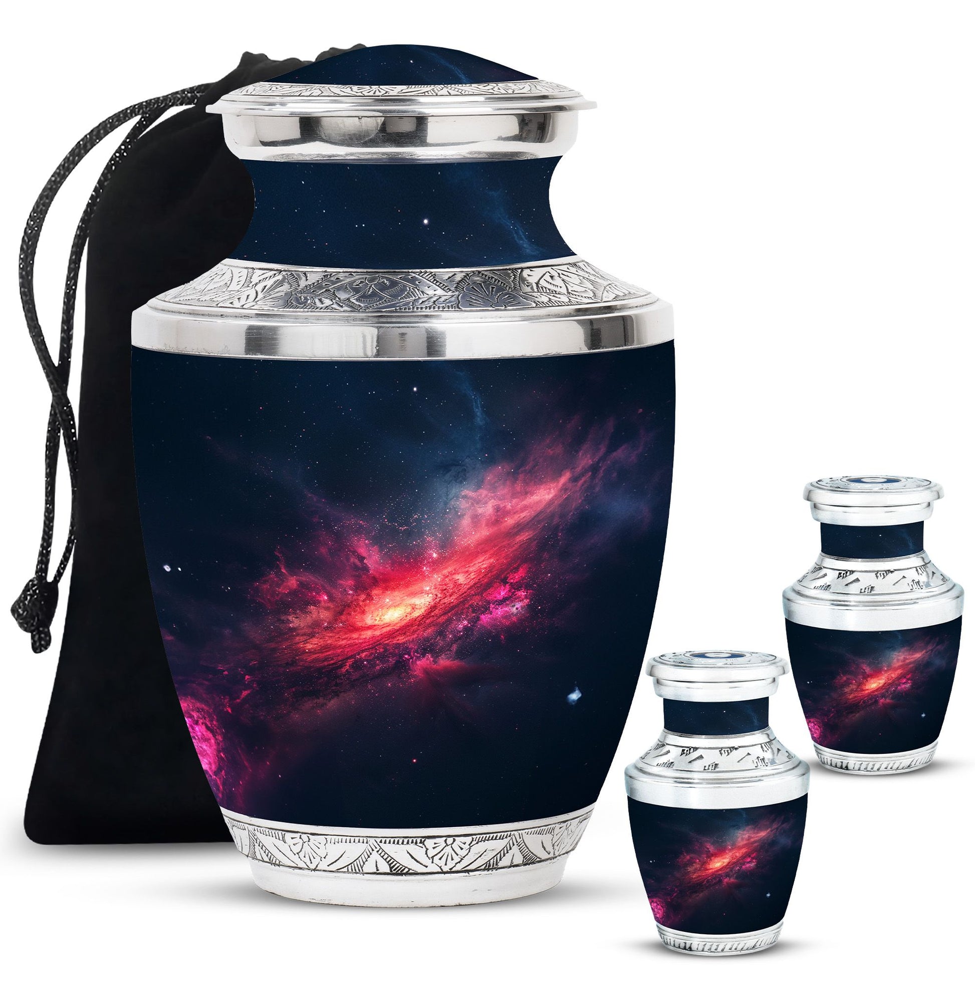 Crafted with care, this urn combines artistry and durability, making it a meaningful choice for families. Designed from high-quality aluminum, it showcases a galaxy-inspired theme, adding elegance to any setting. Suitable as both funeral cremation urns for ashes and part of a cremation urns large & small combo, it can serve as the primary vessel or be paired with small funeral urns for family keepsakes. This funeral adult urn ensures security with its screw-top lid while offering beauty and grace in every detail.
