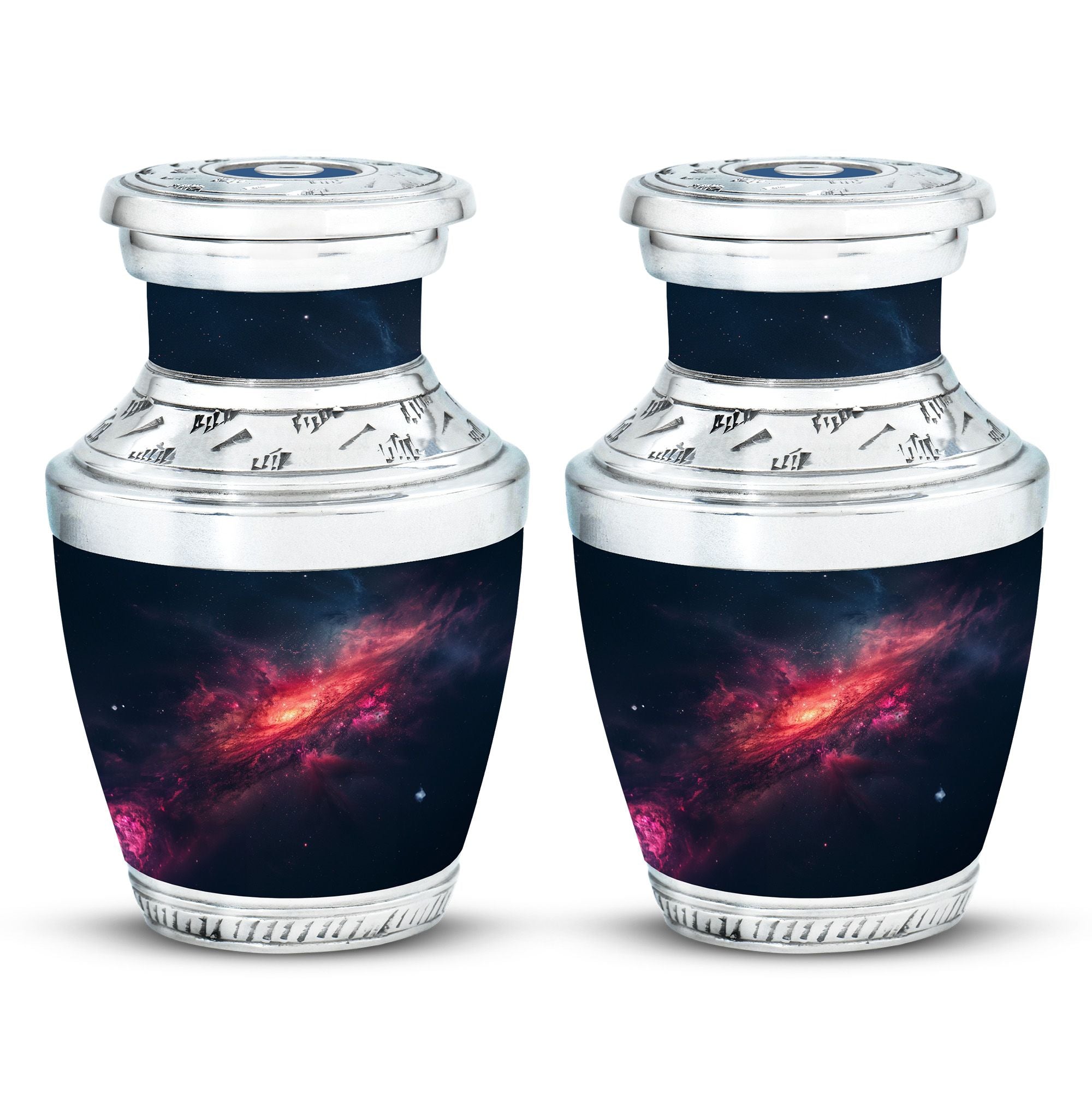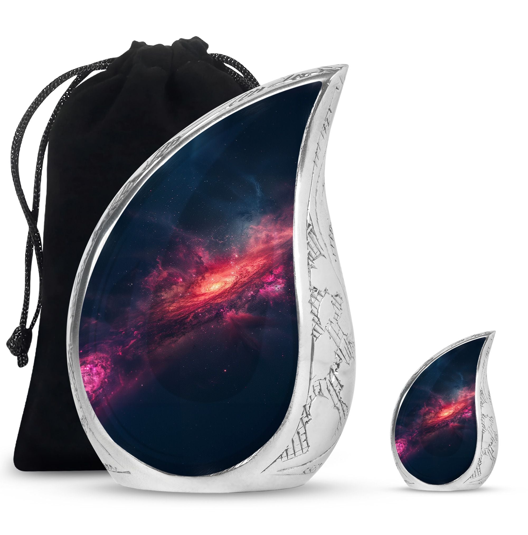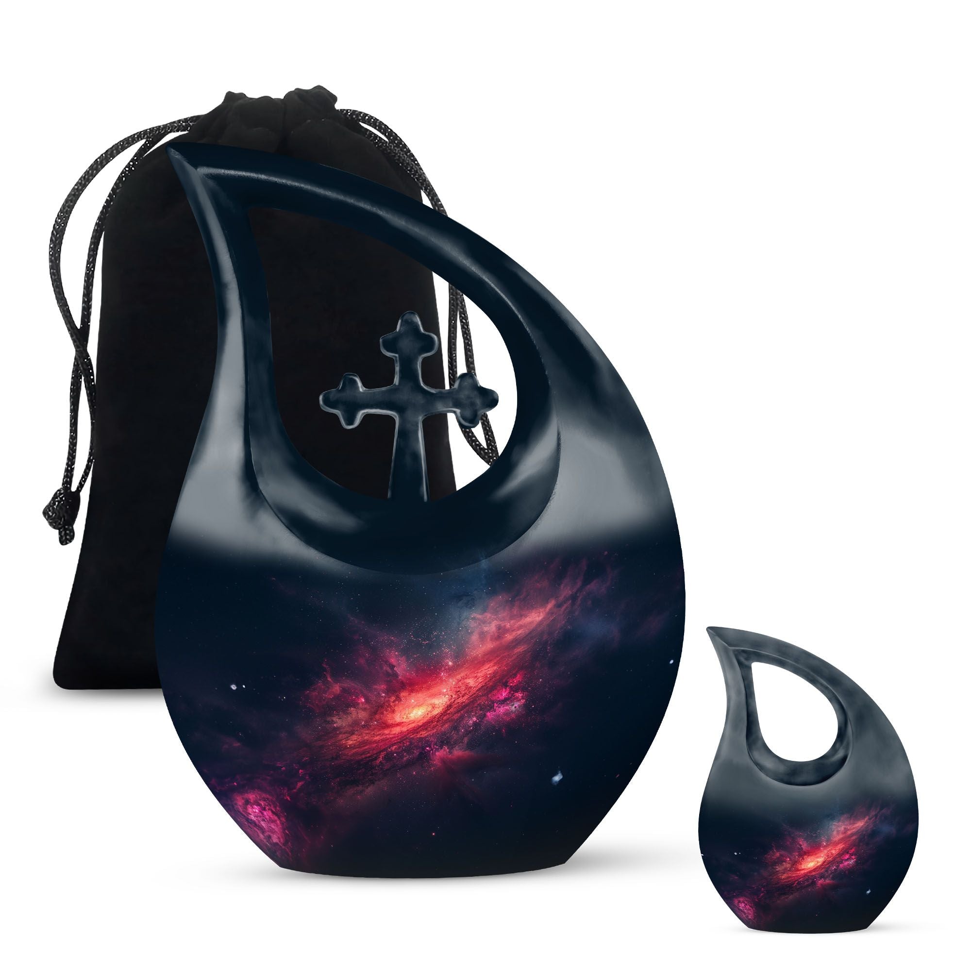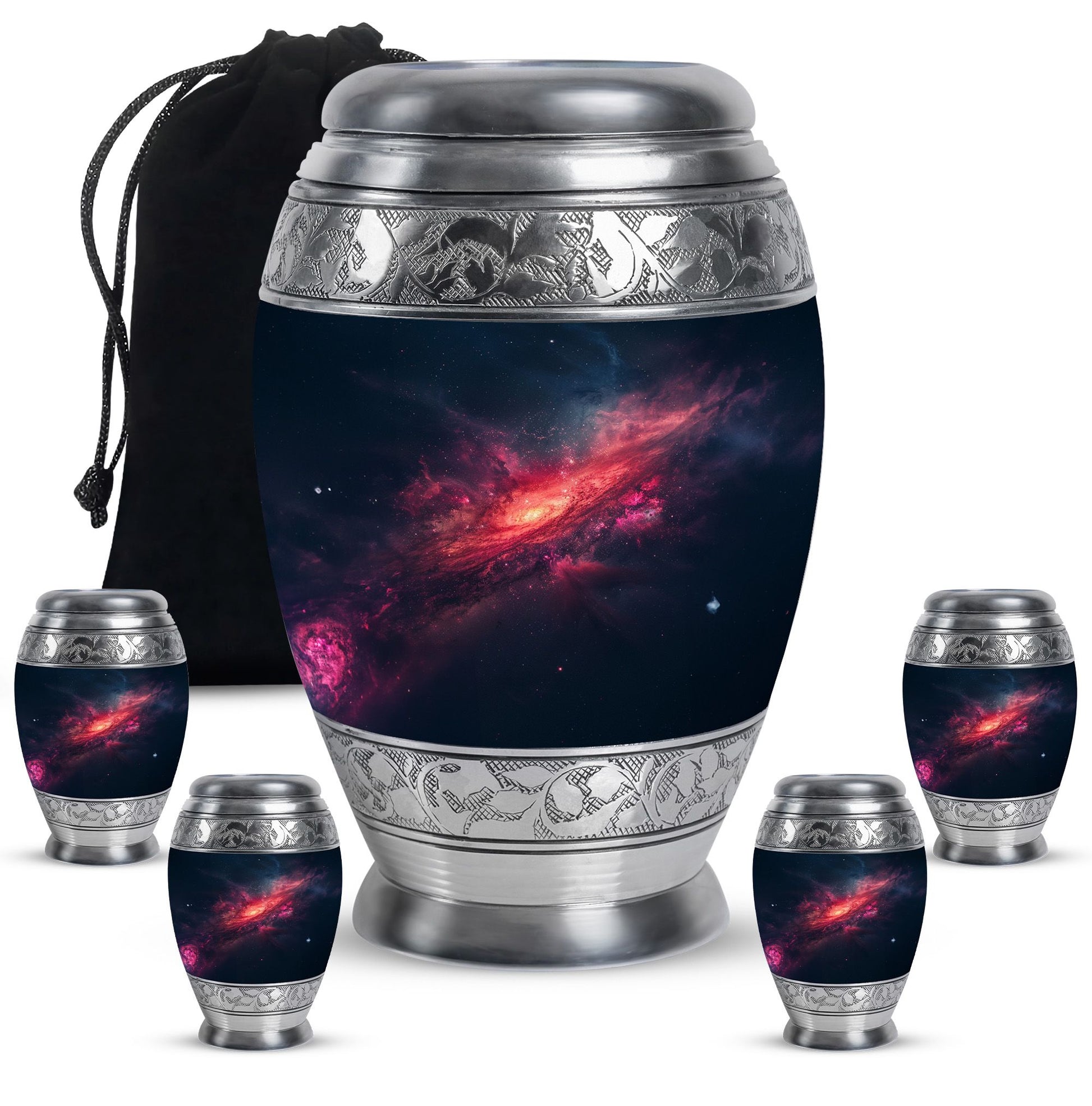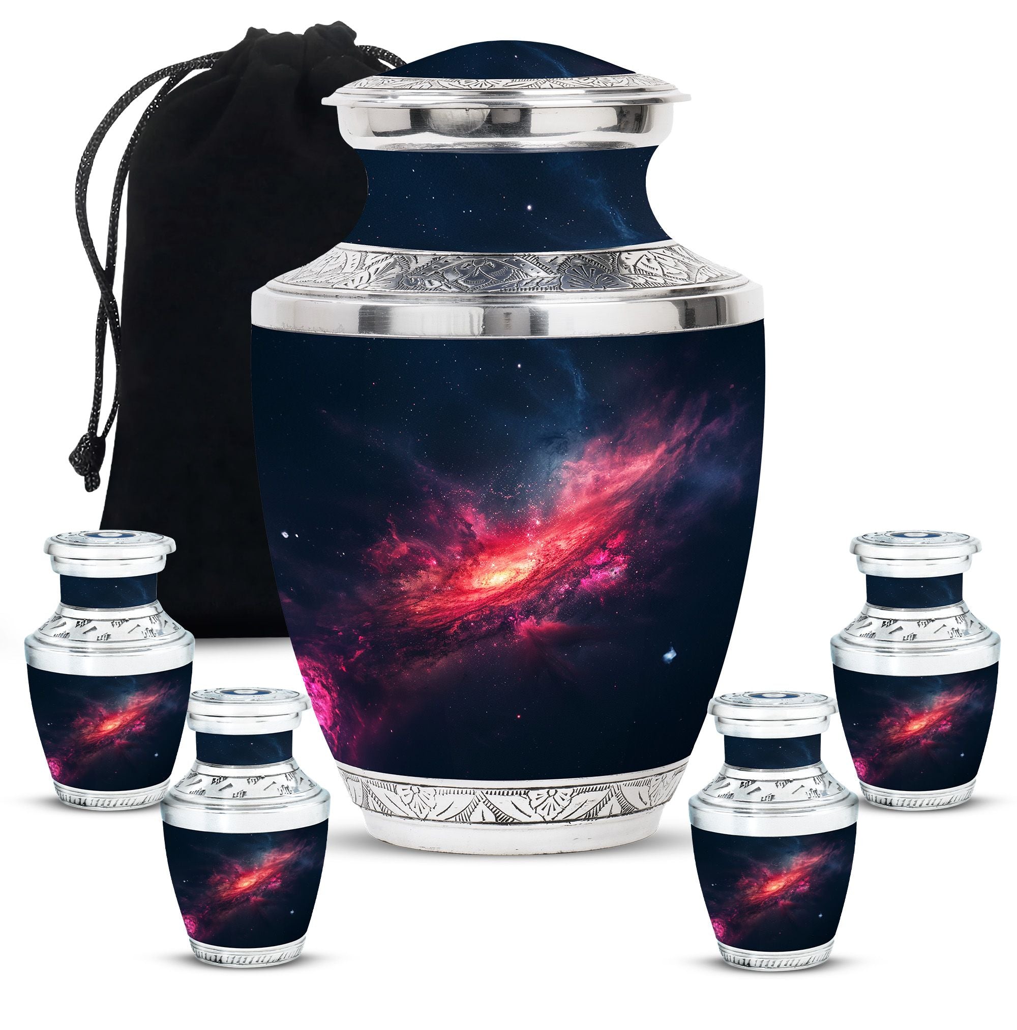 Crafted with care, this urn combines artistry and durability, making it a meaningful choice for families. Designed from high-quality aluminum, it showcases a galaxy-inspired theme, adding elegance to any setting. Suitable as both funeral cremation urns for ashes and part of a cremation urns large & small combo, it can serve as the primary vessel or be paired with small funeral urns for family keepsakes. This funeral adult urn ensures security with its screw-top lid while offering beauty and grace in every detail.