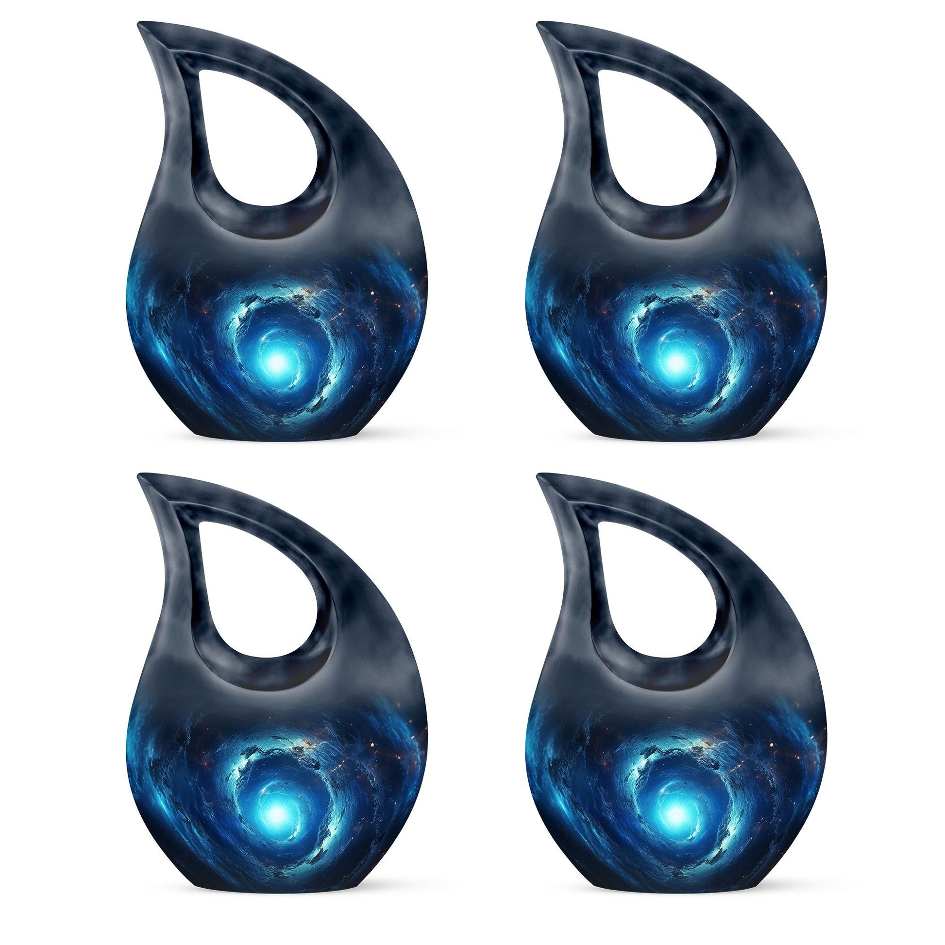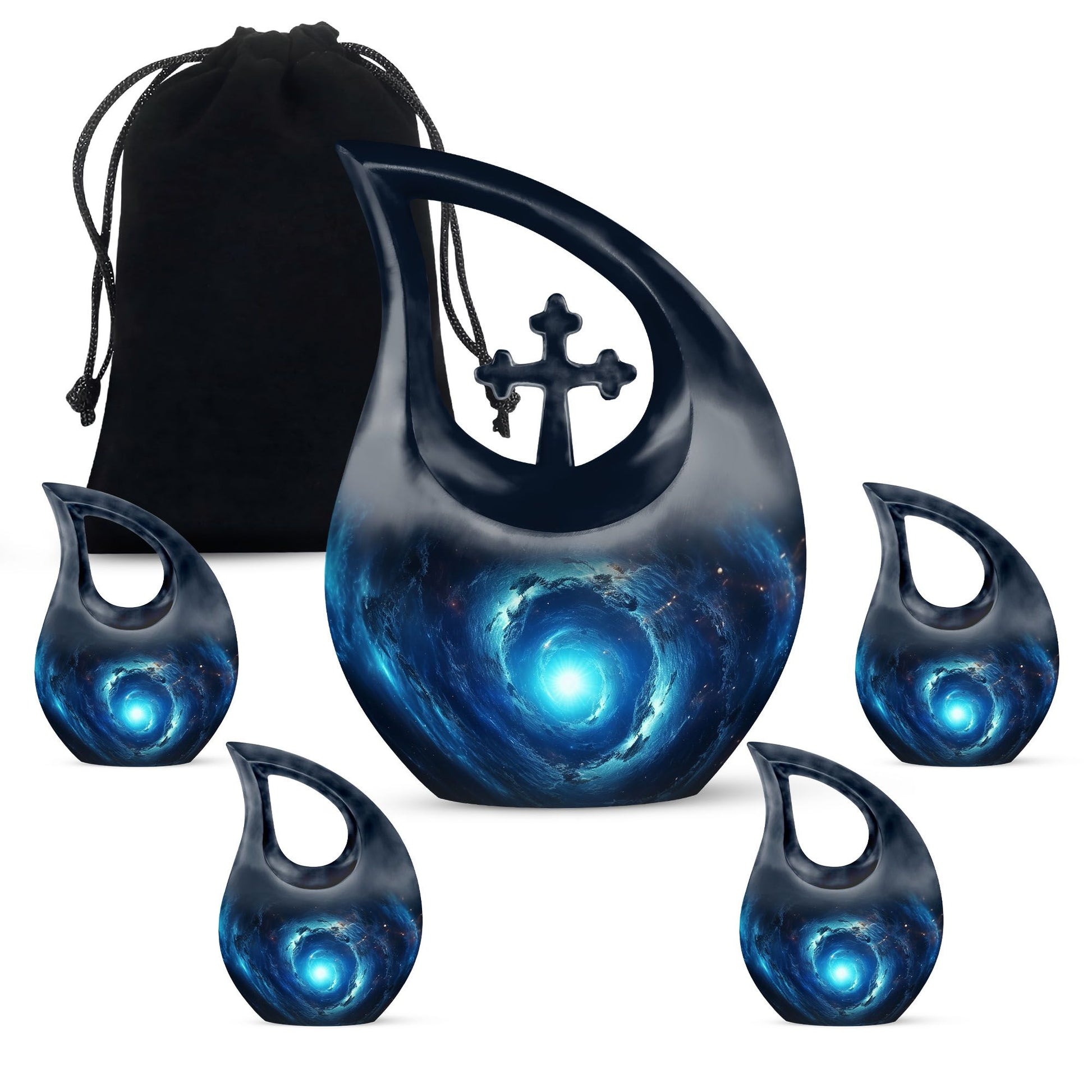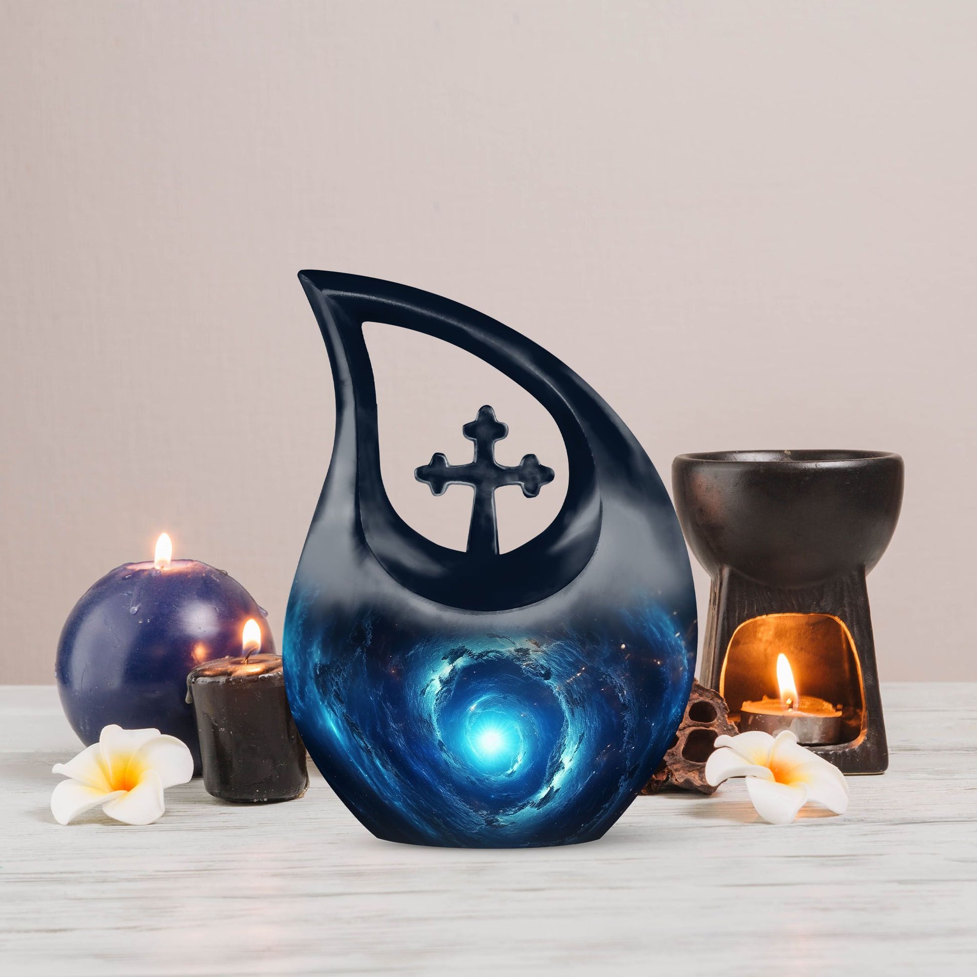 Expertly handcrafted from premium aluminum, the black cross drop memorial urn features a mesmerizing galactic swirl pattern accented with deep cosmic tones and a subtle metallic sheen. Its secure, threaded lid ensures your loved one’s ashes remain safe for generations. Designed for both display and burial, it serves as a timeless piece of art—perfect among cremation keepsake urns for human ashes adult or as a centerpiece urn for cremation in your home.