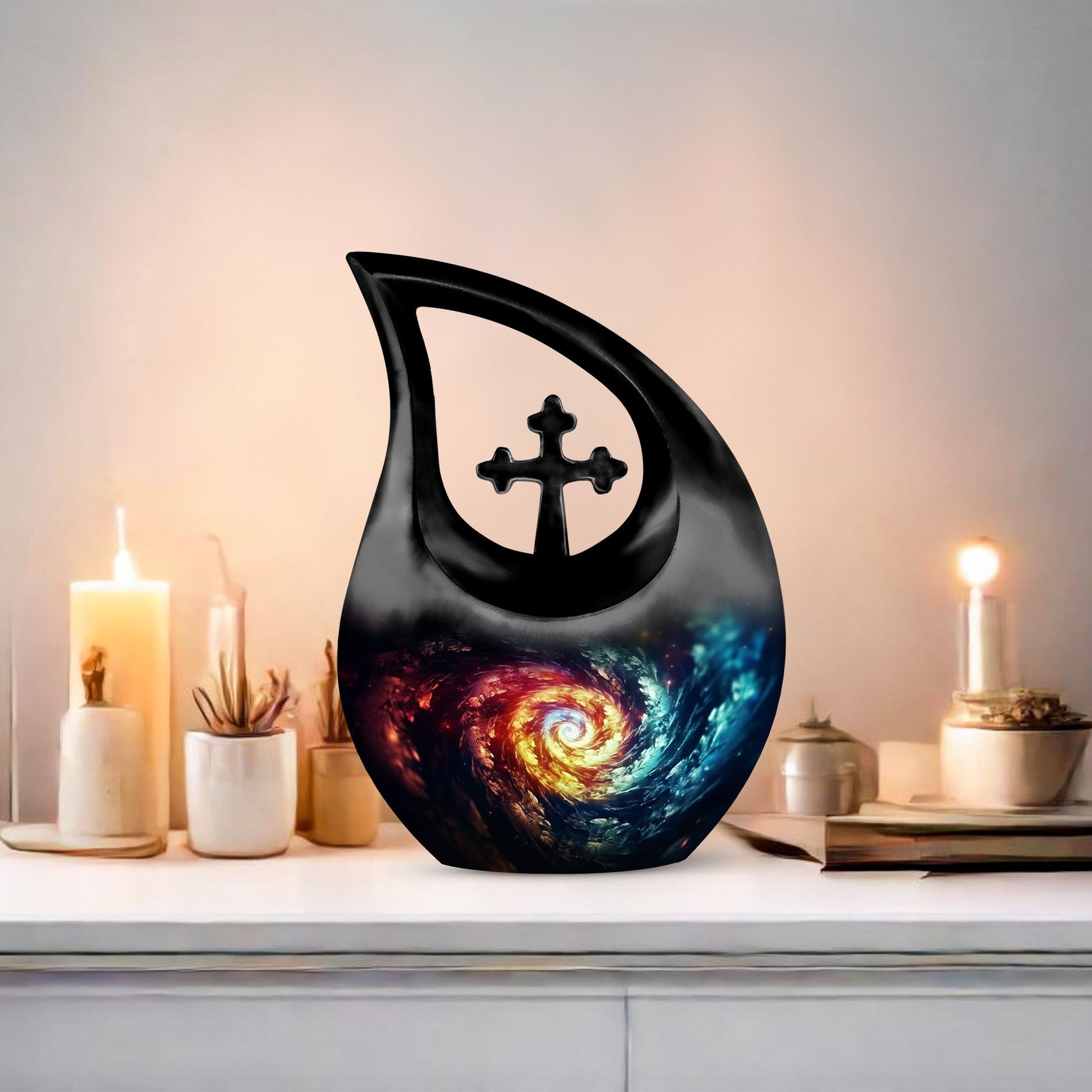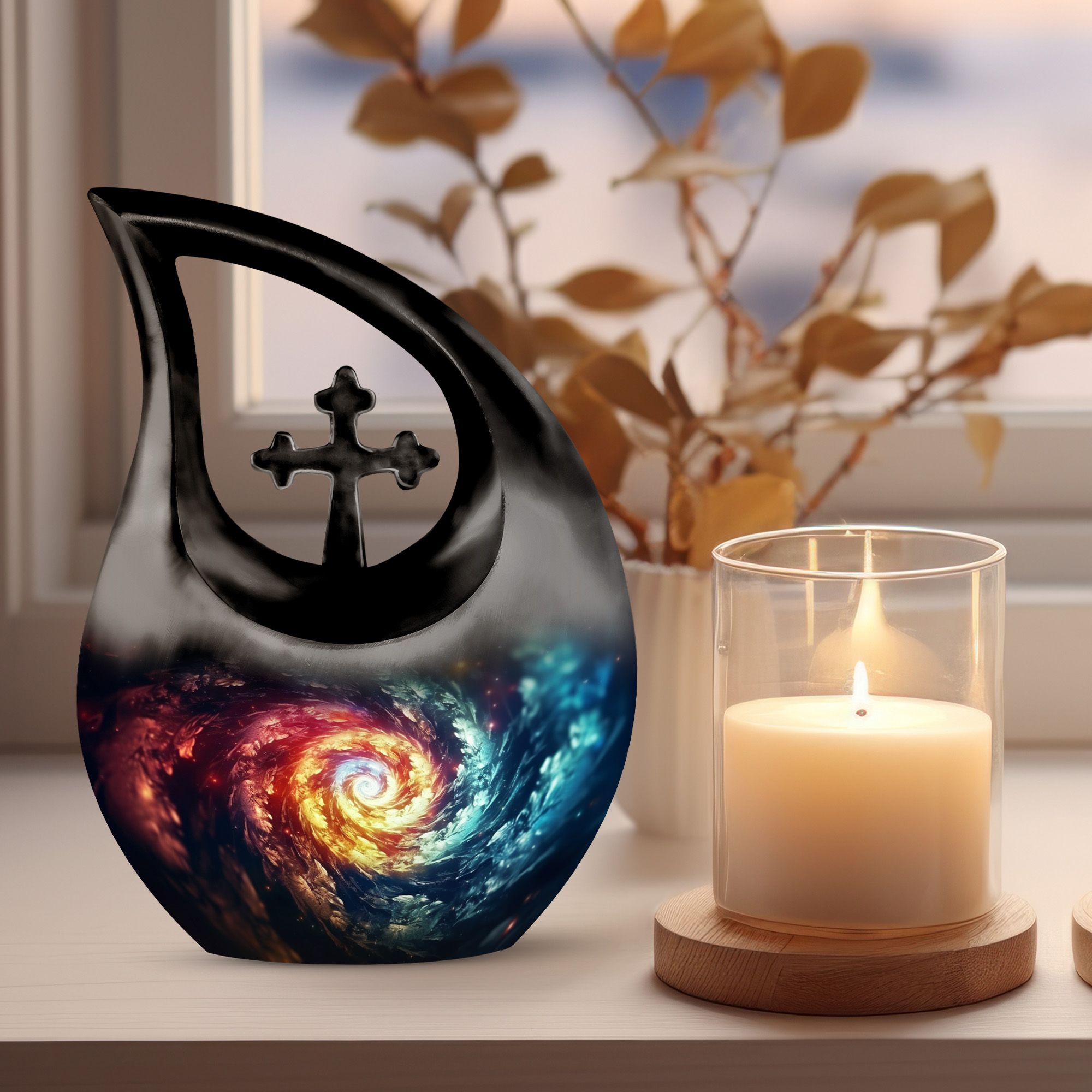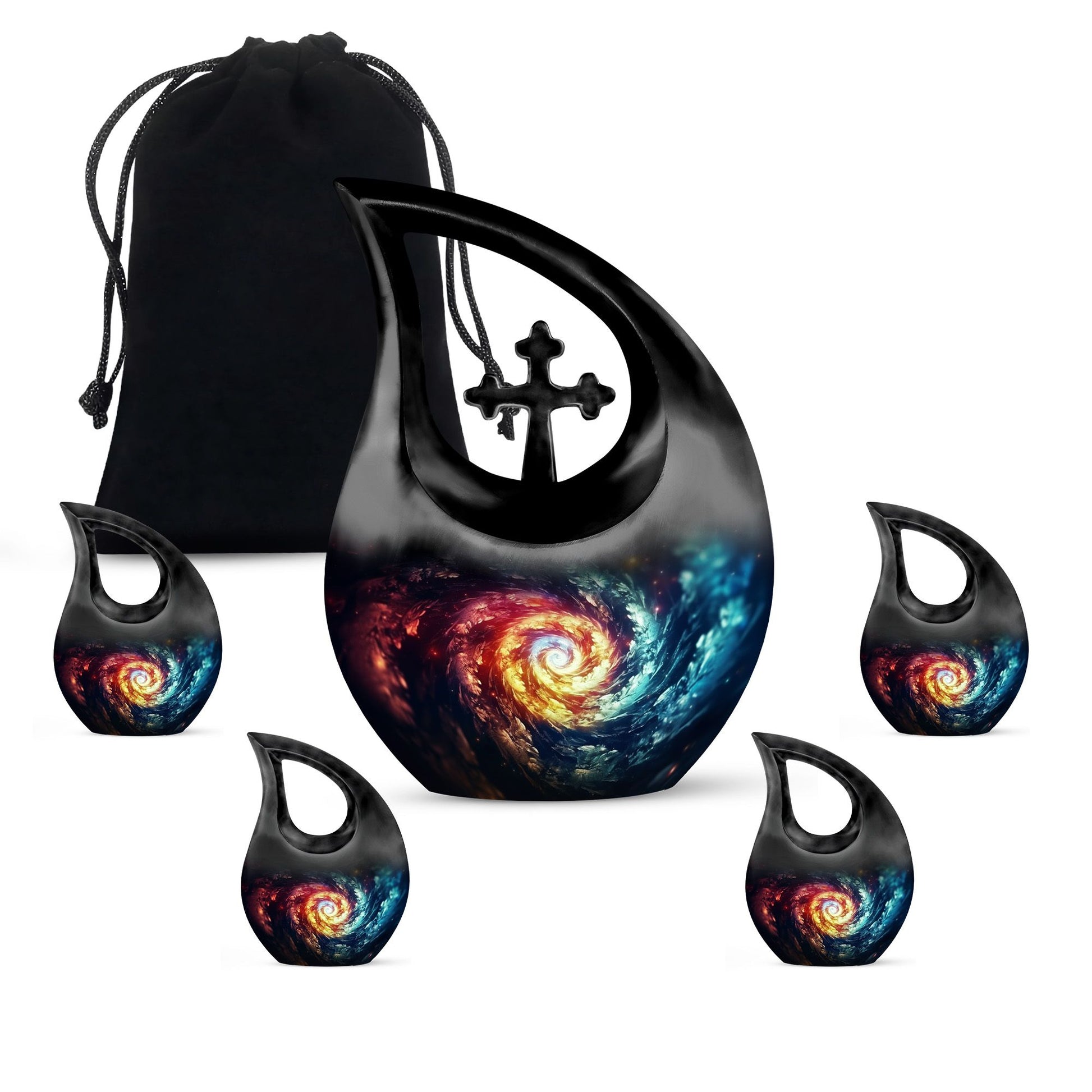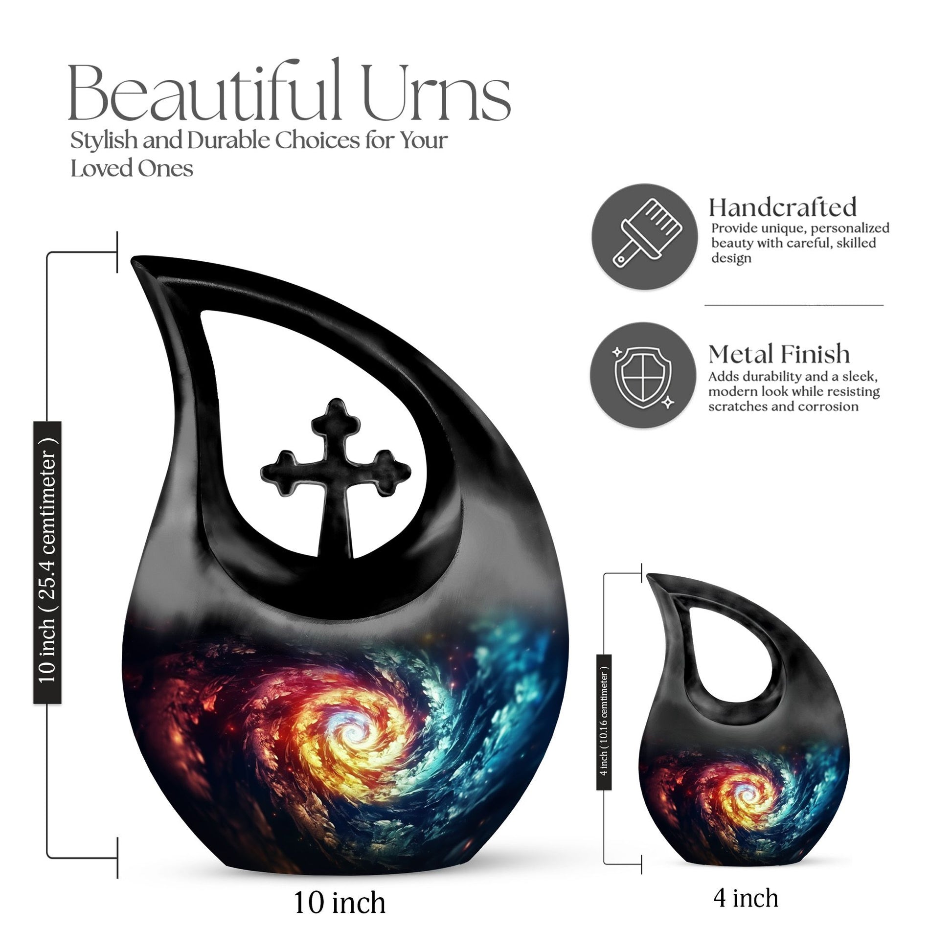 Crafted from durable aluminium, the full-size 10 inch urn showcases a swirling galaxy pattern illuminated with vibrant cosmic tones. Its generous capacity is perfect for those needing large urns for female & male, a dignified cremation urn adult male, or a graceful urn female adult option. The matching keepsake urns allow families to share ashes lovingly, making the set ideal for memorial ceremonies or home remembrance. A secure screw-top lid ensures long-term protection and peace of mind.