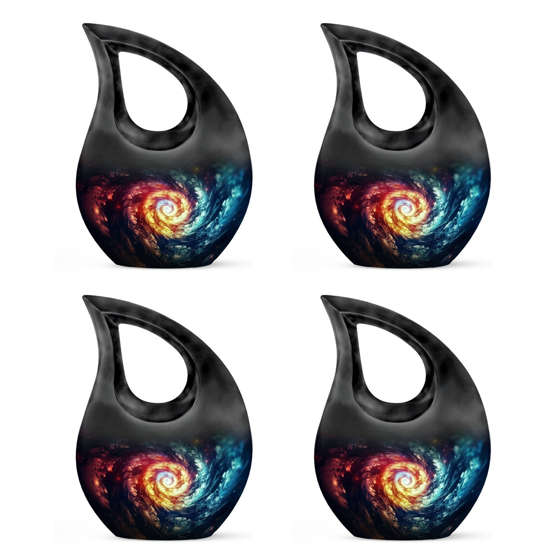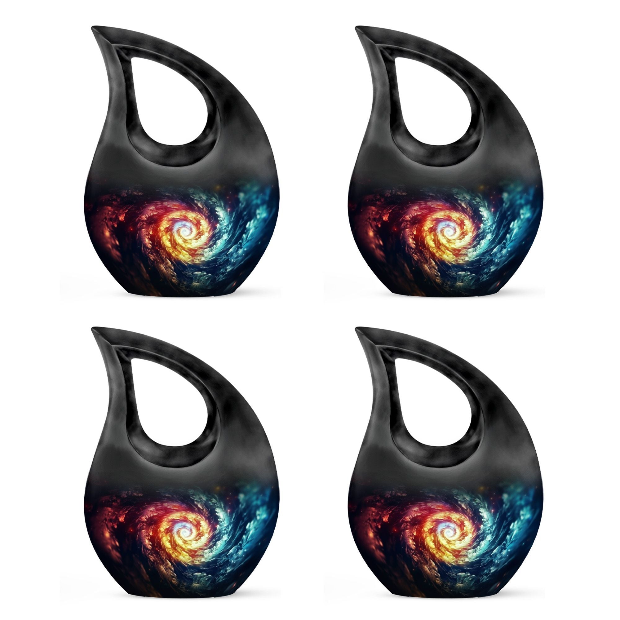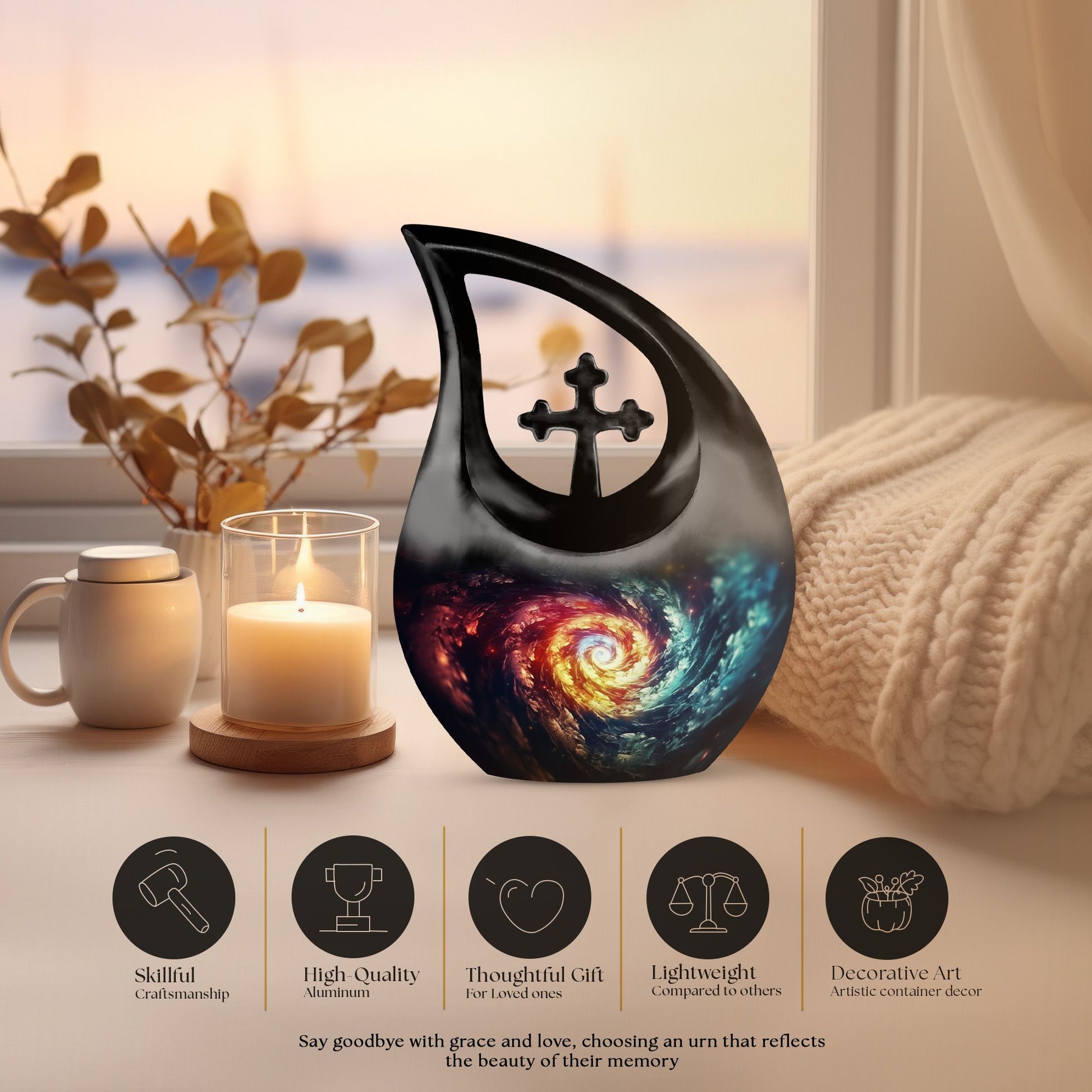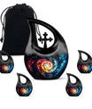 Crafted from durable aluminium, the full-size 10 inch urn showcases a swirling galaxy pattern illuminated with vibrant cosmic tones. Its generous capacity is perfect for those needing large urns for female & male, a dignified cremation urn adult male, or a graceful urn female adult option. The matching keepsake urns allow families to share ashes lovingly, making the set ideal for memorial ceremonies or home remembrance. A secure screw-top lid ensures long-term protection and peace of mind.