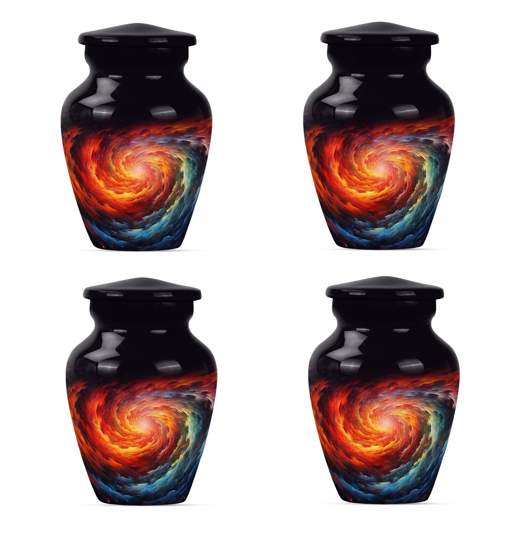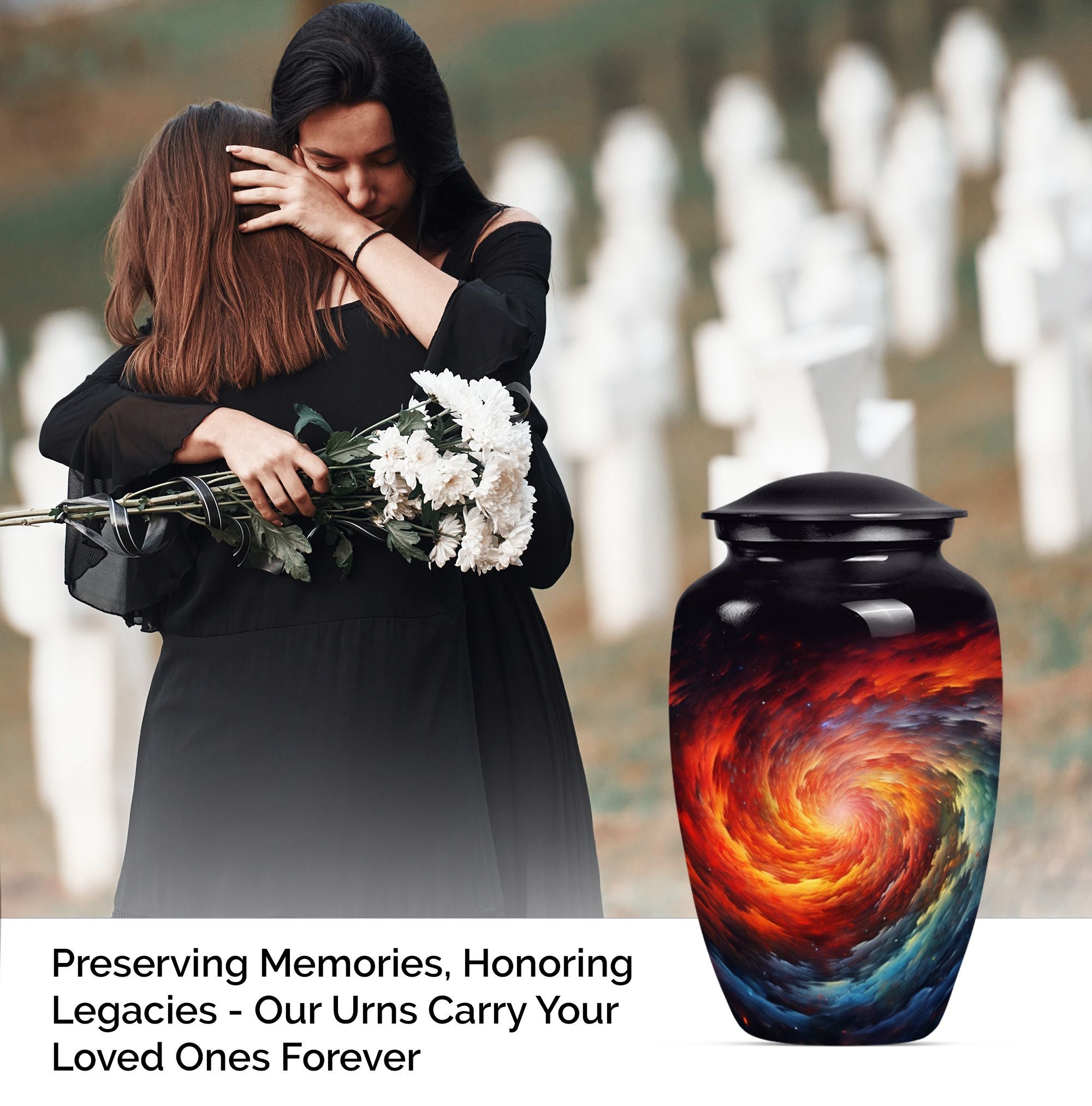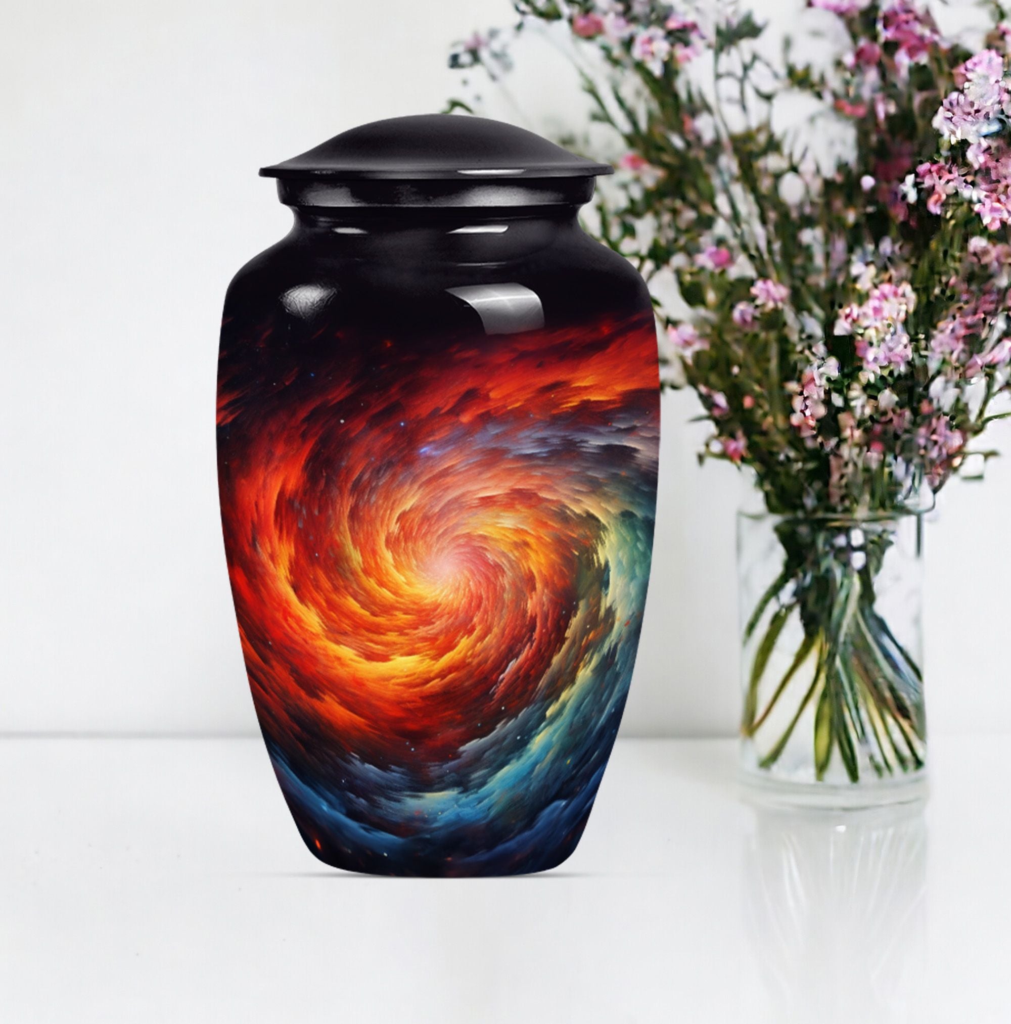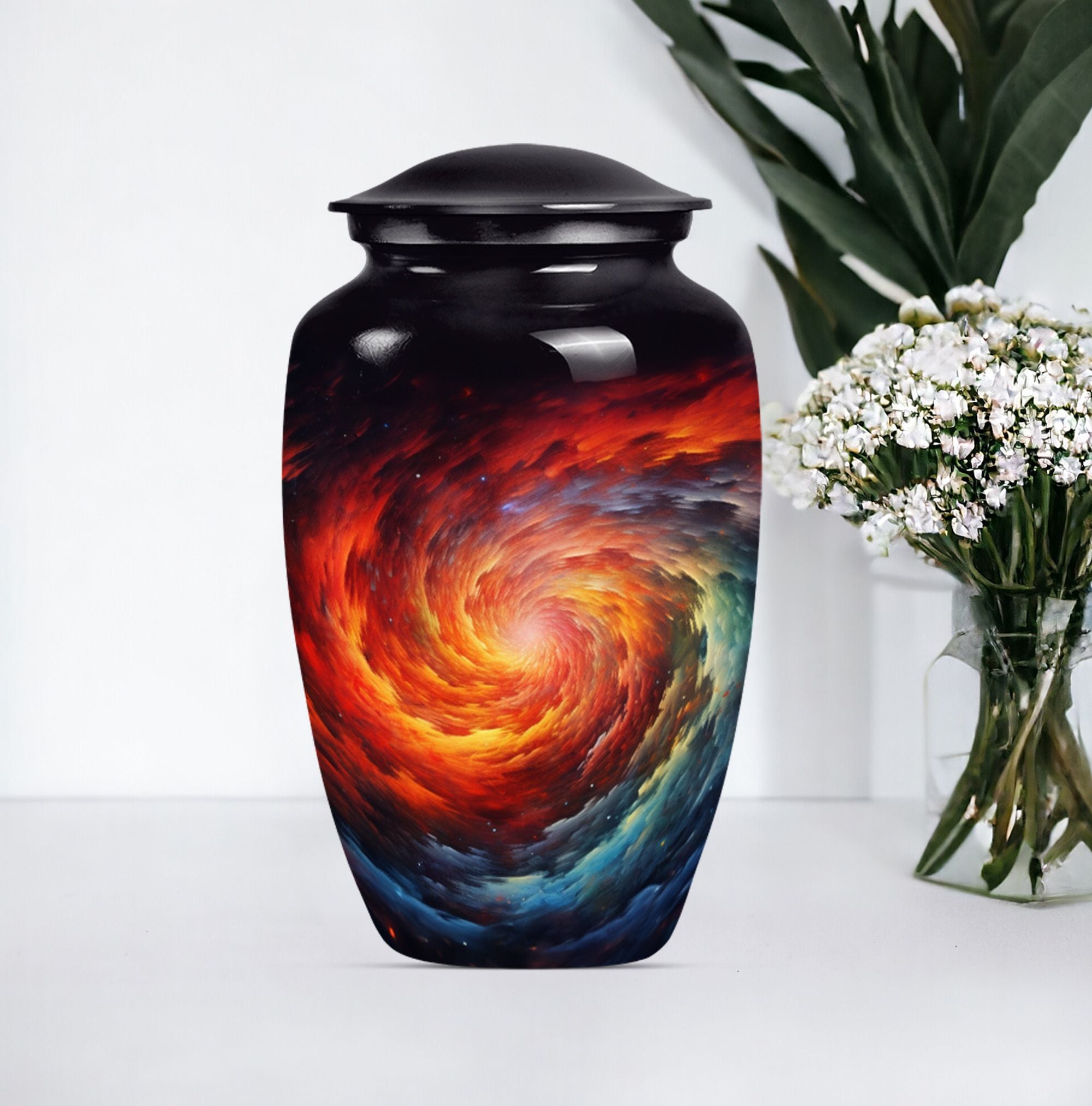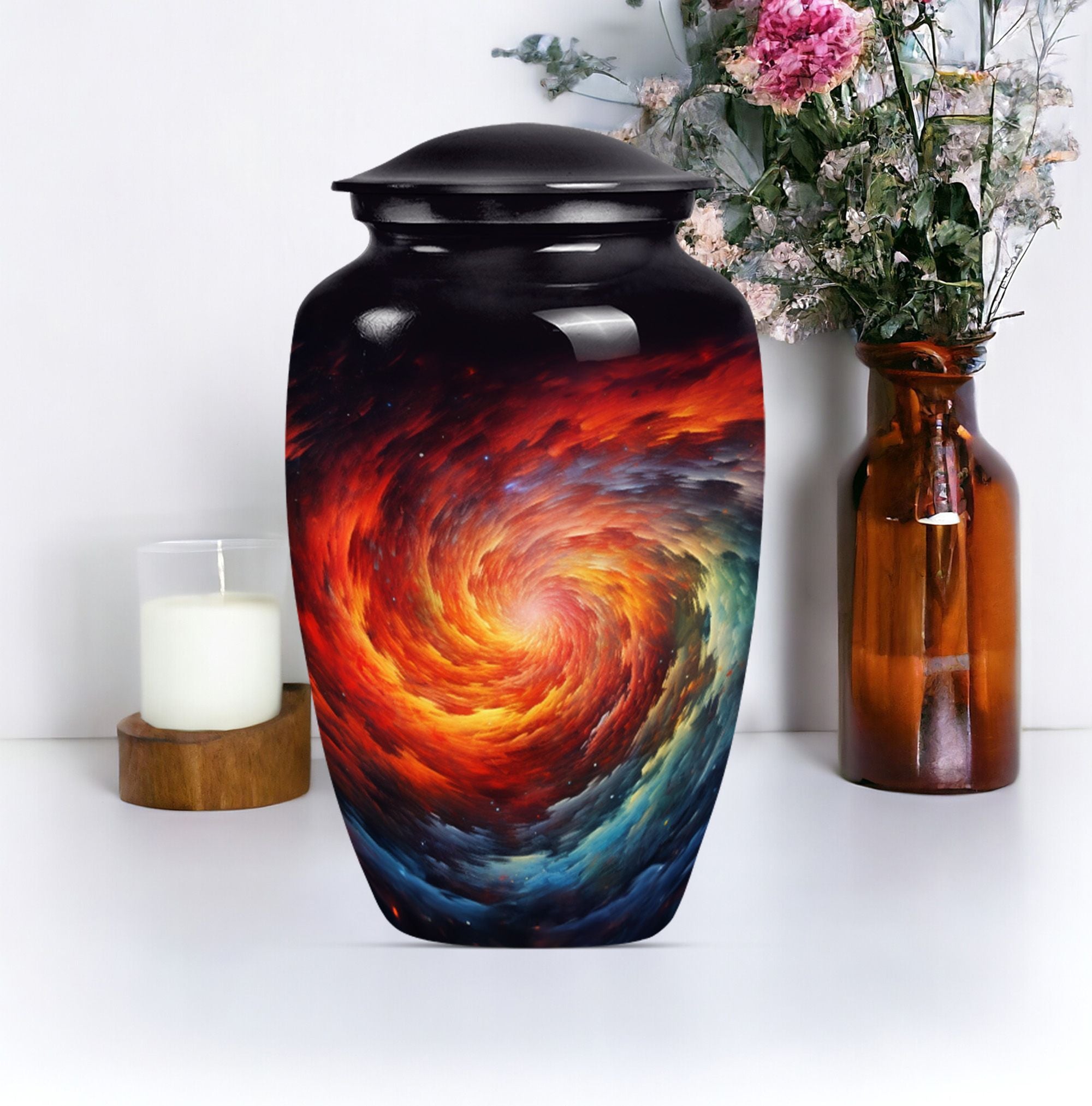 Experience peace and tranquility, lovingly nurturing the sacred memories of your dear ones with our glaaxy Urn or often referred to as 'memorial burial urn'. It possesses an inspiring 'Purple Meadow' theme, enveloping a comforting calmness. Sized at 10 inches, this classical masterpiece doesn’t compromise on storage. It can securely hold up to 200 cubic inches of ashes, ensuring complete containment, courtesy of its considerably spacious interior. Crafted with resilient aluminium, the Urn weighs 3.3 pounds – a sturdy companion for a long-lasting remembrance. Additionally, our deluxe package includes an elegant velvet pouch, providing a dignified home for the resting ashes. Add a personalized touch by engraving names on the urn, fostering a closer, intimate bond. As a part of the 'Large Urns' section, it makes an impactful presence with its unique aesthetics. This funeral urn, prominently searched as 'memorial urns' or 'cremation urns for humans' on online platforms, serves to be a heartfelt memorial solution in times of grieving and remembrance. Honour, remember, and cherish the eternal journey of your loved ones with our classic, elegantly designed memorial urn.