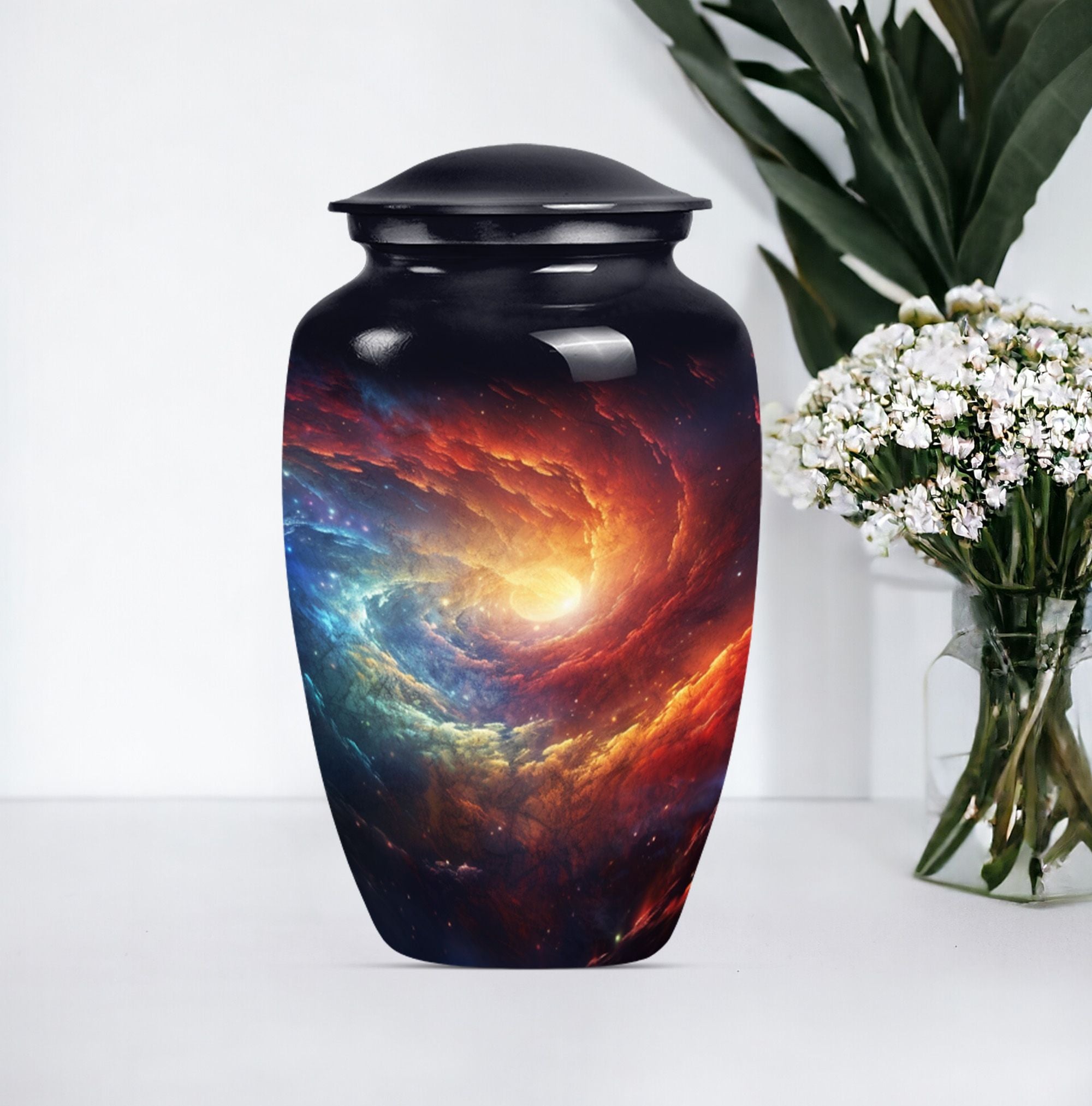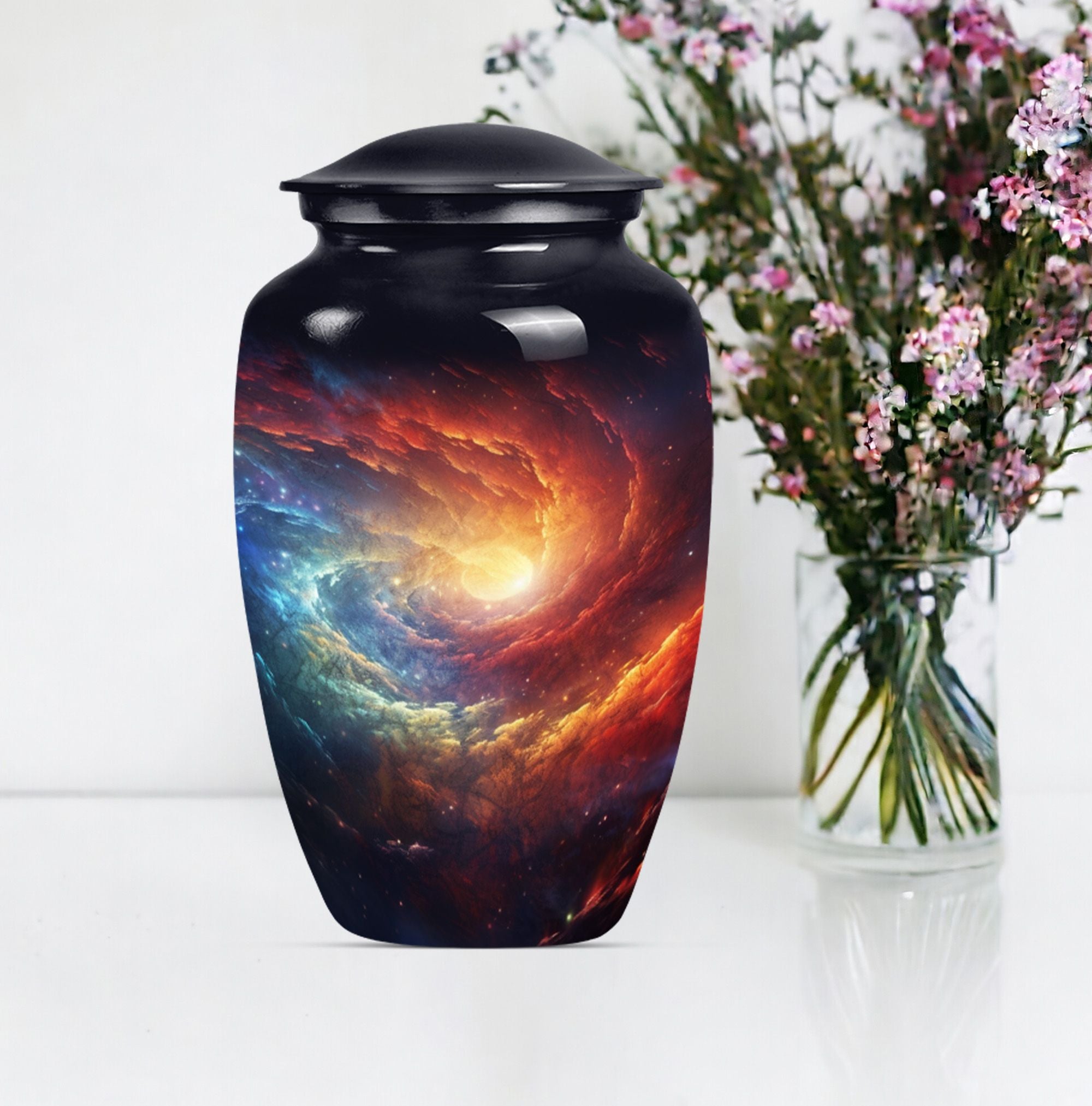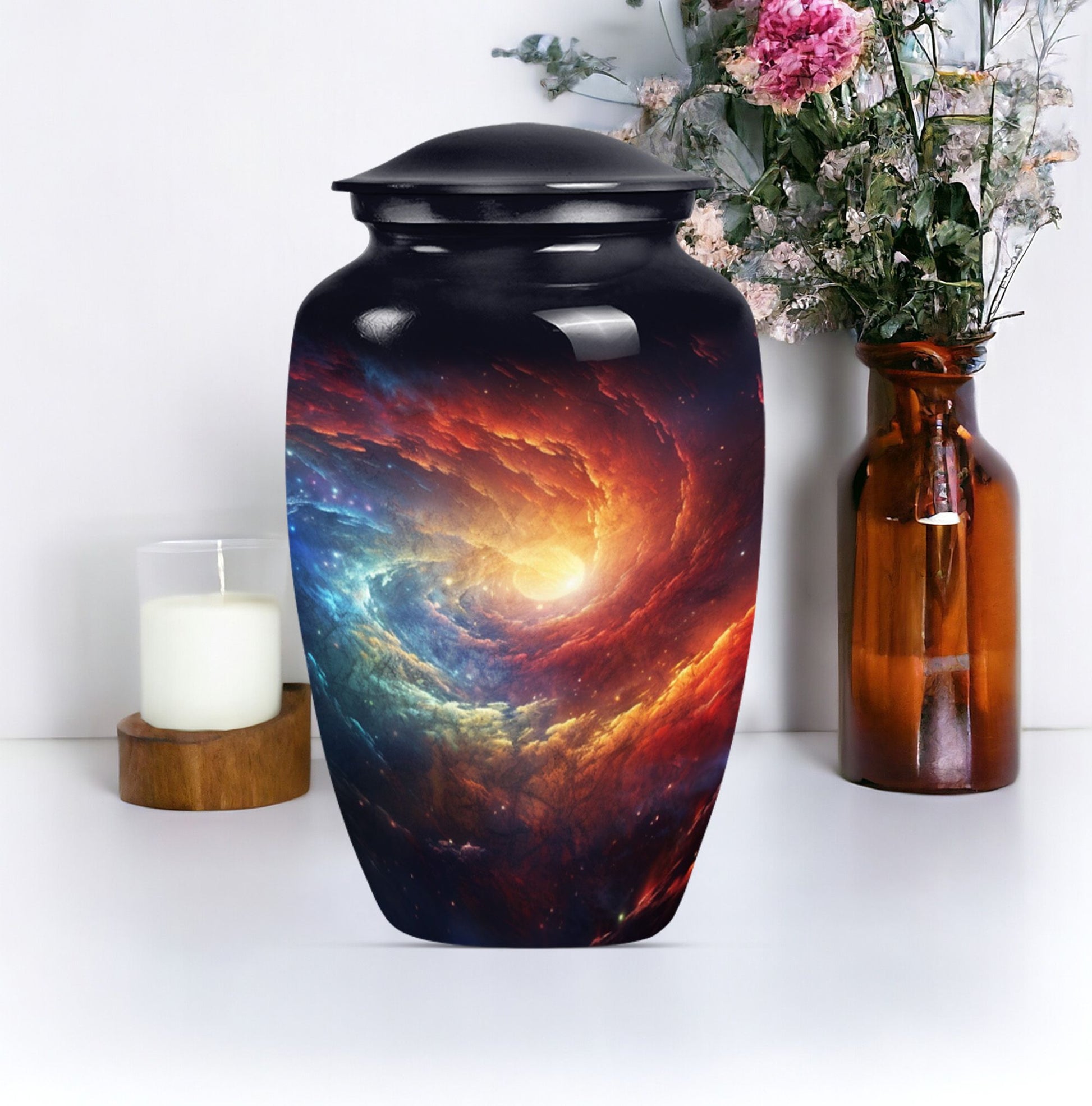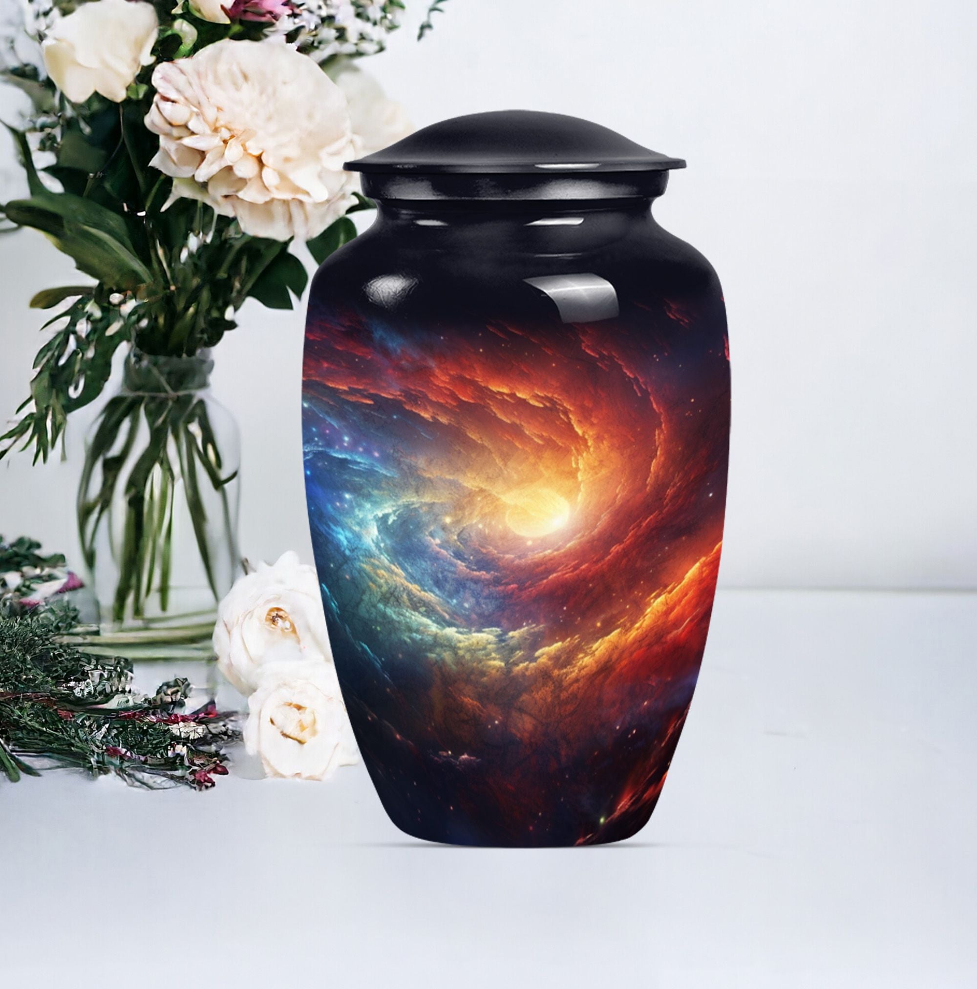 Experience a profound sense of peace and reassurance with our exclusive 10-inch Galaxy Urn, a supreme choice in memorial urns designed with utmost sensitivity and thoughtfulness. Majestically standing at 10 inches high and weighing 3.3 pounds, this substantial large urn is meticulously crafted from the finest aluminium. Its 200 cubic inches capacity generously contains the cherished ashes, gently cocooned within a velvet pouch provided in the package. Feel the calming resonance of the Purple Meadow theme bestowing solace during the time of loss. The jewel in the crown is the availability of personalizing this burial custom urn with engraved names, adding a deeply personal touch to this last tribute. Despite its impressive stature, this cremation dad urn, cratering to both men and women, subtly slides into its nook, leaving a lasting imprint of memories. This large urn with a classical design merges the worlds of strength, beauty, and remembrance, universally recognized among urns for human ashes. Please note, the design attribute is undisclosed.