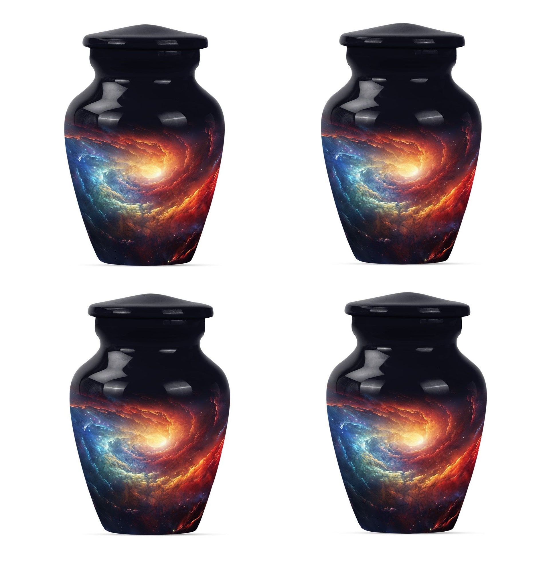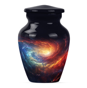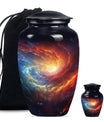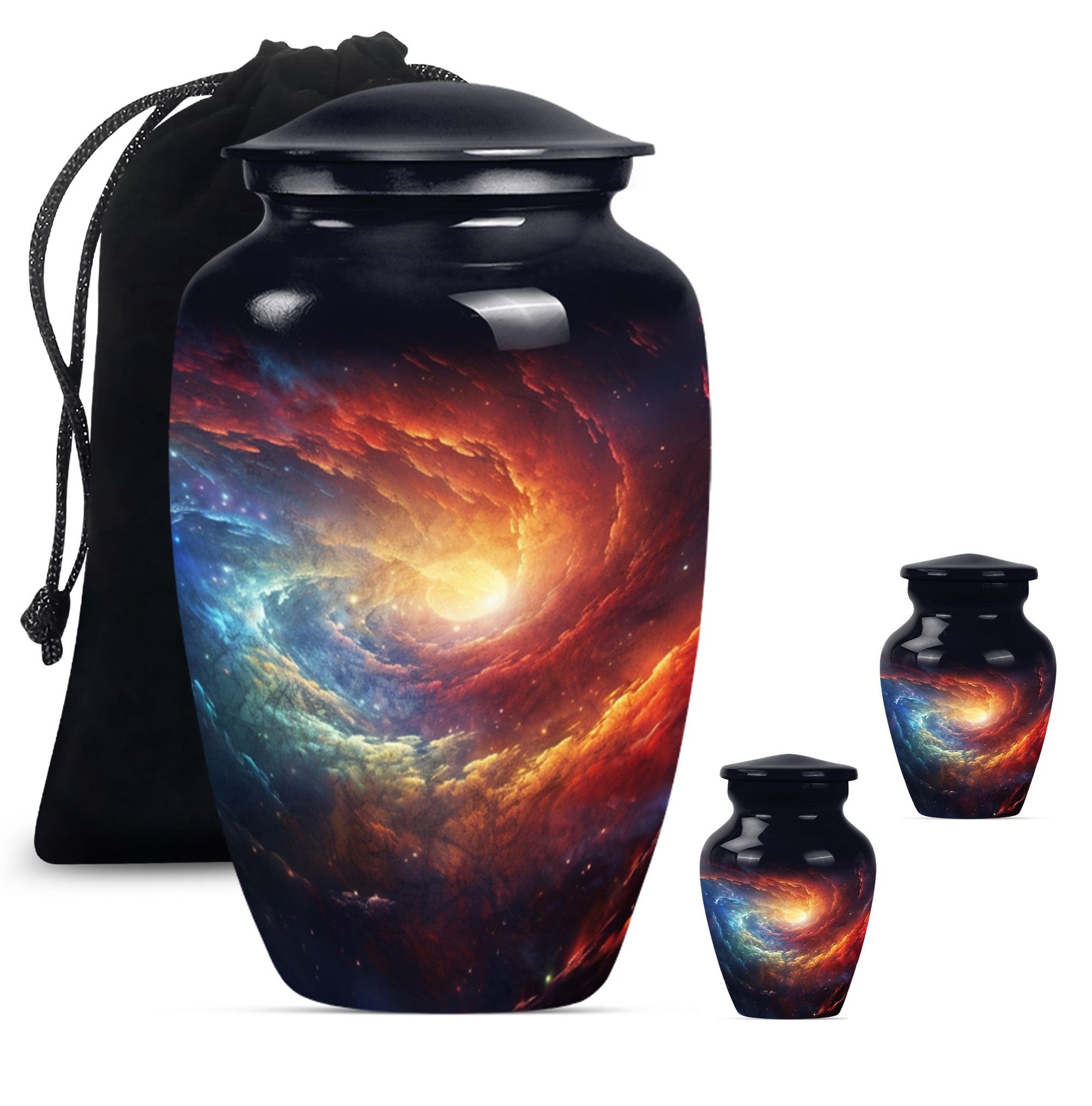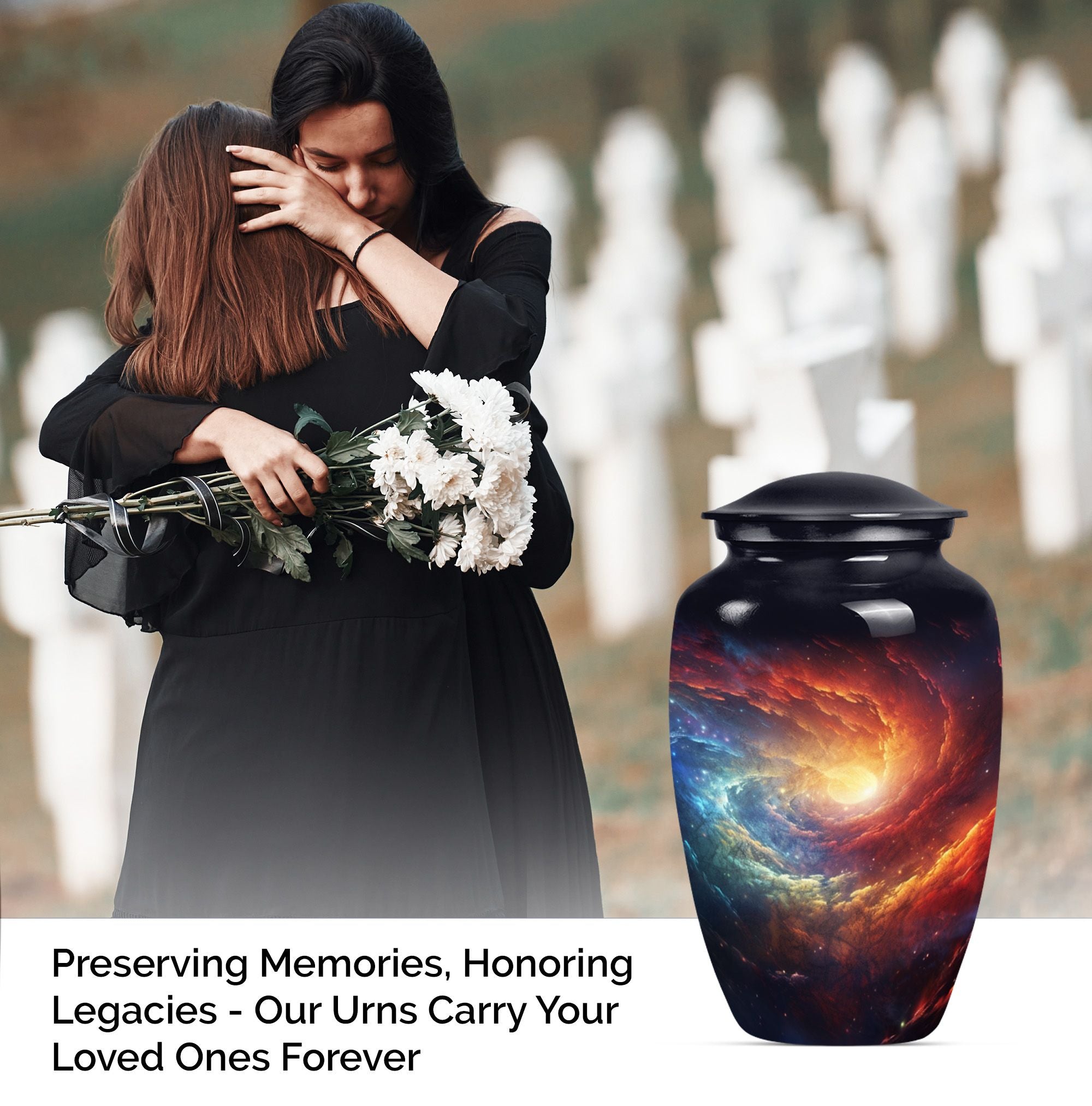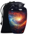 Experience a profound sense of peace and reassurance with our exclusive 10-inch Galaxy Urn, a supreme choice in memorial urns designed with utmost sensitivity and thoughtfulness. Majestically standing at 10 inches high and weighing 3.3 pounds, this substantial large urn is meticulously crafted from the finest aluminium. Its 200 cubic inches capacity generously contains the cherished ashes, gently cocooned within a velvet pouch provided in the package. Feel the calming resonance of the Purple Meadow theme bestowing solace during the time of loss. The jewel in the crown is the availability of personalizing this burial custom urn with engraved names, adding a deeply personal touch to this last tribute. Despite its impressive stature, this cremation dad urn, cratering to both men and women, subtly slides into its nook, leaving a lasting imprint of memories. This large urn with a classical design merges the worlds of strength, beauty, and remembrance, universally recognized among urns for human ashes. Please note, the design attribute is undisclosed.
