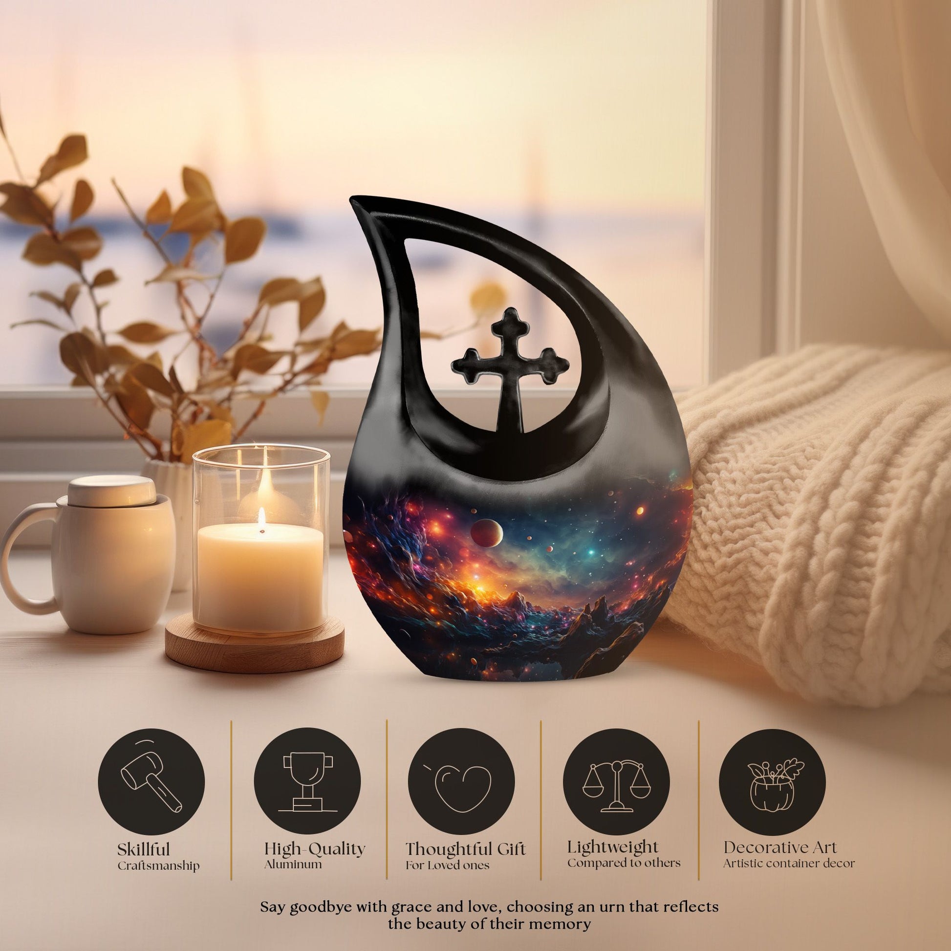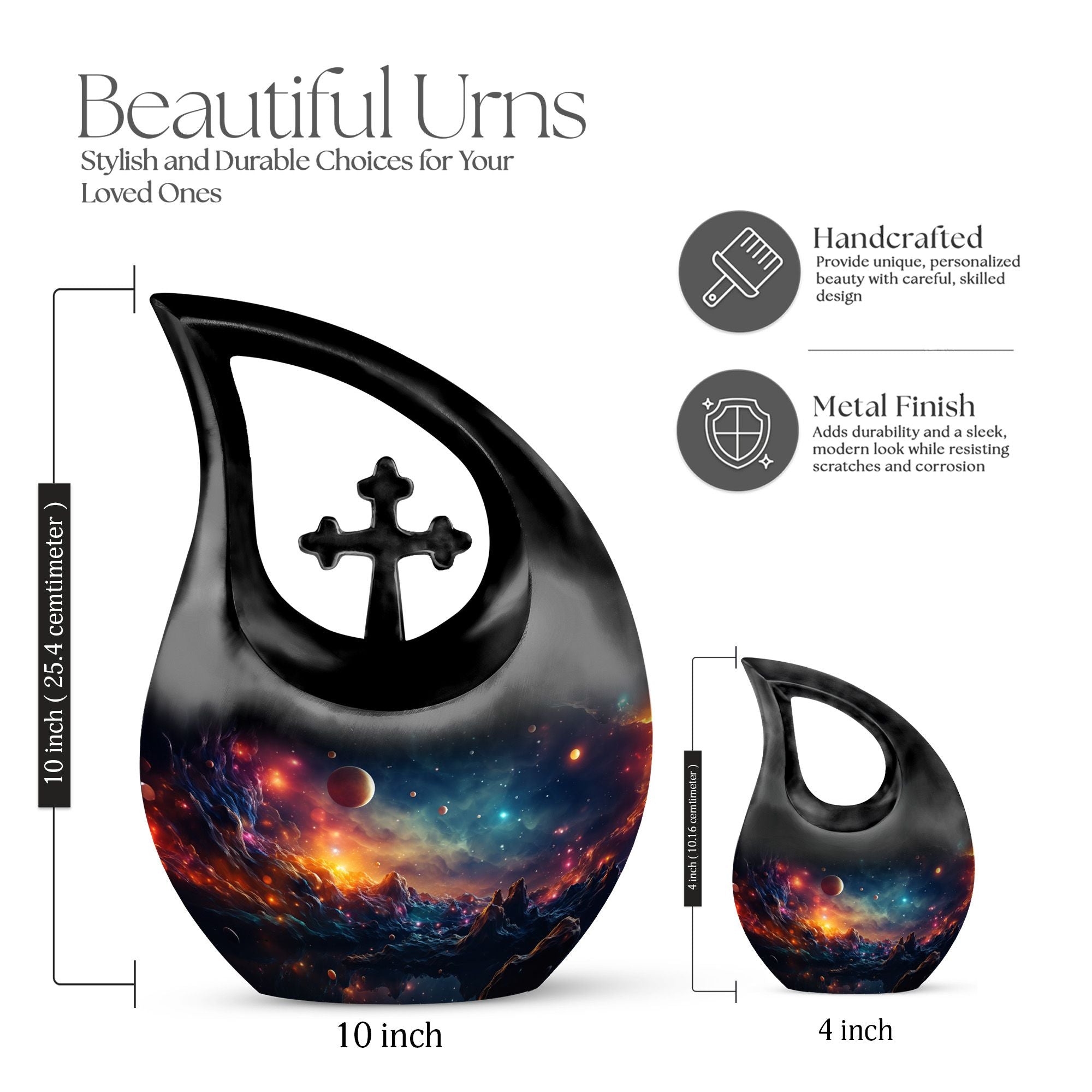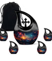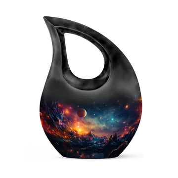 Crafted from durable aluminum, this 10 inch urn features swirling planetary landscapes, glowing stars, and rich cosmic hues symbolizing eternity and boundless love. Its secure screw-top lid ensures long-lasting protection, making it suitable for urns ashes adult female, urn adult male memorials, or urns for human ashes male. This design also supports families needing urns adult male small, urns ashes male, urn adult female ashes, or urns adult male dad tributes, offering a meaningful combination of beauty and security.