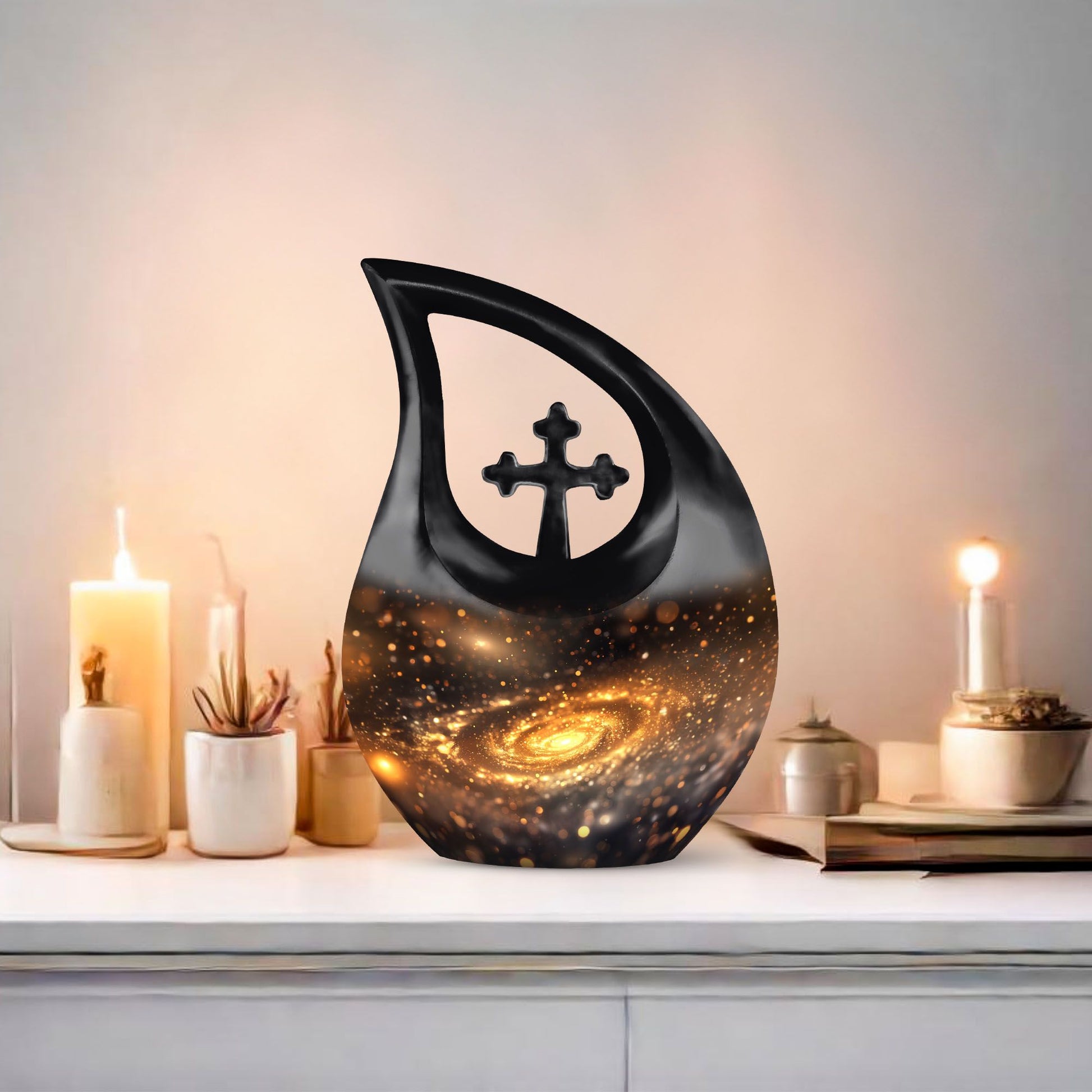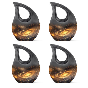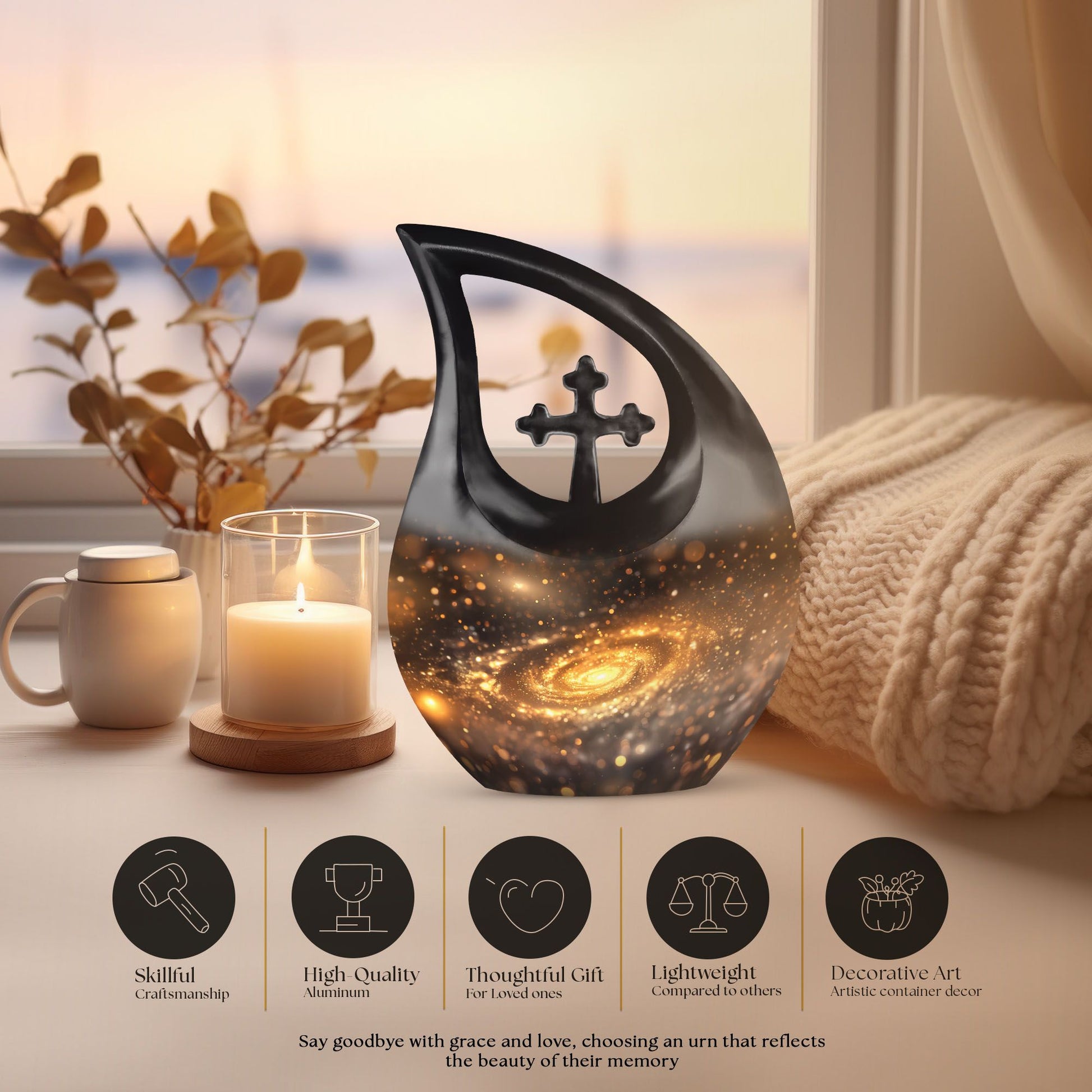 The Golden Galaxy Waves Urn stands as a symbol of light within the darkness — a comforting, celestial tribute for those whose spirits now shine among the stars.