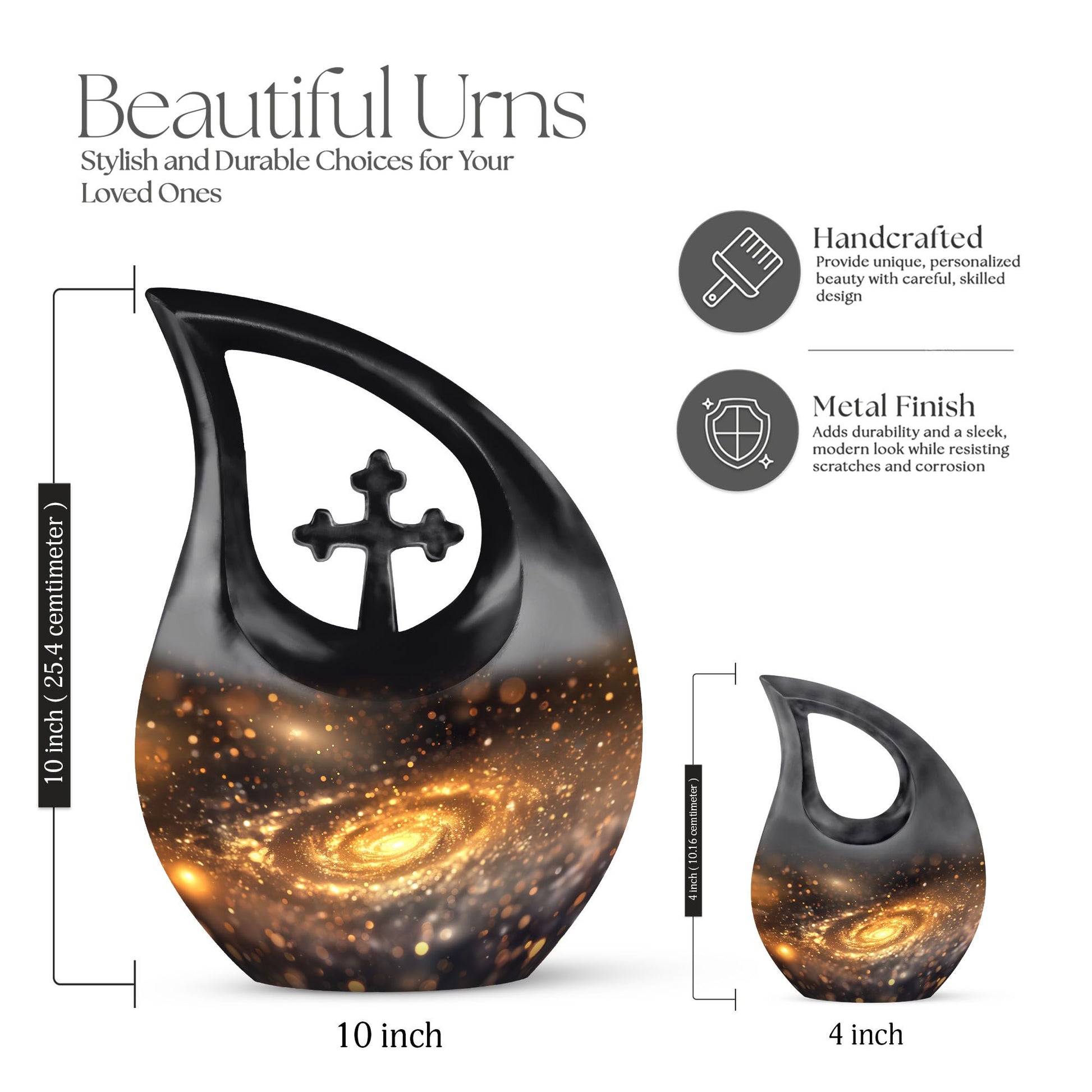 Meticulously handcrafted from durable aluminum, this cremation urn for ashes features a rich golden and black galaxy finish with subtle wave-like details that reflect light beautifully. Its smooth surface and secure screw-top lid ensure safety and peace of mind. Ideal for home memorials, burial, or columbarium placement, this urn is perfect as a cremation urn women or urn for human ashes adult men, representing both strength and tenderness.