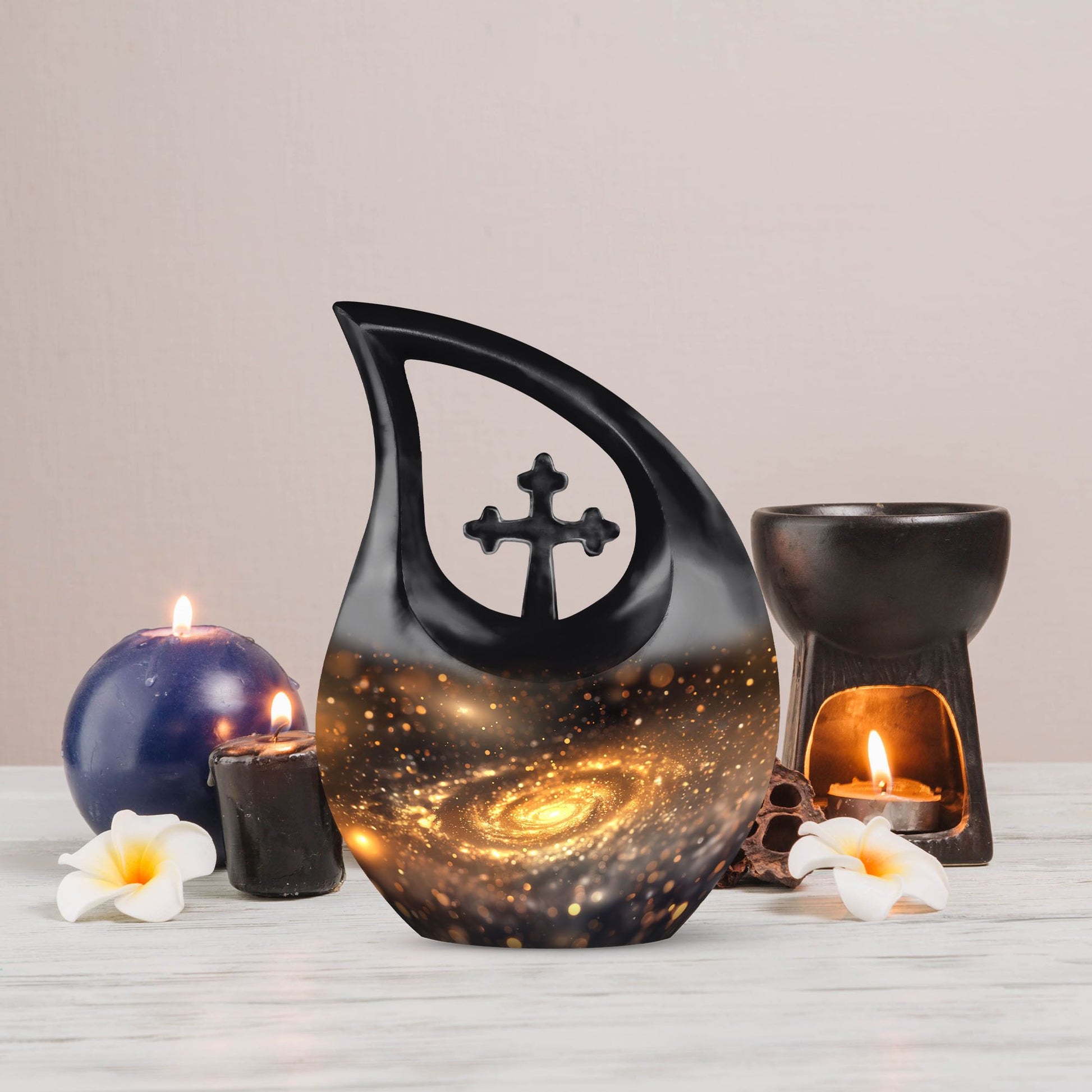 The Golden Galaxy Waves Memorial Urn embodies timeless elegance and spiritual serenity. Designed to honor life’s eternal journey, this urn captures the beauty of the cosmos with flowing golden patterns that symbolize unity between heaven and earth. Suitable as a burial urn for men or urn for ashes for women, it serves as a graceful reminder of love that transcends time and space.