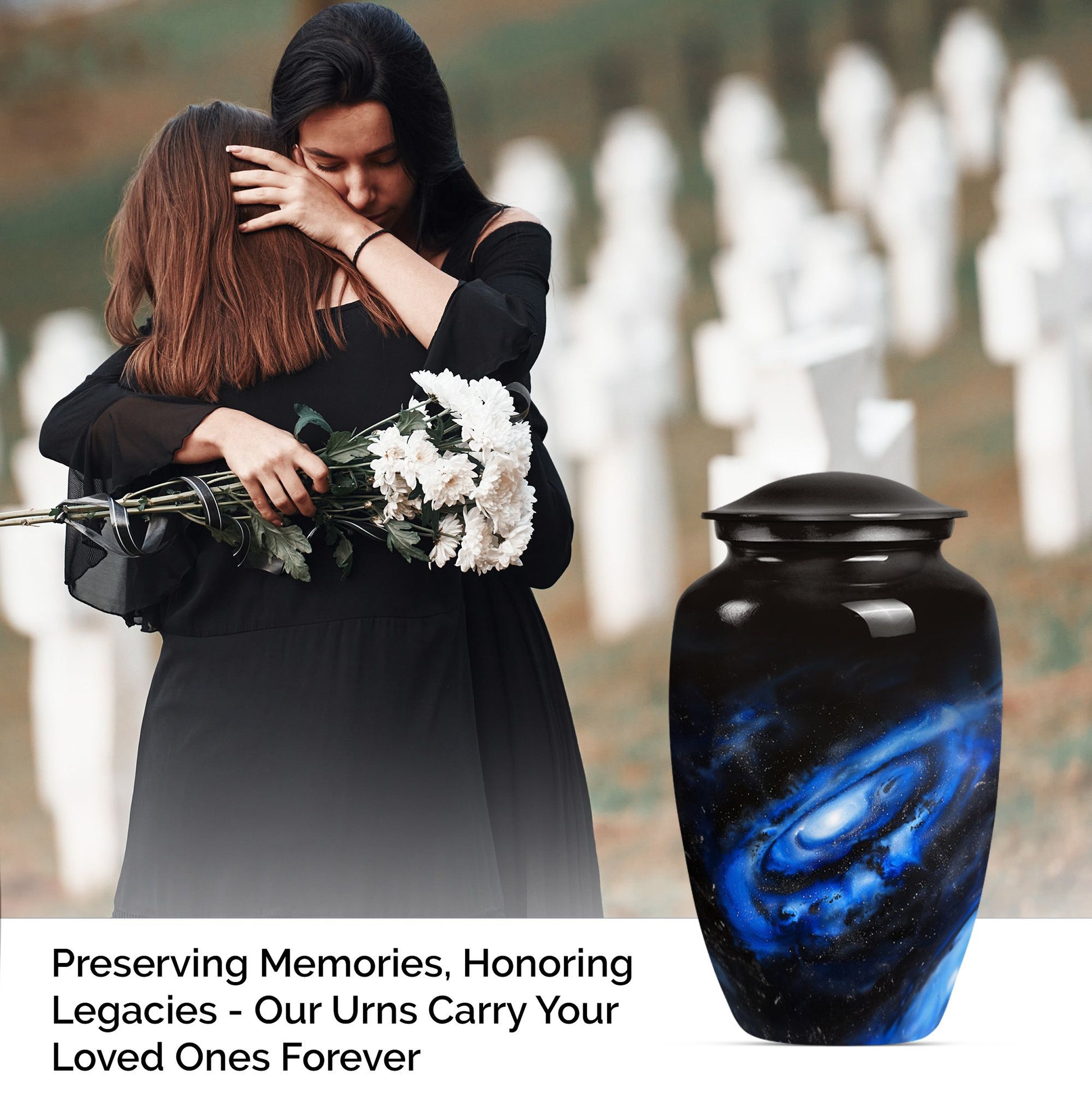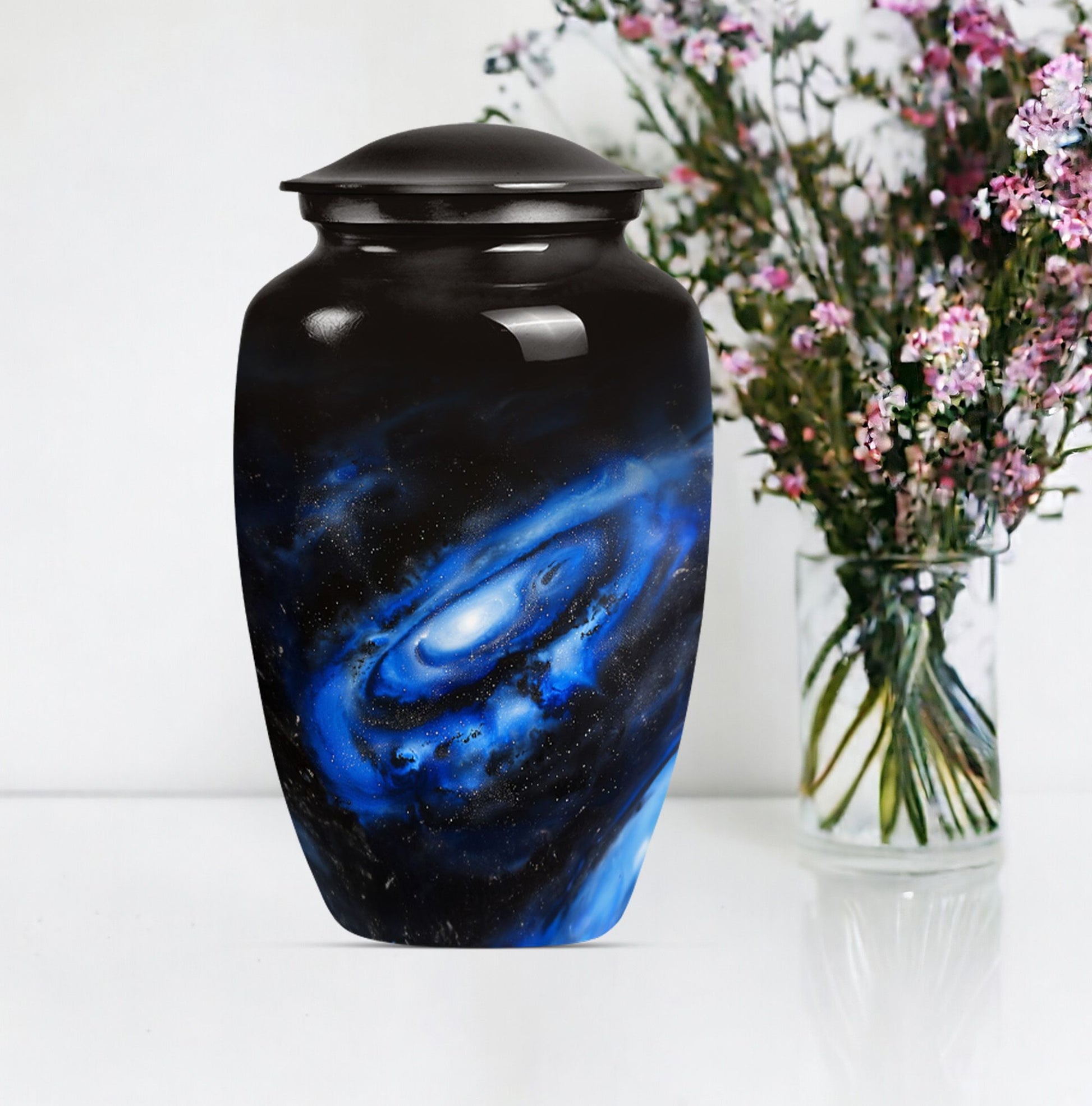 Our captivating Galaxy Urn offers a unique and endearing way to revisit memories of your cherished ones. Sized at a substantial 10 inches, it's perfect choice for a funeral urn for ashes for women or urns for adult males. Crafted from high-quality aluminium, the weight of this sizeable urn is a robust 3.3 pounds, reflecting the substance and grandness of the memories it protects. This cremation urn offers a generous capacity of 200 cubic inches and comes with a velvet pouch for convenient containment of ashes. The theme transcribes to a serene 'Purple Meadow', complementing the classic urn style and providing an atmosphere of tranquil remembrance. We also offer customization options, allowing you to personalize with engraved names, adding a heartfelt touch to this burial urn. This purchase includes more than just a box; it provides comfort and a timeless keepsake. Please note: our large urns are not just memorial ceremony supplies, they're treasured mementos designed to respect and honor your loved ones.