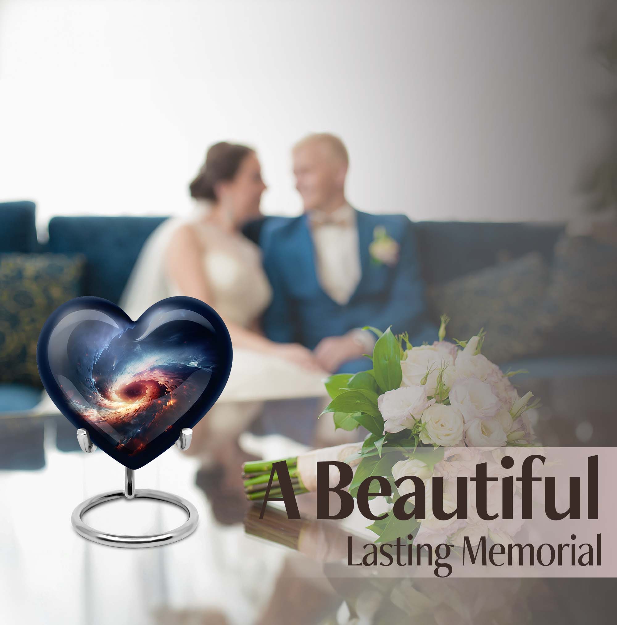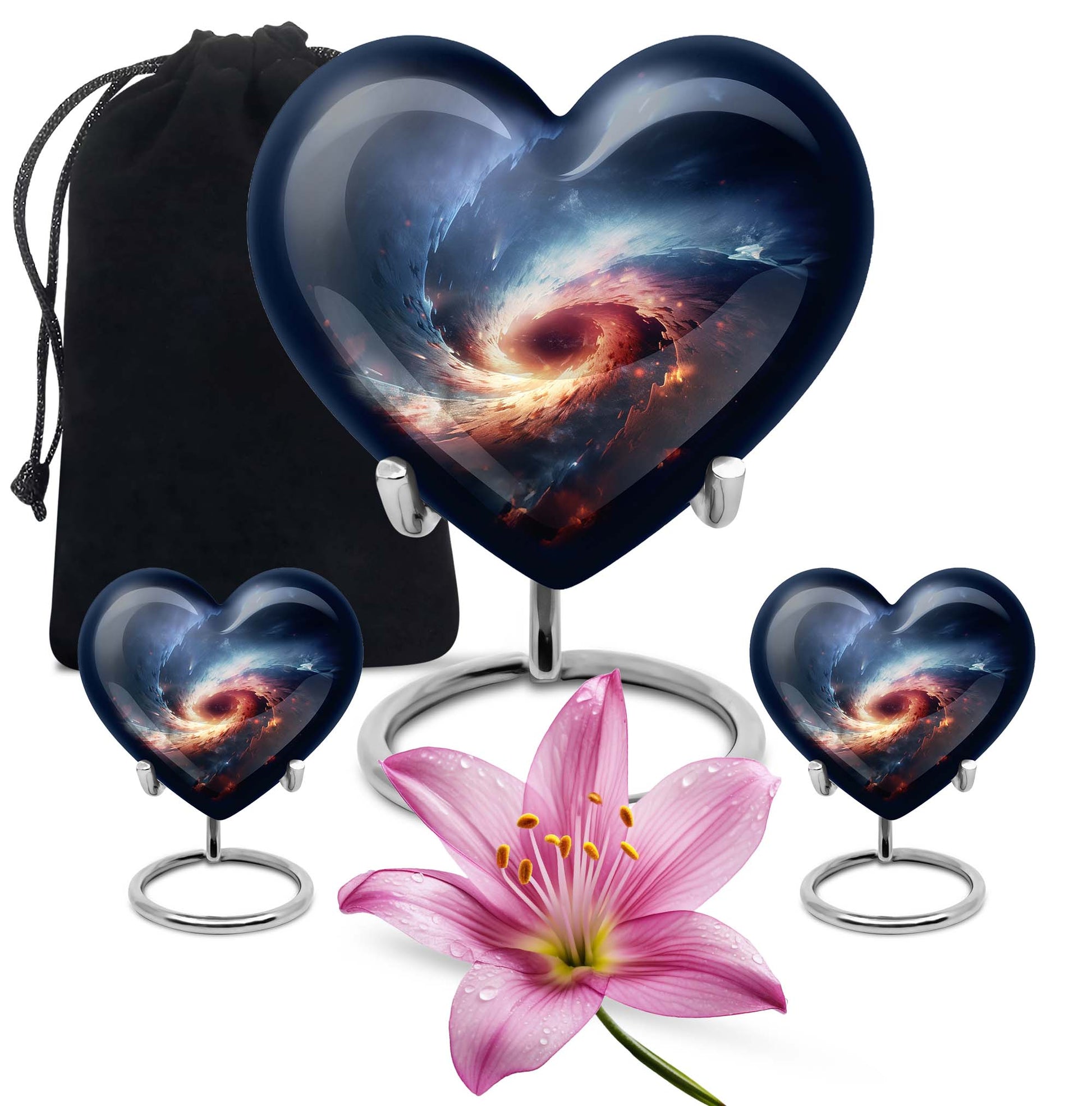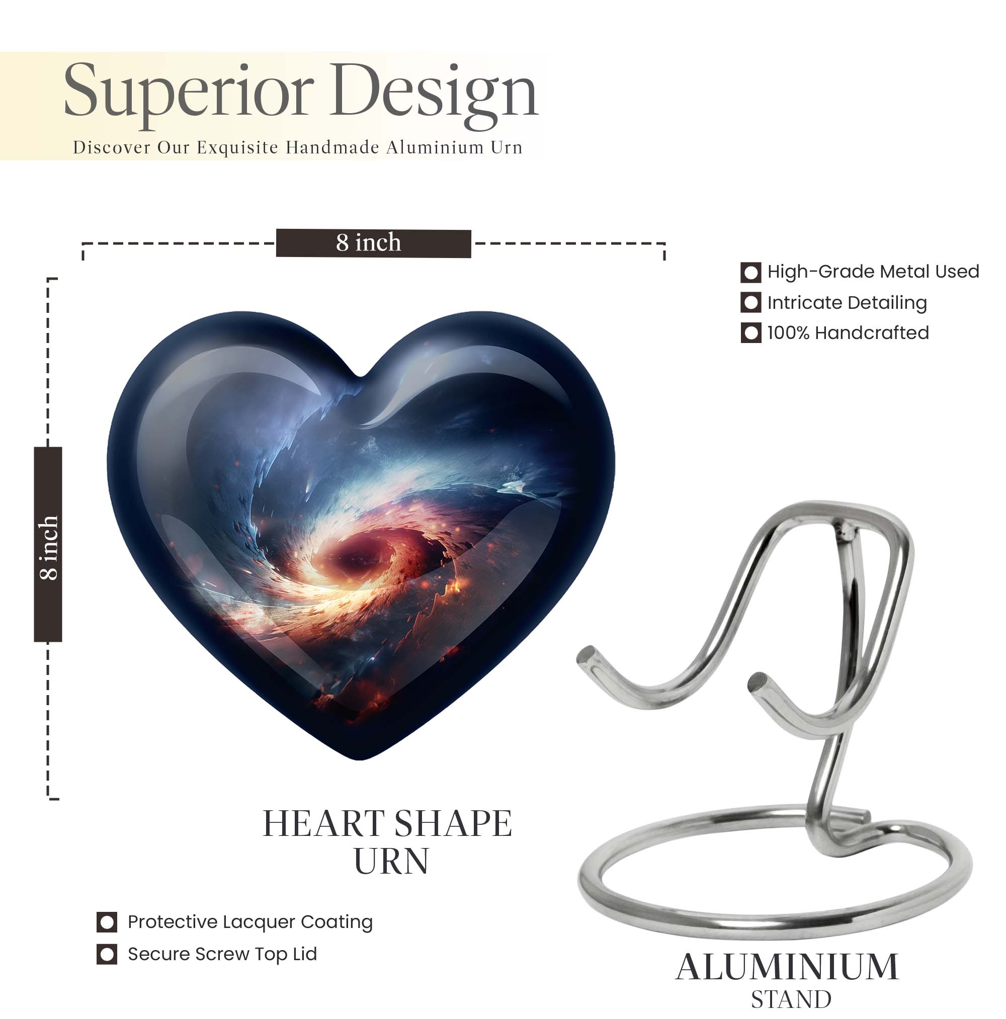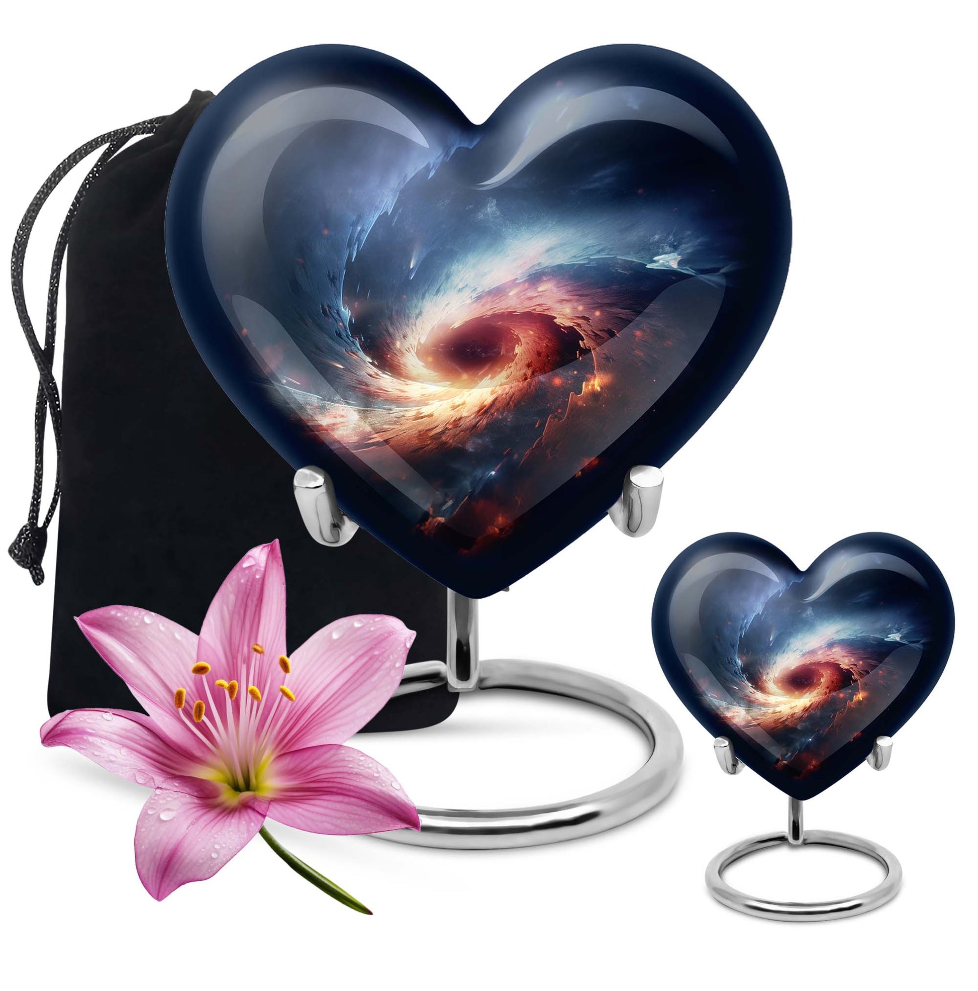 Commemorate your beloved one with our unique 10-Inch Galaxy Urn, a large aluminium cremation urn thoughtfully crafted with a captivating 'Purple Meadow' theme. This urn stands at a notable height of 10 inches, a large urn with a substantial capacity of 200 cubic inches, perfect for most adult males. This funeral ashes urn weighs a sturdy 3.3 pounds, melding durability with significant form. Additionally, for a distinct touch, this urn can be personalized with engraved names, creating an enduring tribute to your loved one. The urn is carefully packaged with a velvet pouch for secure containment of ashes, the soft touch adding an elegant feel to the cremation ceremony. Whether you're searching for memorial urns or cremation urns for men, our heart urn presents a distinctive choice. Note: 'Design' attribute is not included in this description.