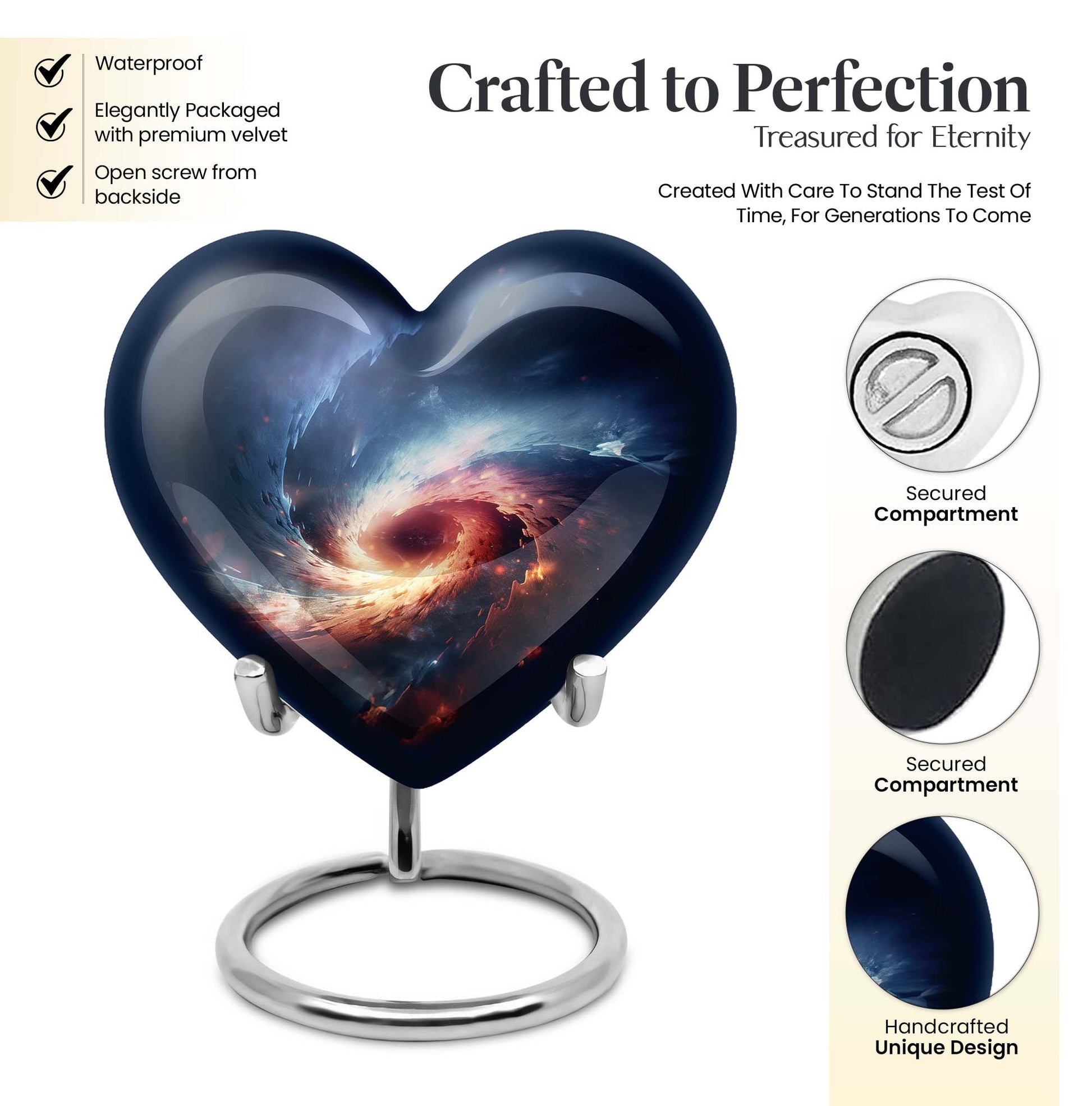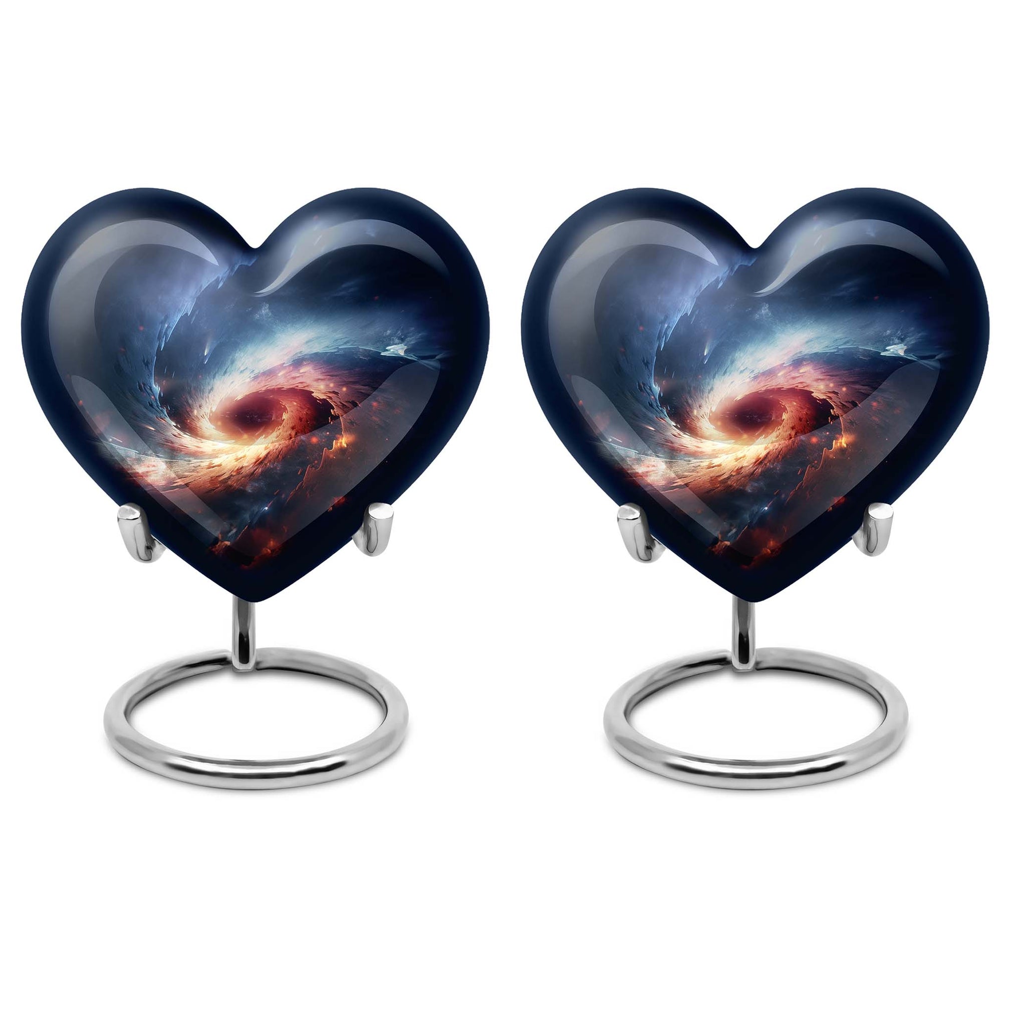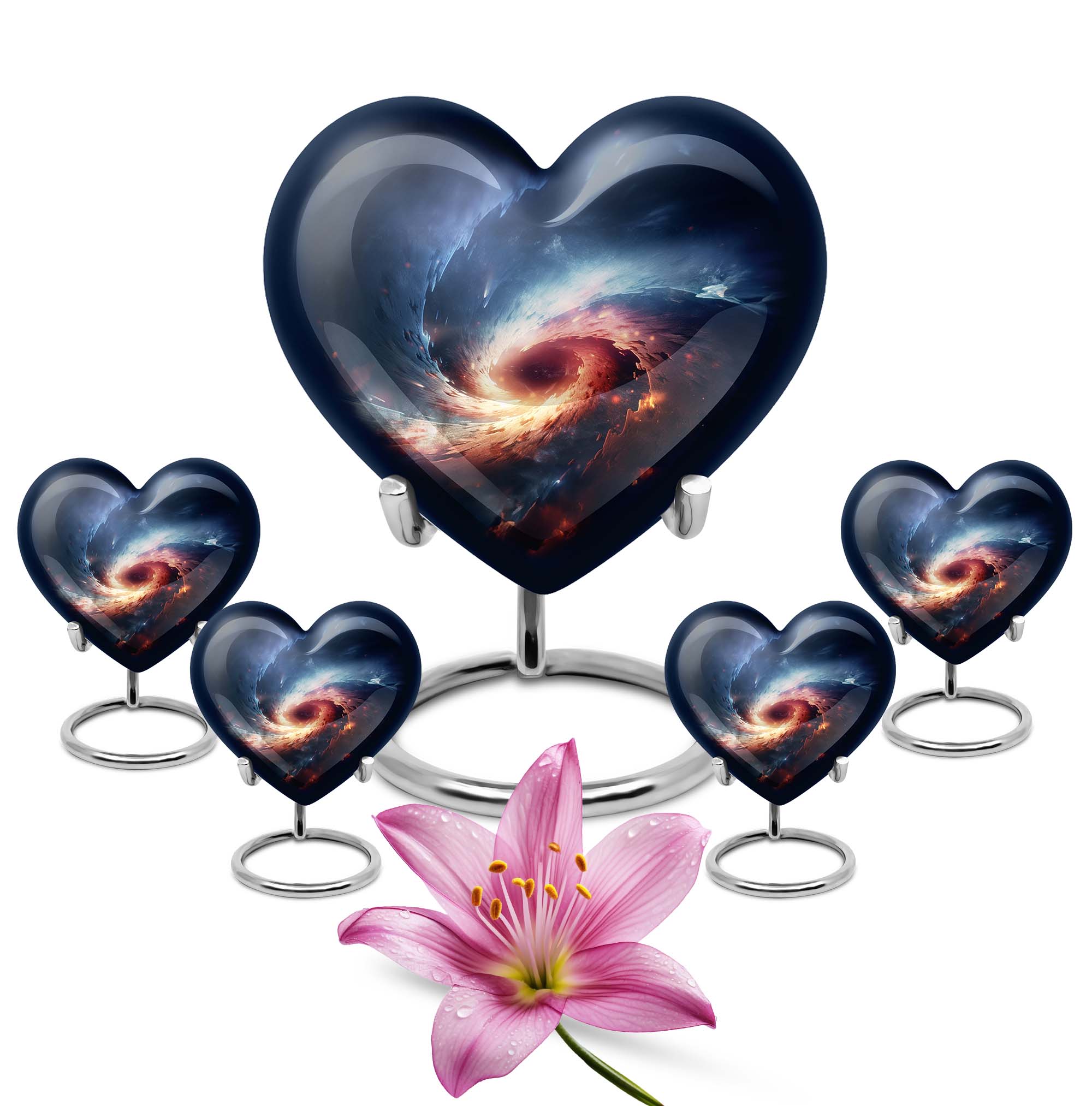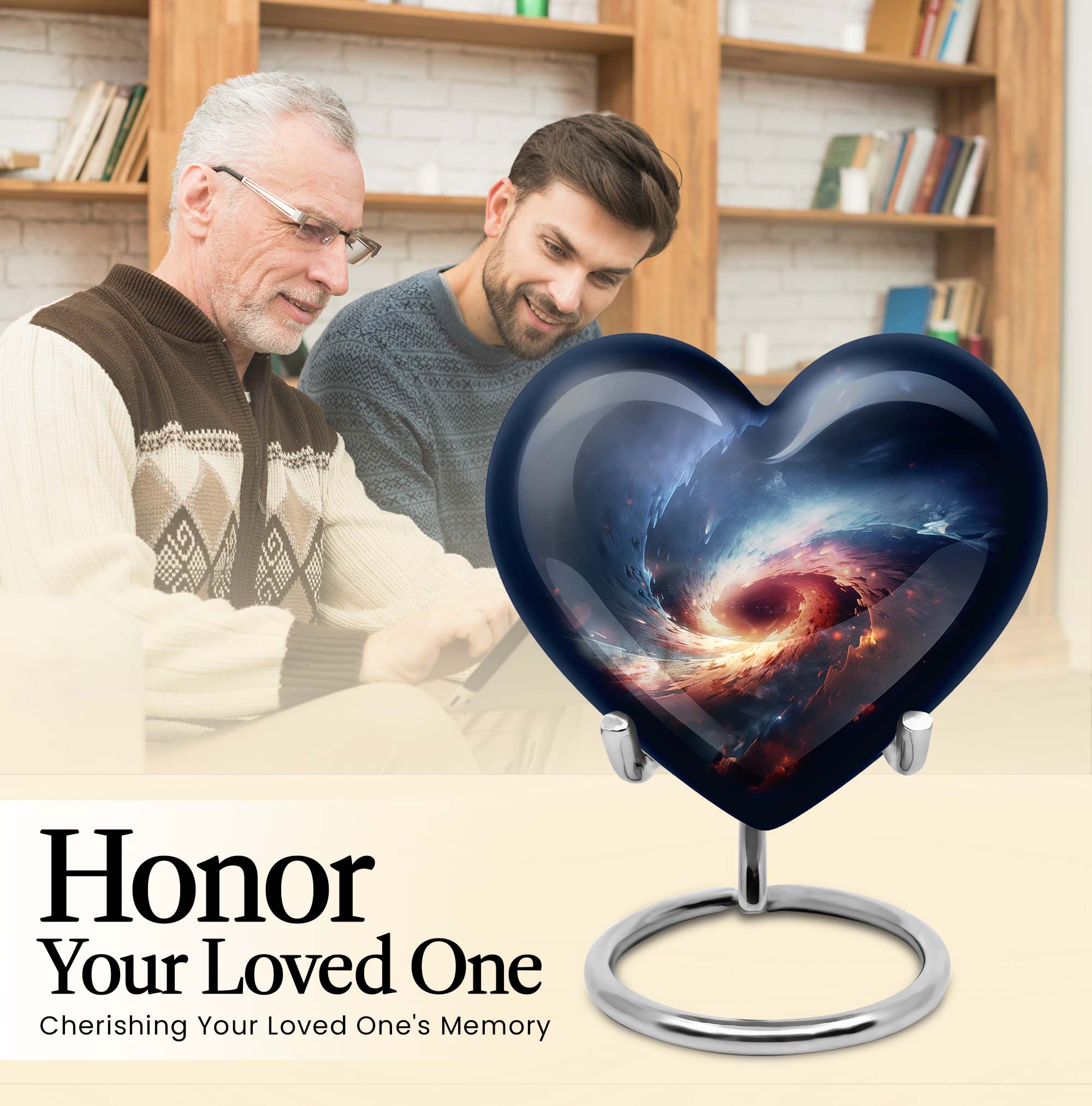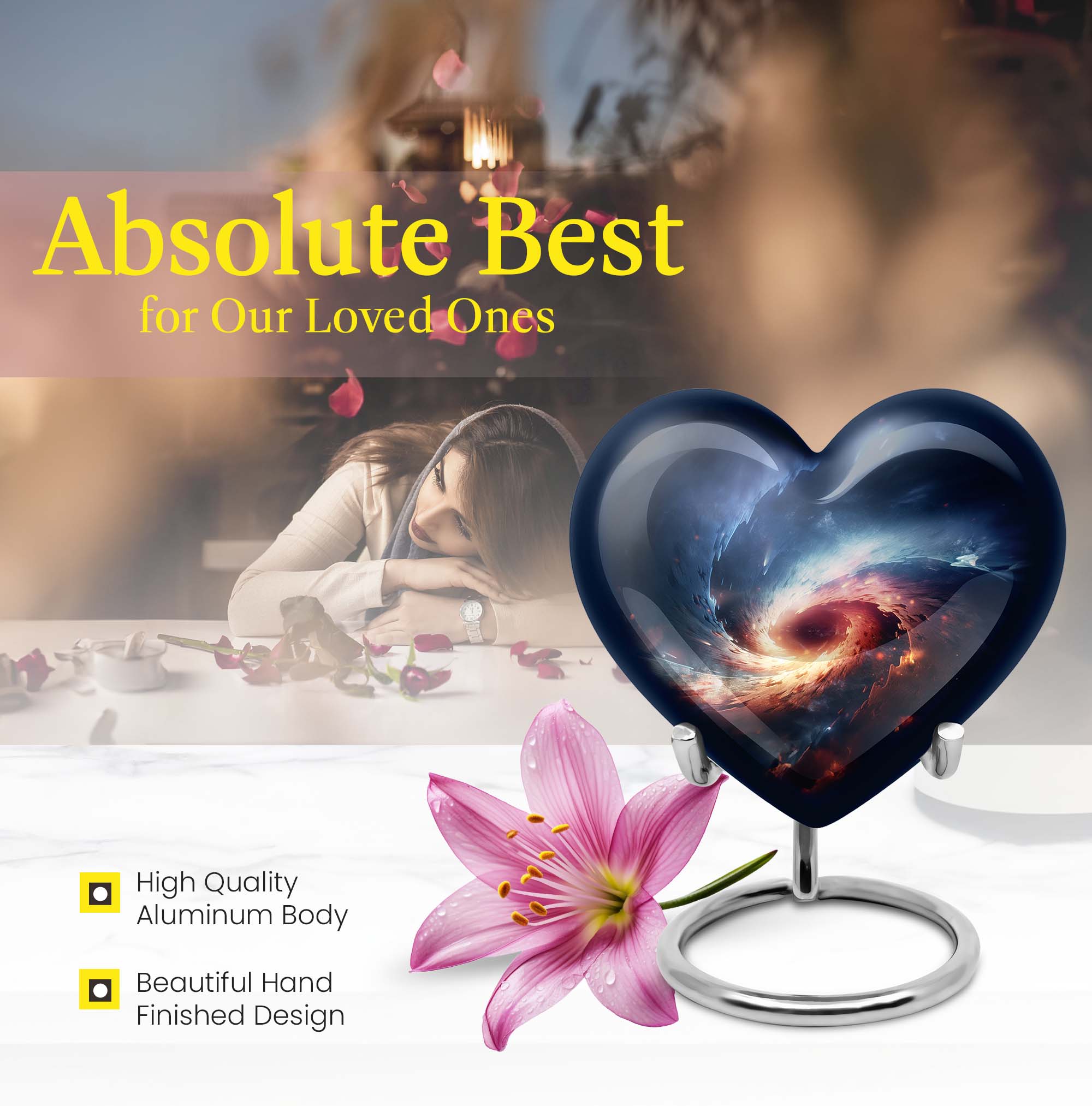 Commemorate your beloved one with our unique 10-Inch Galaxy Urn, a large aluminium cremation urn thoughtfully crafted with a captivating 'Purple Meadow' theme. This urn stands at a notable height of 10 inches, a large urn with a substantial capacity of 200 cubic inches, perfect for most adult males. This funeral ashes urn weighs a sturdy 3.3 pounds, melding durability with significant form. Additionally, for a distinct touch, this urn can be personalized with engraved names, creating an enduring tribute to your loved one. The urn is carefully packaged with a velvet pouch for secure containment of ashes, the soft touch adding an elegant feel to the cremation ceremony. Whether you're searching for memorial urns or cremation urns for men, our heart urn presents a distinctive choice. Note: 'Design' attribute is not included in this description.