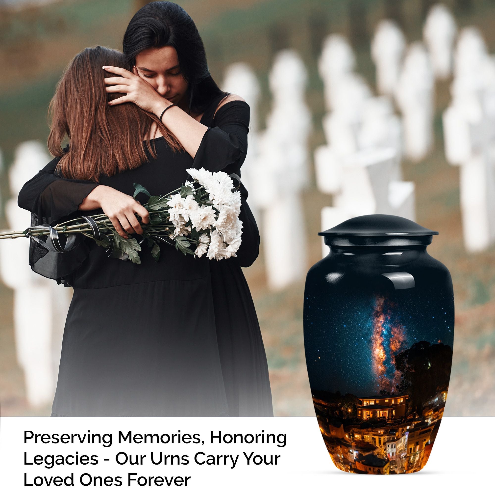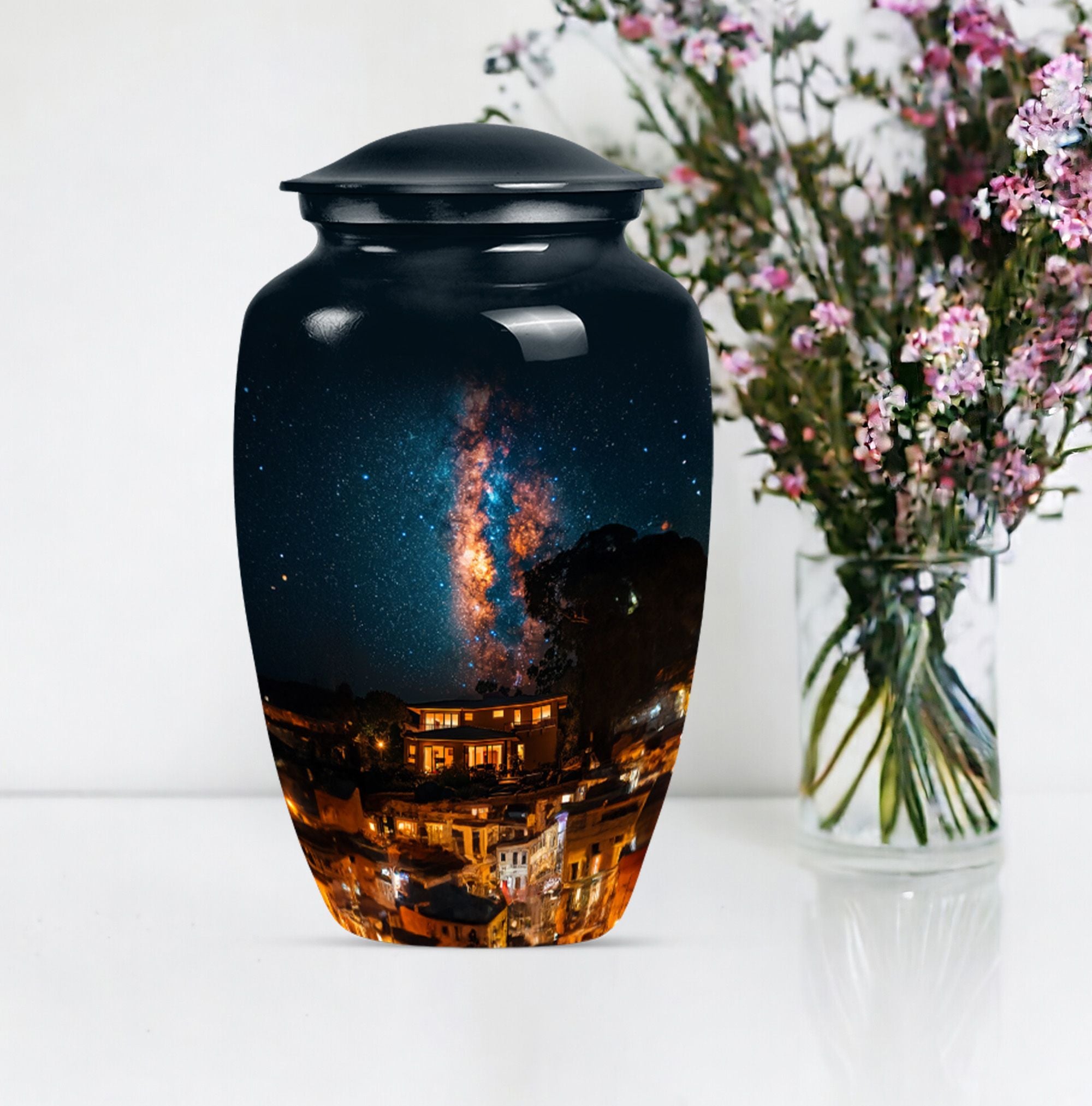 Discover the Galaxy Urn, a testament to eternal love and peace. This cremation urn for human ashes transcends conventional designs, offering an abstract theme that mirrors the infinite beauty of our cosmos. Handcrafted from resilient aluminium, this large urn conforms to a classic style that stands 10 inches tall and weighs 3.3 pounds, generously accommodating 200 cubic inches of ashes. Customize it by engraving names to add a more personal touch. Its sturdy frame ensures longevity while the included velvet pouch provides an elegant containment for your loved one's remains. Perfect for adults and seniors who embrace radiant symbolism, this metal cremation urn brilliantly captures the essence of memory, love, and respect. Keywords such as 'funeral urns' for women or men, 'cremation urns', and 'galaxy urn' perfectly align with the qualities our product embodies. Let the Galaxy Urn be your trusted companion in commemorating an irreplaceable life beautifully lived.