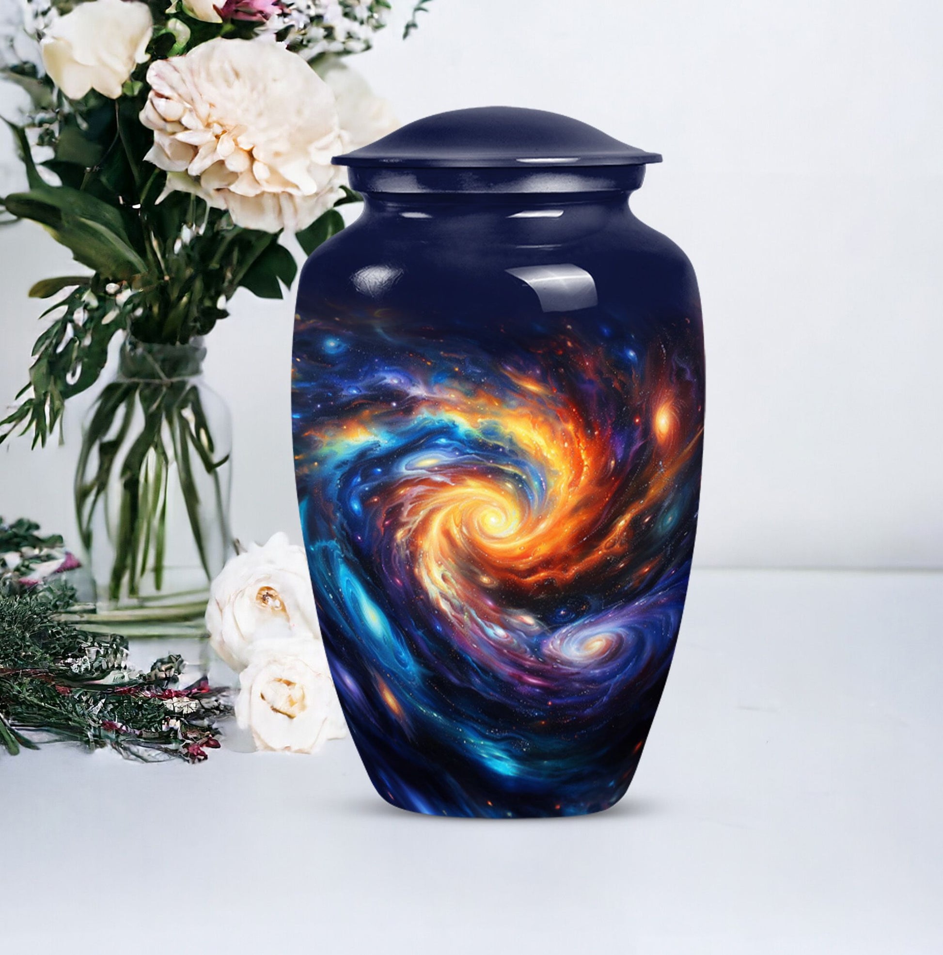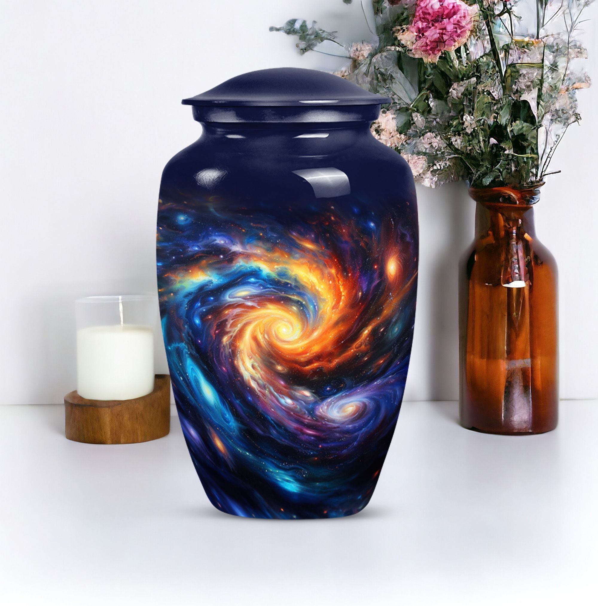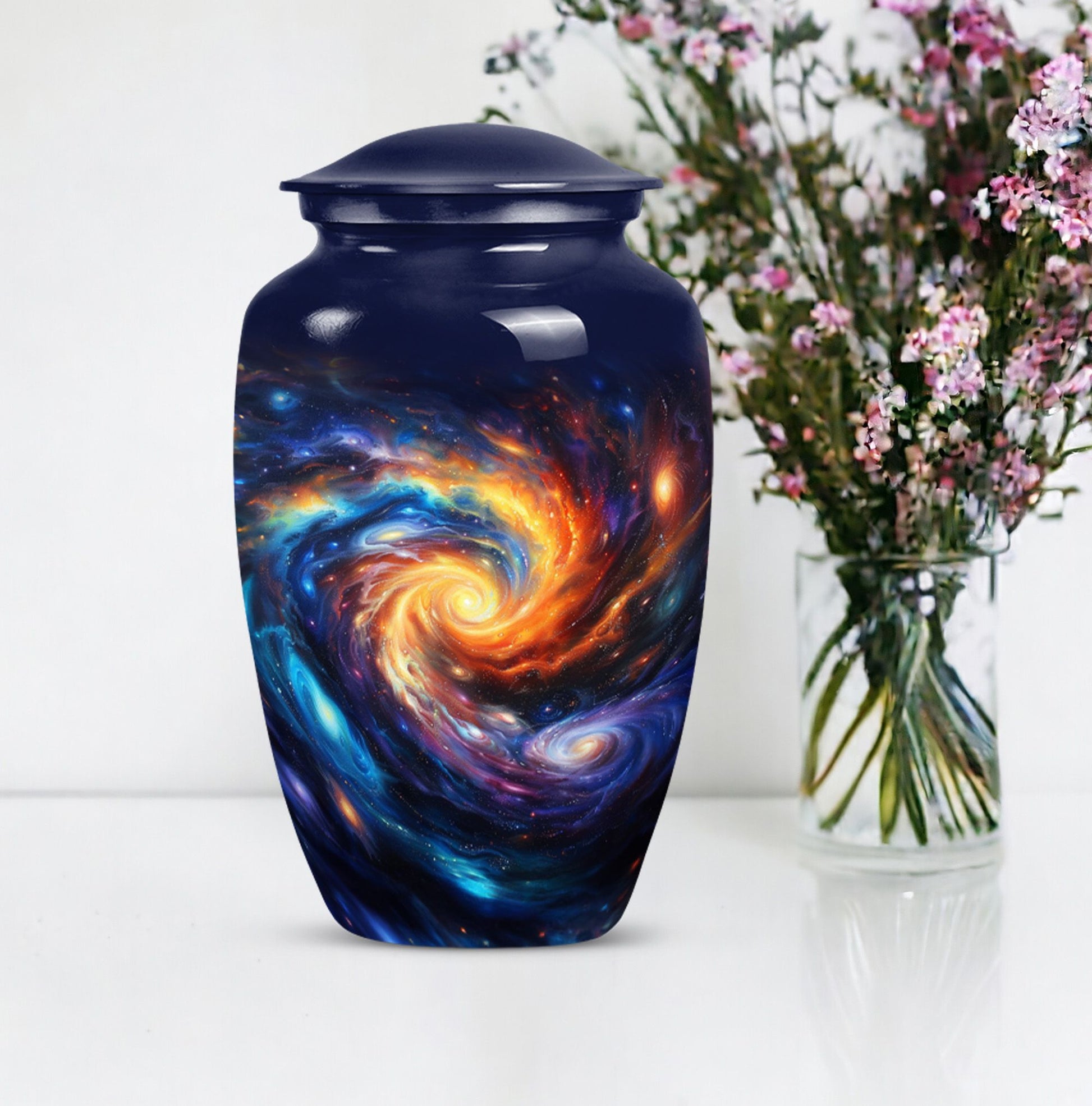 Pay homage to your loved ones with the Purple Meadow Large Urns, gracefully handcrafted to behold the ashes of an adult man or a female. These innovative 10-inch memorial urns are beautifully constructed from sturdy aluminium that gives them an enduring quality, a fitting tribute for cherished memories. Presenting funeral urns that weigh 3.3 pounds and are proficient to hold up to 200 cubic inches of ashes, encapsulating an image of a serene and peaceful purple meadow. This unique urn, apart from its extraordinary theme offers an opportunity for customization, allowing you to personalize it with engraved names, making it a remarkable keepsake. Each artful large urn comes with a velvet pouch, a gentle guard for the containment of ashes. The primary keyword is 'Galaxy Urn' and it resonates with 'urns for cremation ashes'. Discover a new way to remember your loved ones with these innovative modern urns for human ashes, crafted with love, for love.