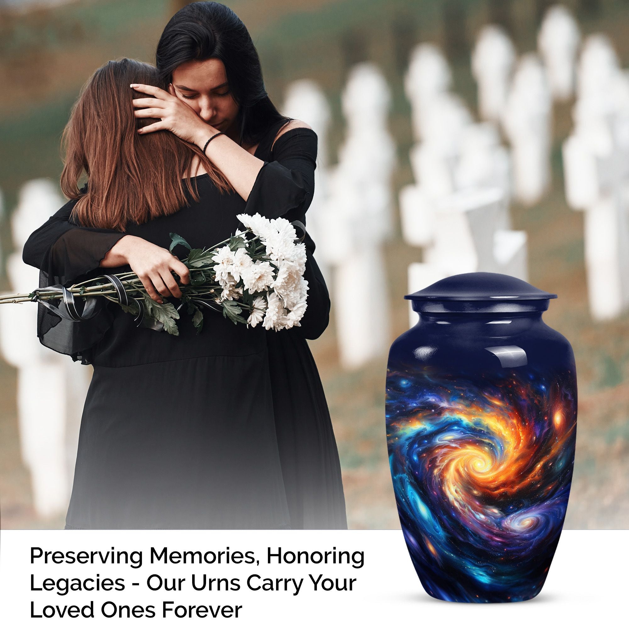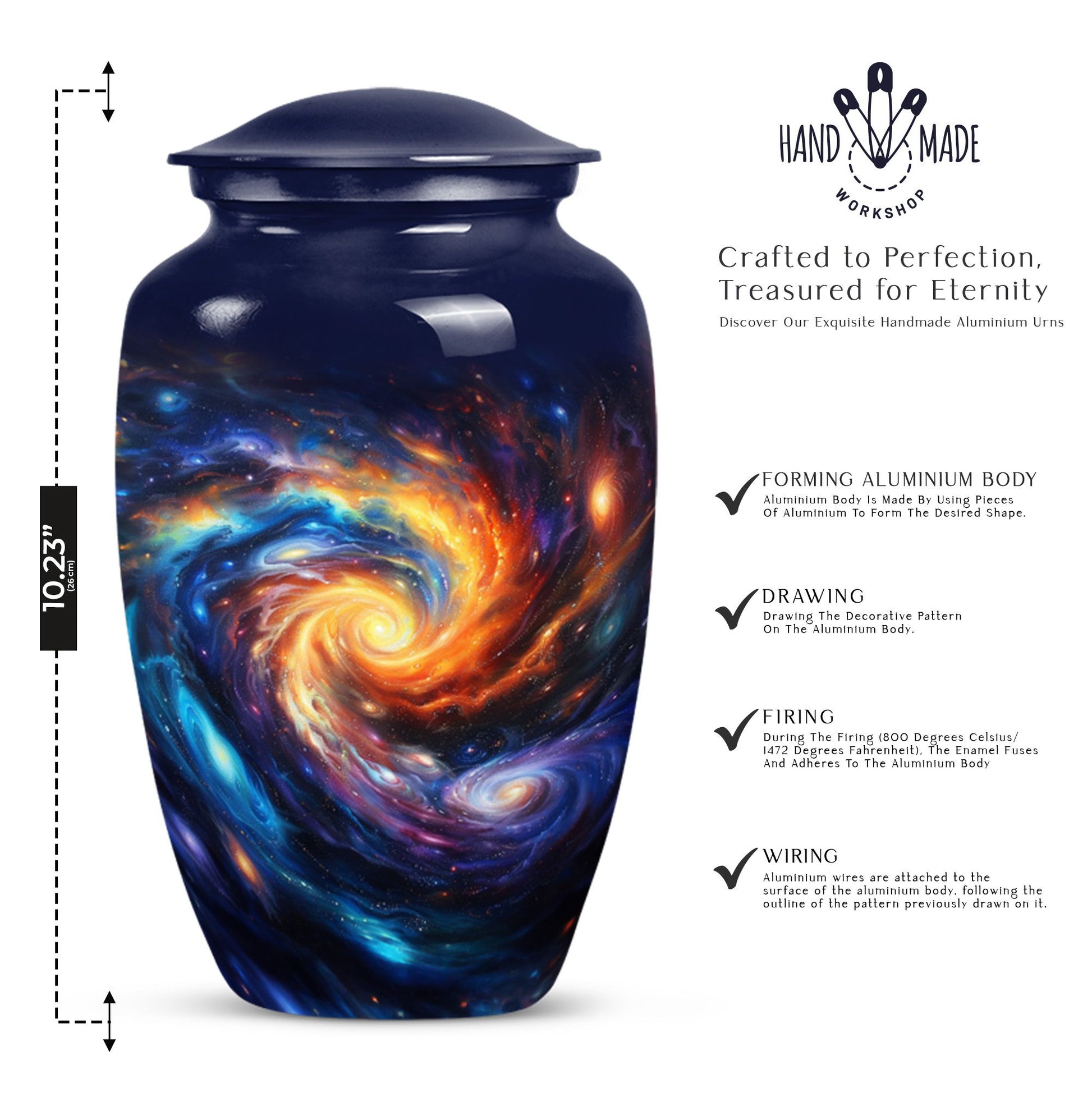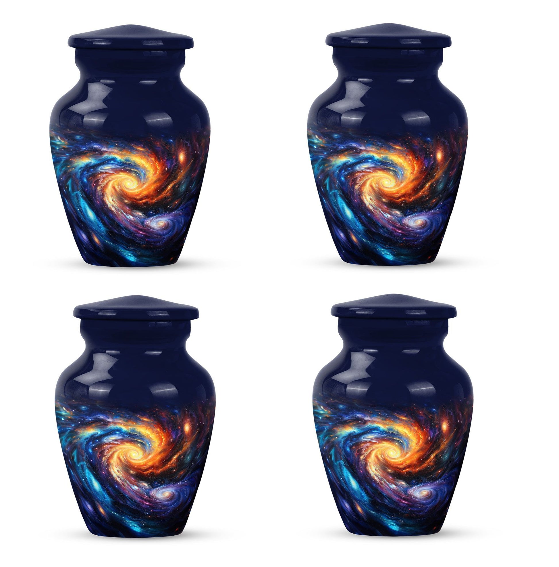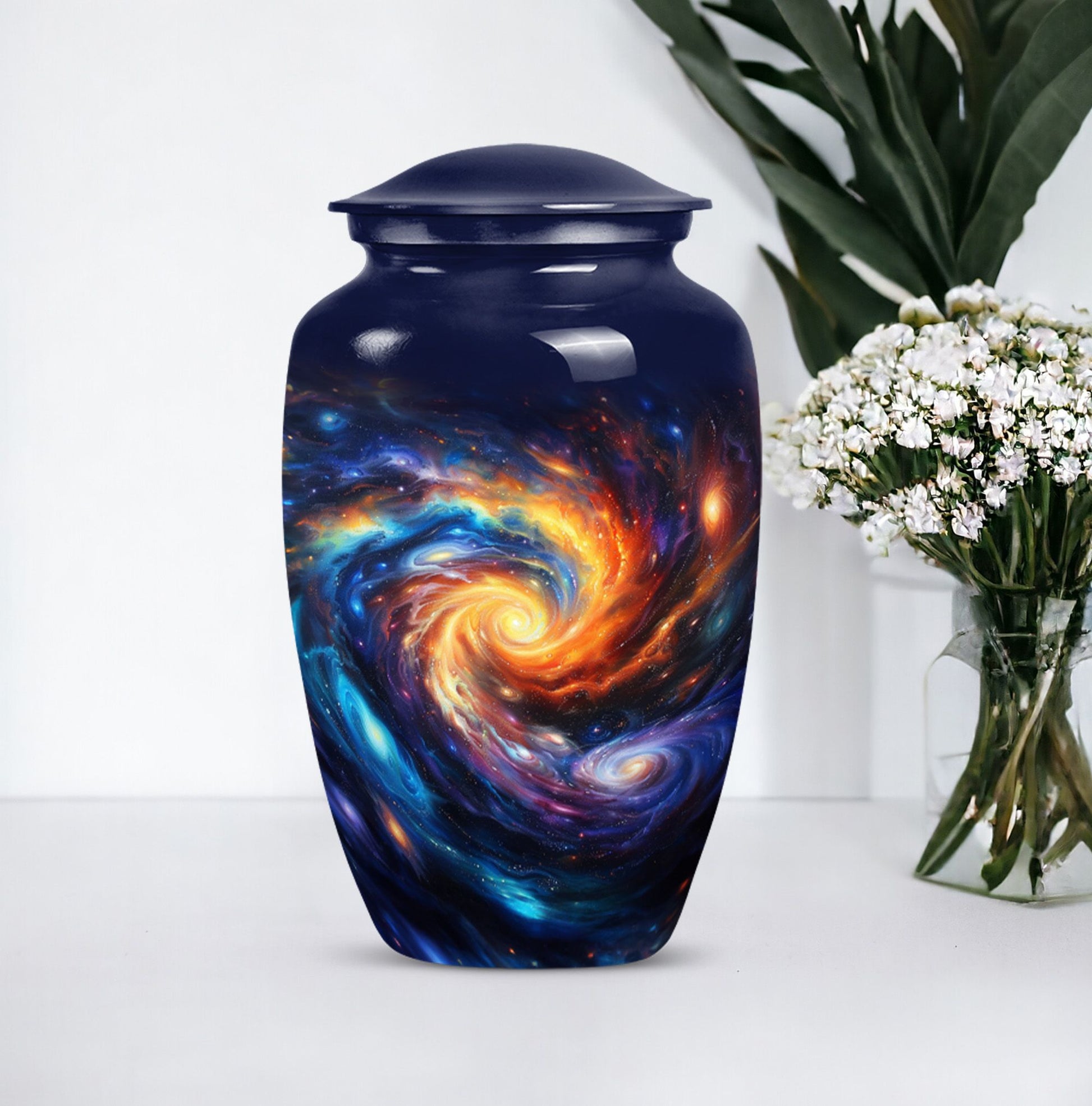 Pay homage to your loved ones with the Purple Meadow Large Urns, gracefully handcrafted to behold the ashes of an adult man or a female. These innovative 10-inch memorial urns are beautifully constructed from sturdy aluminium that gives them an enduring quality, a fitting tribute for cherished memories. Presenting funeral urns that weigh 3.3 pounds and are proficient to hold up to 200 cubic inches of ashes, encapsulating an image of a serene and peaceful purple meadow. This unique urn, apart from its extraordinary theme offers an opportunity for customization, allowing you to personalize it with engraved names, making it a remarkable keepsake. Each artful large urn comes with a velvet pouch, a gentle guard for the containment of ashes. The primary keyword is 'Galaxy Urn' and it resonates with 'urns for cremation ashes'. Discover a new way to remember your loved ones with these innovative modern urns for human ashes, crafted with love, for love.