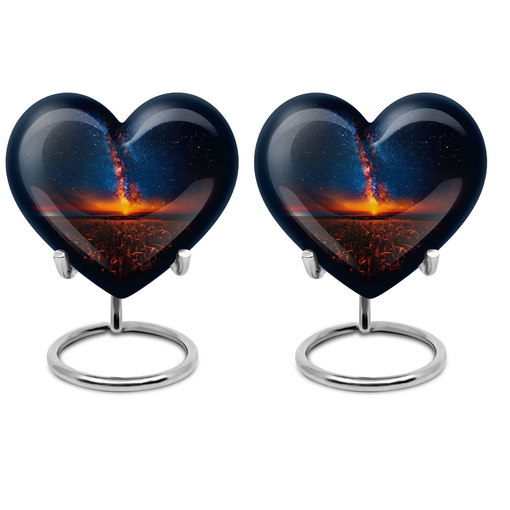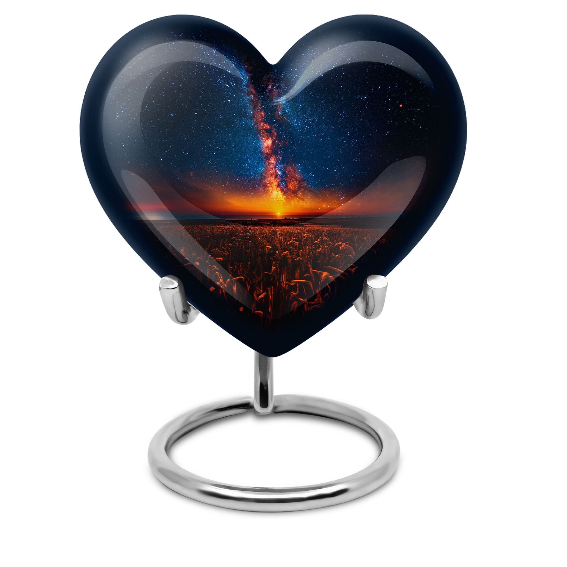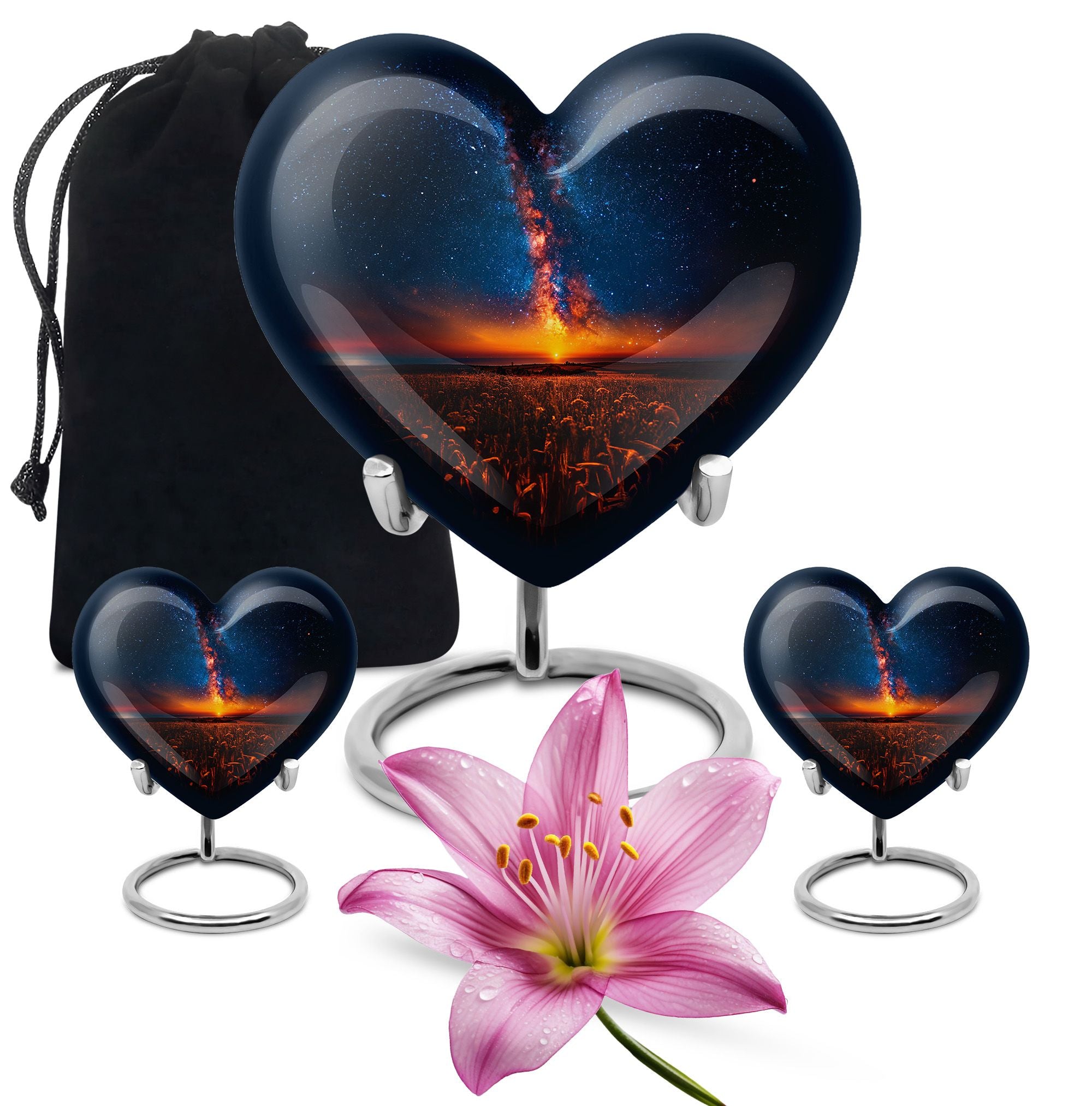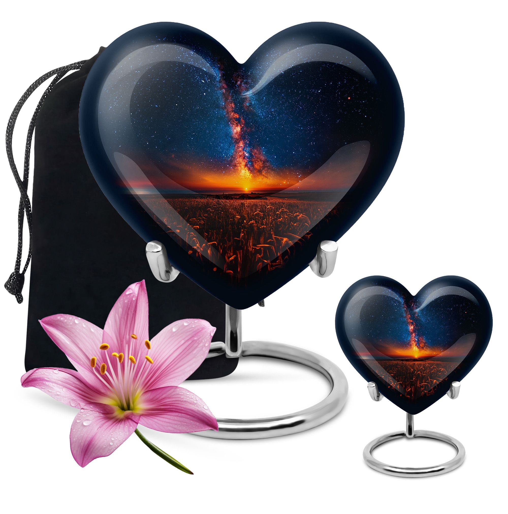 The Galaxy Urn, an exquisitely crafted memorial urn, offers a unique way to cherish your loved ones forever. Exemplifying abstract art with a heart shape, this stunning piece is perfect for those in search of cremation medium urns for human ashes. It stands at a size of 10 inches, substantial enough to hold up to 200 cubic inches of ashes. Each urn weighs 3.3 pounds and is made of sturdy, high-quality aluminium, ensuring that they can withstand time as a lasting tribute. Alongside its striking design, each urn offers customization, providing an option to engrave your beloved ones' names. Included with each urn is a delicate velvet pouch, providing a soft and secure containment for the ashes. This large urn echoes love in its design, capturing a sense of warmth and personal connection. Ideal for burials, this urn offers a heartfelt way to remember and honour your loved ones and creates a legacy that stands the test of time.