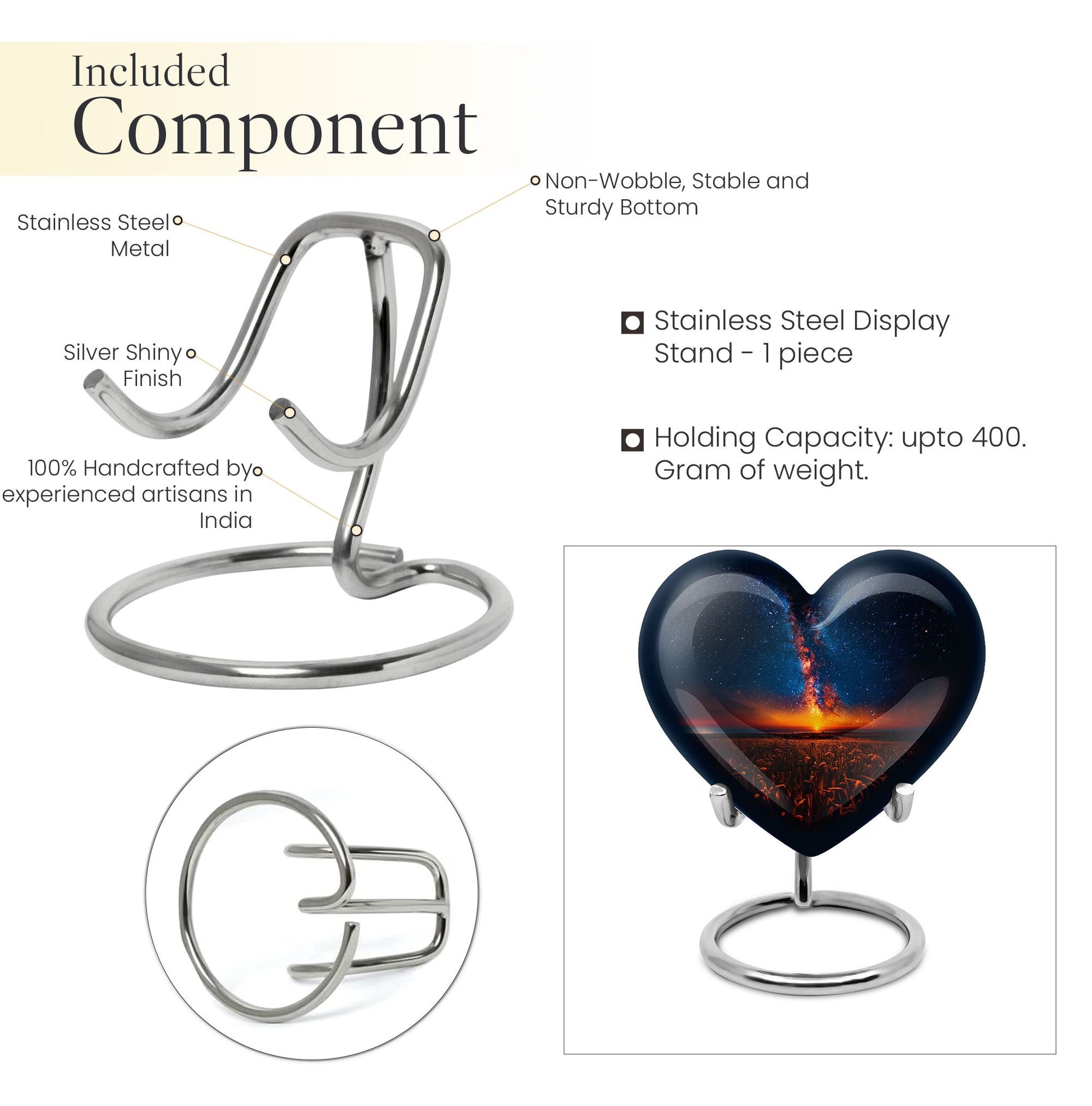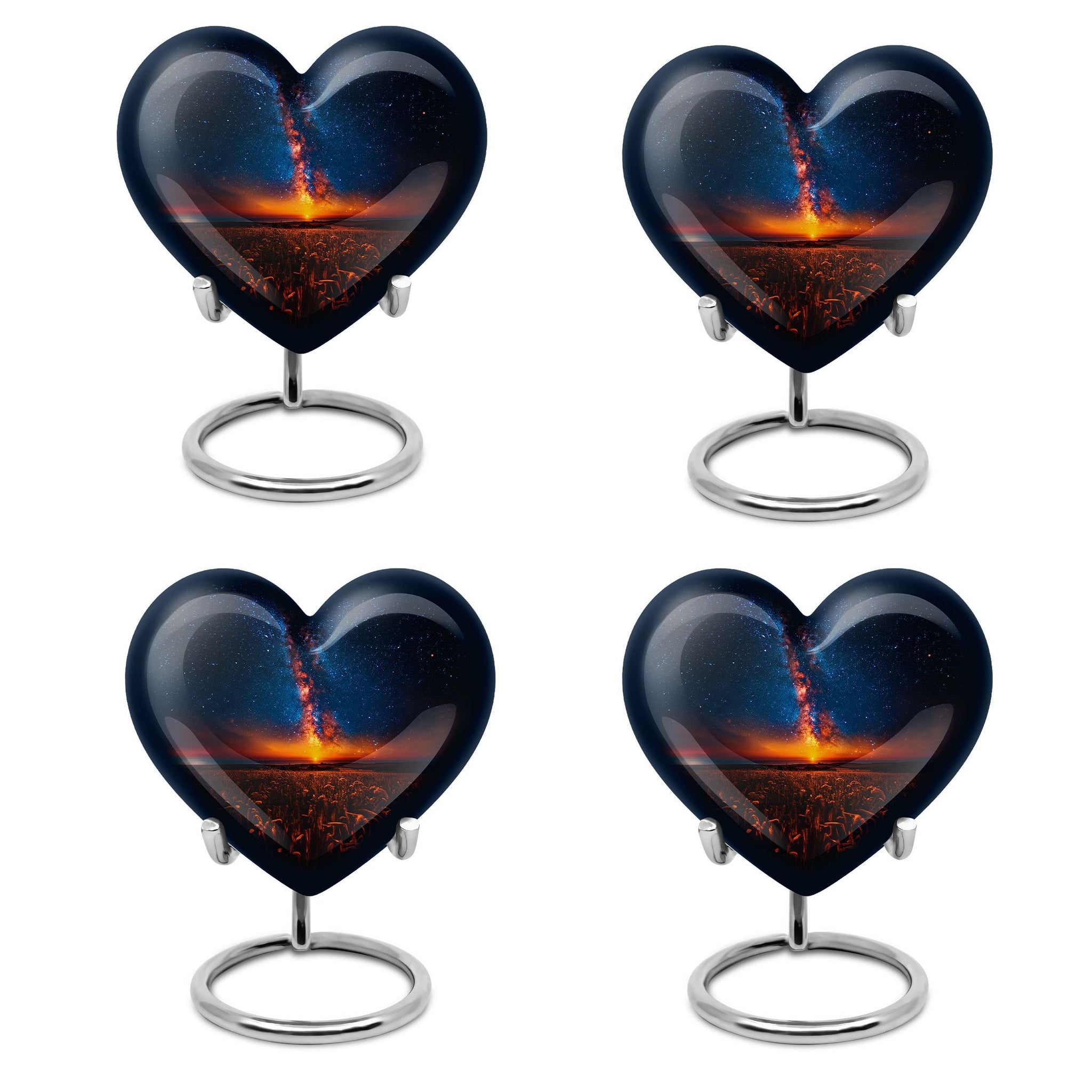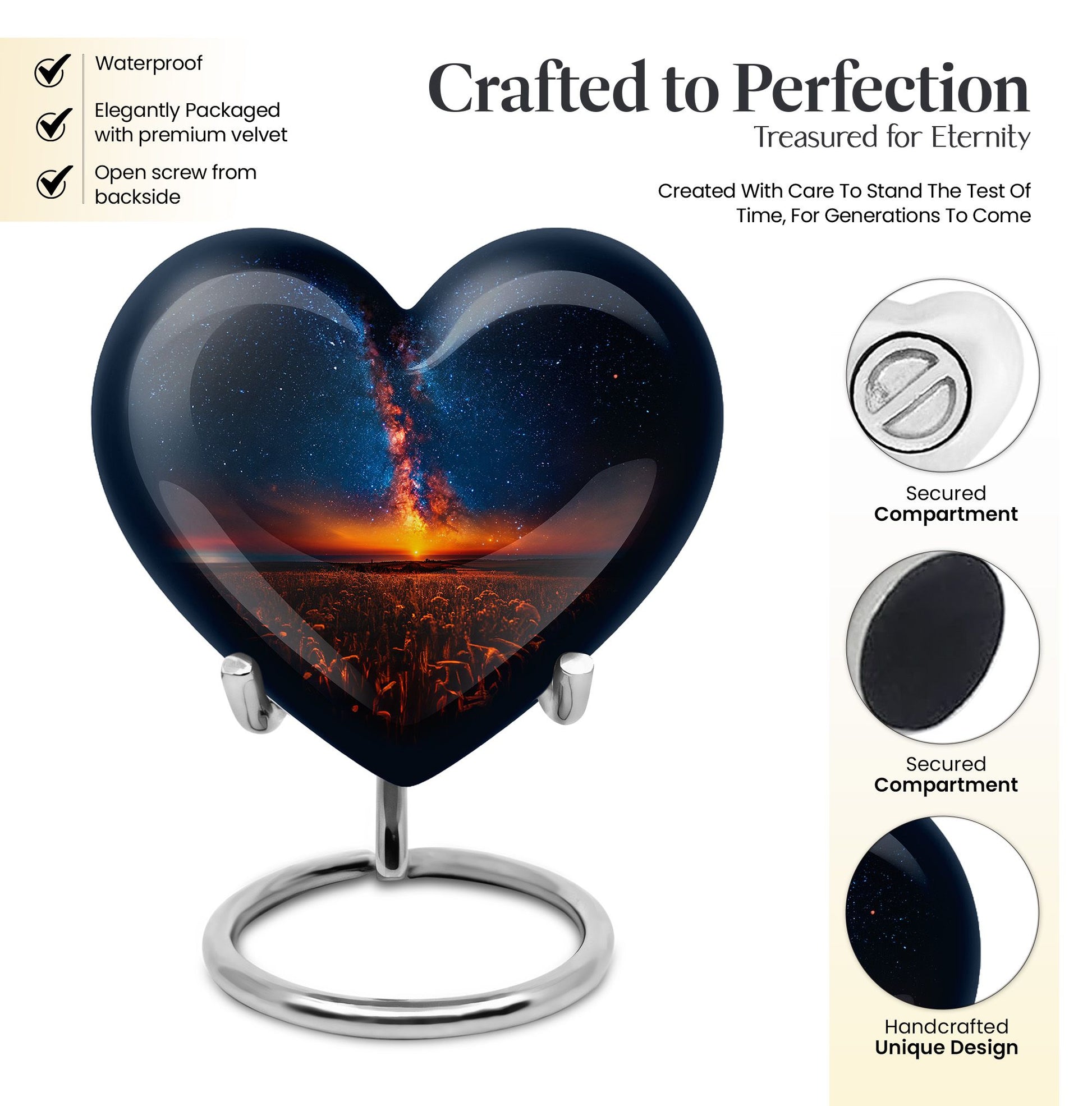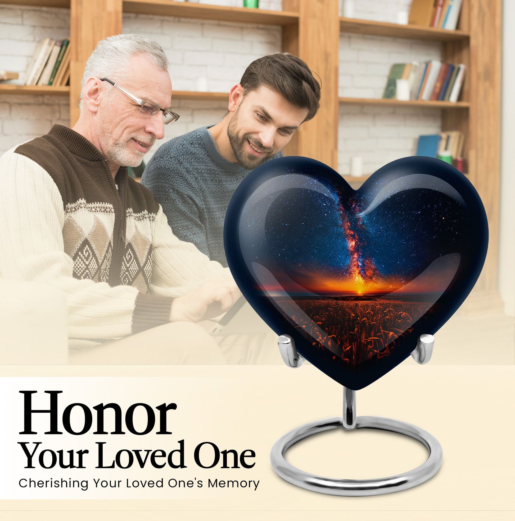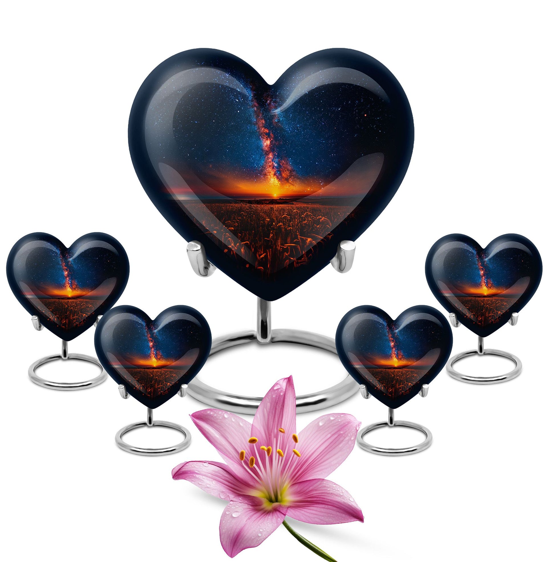 The Galaxy Urn, an exquisitely crafted memorial urn, offers a unique way to cherish your loved ones forever. Exemplifying abstract art with a heart shape, this stunning piece is perfect for those in search of cremation medium urns for human ashes. It stands at a size of 10 inches, substantial enough to hold up to 200 cubic inches of ashes. Each urn weighs 3.3 pounds and is made of sturdy, high-quality aluminium, ensuring that they can withstand time as a lasting tribute. Alongside its striking design, each urn offers customization, providing an option to engrave your beloved ones' names. Included with each urn is a delicate velvet pouch, providing a soft and secure containment for the ashes. This large urn echoes love in its design, capturing a sense of warmth and personal connection. Ideal for burials, this urn offers a heartfelt way to remember and honour your loved ones and creates a legacy that stands the test of time.