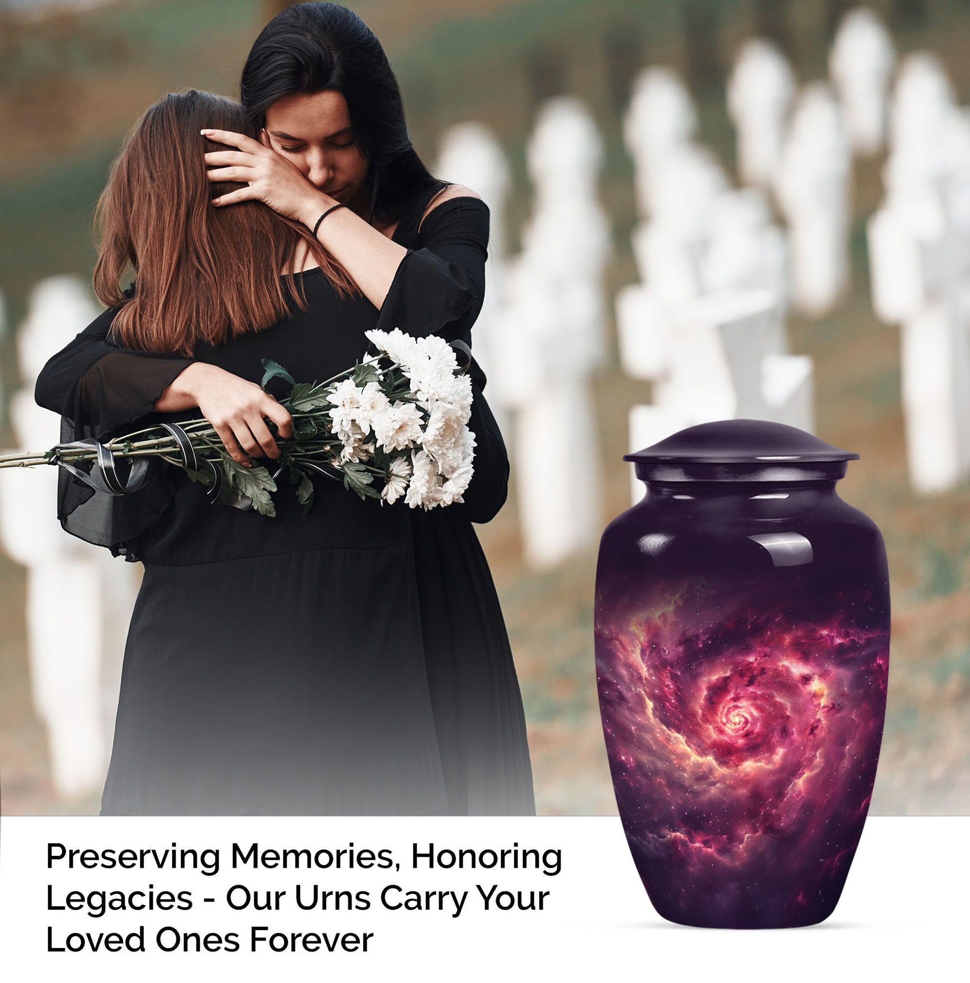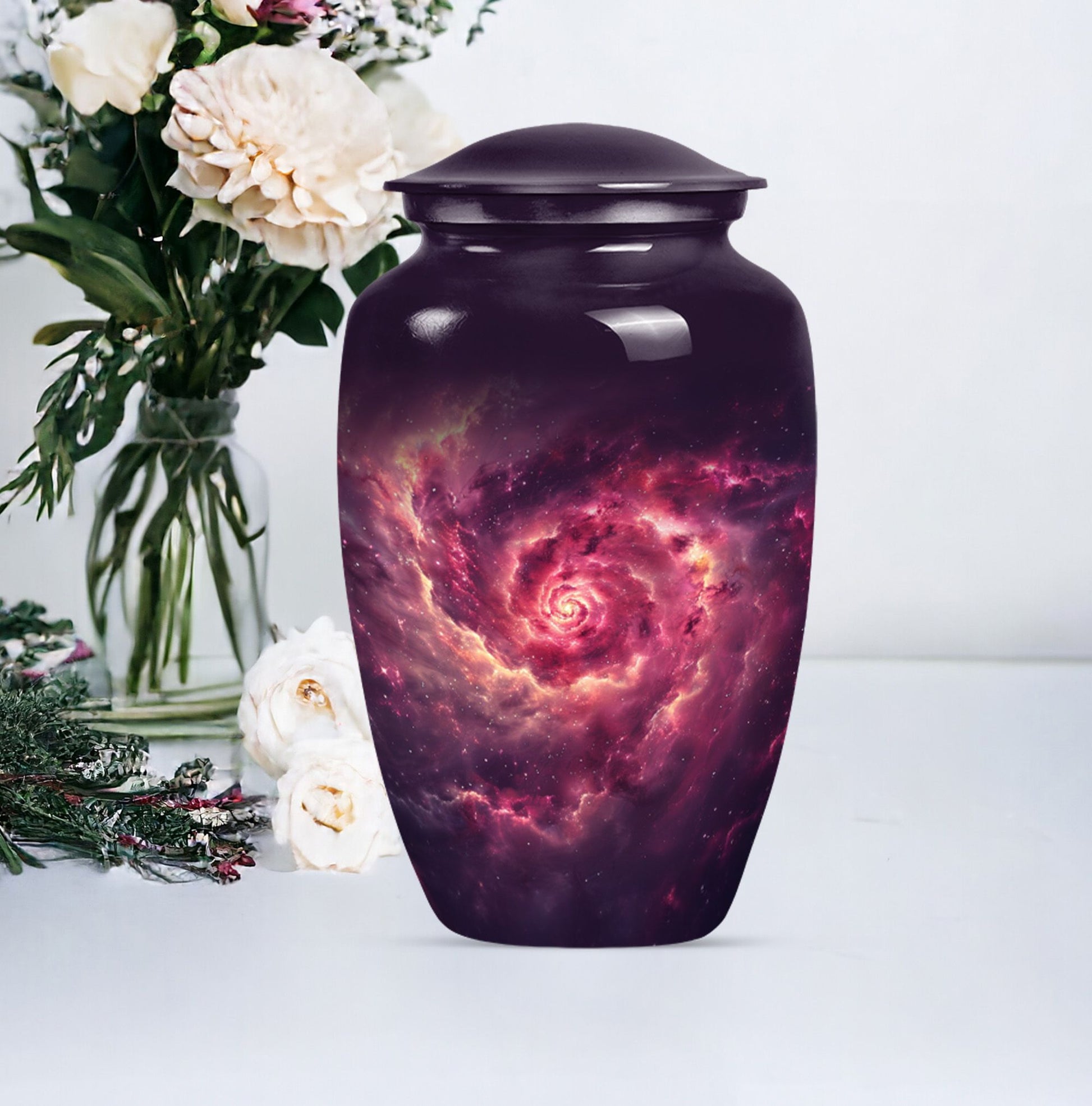 Immerse in solace and remembrance with the elegant and meaningful Galaxy Urn. This large urn, standing at a stately 10-inch height, is painstakingly sculpted, offering a potent symbol of enduring homage. With a capacity of 200 cubic inches, it can respectfully hold the ashes of an adult, unequalled in its grandeur. We offer a distinct characteristic with the urn's abstract theme - an expressive interpretation of the circle of life. The urn is fabricated from robust aluminium, ensuring its integrity over time, symbolizing an eternal memory. Each unit includes an exquisite velvet pouch for tasteful containment of ashes. Justifying its weight of 3.3 pounds, the dimension manifests its dignified build and the weighty sentiment it signifies. For a personalized touch reflecting your endearing memories, we offer the option to engrave your loved one's name unto the urn. Cultivate peace and remembrance with the Galaxy Urn and celebrate the precious life journey of your loved ones. Our inventory is geared towards men and women, catering both to their aesthetic inclinations. This urn serves as a definitive choice for burial cremation for adults' ashes. Keywords: Galaxy Urn, memorial urns, women's cremation urns, Cremation urns for men, cremation urn for human ash, urns for human ashes adult.