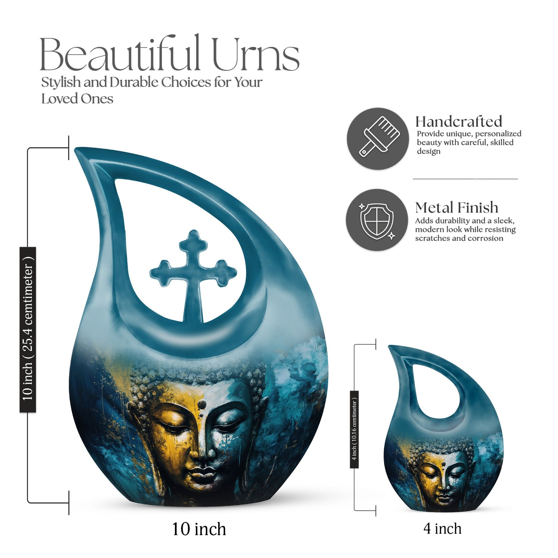 Crafted from durable aluminium, the urn showcases calming Buddha artwork symbolizing enlightenment, tranquility, and eternal peace. The polished finish enhances its sacred presence, making it a meaningful choice for those seeking adult cremation urns, cremation urns, or a versatile combination of large and small options. The included keepsake pieces—such as a small cremation urn, mini cremation urns for human ashes, or a small urn for cremation human ashes—allow families to share ashes or keep a small portion close. The secure screw-top lids ensure safe preservation of ashes in both the large and keepsake sizes.