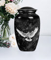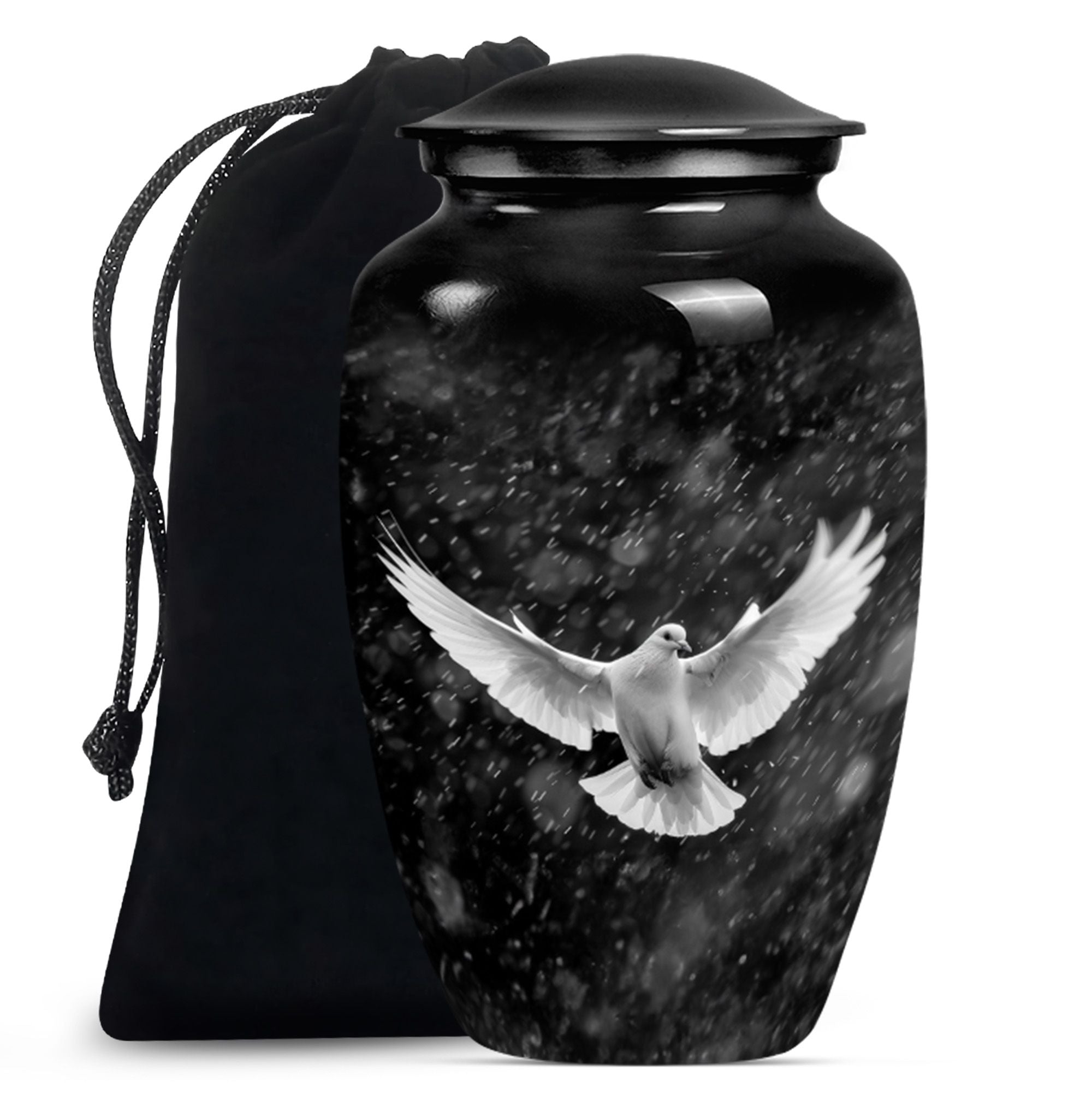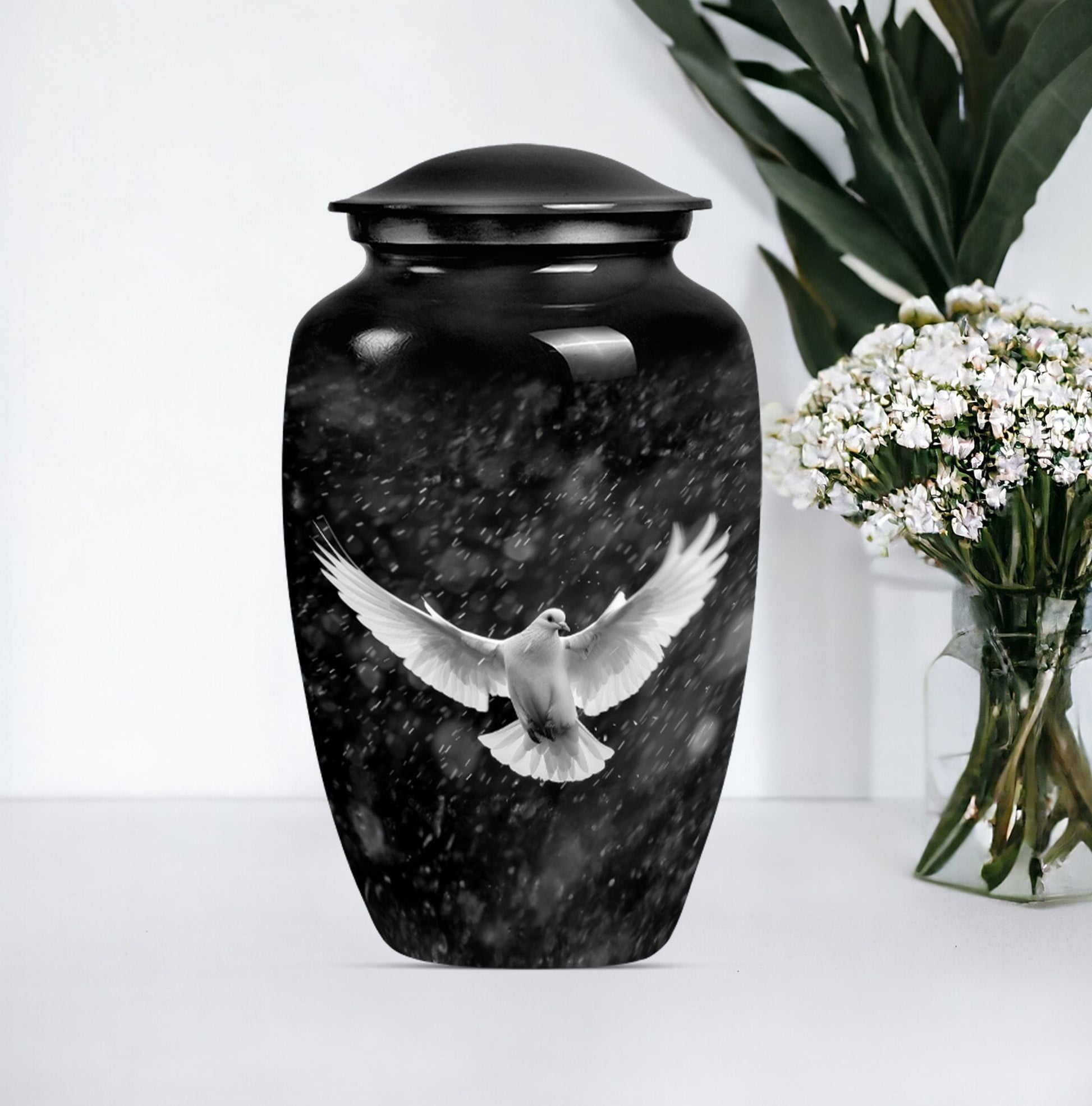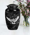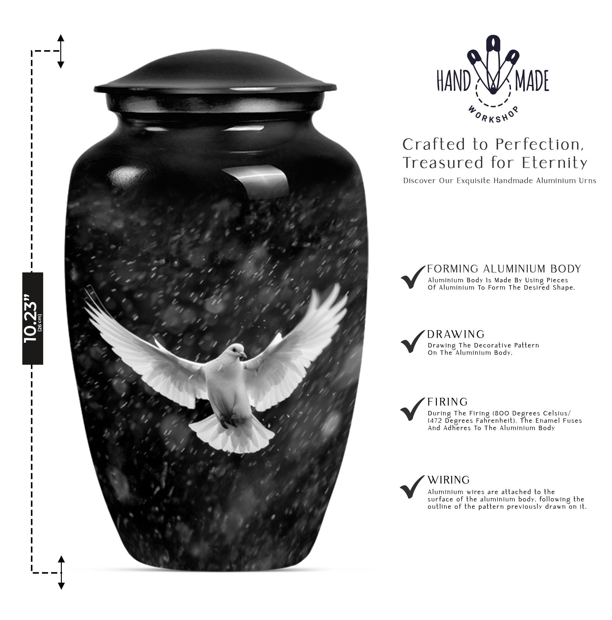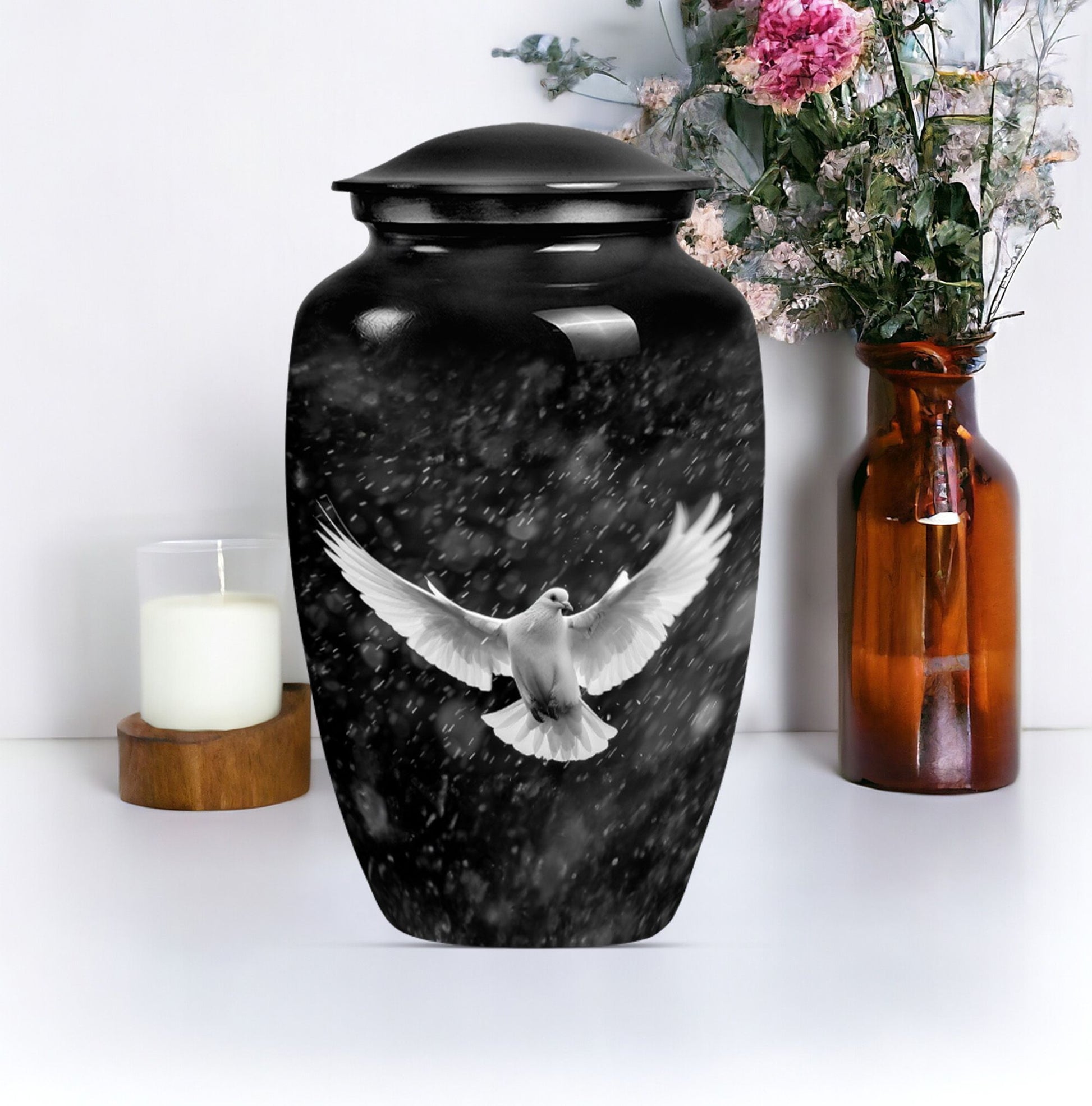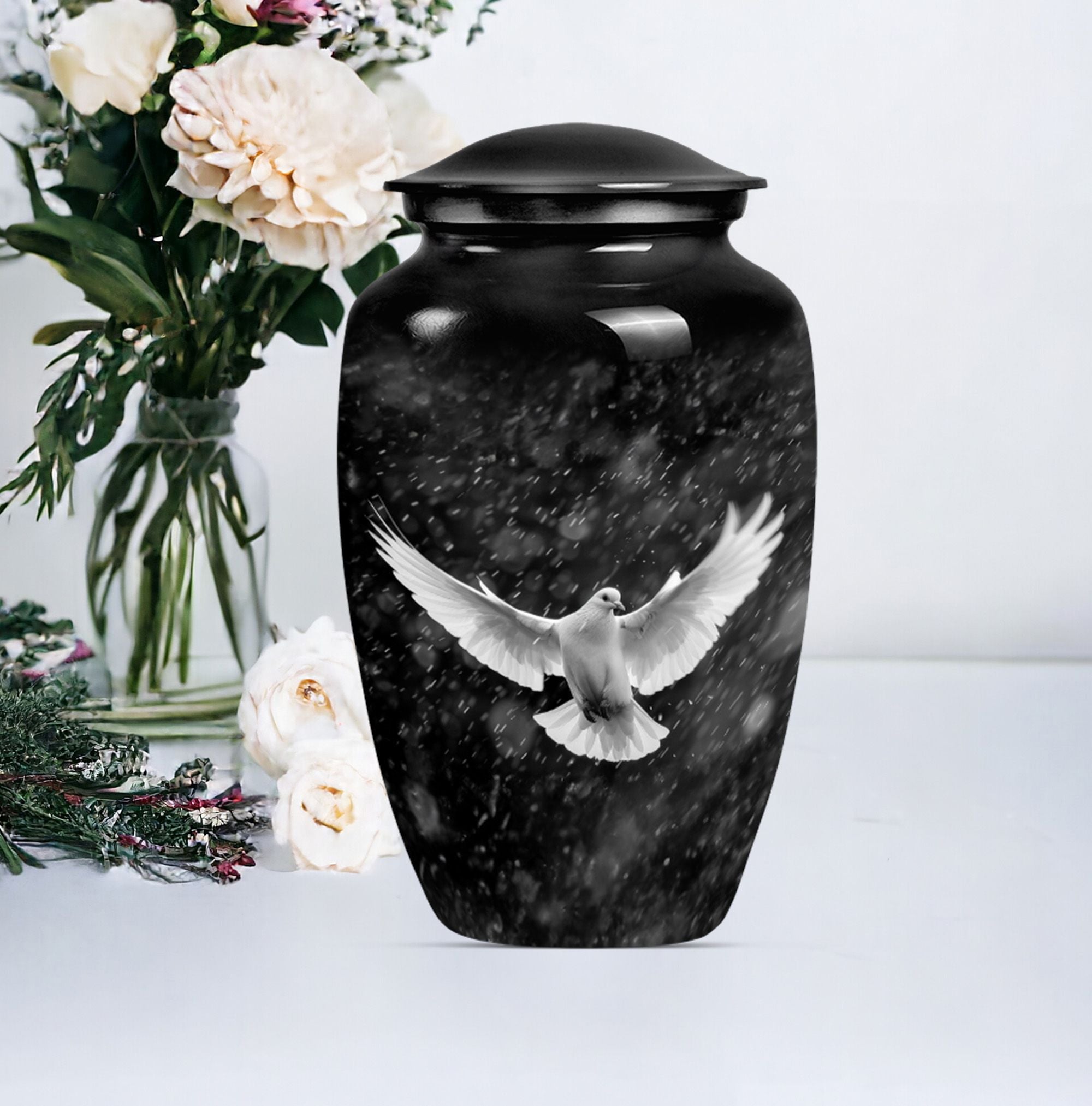 This memorial medium urn, also known as a dove urn, is a comforting presence at a time of loss. Deftly shaped from long-lasting Aluminium material, this urn for cremation ashes showcases the classic urn design with its abstract theme adding a touch of sophistication to its appearance. Spanning over a 10-inch dimension, it's not just a decorative piece but assures ample space with a capacity of 200 cubic inches, suitable to hold and preserve the dear memories of your loved ones. The urn comes with an elegant velvet pouch, generously included in the package, offering a thoughtful way of containing the ashes. If you wish to add a personal touch, it also has an option for customization where you can engrave names on it. Carefully constructed with a weight of 3.3 pounds, this large urn secures its place with grace wherever it finds a home. This product is perfect for those seeking unique funeral burial urns for adult human ashes. Your search for a 'cremation urn' culminates here.