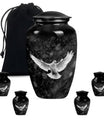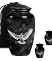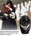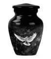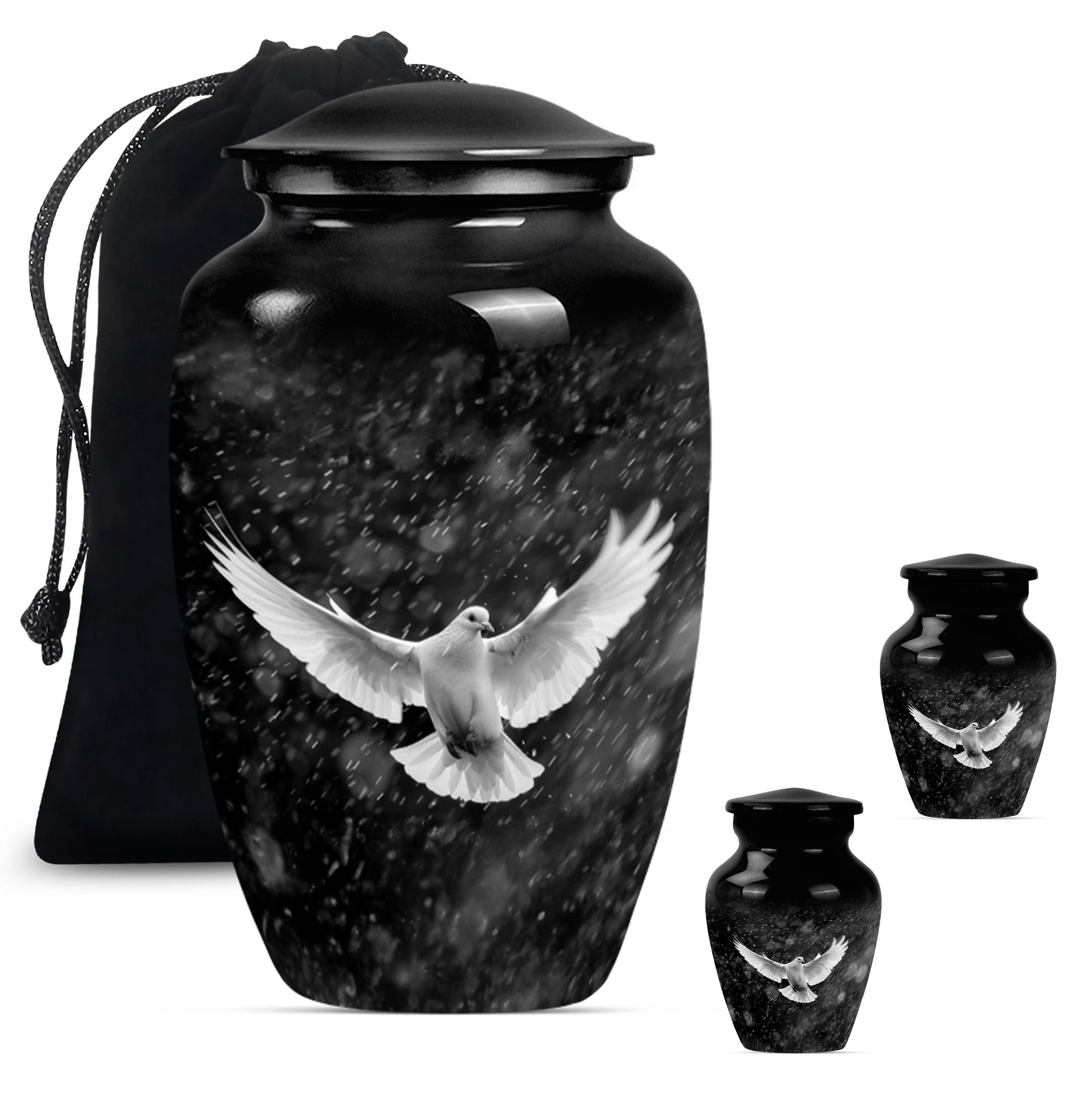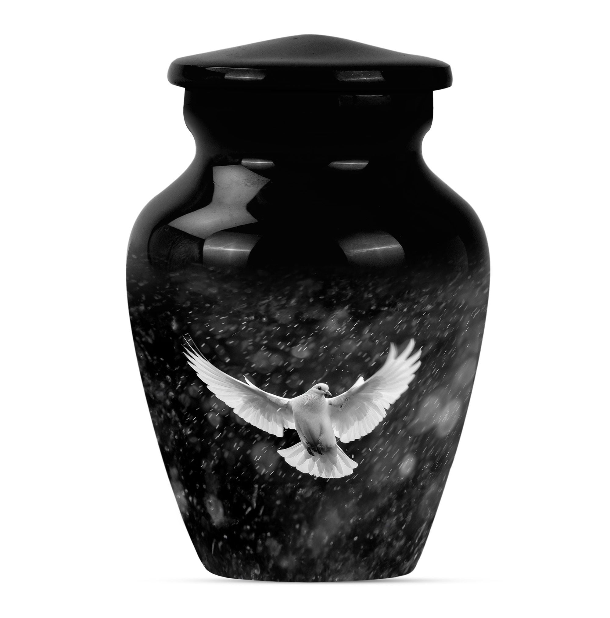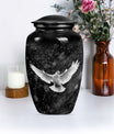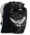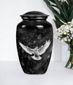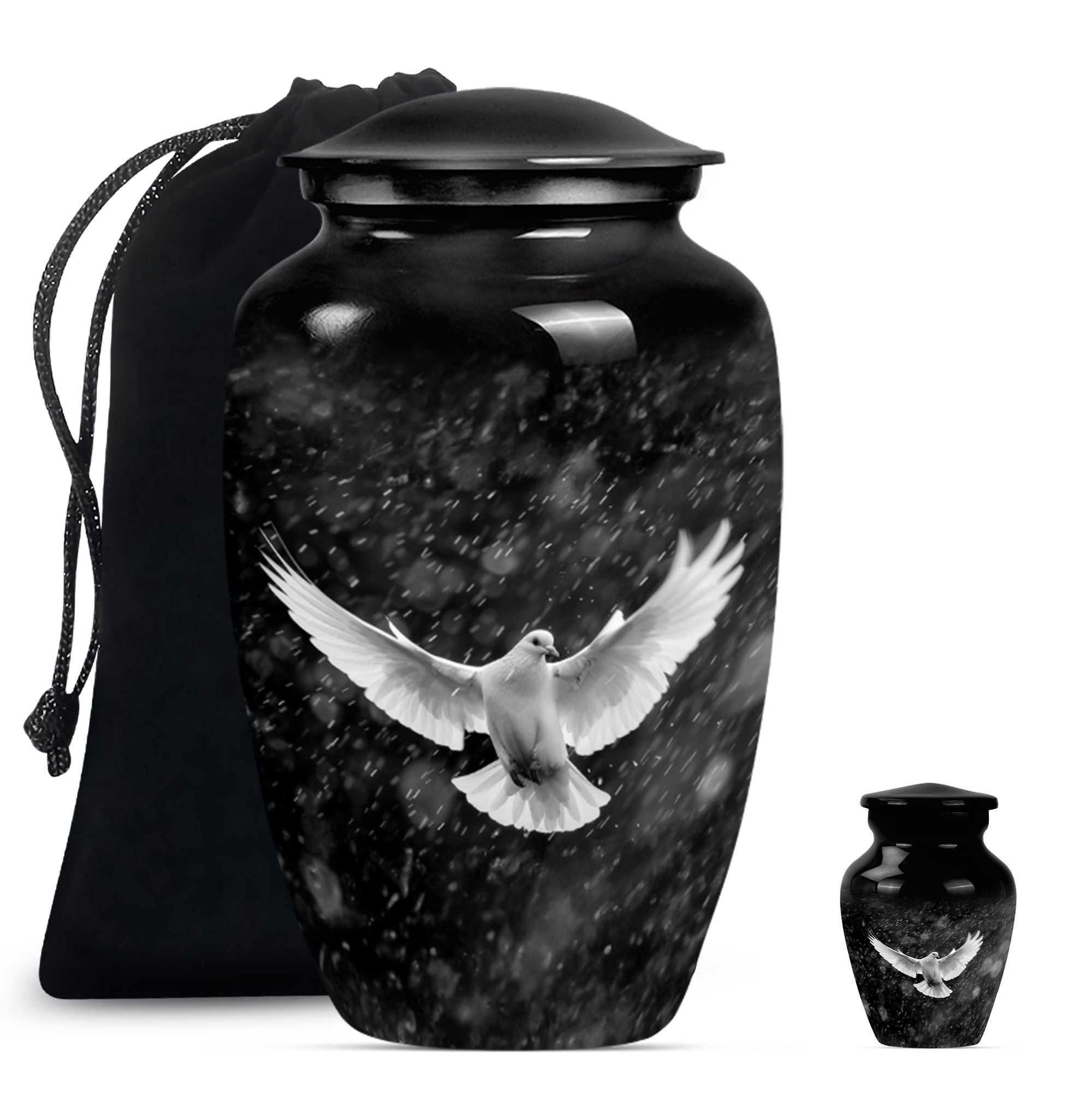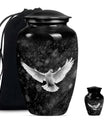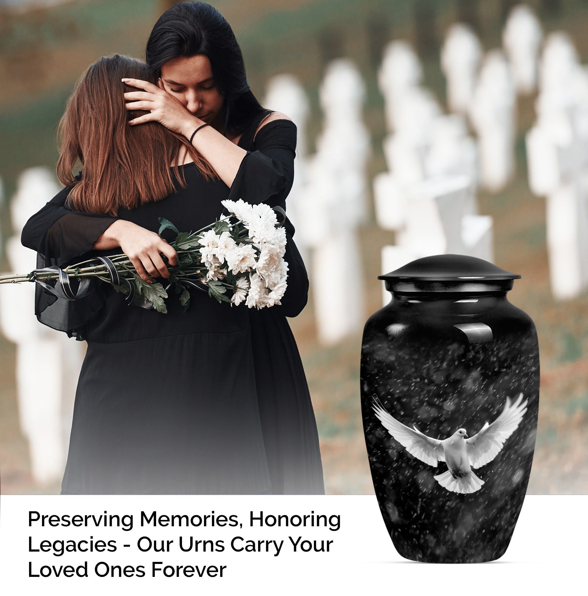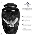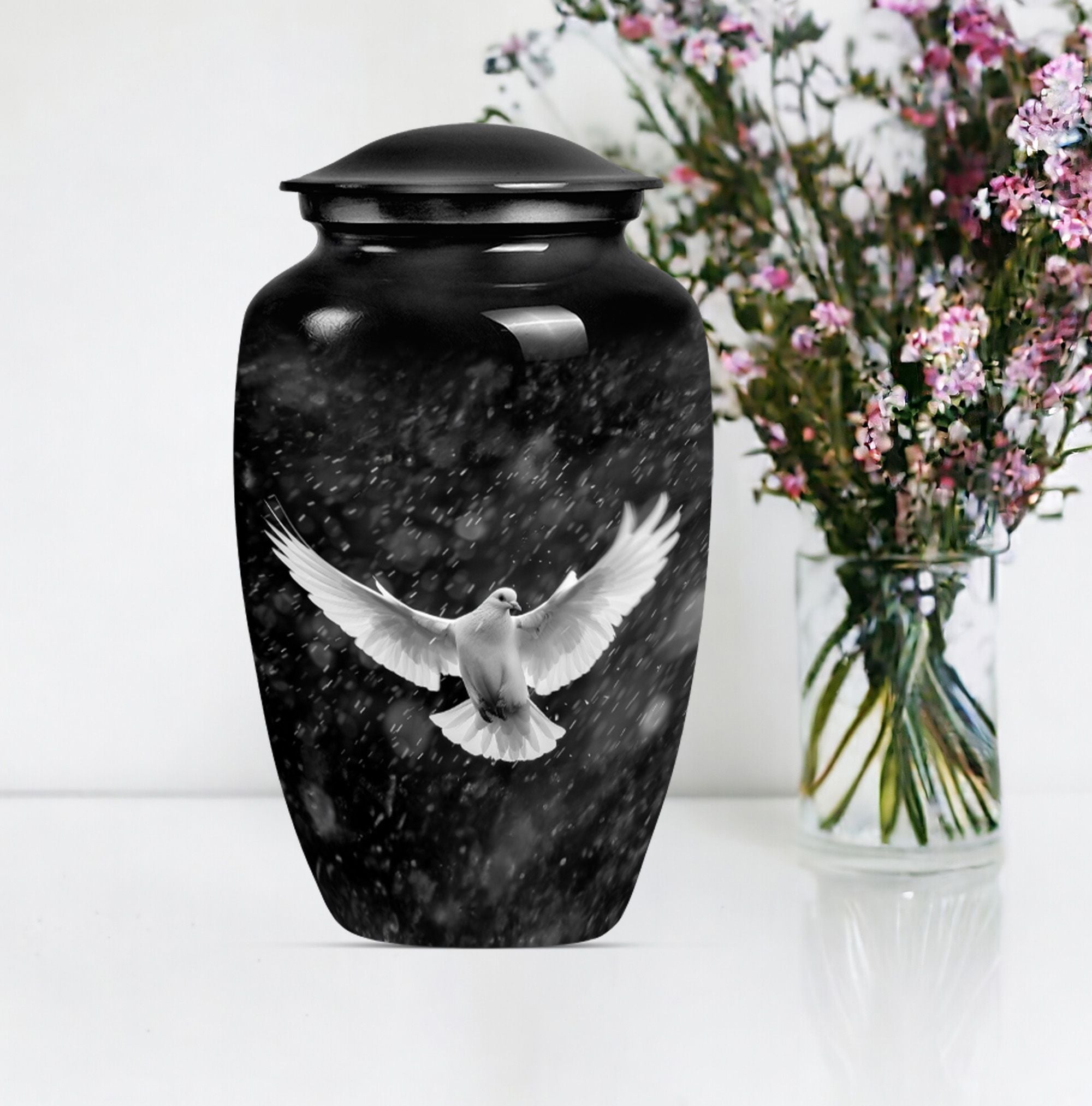 This memorial medium urn, also known as a dove urn, is a comforting presence at a time of loss. Deftly shaped from long-lasting Aluminium material, this urn for cremation ashes showcases the classic urn design with its abstract theme adding a touch of sophistication to its appearance. Spanning over a 10-inch dimension, it's not just a decorative piece but assures ample space with a capacity of 200 cubic inches, suitable to hold and preserve the dear memories of your loved ones. The urn comes with an elegant velvet pouch, generously included in the package, offering a thoughtful way of containing the ashes. If you wish to add a personal touch, it also has an option for customization where you can engrave names on it. Carefully constructed with a weight of 3.3 pounds, this large urn secures its place with grace wherever it finds a home. This product is perfect for those seeking unique funeral burial urns for adult human ashes. Your search for a 'cremation urn' culminates here.