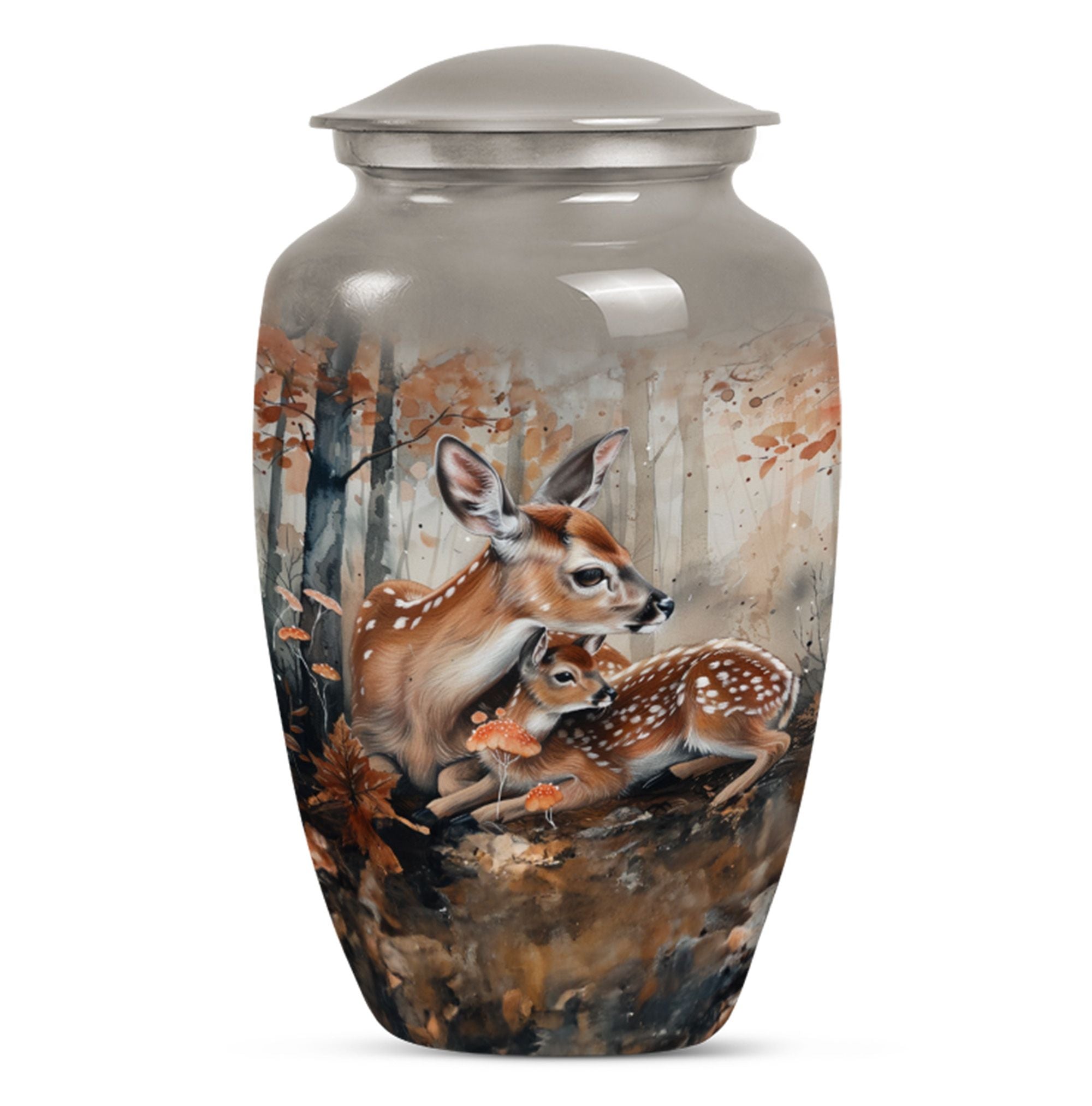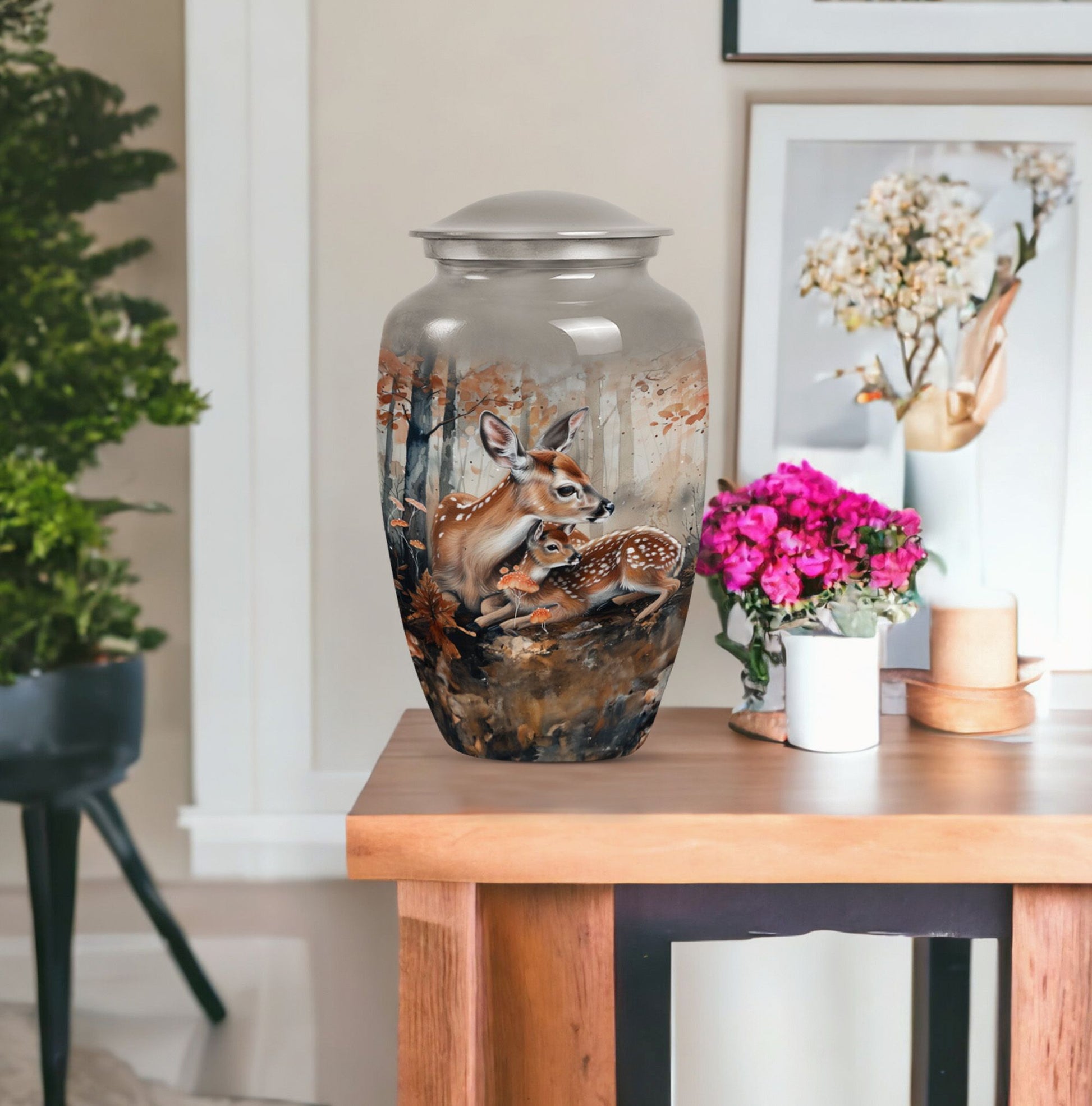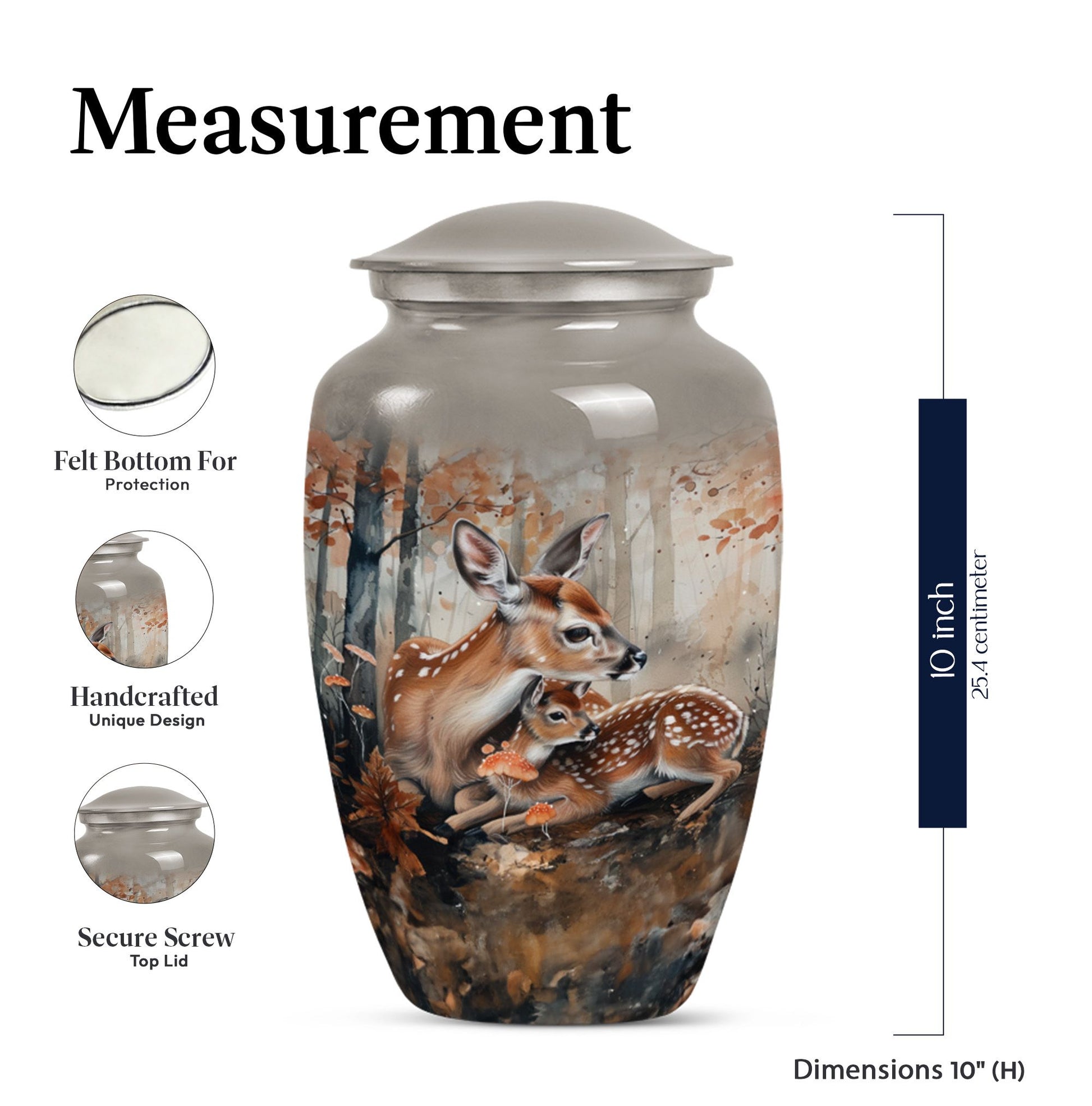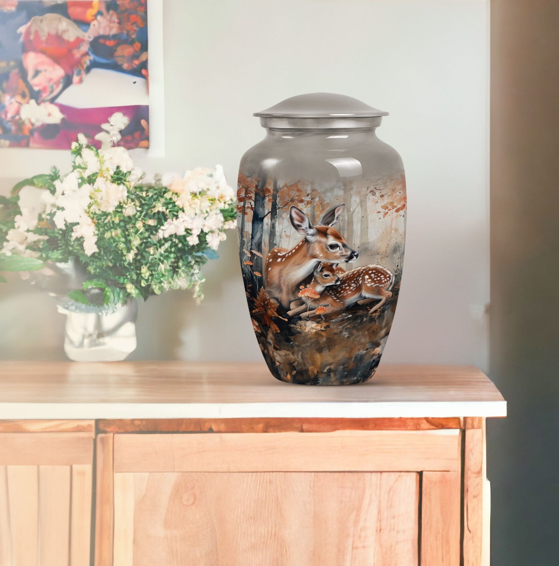 Cherish the memory of a loved one or cherish a memento from your past with our beautifully crafted Deer Family Urn. Sized at a comfortable 10 inches in height and with a weight of 3.3 pounds, this large aluminium cremation urn fits subtly into any space. The ‘Classic Urn’ theme, inspired by the timeless beauty of the gramophone, offers a tranquil memorial resting place for the ashes of those you hold dear. Our Deer Family Urn has an impressive capacity of 200 cubic inches, ensuring ample space to store ashes securely. This item comes with a velvet pouch, providing a dignified containment for the ashes. For a more personal touch, we offer the option to personalize the urn with engraved names for that truly individual touch. Terms such as 'Burial ash urns for humans', 'human ash urn ashes', ‘cremation urn for burial’, ‘cremation urn for dad’ are accepted pointers for locating this meaningful and essential item.