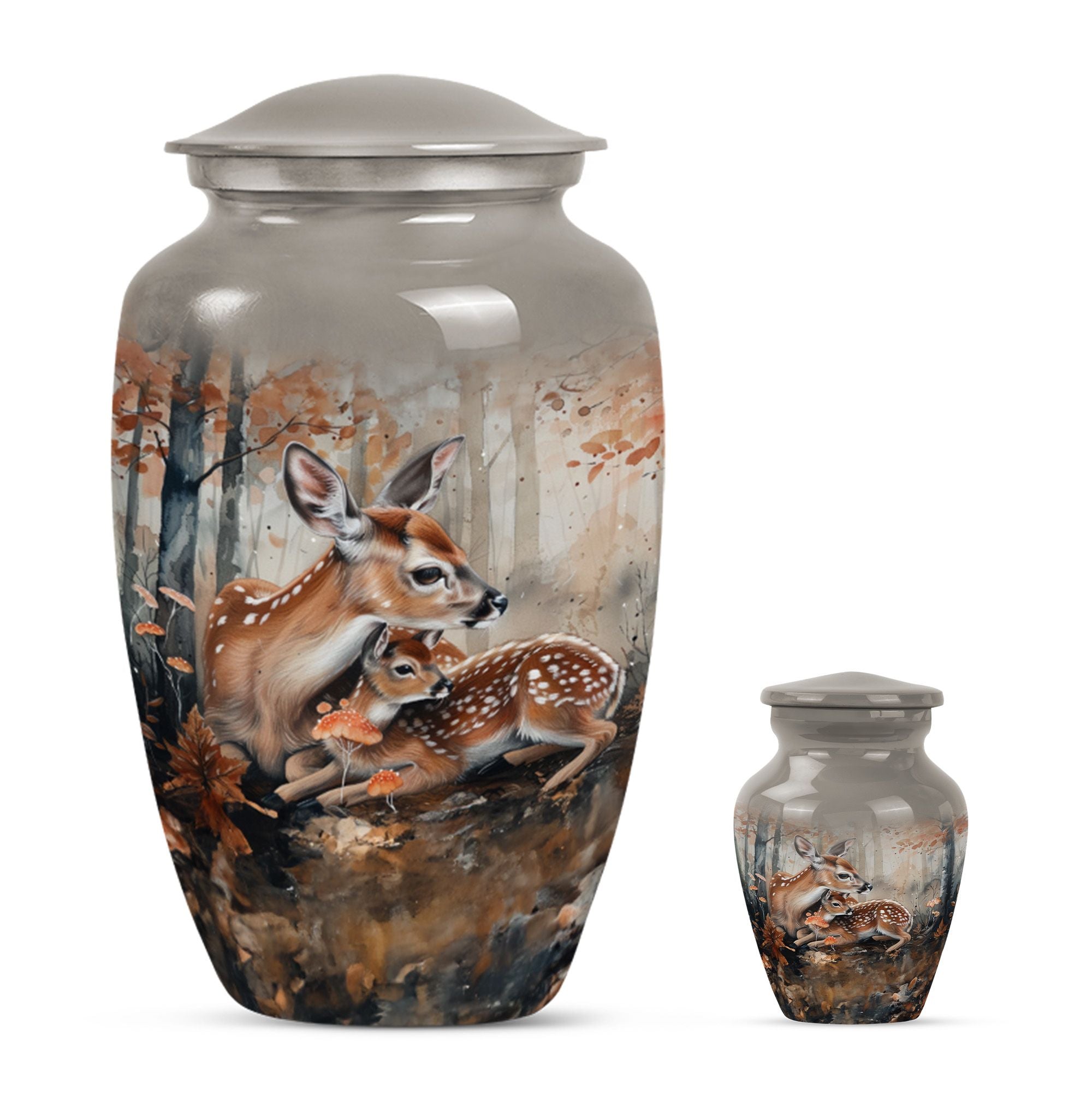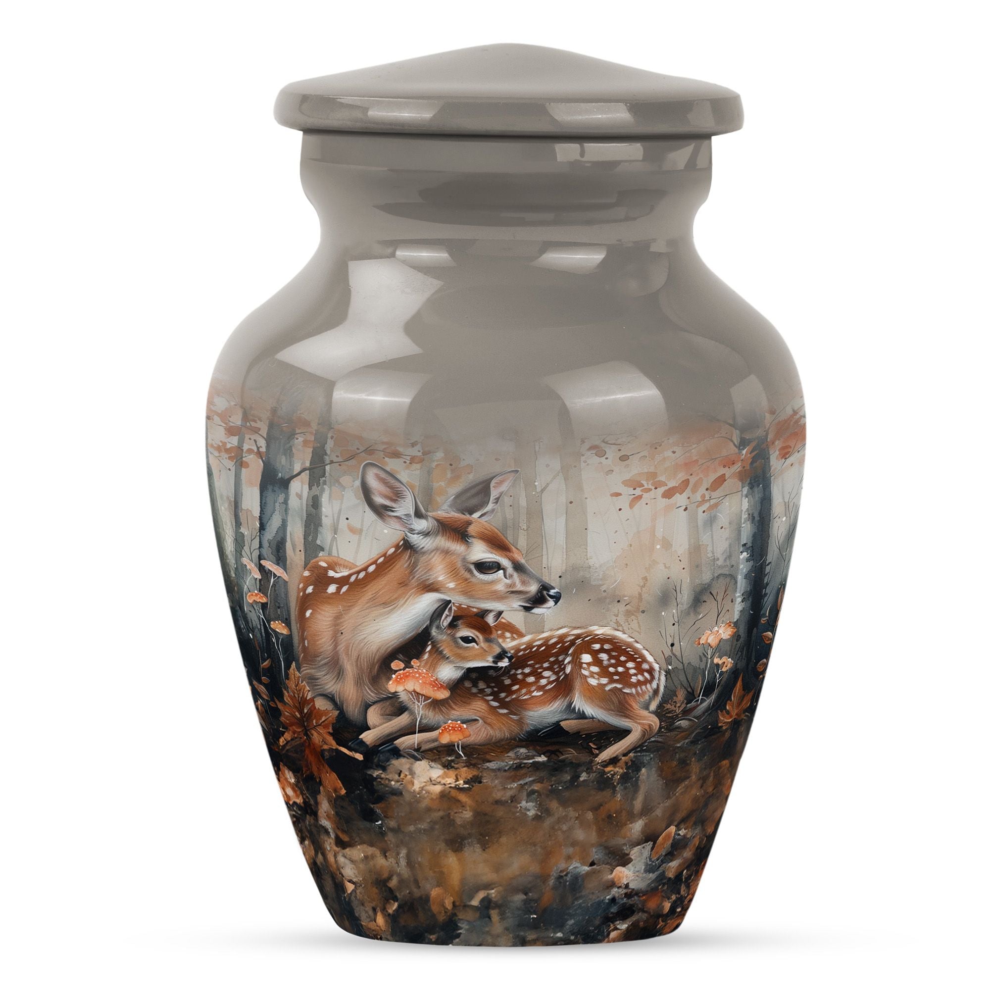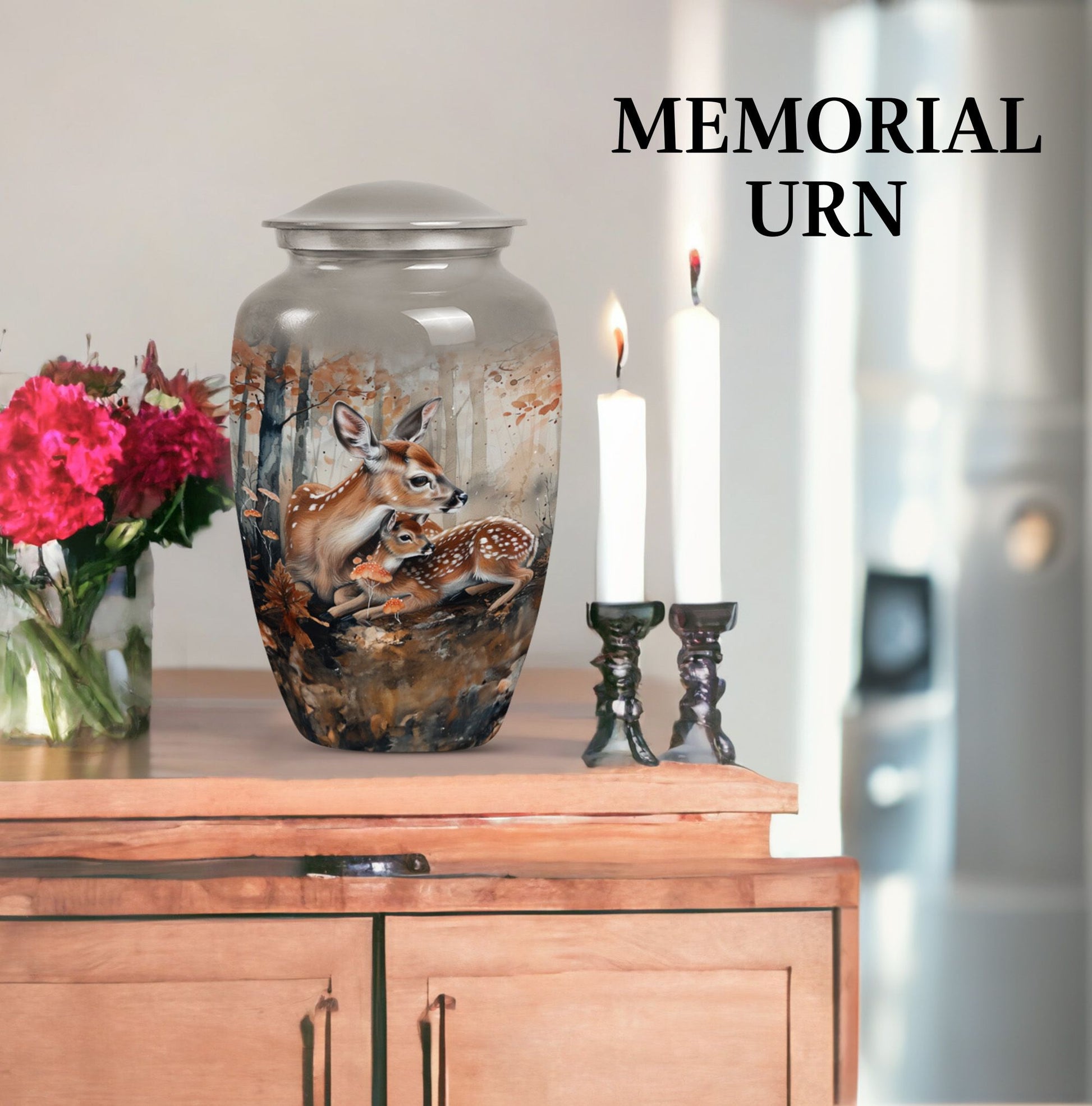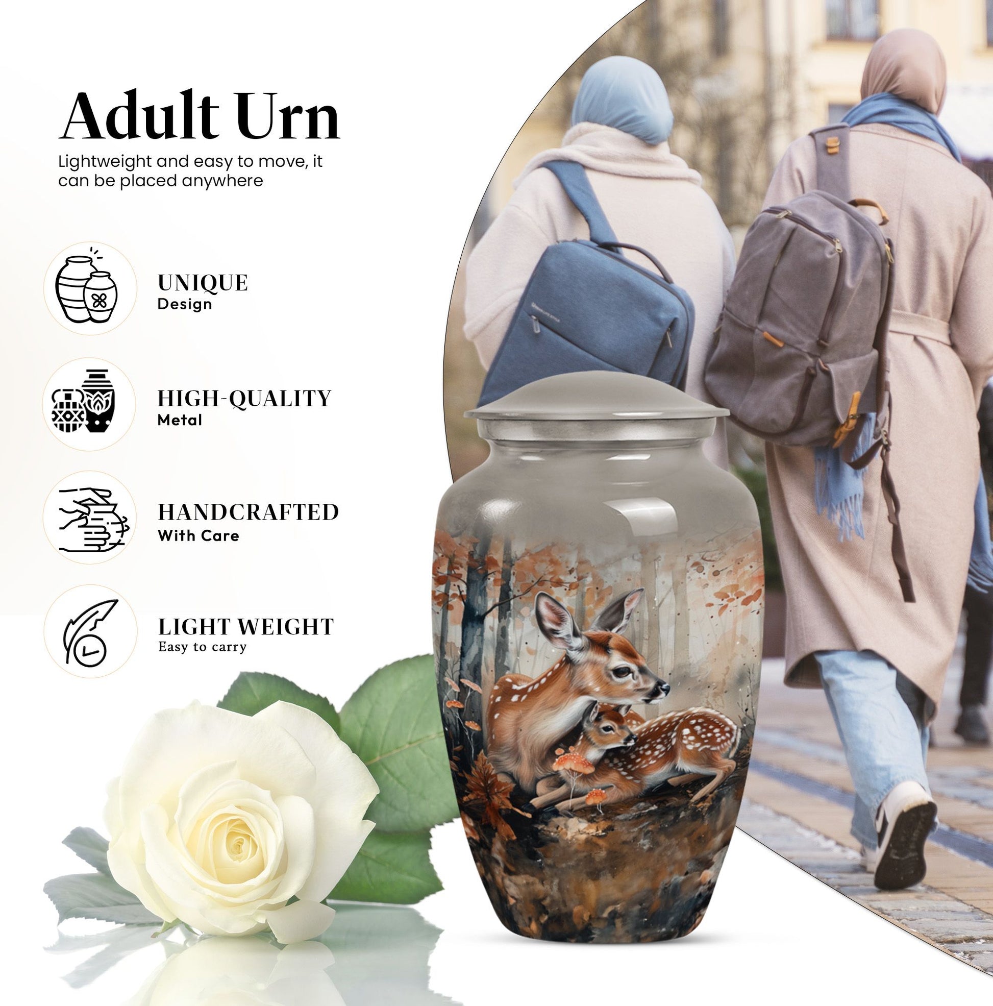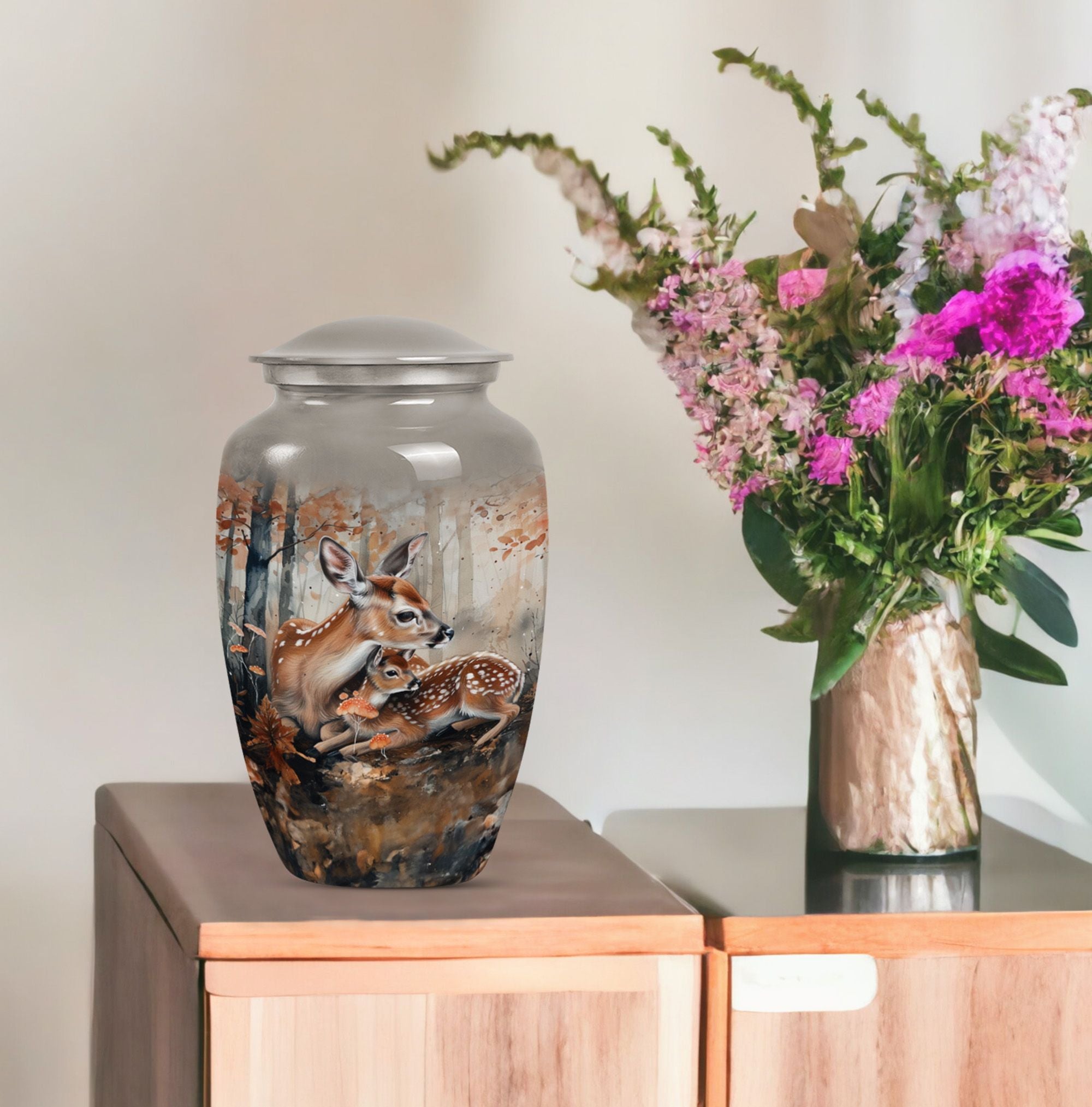 Cherish the memory of a loved one or cherish a memento from your past with our beautifully crafted Deer Family Urn. Sized at a comfortable 10 inches in height and with a weight of 3.3 pounds, this large aluminium cremation urn fits subtly into any space. The ‘Classic Urn’ theme, inspired by the timeless beauty of the gramophone, offers a tranquil memorial resting place for the ashes of those you hold dear. Our Deer Family Urn has an impressive capacity of 200 cubic inches, ensuring ample space to store ashes securely. This item comes with a velvet pouch, providing a dignified containment for the ashes. For a more personal touch, we offer the option to personalize the urn with engraved names for that truly individual touch. Terms such as 'Burial ash urns for humans', 'human ash urn ashes', ‘cremation urn for burial’, ‘cremation urn for dad’ are accepted pointers for locating this meaningful and essential item.