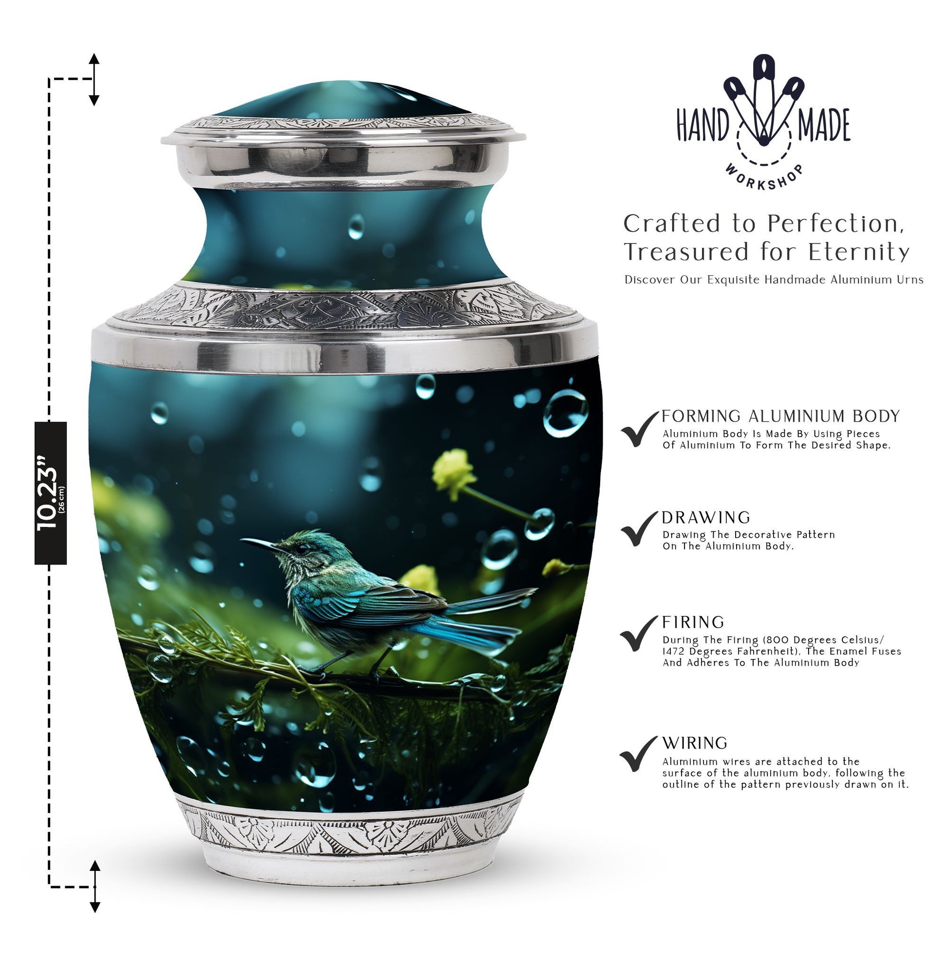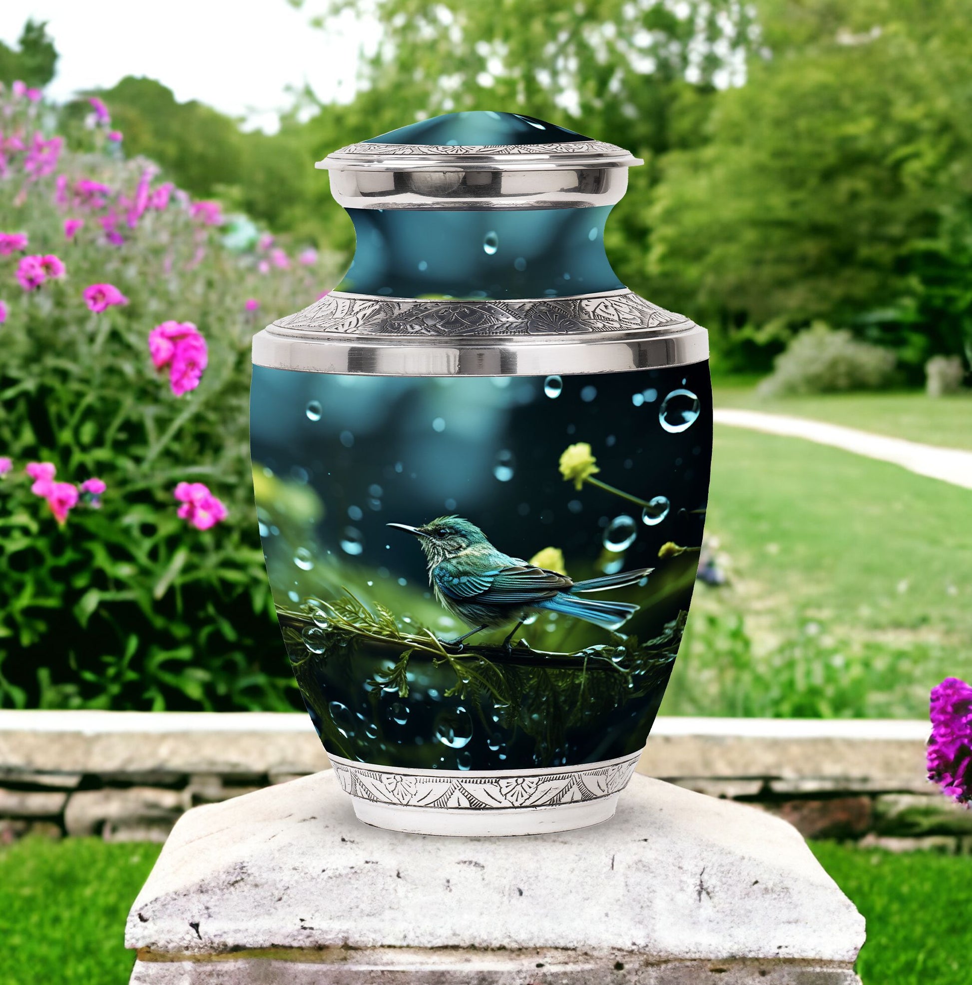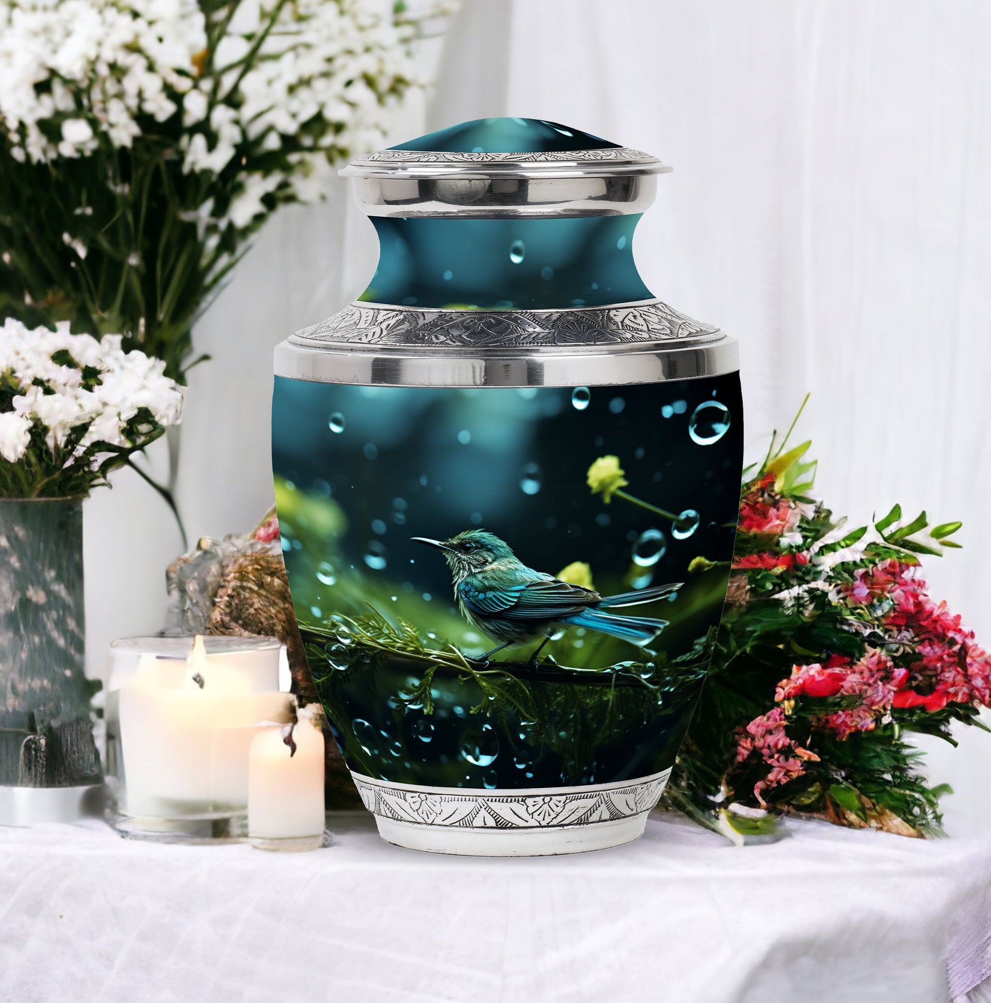 Honor the memory of your dearly departed mother with our exquisite Green Sparrow Cremation Urn. This urn, part of our large-sized urn offerings, stands at 10 inches in height, and can comfortably hold up to 200 cubic inches of ashes. Crafted with meticulous care from premium aluminum, this urn stands the test of time while safeguarding your loved one's remnants. With a slightly heavyweight feel at 3.3 pounds, this urn exudes a strong presence and resilience that mirrors the enduring nature of your love and memories. The urn comes with a sophisticated velvet pouch, an appropriate containment for your treasured ashes. To add a personal touch, we offer the option to engrave names on the urn, immortalizing the bond between you and the departed. In its simple elegance, this urn serves as a beautiful tribute in your memorial ceremonies. Please bear in mind that the urn design, while timeless, avoids ostentation, highlighting the serene dignity of your farewell rituals. This urn is ideal not only as a centerpiece but also as a keepsake, evoking memories of your loved ones every time you see it.