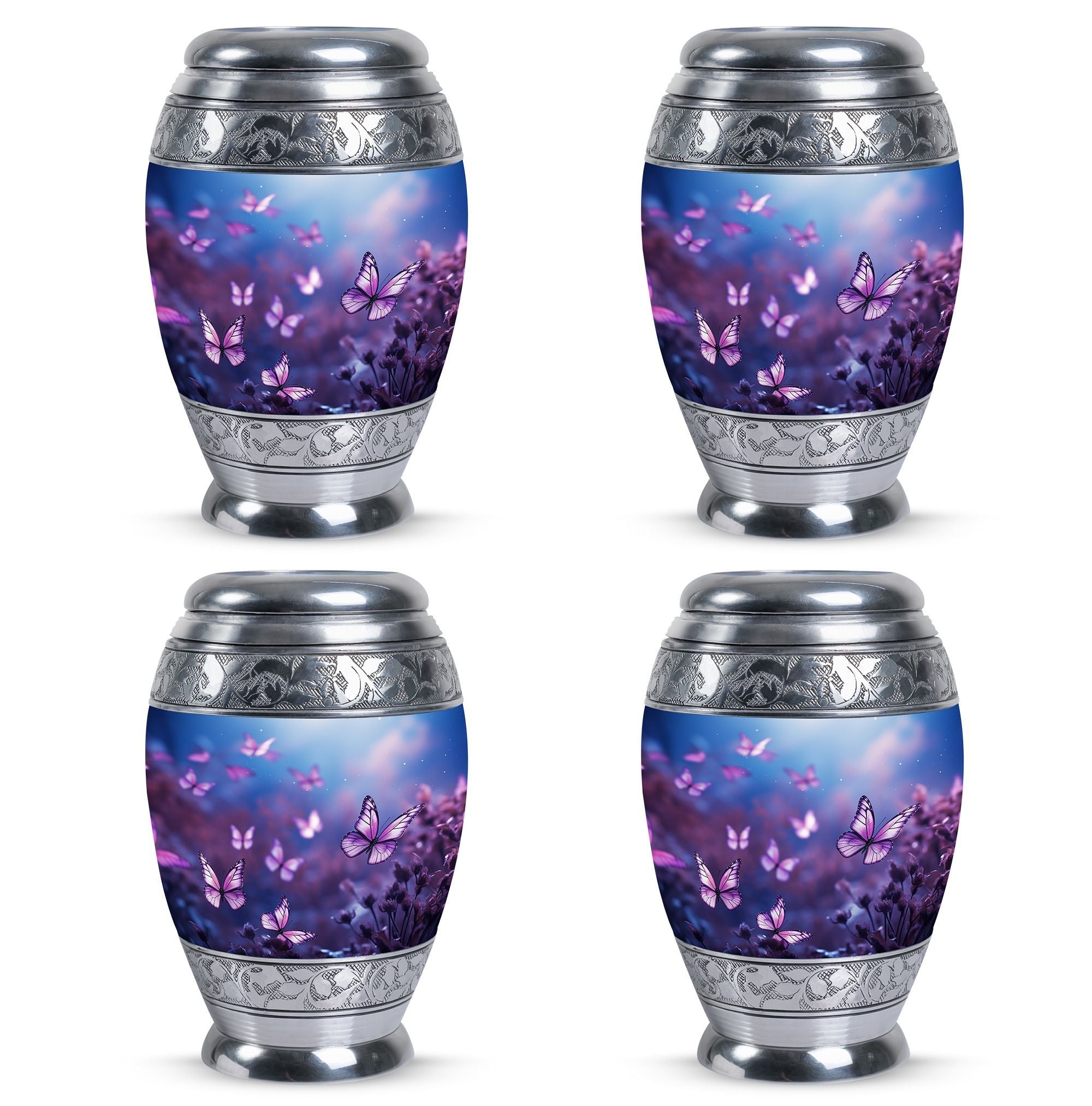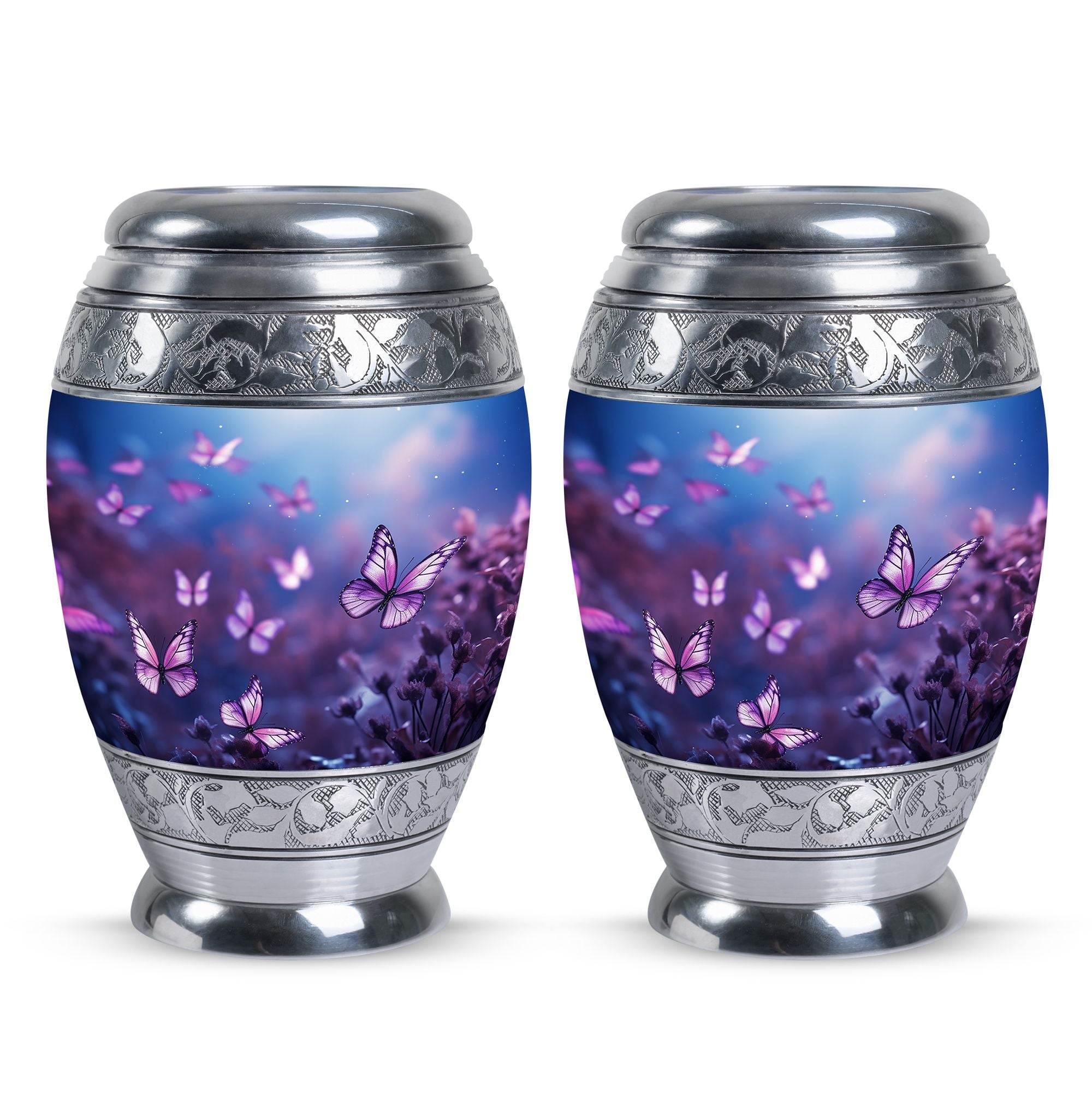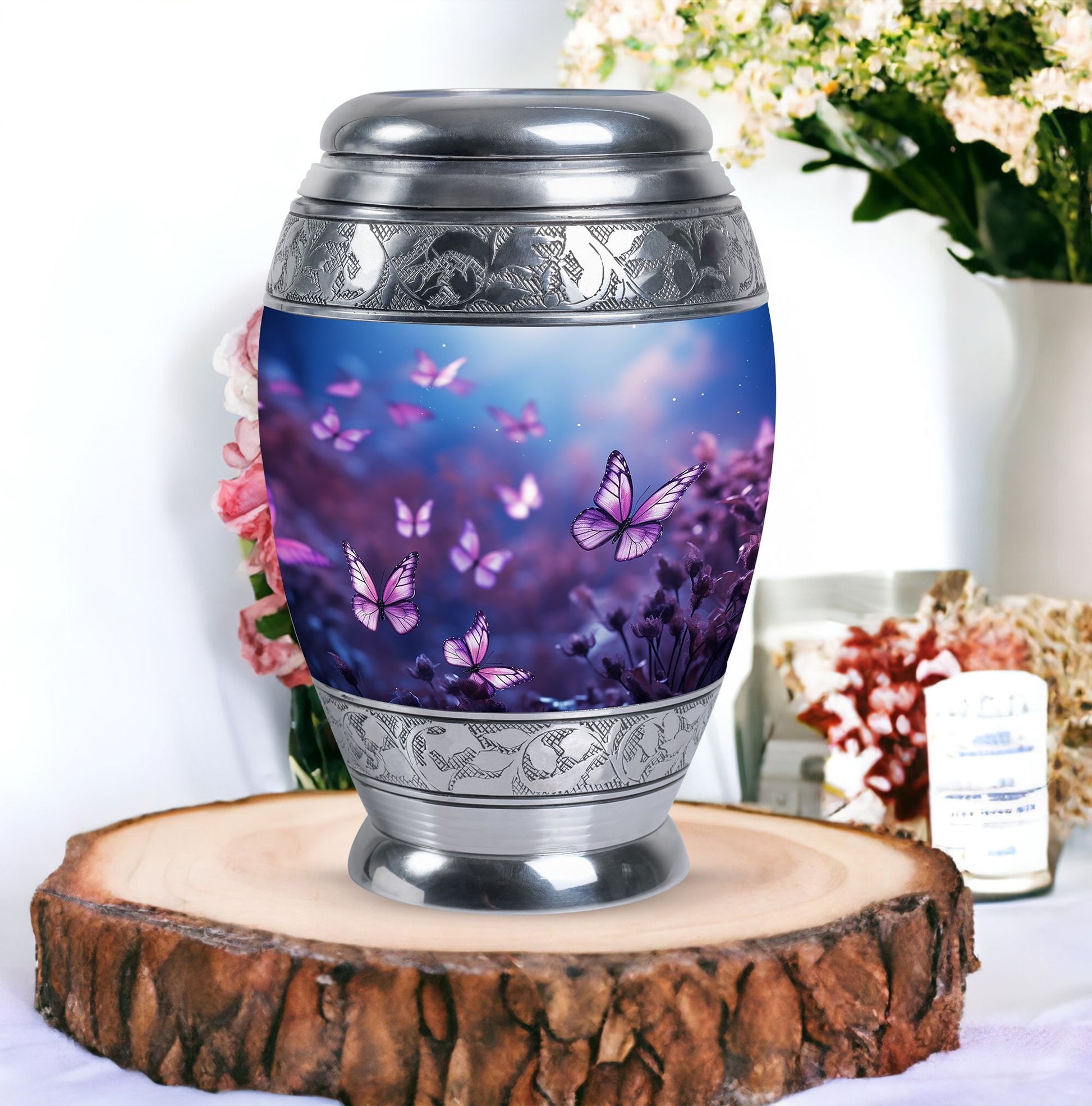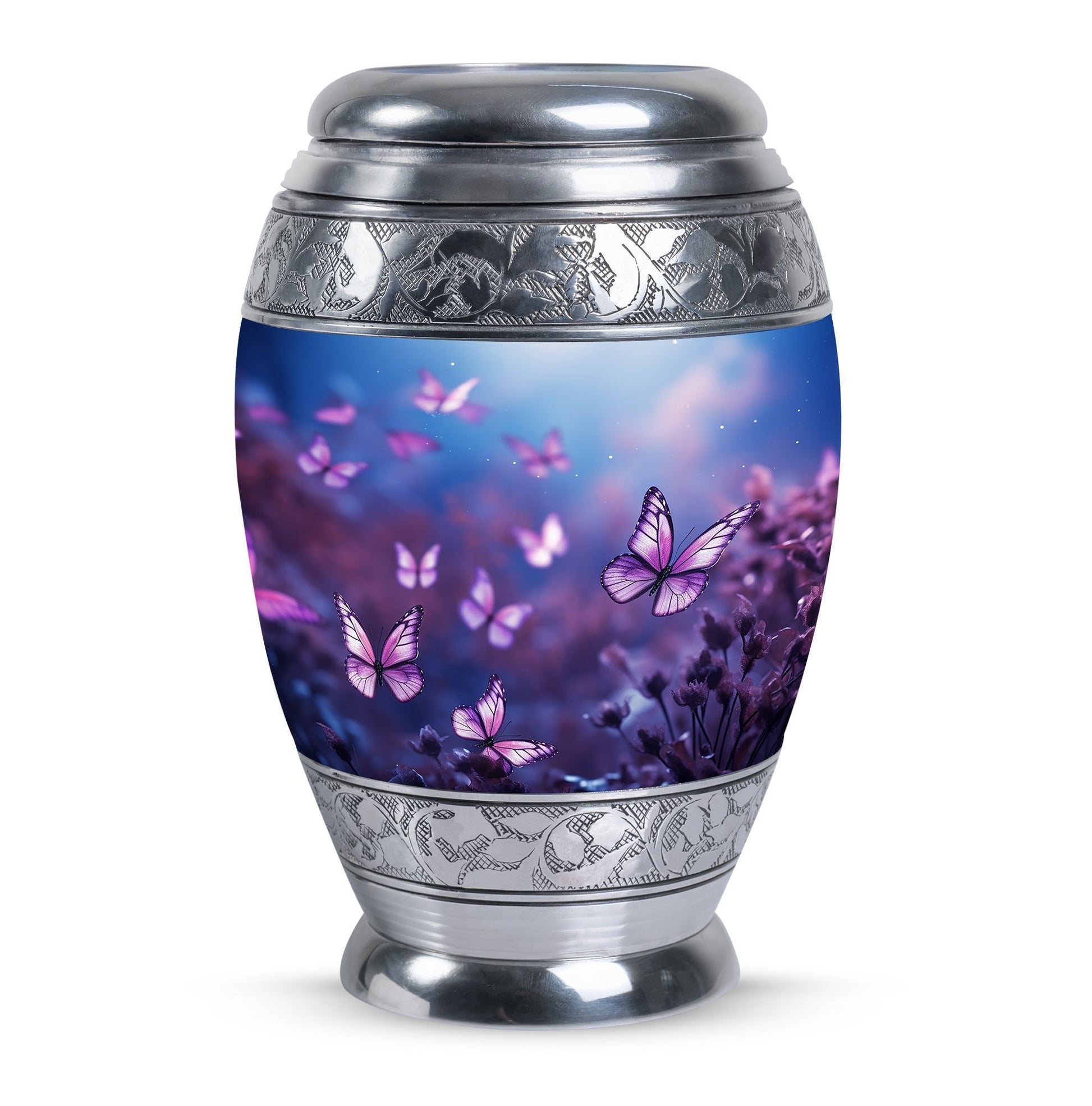 Pay tribute to your loved one in style with our special 'Butterflies in Forest Memorial Urn'. Specifically designed for adults and senior citizens, this urn is an optimal choice for anyone who is looking for high-quality cremation urns. With a size of 3 inches and weighing 3.3 pounds, its classic urn shape gives a timeless appeal. This large cremation urn is meticulously crafted from durable aluminium, ensuring long-lasting memorability. The urn comes with a velvet pouch, providing a secure containment for ashes. Boasting an impressive 200 cubic inches of capacity, it can comfortably hold the ashes of an adult. To give a more personal touch, individual names can be engraved on it, making it not just a burial urn for ashes, but something much more meaningful. Our 'Butterflies in Forest Memorial Urn' stands at 10 inches in height, and is a modern ashes holder that combines traditional elegance with a unique flair.