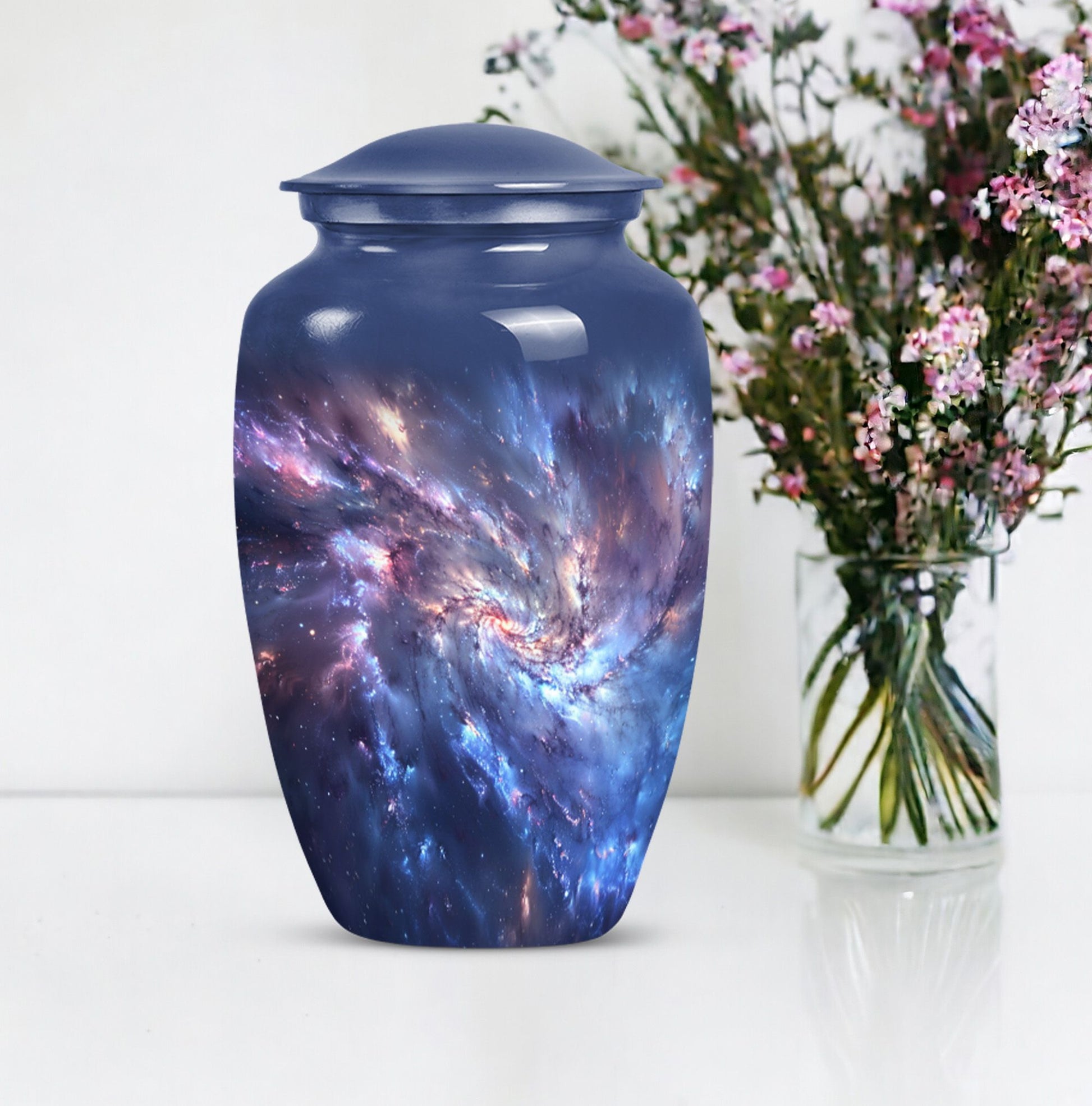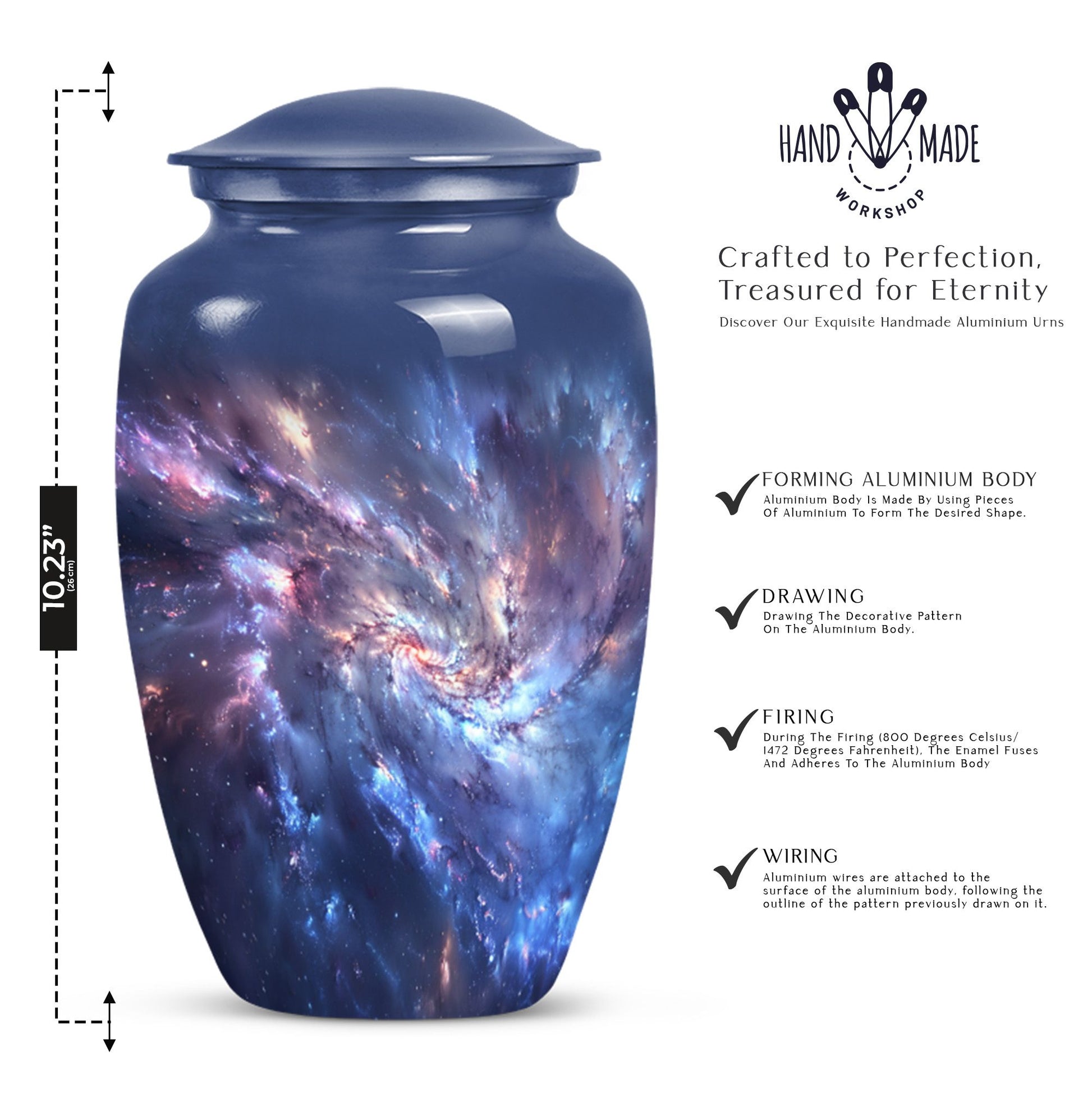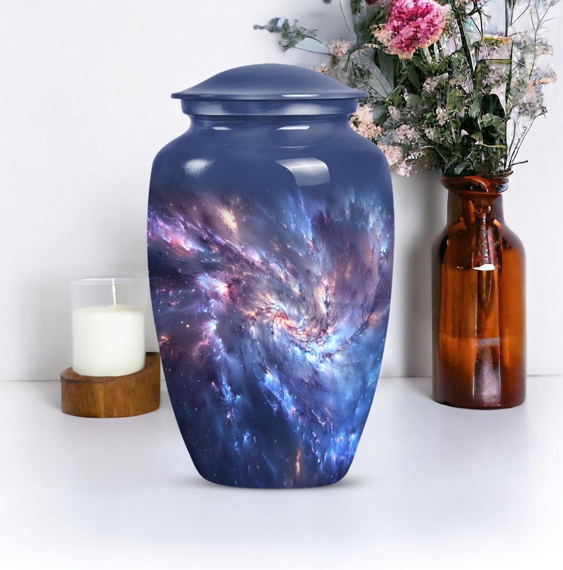 Introducing our 10-inch glaaxy Urn, a beautifully symbolic final resting place for your loved ones. This large urn is made from durable aluminium, offering a stately weight of 3.3 pounds. Its classic design reflects timeless elegance, while the Purple Meadow theme adds a touch of serenity and tranquility. With a substantial capacity of 200 cubic inches, it provides ample space for containment of ashes, which can be securely kept within the accompanying velvet pouch. Personalize this cremation urn, making it a unique tribute to the departed. Exceptionally sized, it's designed to accommodate adult male and female, making it apt for dual usage. Avoid traditional burial challenges with this metal urn designed for burial in ground. Preferred by most seniors, this urn makes for an honorable selection for memorial ceremonies. To top it off, our glaaxy Urn comes in an easy to carry and store size - 10 inches in height.