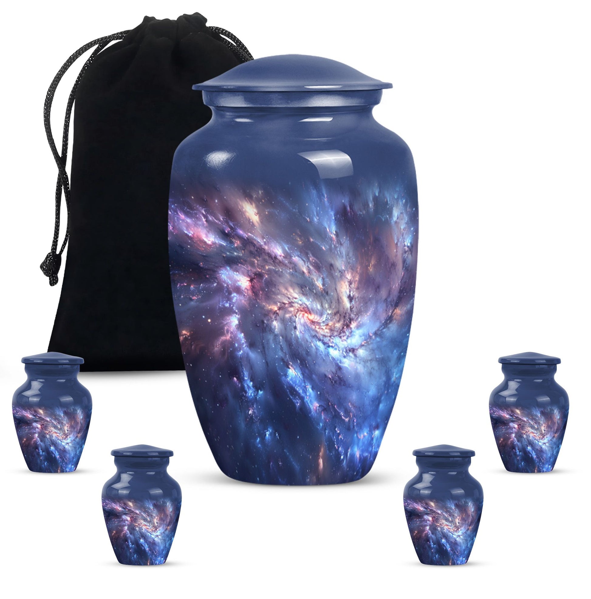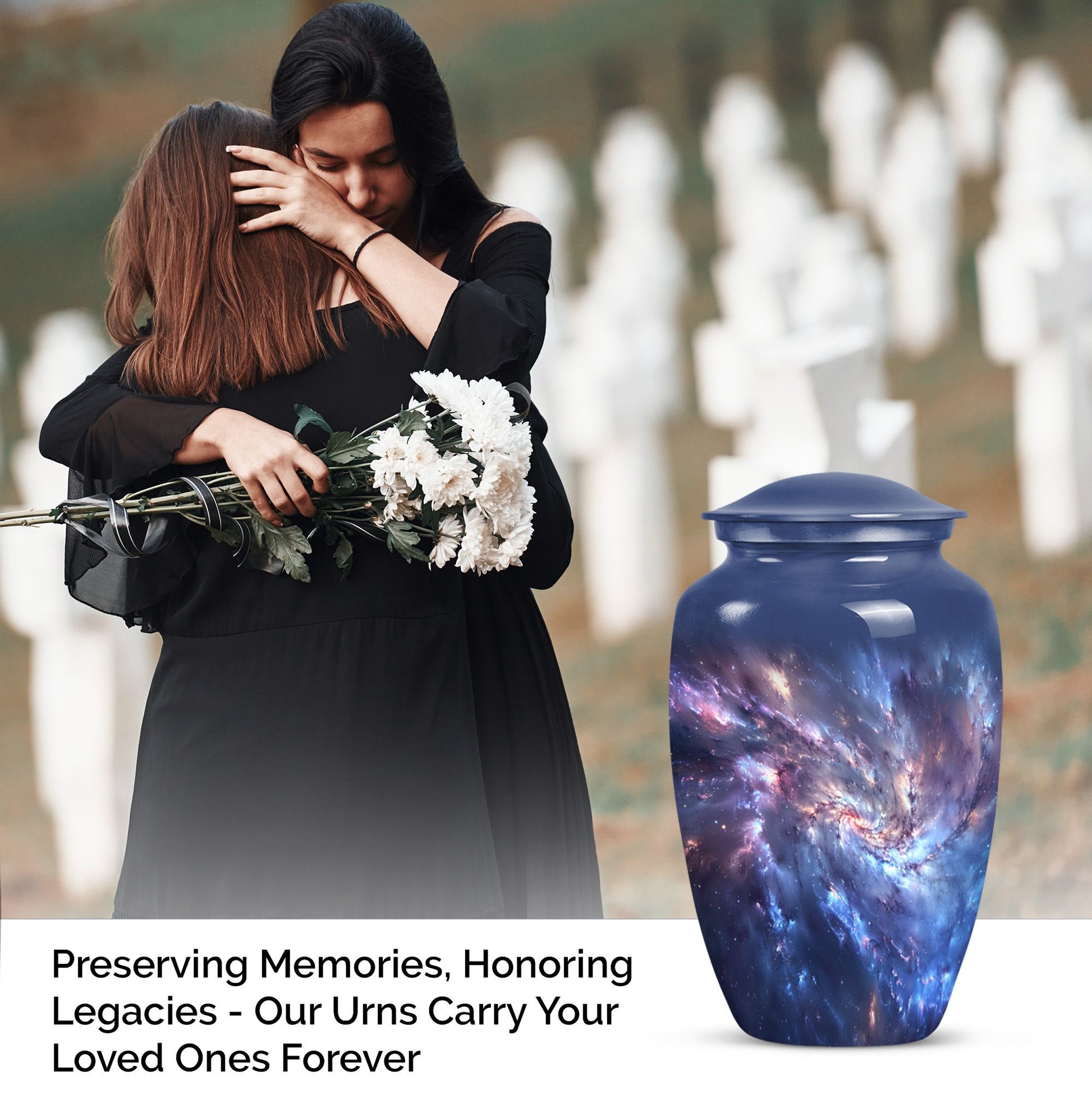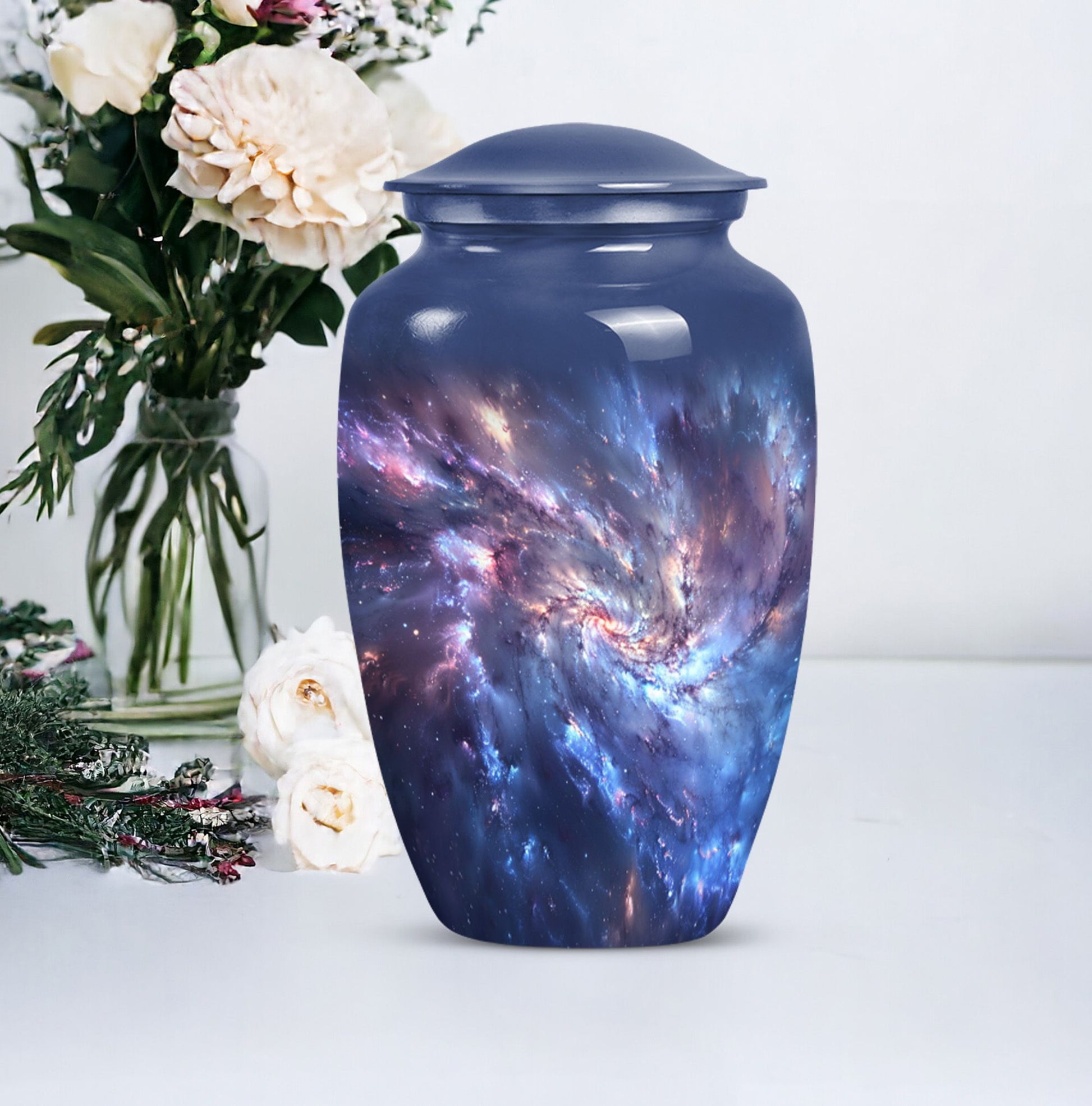 Introducing our 10-inch glaaxy Urn, a beautifully symbolic final resting place for your loved ones. This large urn is made from durable aluminium, offering a stately weight of 3.3 pounds. Its classic design reflects timeless elegance, while the Purple Meadow theme adds a touch of serenity and tranquility. With a substantial capacity of 200 cubic inches, it provides ample space for containment of ashes, which can be securely kept within the accompanying velvet pouch. Personalize this cremation urn, making it a unique tribute to the departed. Exceptionally sized, it's designed to accommodate adult male and female, making it apt for dual usage. Avoid traditional burial challenges with this metal urn designed for burial in ground. Preferred by most seniors, this urn makes for an honorable selection for memorial ceremonies. To top it off, our glaaxy Urn comes in an easy to carry and store size - 10 inches in height.