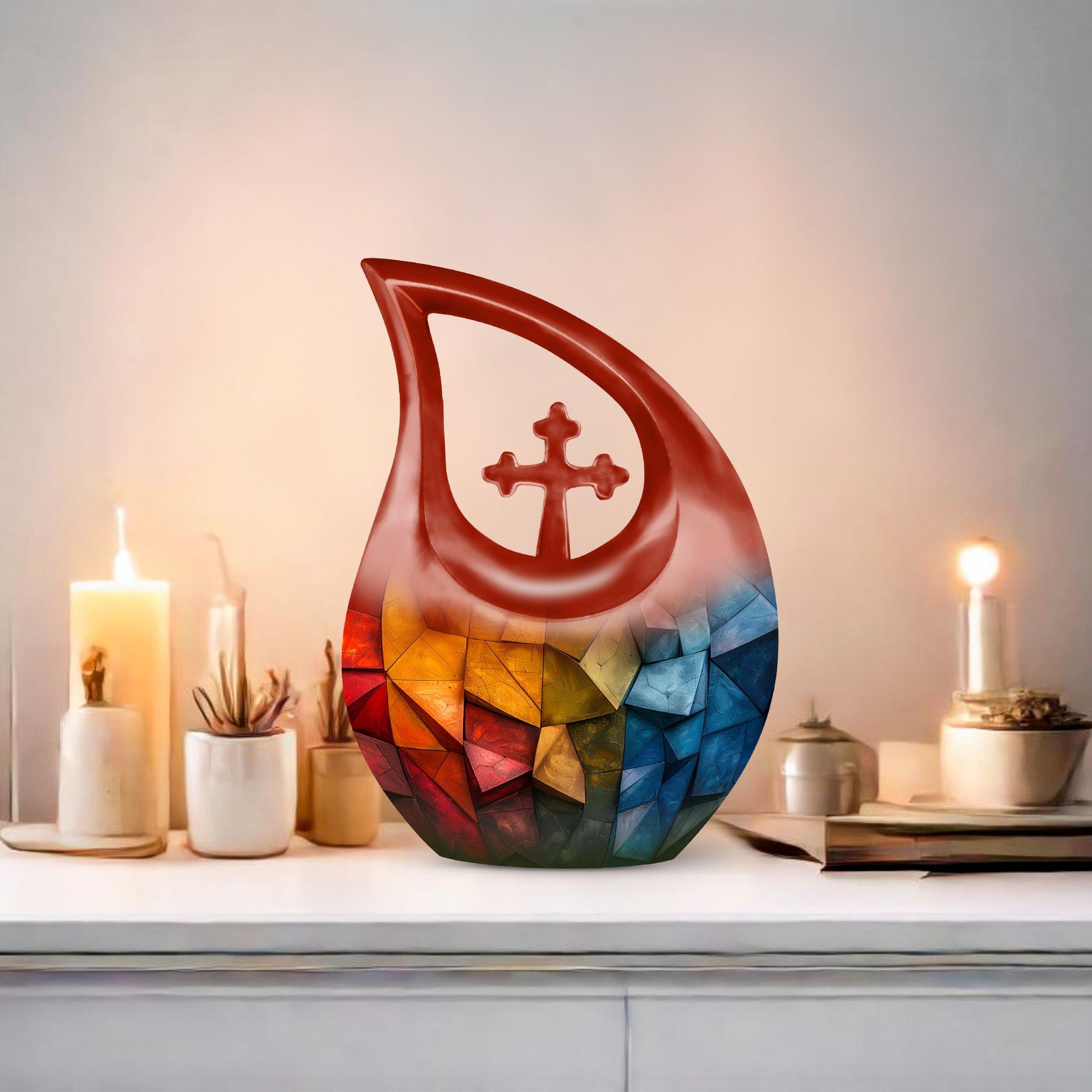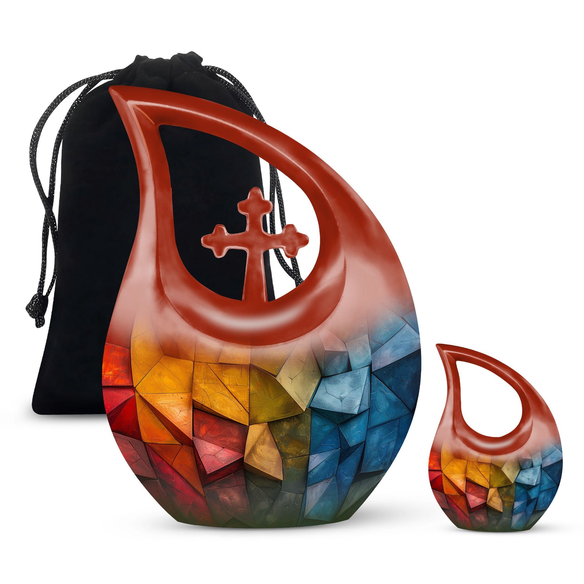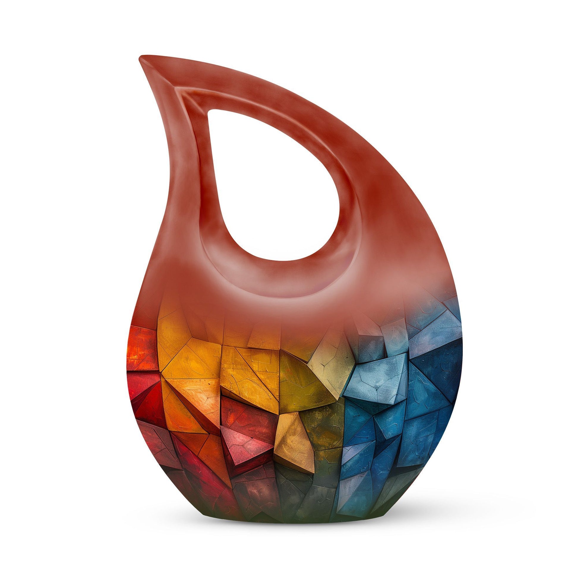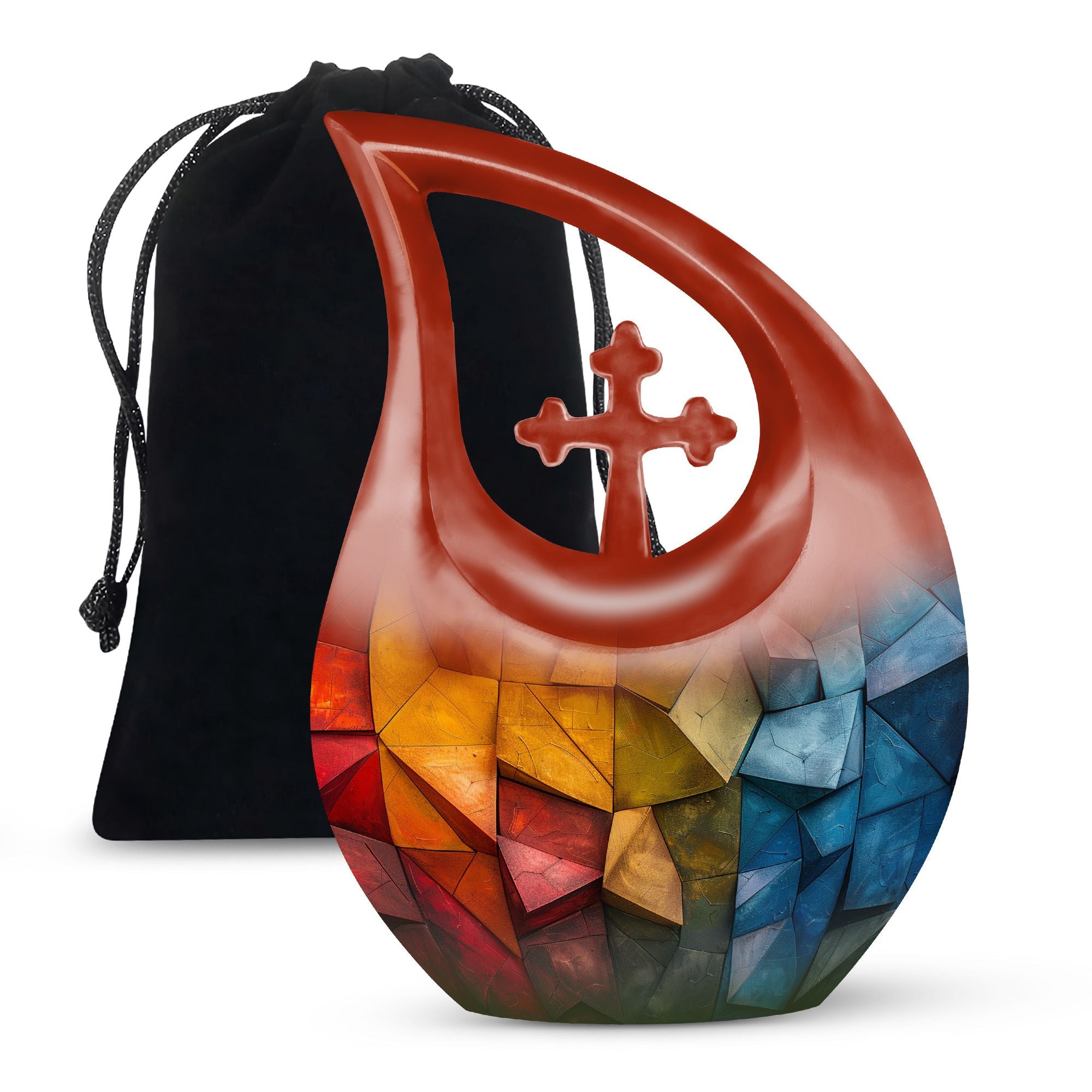 Honor the memory of your beloved mother with our striking Geometric Temperature Gradient Urn, thoughtfully crafted in a resplendent Cross Drop design. At an elevated size of 10 inches and weighing a balance 3.3 pounds, the reverence of our urn is unmistakable. Fabricated from durable Aluminium, the urn exhibits a blending of strength and elegance. With a generous capacity of 200 cubic inches, it gracefully accommodates the cremation remains, ensuring a worthy resting place. The urn is further enhanced with the opportunity for customization, allowing for engraved names to impart a personal touch. Rounding out our offering is a luxurious velvet pouch for containment of ashes, enhancing the experience of remembrance. Opt for our Large Urn and celebrate the uniqueness of your loved one's spirit. Note: Ideal for searches related to 'Cremation Remains, Cremation Urns For Sale, Urns For Human Ashes, and Simple Urns For Human Ashes'.