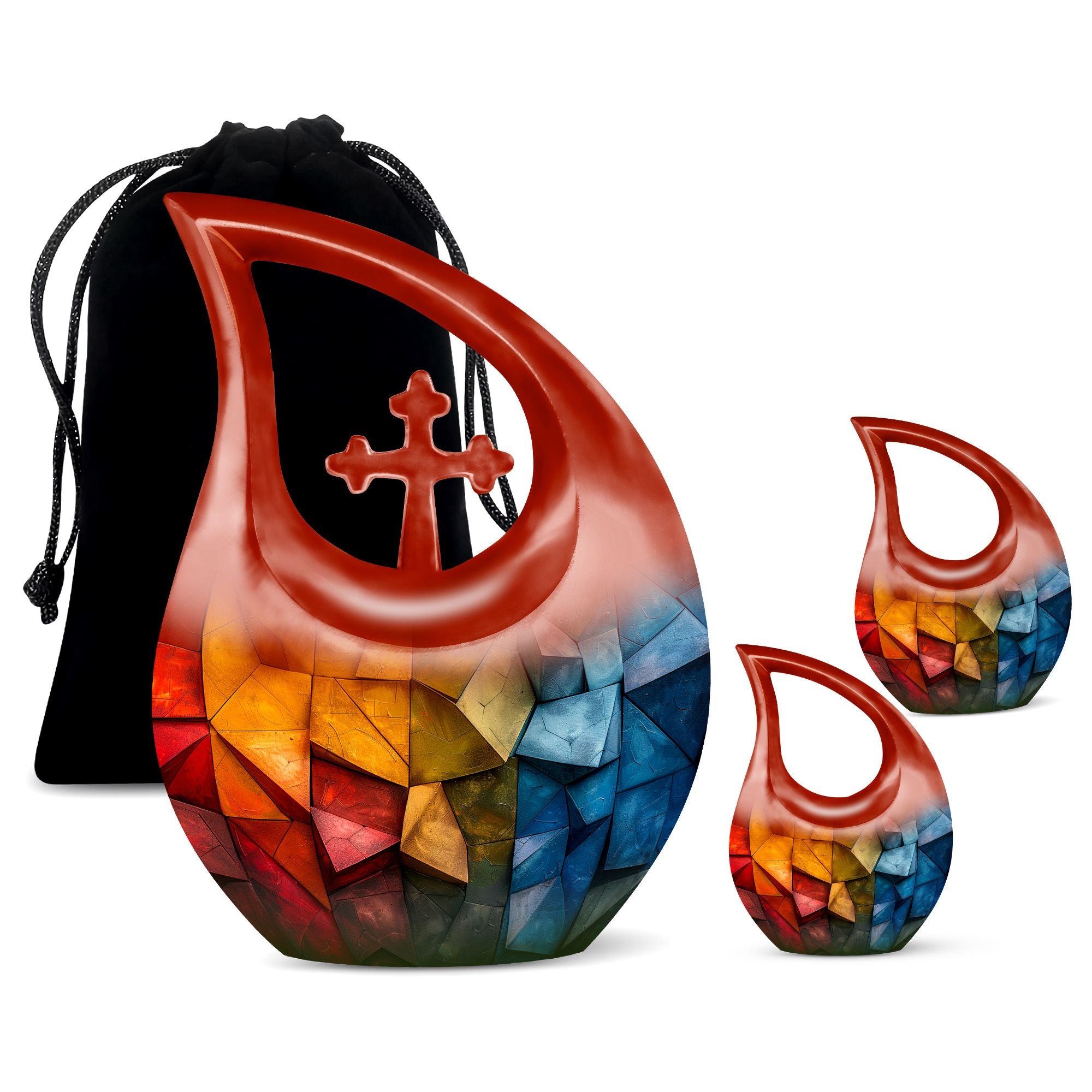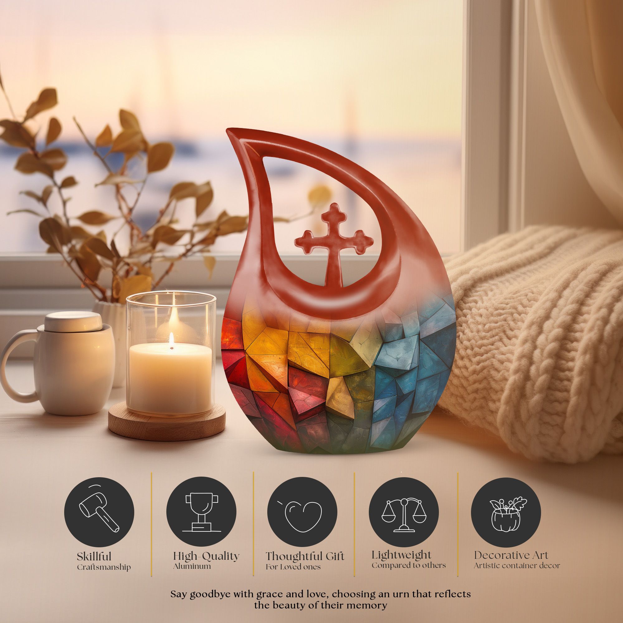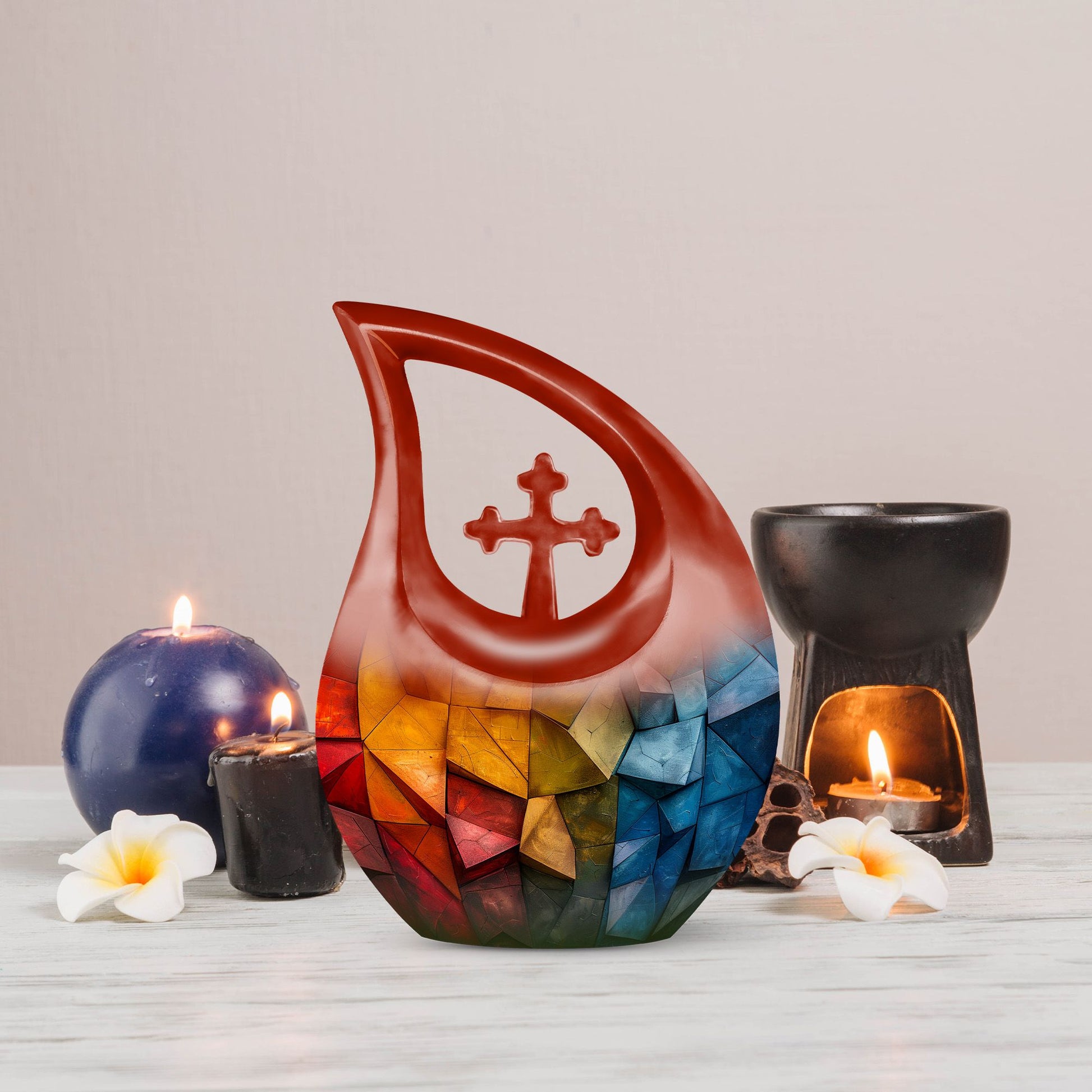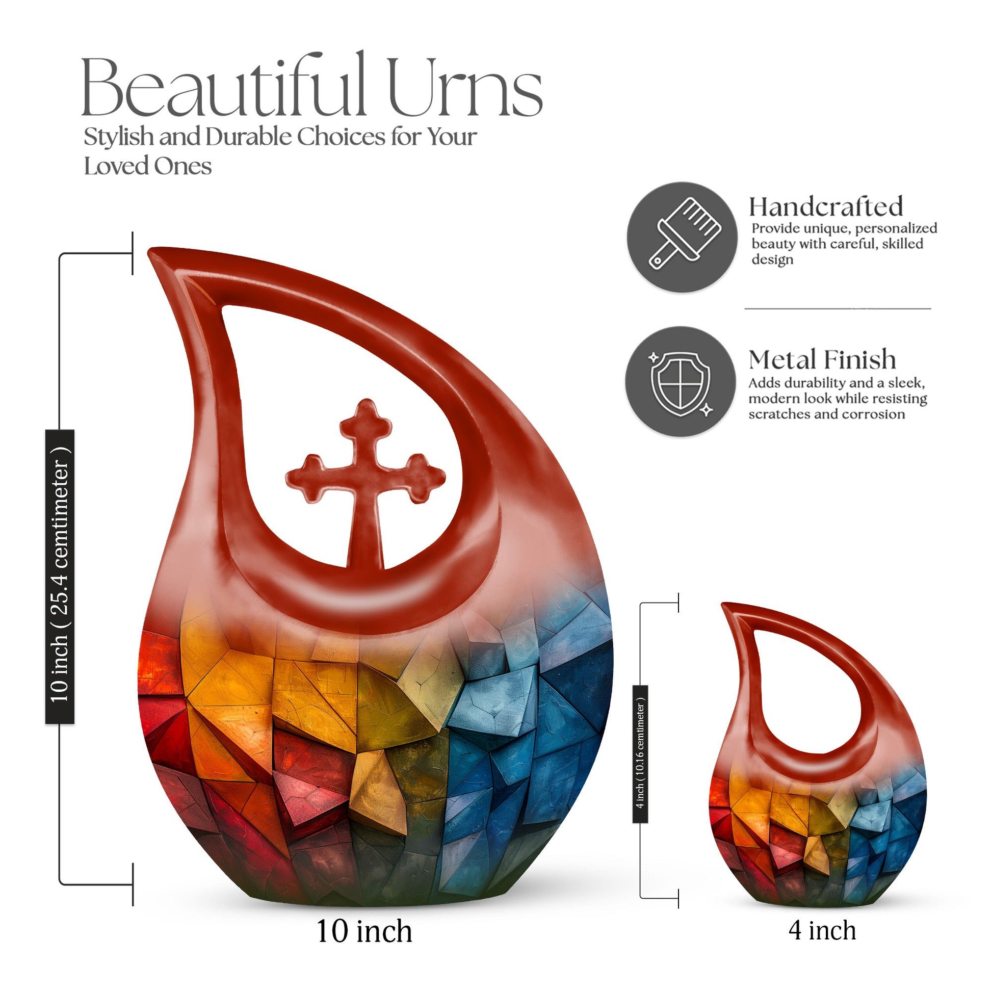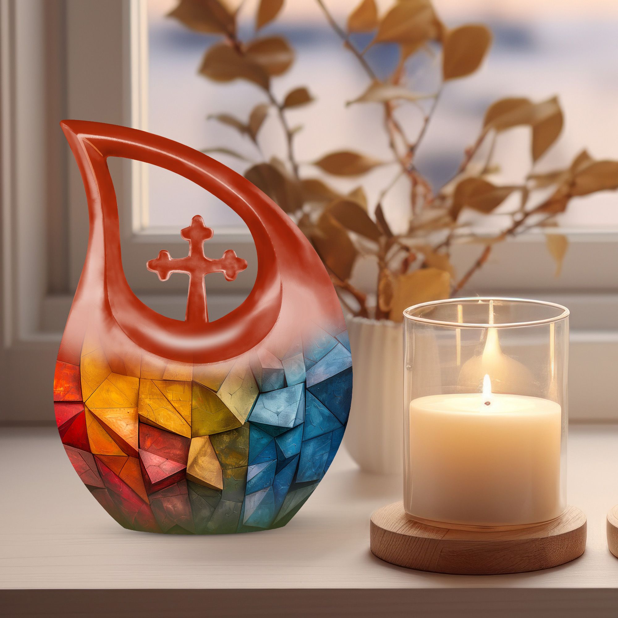 Honor the memory of your beloved mother with our striking Geometric Temperature Gradient Urn, thoughtfully crafted in a resplendent Cross Drop design. At an elevated size of 10 inches and weighing a balance 3.3 pounds, the reverence of our urn is unmistakable. Fabricated from durable Aluminium, the urn exhibits a blending of strength and elegance. With a generous capacity of 200 cubic inches, it gracefully accommodates the cremation remains, ensuring a worthy resting place. The urn is further enhanced with the opportunity for customization, allowing for engraved names to impart a personal touch. Rounding out our offering is a luxurious velvet pouch for containment of ashes, enhancing the experience of remembrance. Opt for our Large Urn and celebrate the uniqueness of your loved one's spirit. Note: Ideal for searches related to 'Cremation Remains, Cremation Urns For Sale, Urns For Human Ashes, and Simple Urns For Human Ashes'.