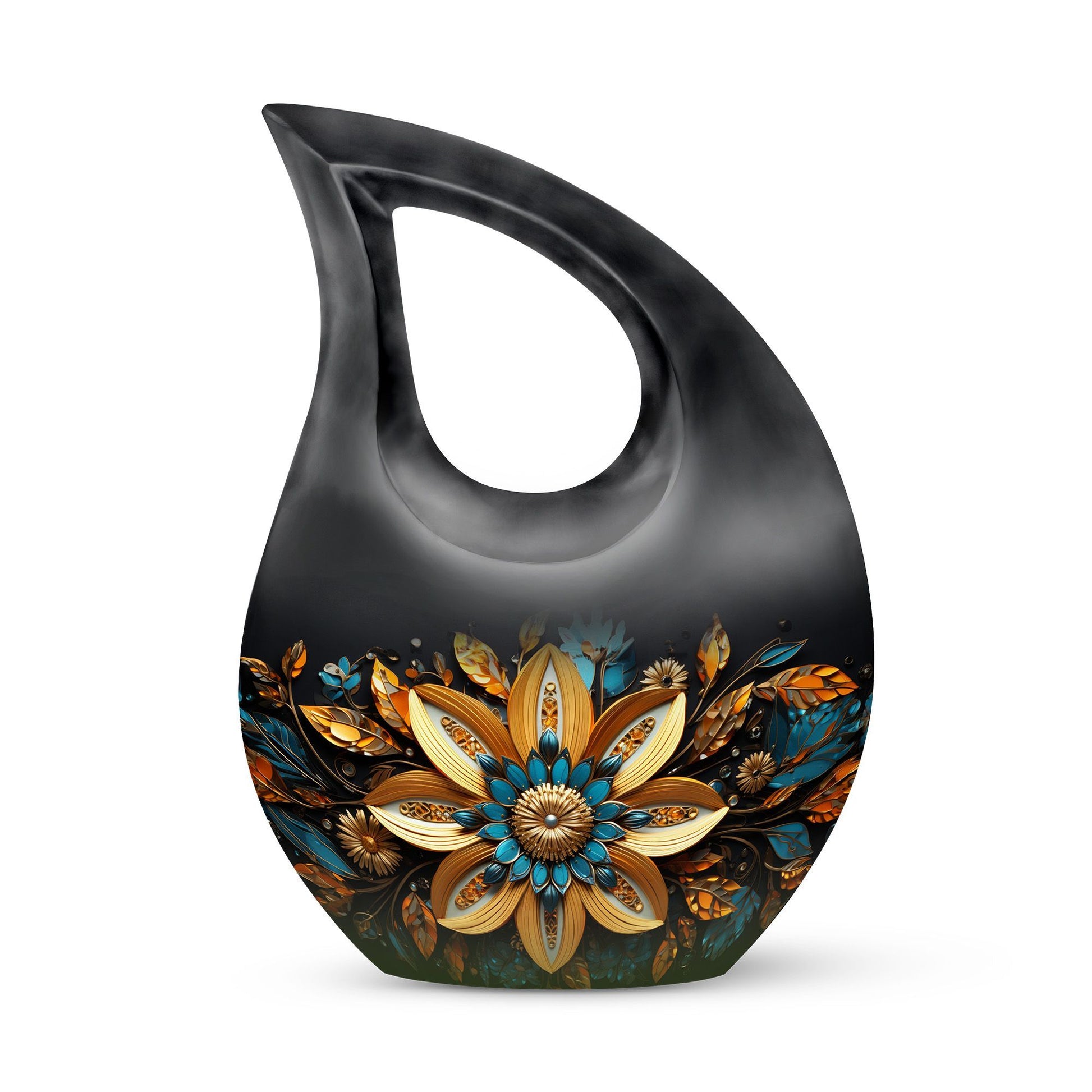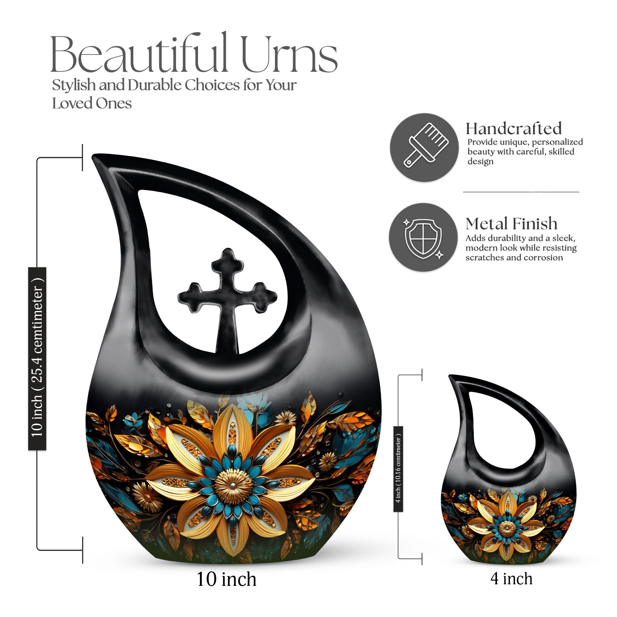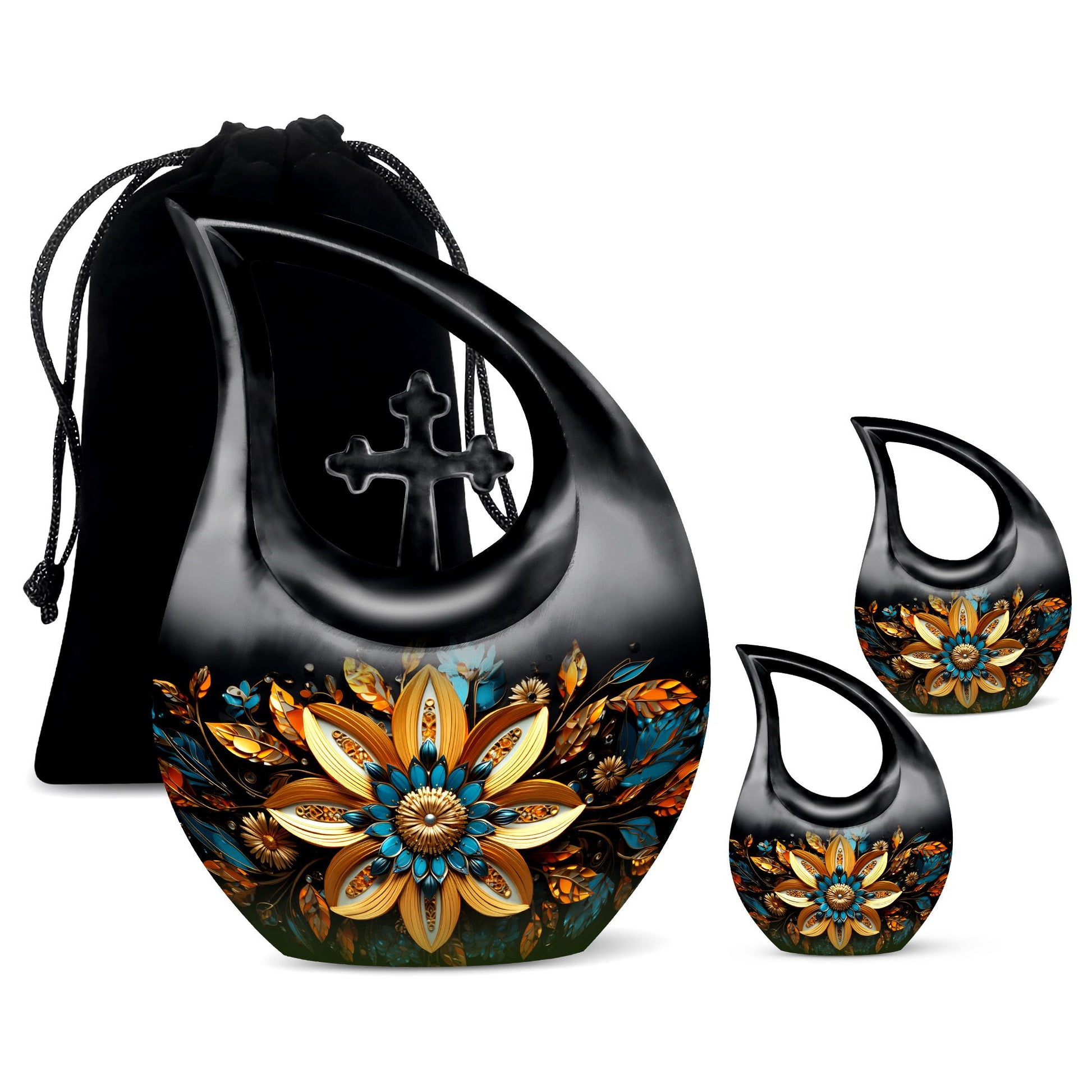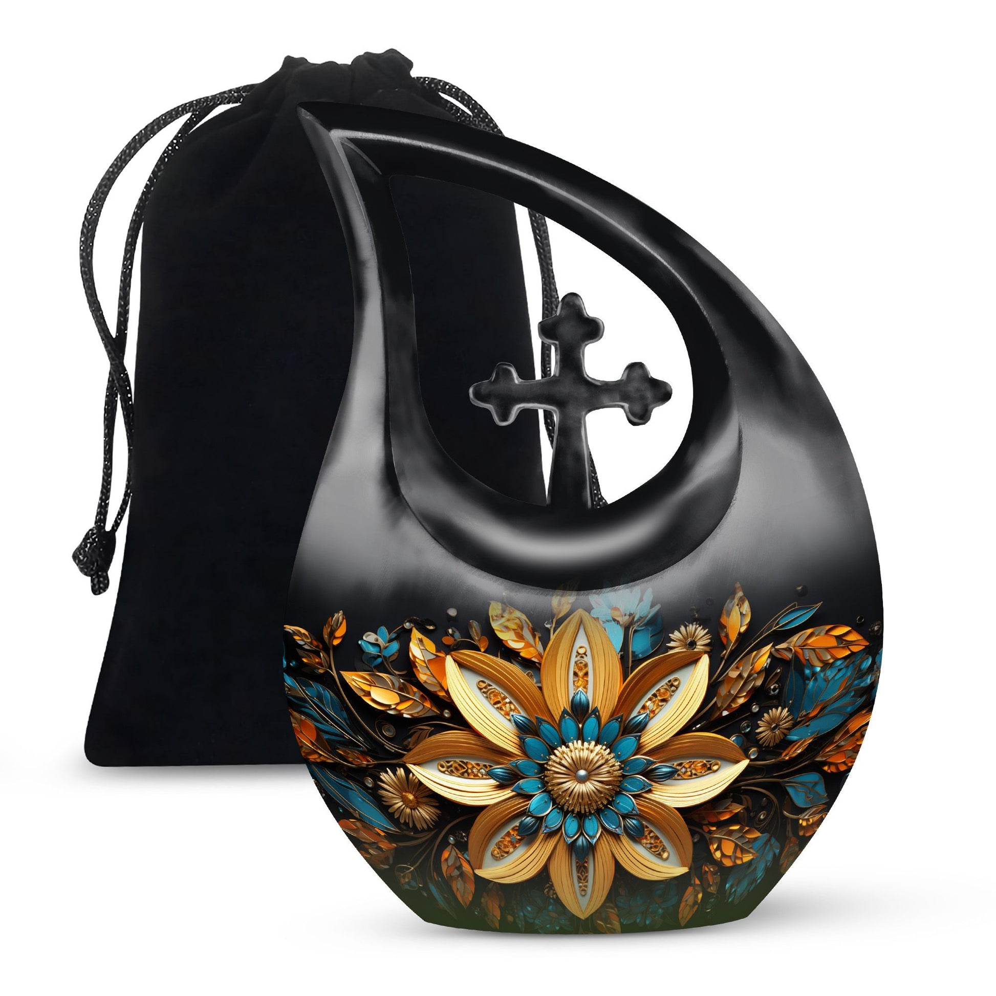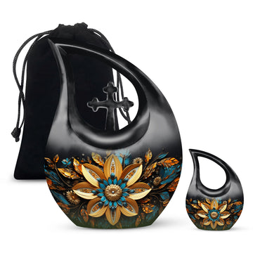 Cherish the memories of your loved ones with our elegant Gilded Petals Urn, a paramount item among large urns designed to serve as dignified full-size urns for human ashes. Measuring 10-inches in height and weighing 3.3 pounds, this aluminium memorial urn is imbued with a theme of Gilded Petals and a distinctive Cross Drop pattern, striking a perfect balance between stately reverence and heartfelt remembrance. Designed to hold up to 200 cubic inches of remains, this commodious memorial box for ashes gives you a purposeful and tangible way to honor the life of a loved one. It even comes with a velvet pouch for secure containment of ashes. Add a personal touch by engraving names on the urn, a tribute that echoes through time. Shop for this item if you're seeking things to put ashes in, or if you're looking for unusual urns or commemorative cremation urns. Let the Gilded Petals Urn embalm your treasured memories while serving as a timeless emblem of passed loved ones.