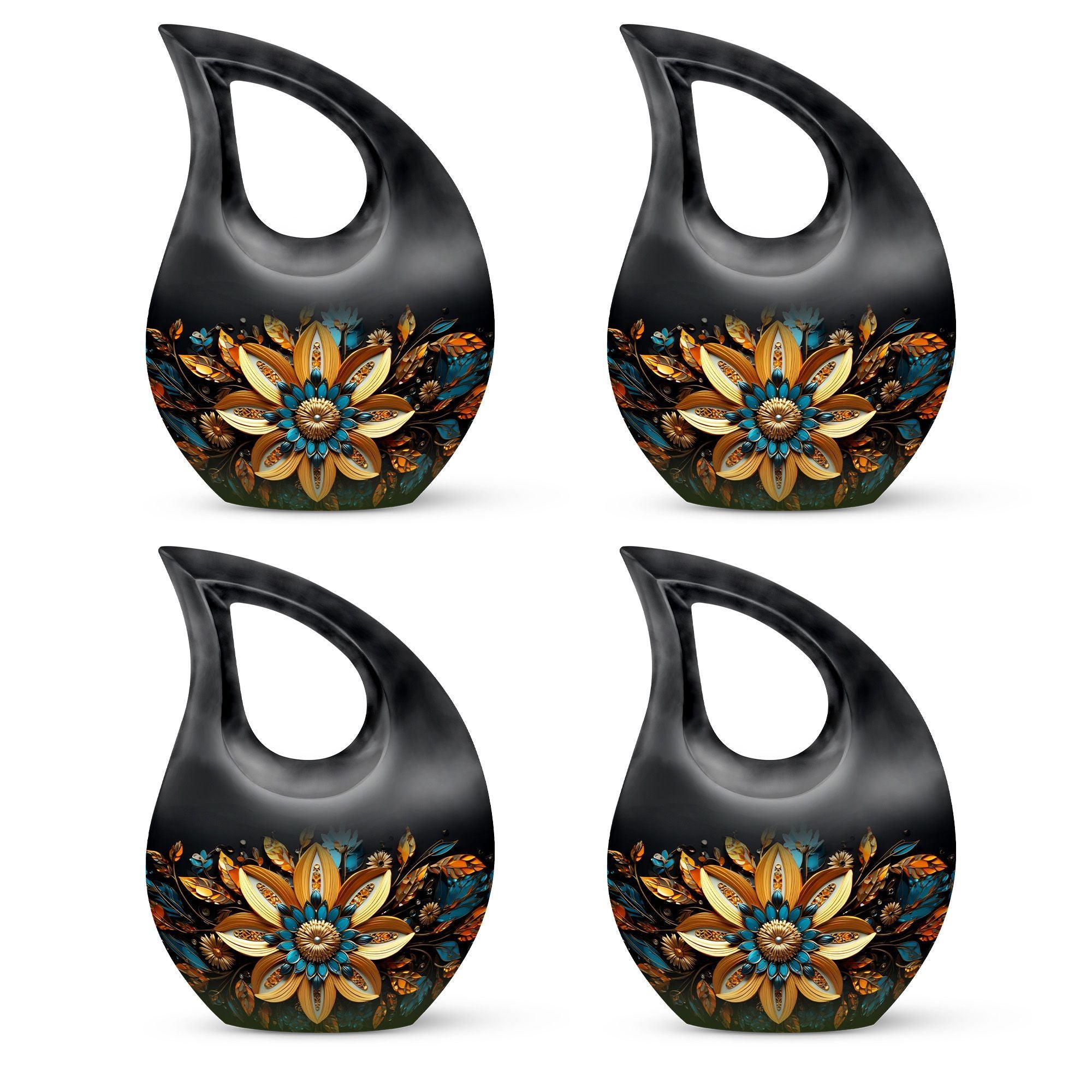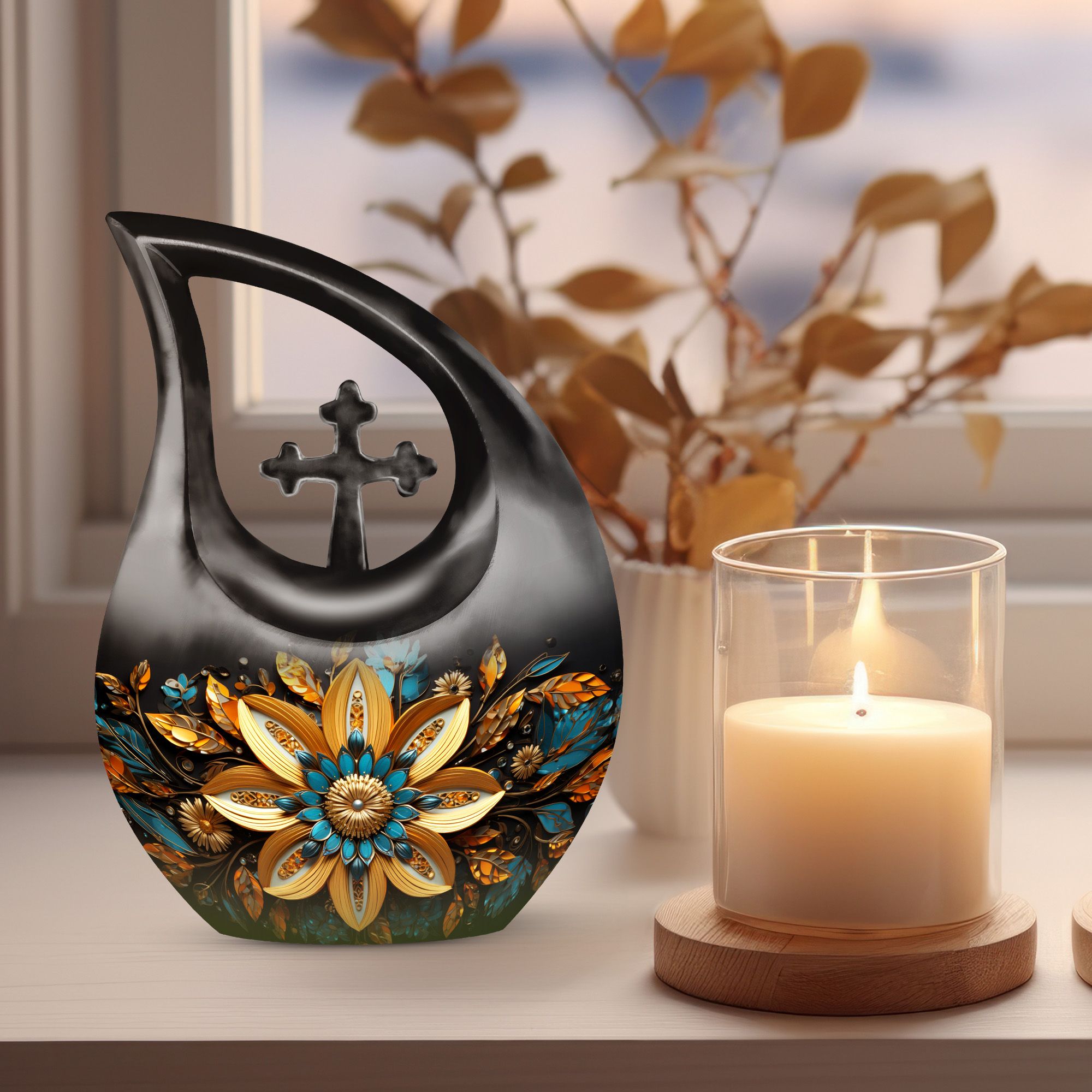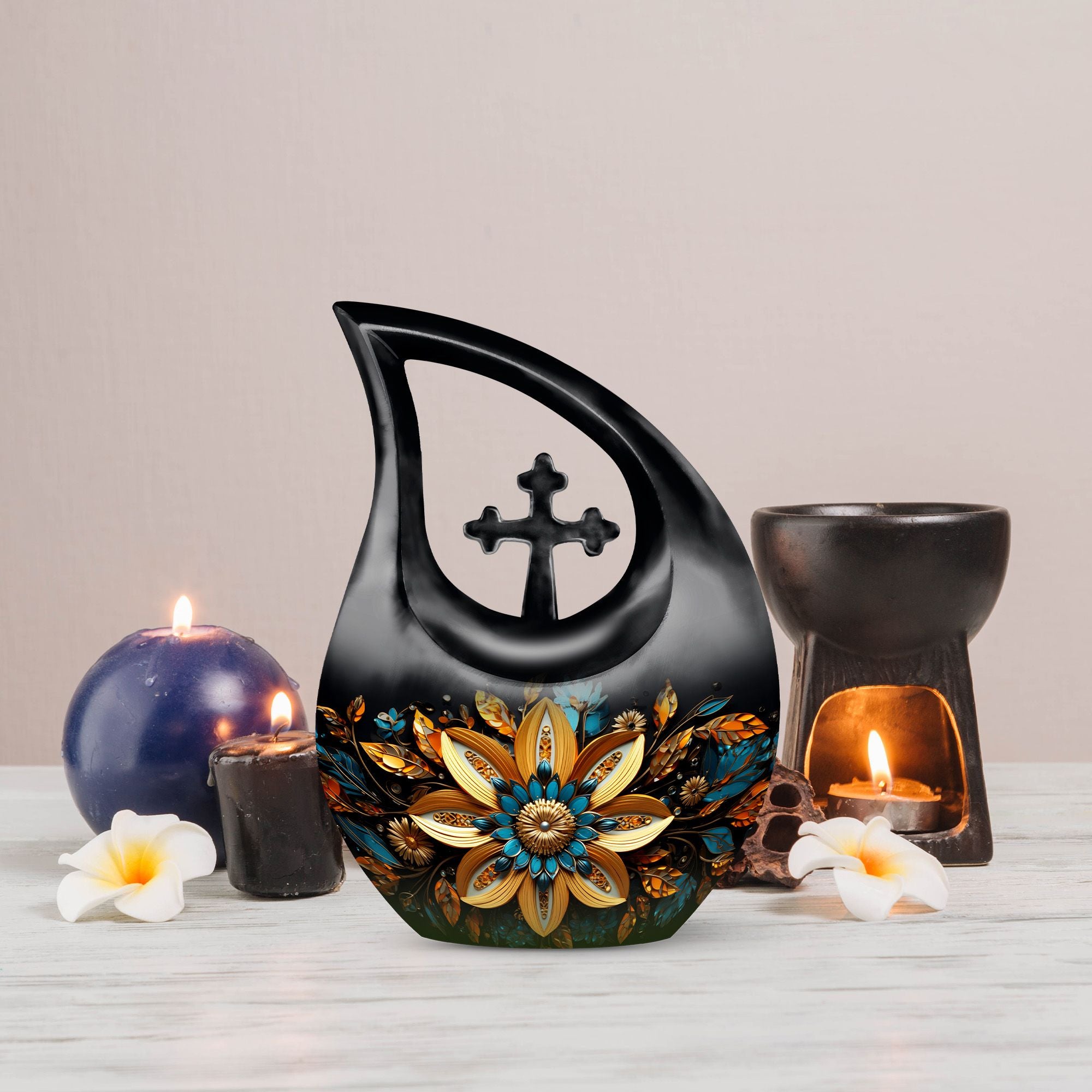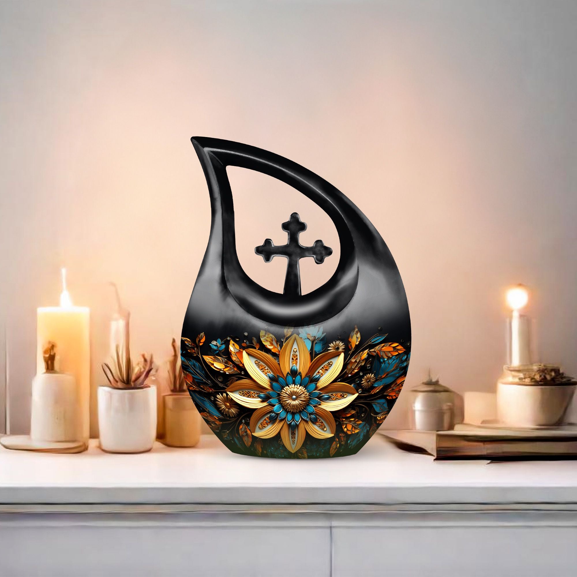 Cherish the memories of your loved ones with our elegant Gilded Petals Urn, a paramount item among large urns designed to serve as dignified full-size urns for human ashes. Measuring 10-inches in height and weighing 3.3 pounds, this aluminium memorial urn is imbued with a theme of Gilded Petals and a distinctive Cross Drop pattern, striking a perfect balance between stately reverence and heartfelt remembrance. Designed to hold up to 200 cubic inches of remains, this commodious memorial box for ashes gives you a purposeful and tangible way to honor the life of a loved one. It even comes with a velvet pouch for secure containment of ashes. Add a personal touch by engraving names on the urn, a tribute that echoes through time. Shop for this item if you're seeking things to put ashes in, or if you're looking for unusual urns or commemorative cremation urns. Let the Gilded Petals Urn embalm your treasured memories while serving as a timeless emblem of passed loved ones.