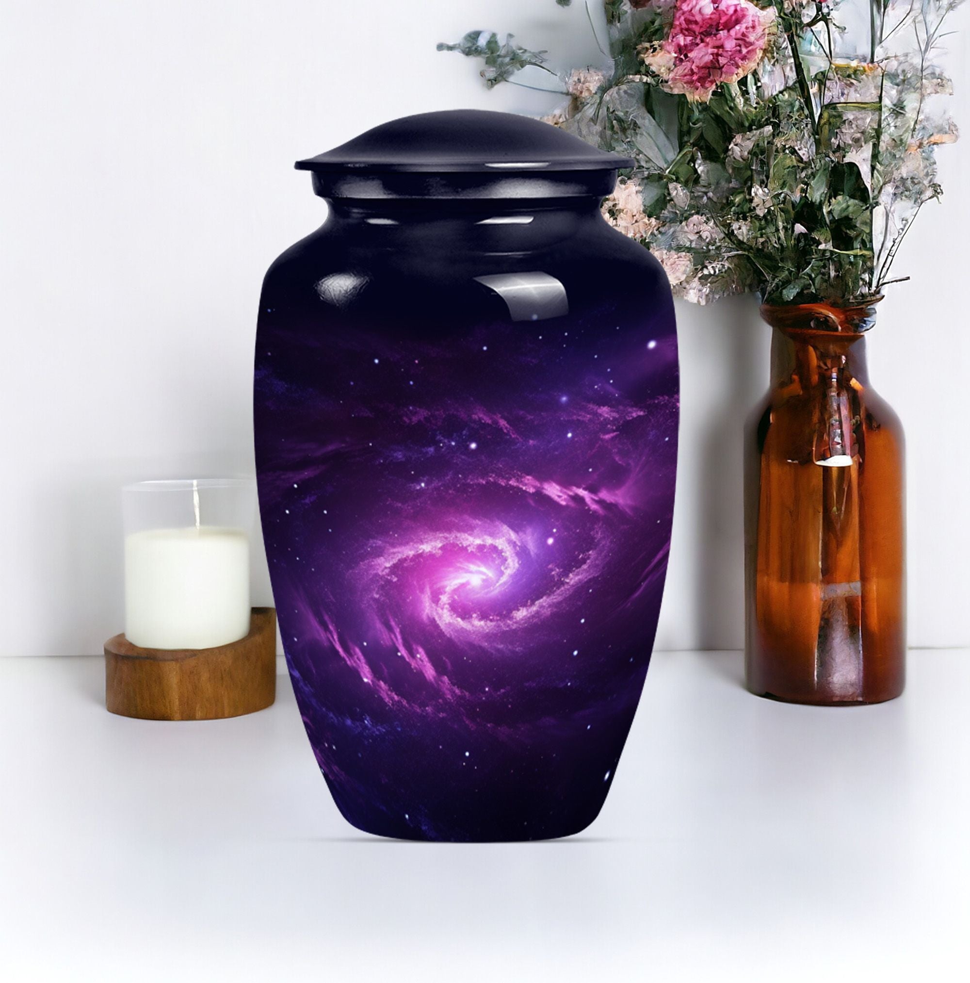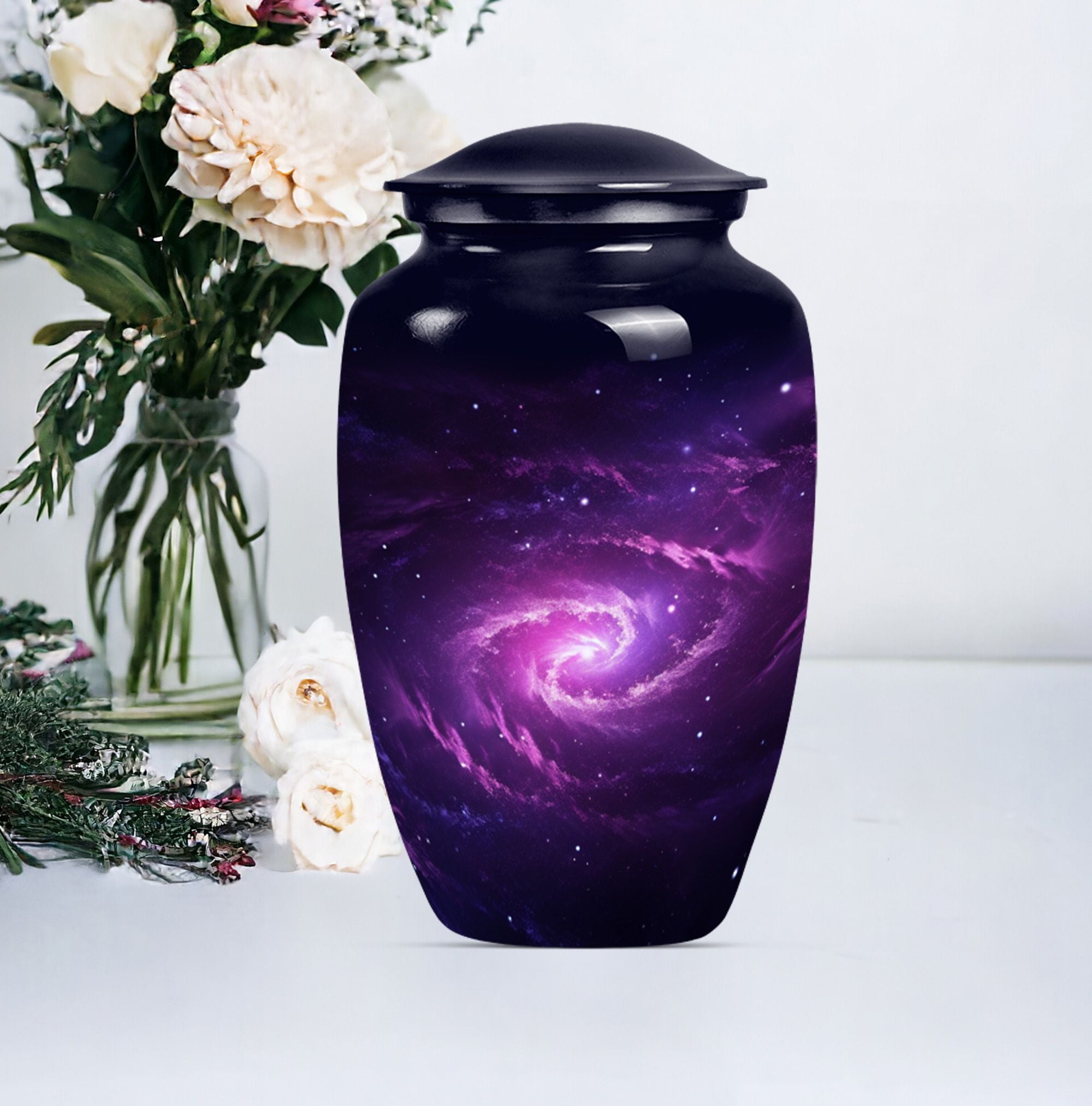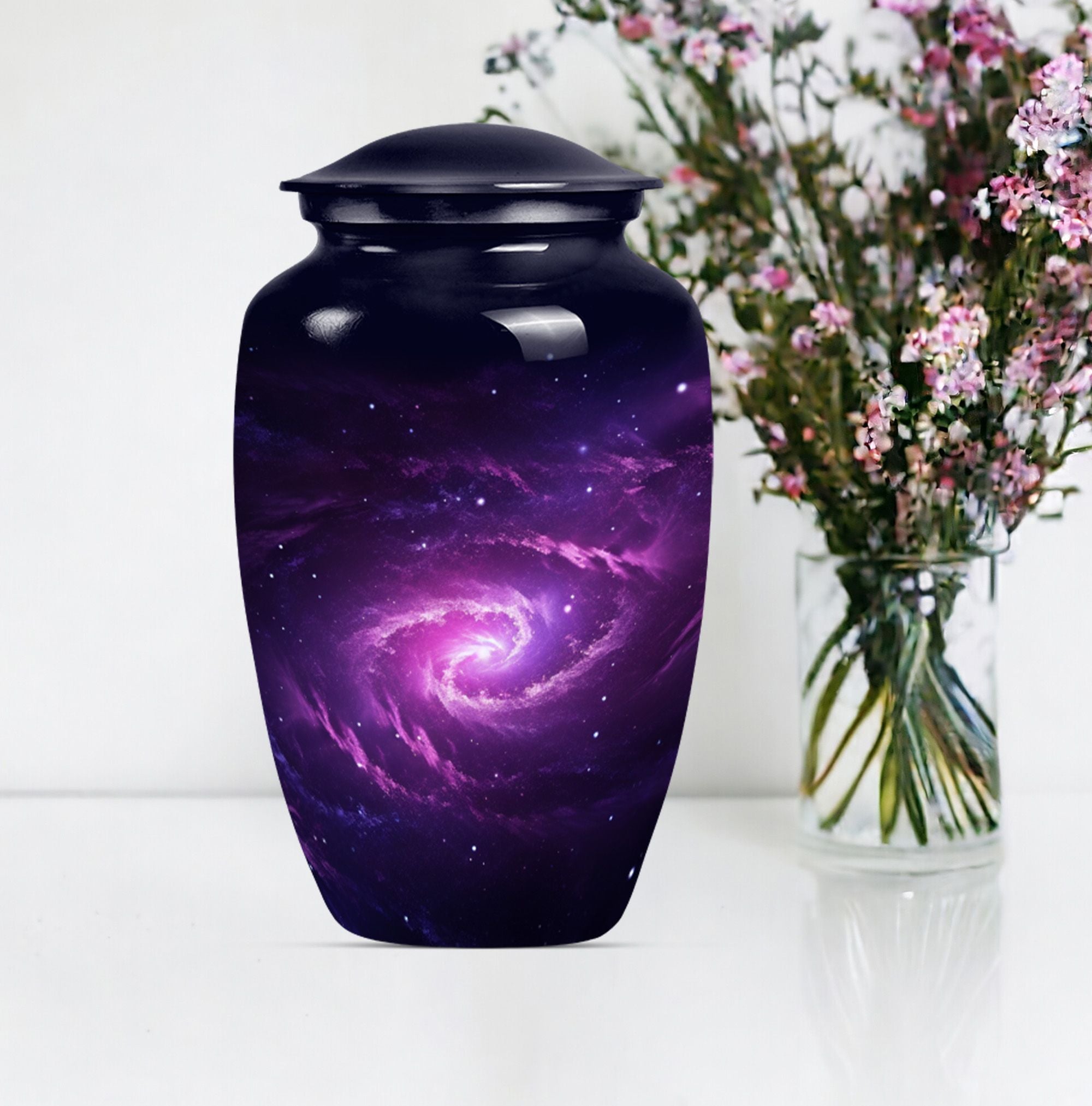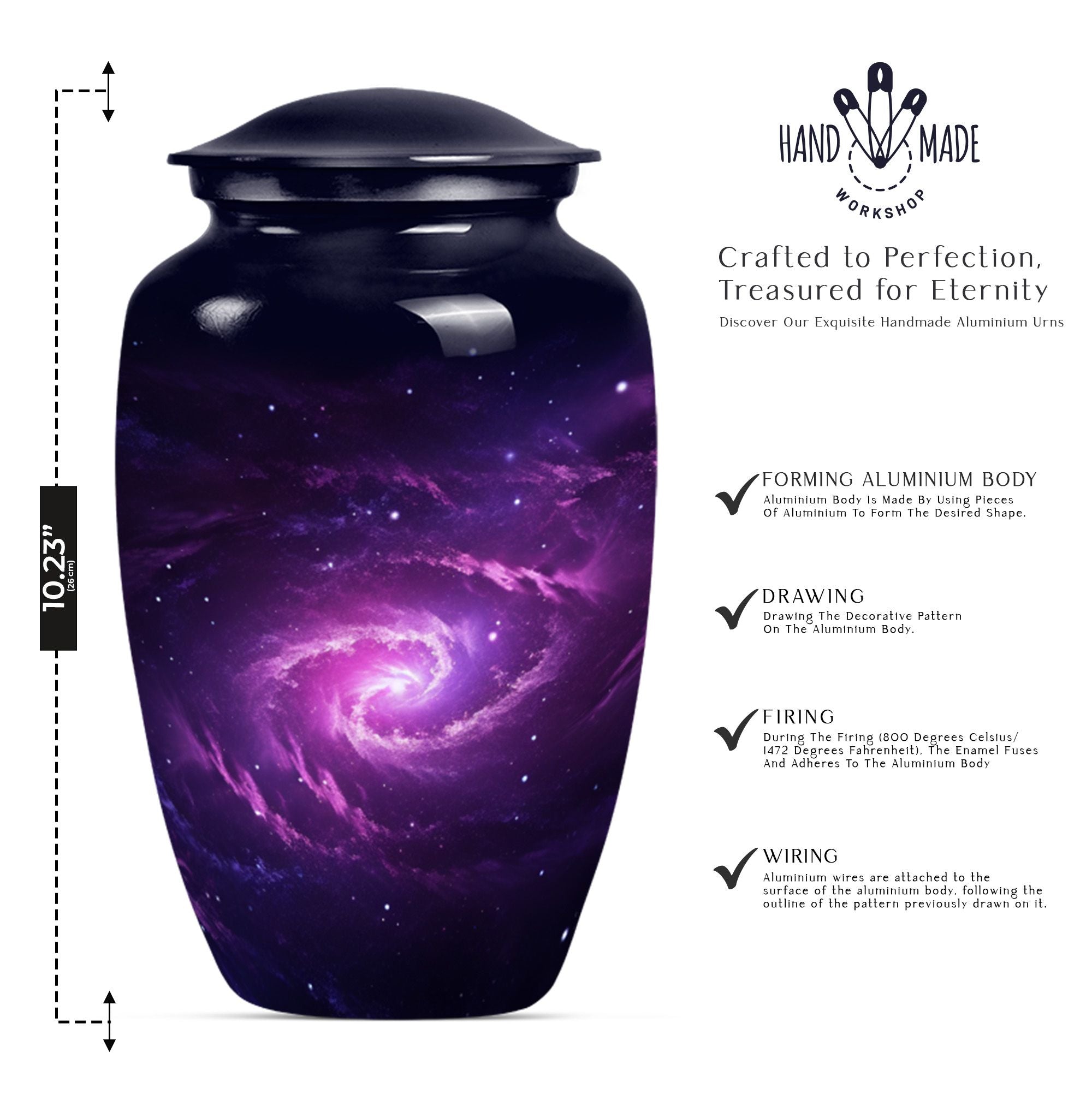 Discover peace and comfort with our Purple Meadow glaaxy Urn, a large-size cremation urn masterfully crafted from high-quality aluminium. This robust urn, standing at an impressive 10 inches in height and weighing 3.3 pounds, holds the power to securely cater for up to 200 cubic inches of ashes. The appeal of this memorial ceremony supply does not stop at functionality; its aesthetic allure captures the eye with a striking 'Purple Meadow' theme. With our package, you receive a tender velvet pouch, perfectly suited for the containment of your loved one's ashes. To add a touch of personal sentimental value, we offer the chance to personalize your new 10-inch cremation urn with engraveable names. Our urn is designed for purpose and longevity, ideal for human ash cremation or burial needs. Please note, this product does not include a 'classic urn' design. As an adult-size piece, it is perfect for both male and female ashes, catering to all with respect and homage.