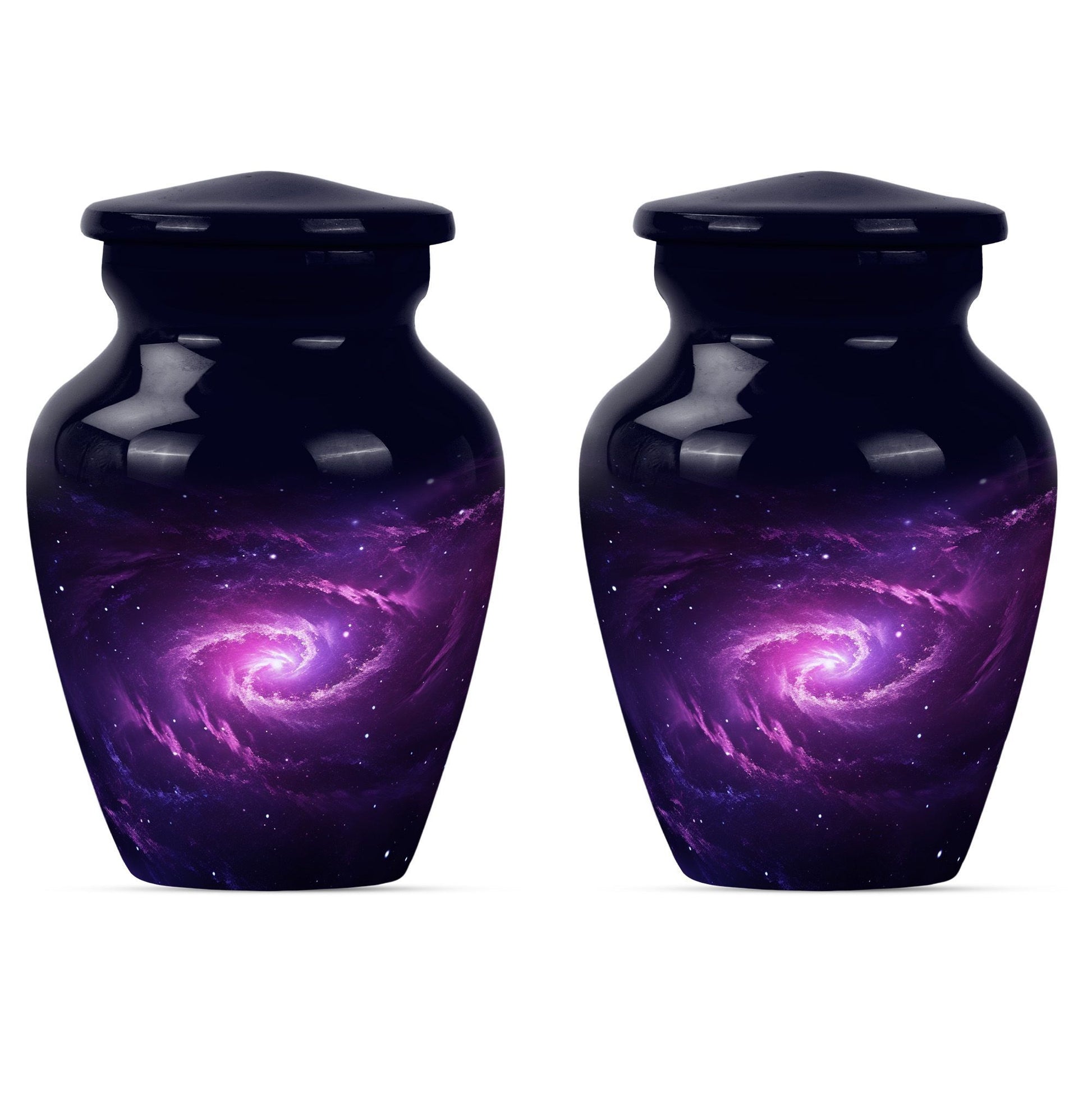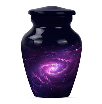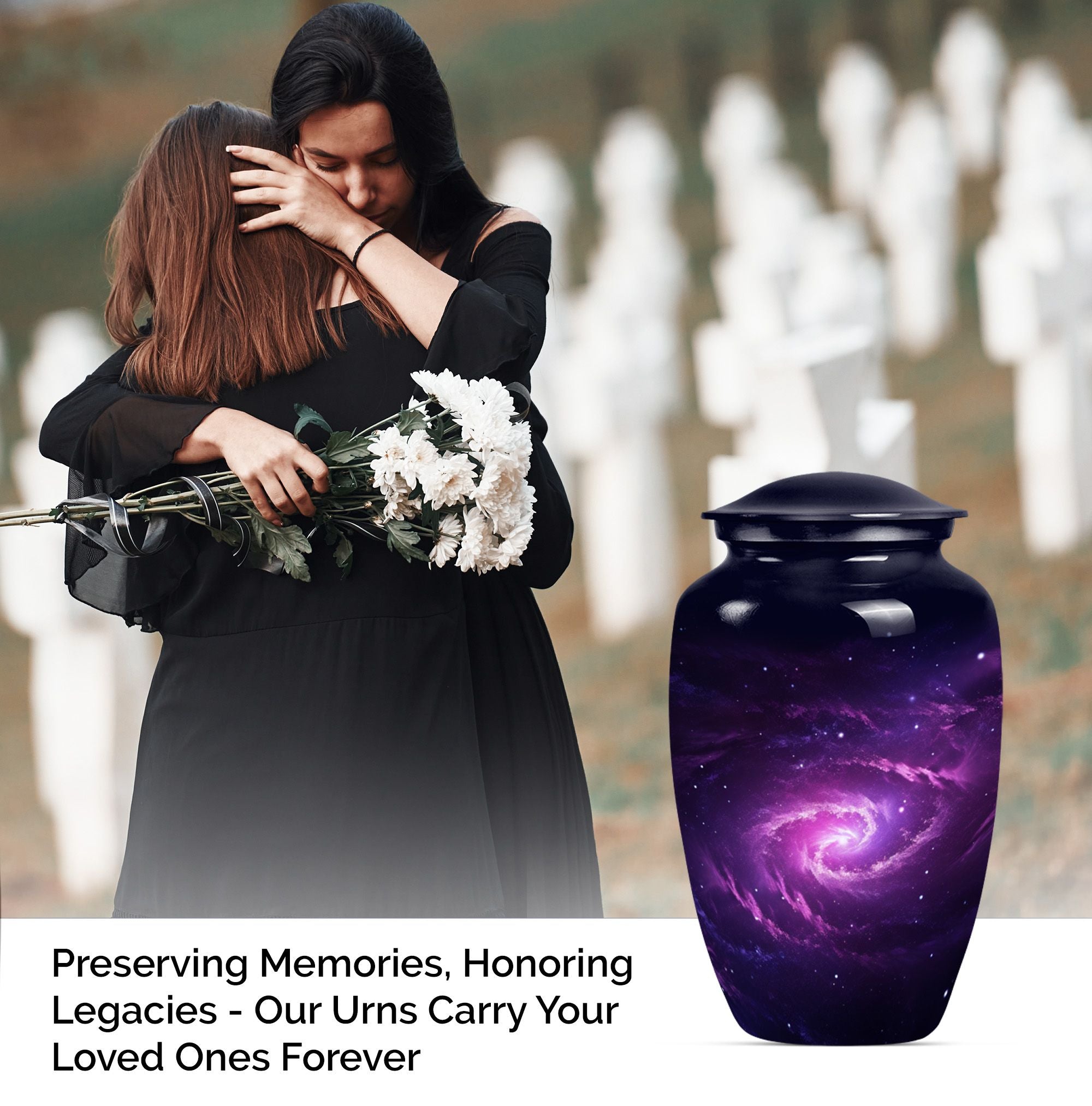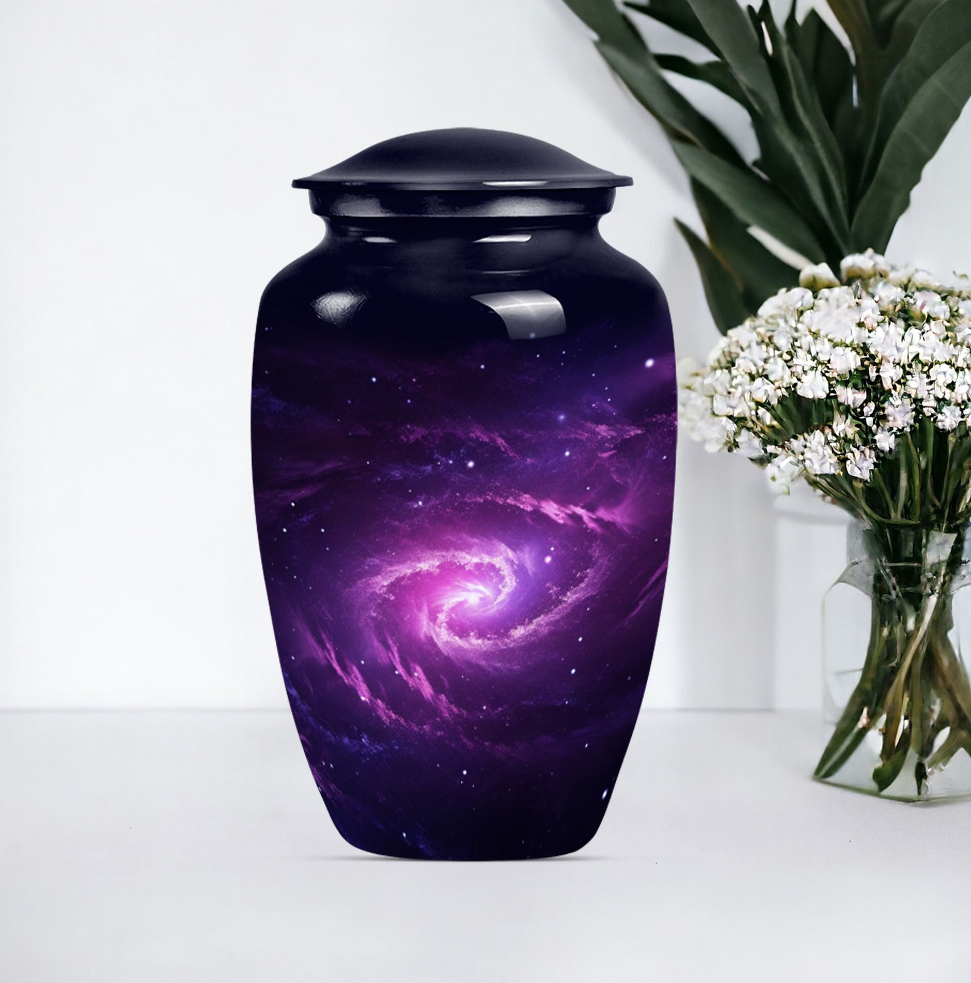 Discover peace and comfort with our Purple Meadow glaaxy Urn, a large-size cremation urn masterfully crafted from high-quality aluminium. This robust urn, standing at an impressive 10 inches in height and weighing 3.3 pounds, holds the power to securely cater for up to 200 cubic inches of ashes. The appeal of this memorial ceremony supply does not stop at functionality; its aesthetic allure captures the eye with a striking 'Purple Meadow' theme. With our package, you receive a tender velvet pouch, perfectly suited for the containment of your loved one's ashes. To add a touch of personal sentimental value, we offer the chance to personalize your new 10-inch cremation urn with engraveable names. Our urn is designed for purpose and longevity, ideal for human ash cremation or burial needs. Please note, this product does not include a 'classic urn' design. As an adult-size piece, it is perfect for both male and female ashes, catering to all with respect and homage.