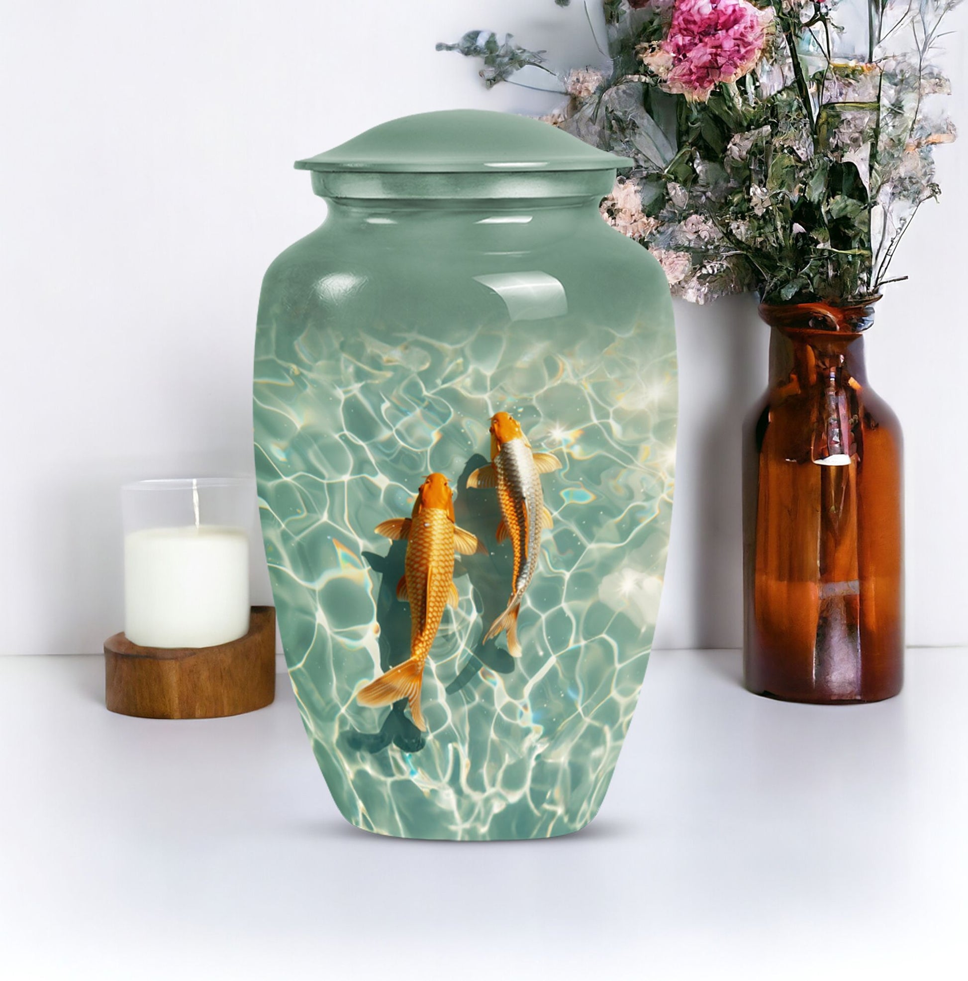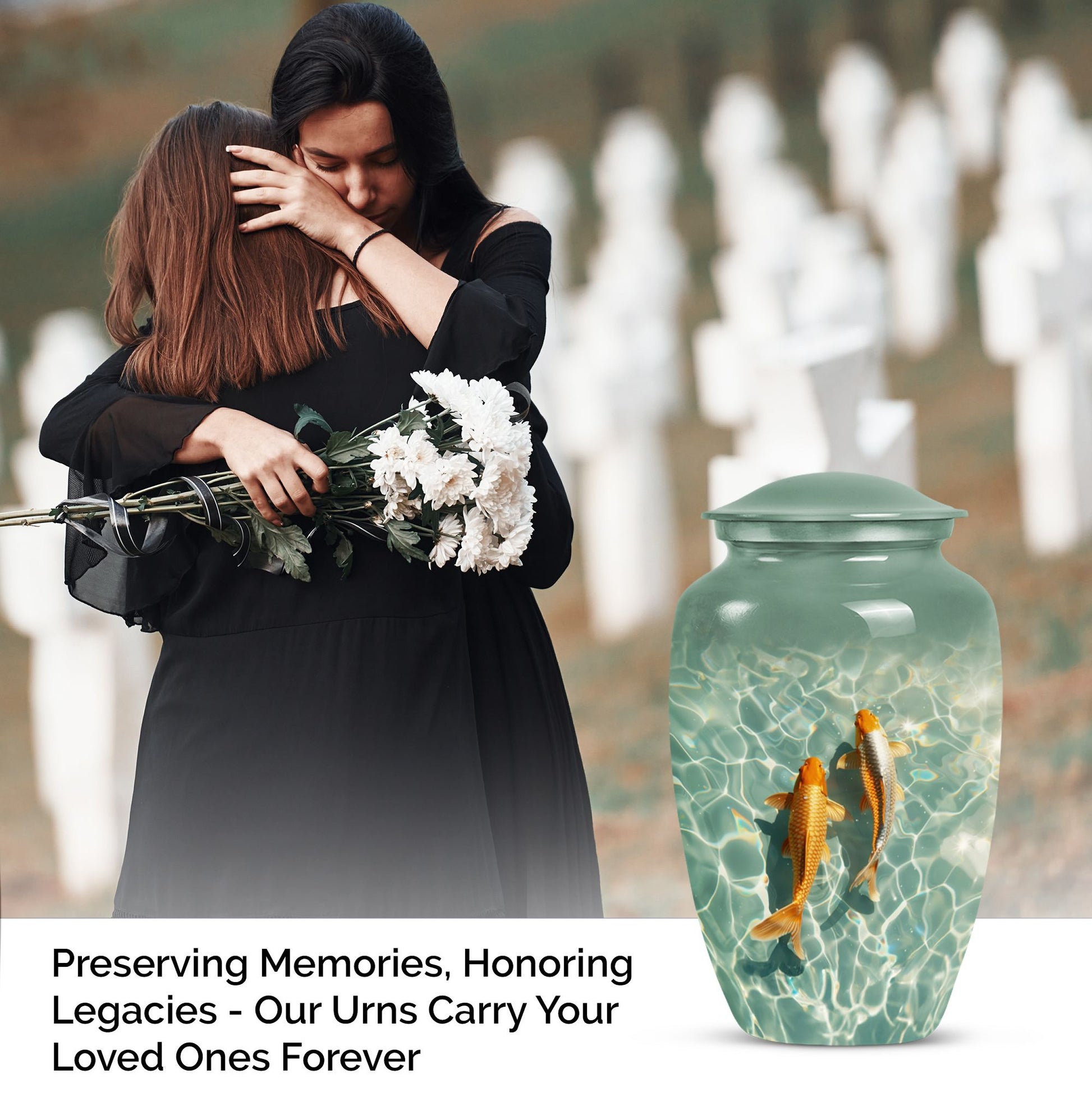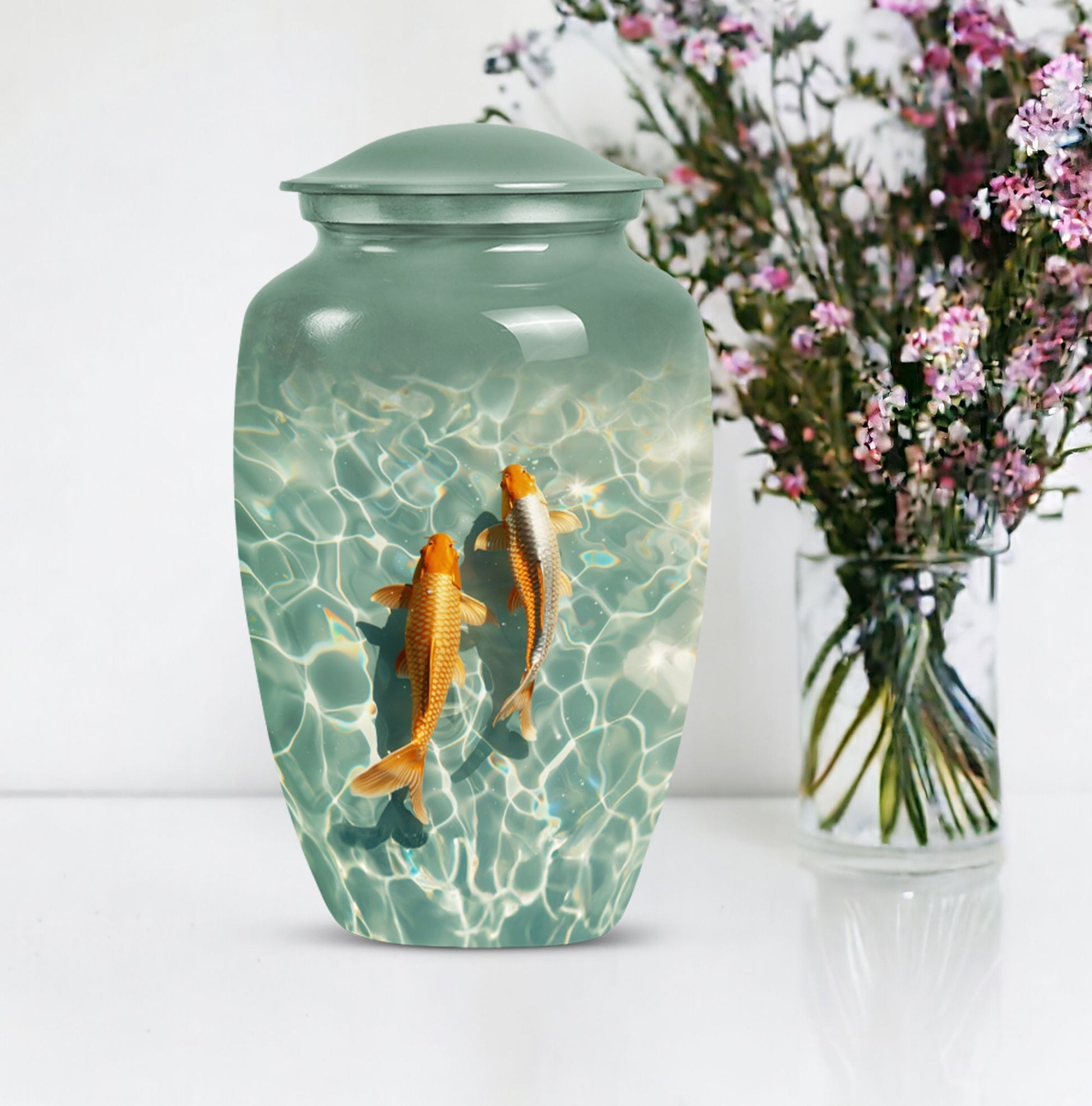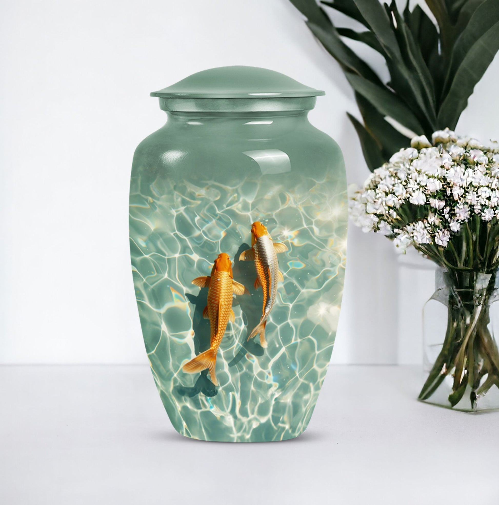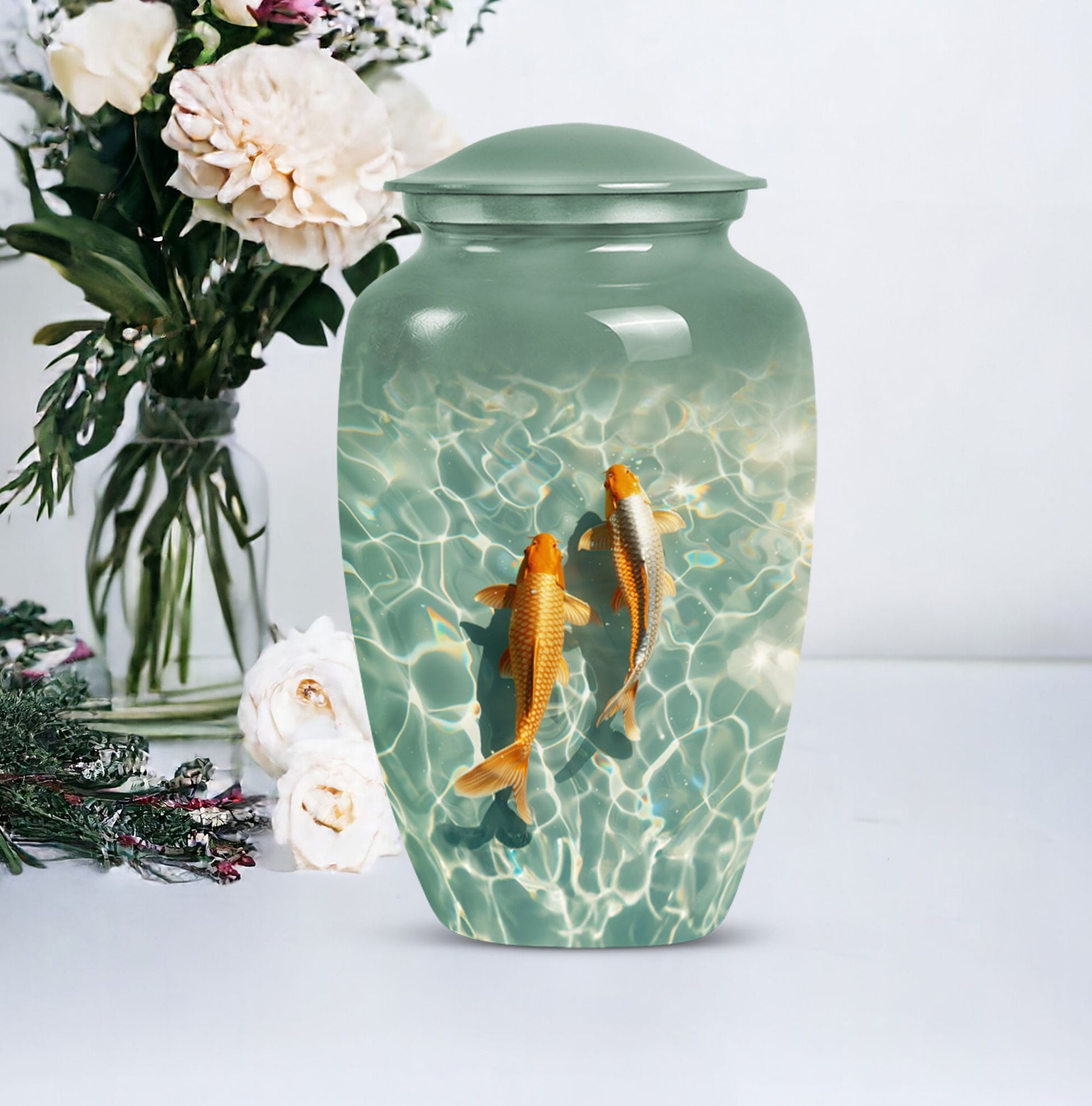 This stunning 10-inch Gold Fish Urn is an exemplar of elegance which is perfect for the memorial ceremony. Showered with an exquisite butterfly theme, this Aluminium-made urn gives an enduring tribute to your loved ones. Awe-inspiringly weighty at 3.3 pounds and a vast capacity of 200 cubic inches, it is eminently suitable for an adult male's ashes. It also comes with a velvet pouch for the respectable containment of ashes. Strikingly, it allows personalization with engraved names to make your remembrance special. Besides, it has to be noted, on the hunt for 'cremation funeral urns' or 'funeral decorative urns,' this product tops the chart. In terms of 'large urns' or 'urns for human ashes', the classic style and utility of this cremation urn make it highly sought after. If you are questing for 'cremation urns for human ashes,' this urn is indeed worth considering.
