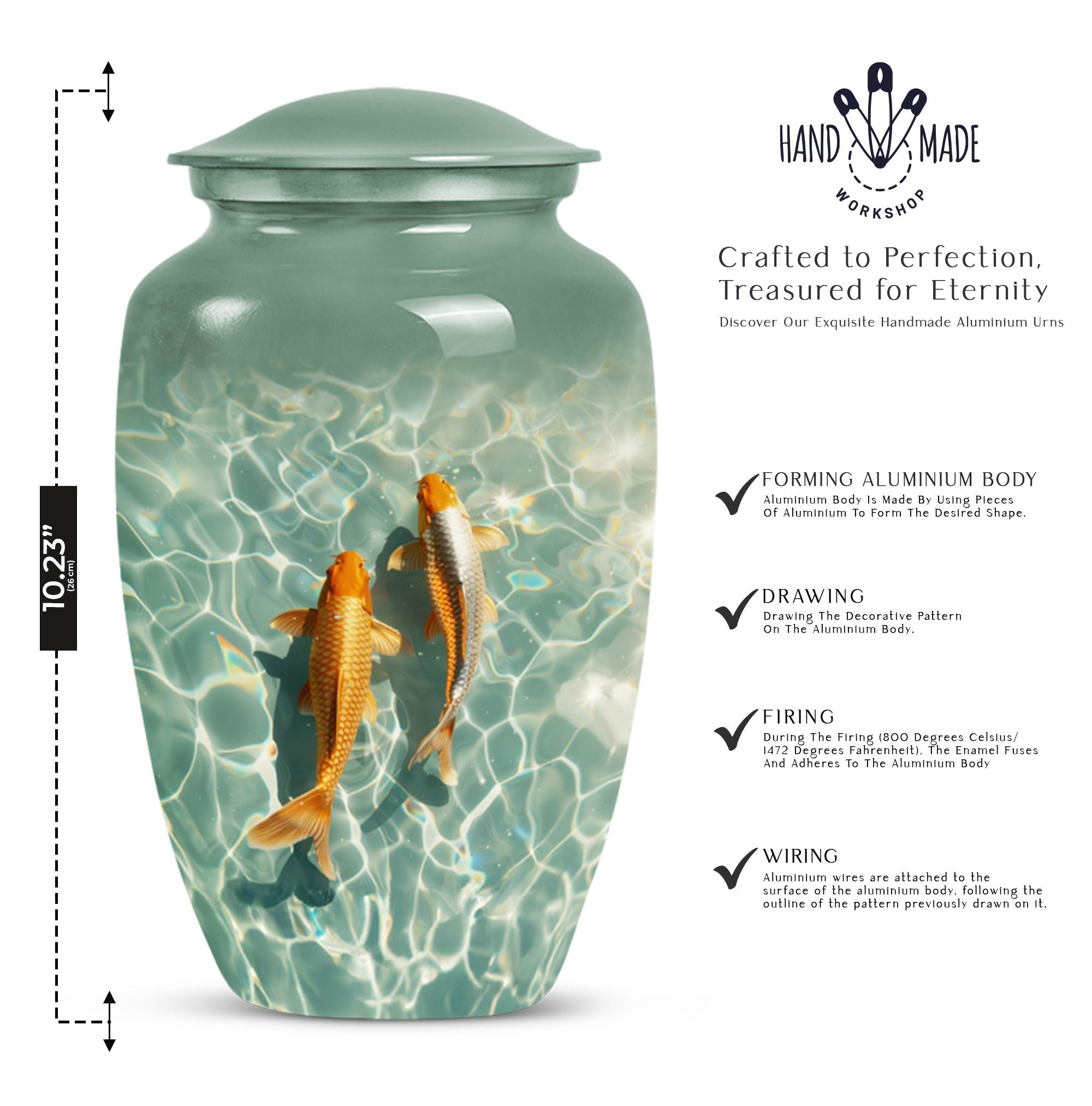 This stunning 10-inch Gold Fish Urn is an exemplar of elegance which is perfect for the memorial ceremony. Showered with an exquisite butterfly theme, this Aluminium-made urn gives an enduring tribute to your loved ones. Awe-inspiringly weighty at 3.3 pounds and a vast capacity of 200 cubic inches, it is eminently suitable for an adult male's ashes. It also comes with a velvet pouch for the respectable containment of ashes. Strikingly, it allows personalization with engraved names to make your remembrance special. Besides, it has to be noted, on the hunt for 'cremation funeral urns' or 'funeral decorative urns,' this product tops the chart. In terms of 'large urns' or 'urns for human ashes', the classic style and utility of this cremation urn make it highly sought after. If you are questing for 'cremation urns for human ashes,' this urn is indeed worth considering.