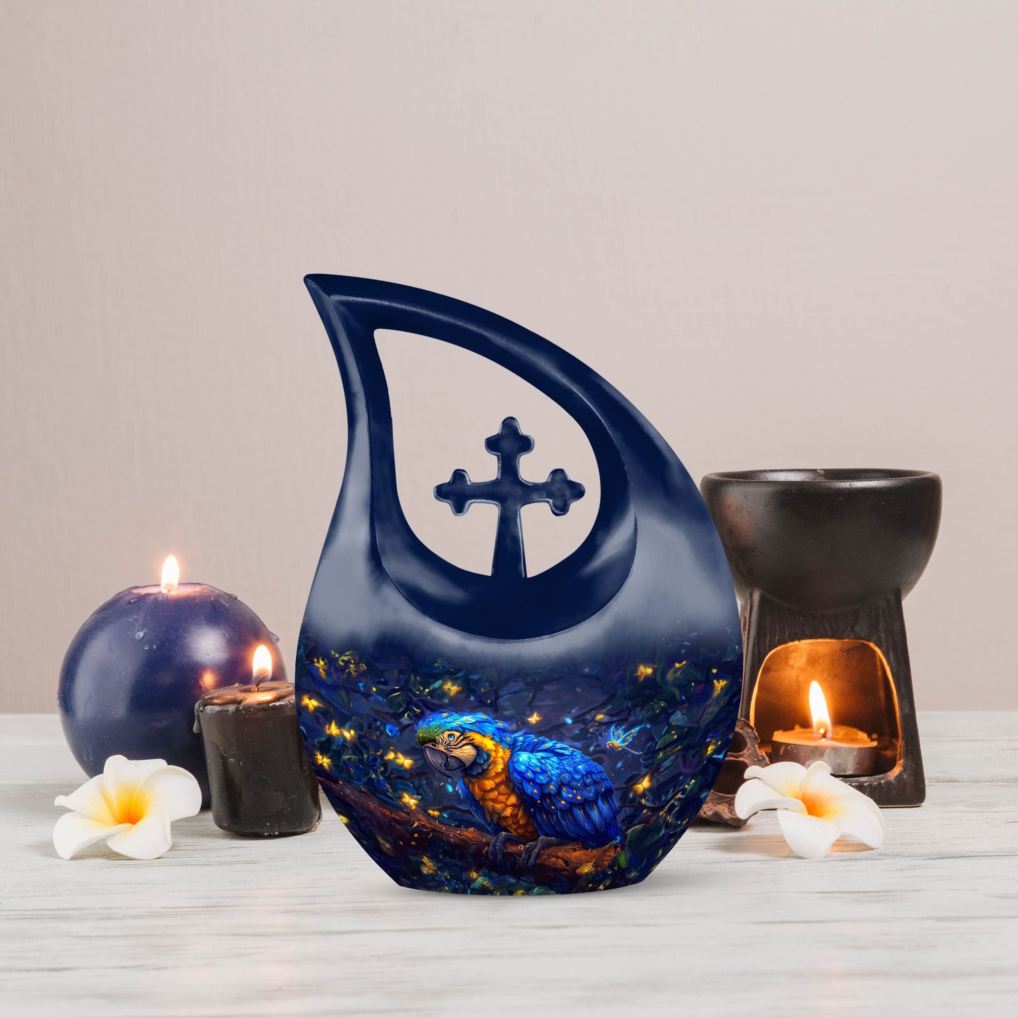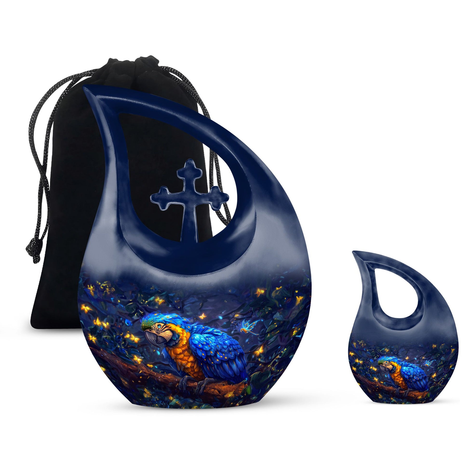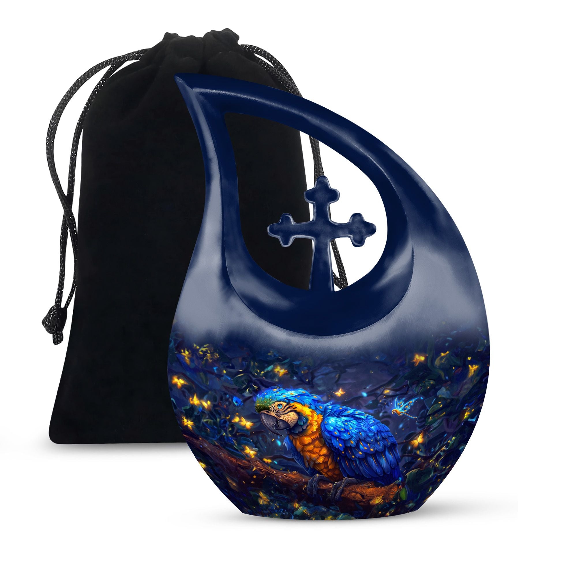 Invoke tranquility during times of sorrow with the 'Mystic Feather Glow Urn'. Hailed as one of the most meaningful memorial urns, its divine cross drop detailing offers a sense of spiritual solace. Sized at 10 inches, this urn provides ample space for containment, with a capacity of 200 cubic inches, ideal for keeping revered human ashes secure. Finely crafted from enduring aluminium, its weight of 3.3 pounds reinforces this urn's substance and durability. You can further personalize this piece with engraved names, to honor and remember your loved ones more intimately. The order includes a velvet pouch designed to hold the precious remains delicately. Though primarily a large urn for human ashes, it's also sought after as an Urn Mini and under 'urns with love'. Celebrate the lives of those departed and let their spirit gleam, just like this urn's mystic feather glow.