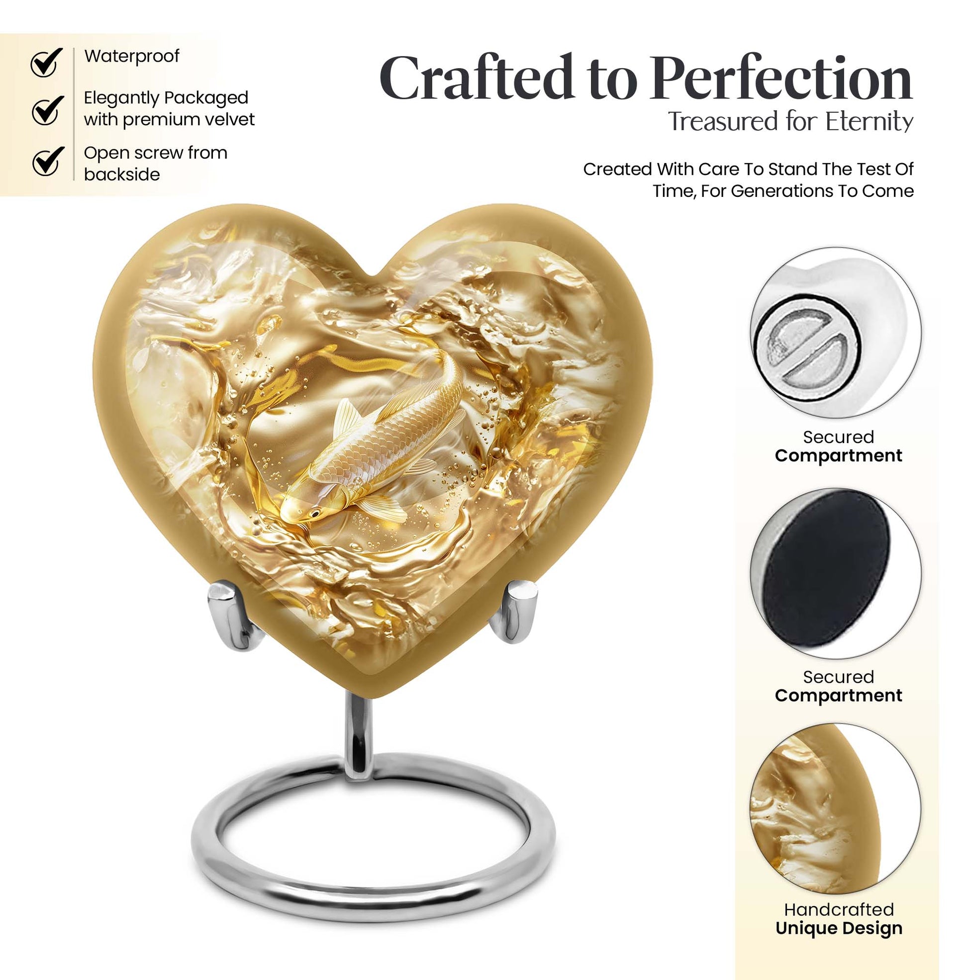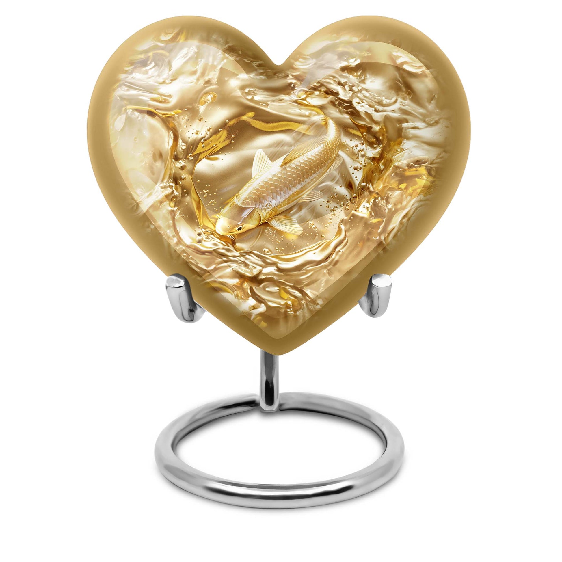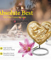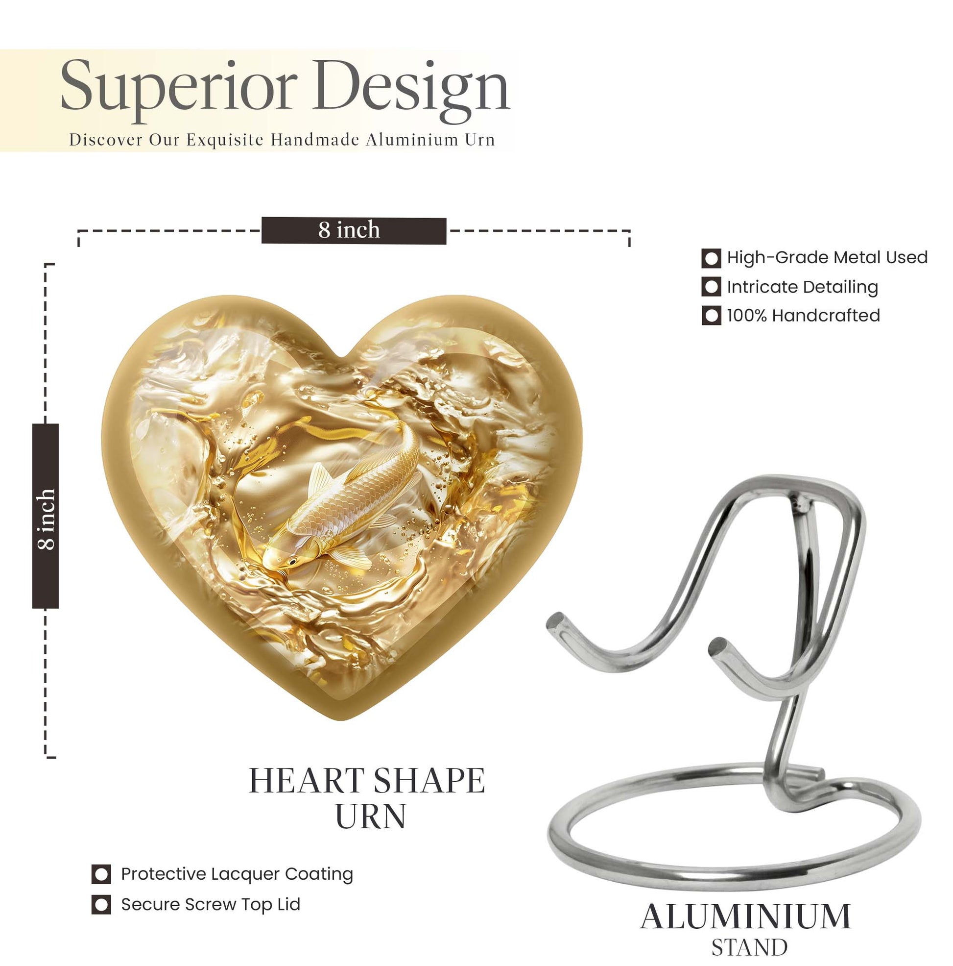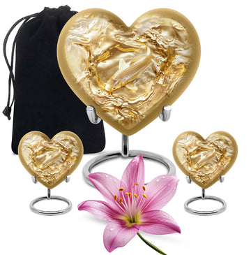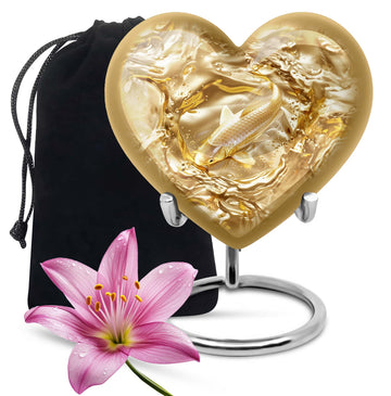 This meticulously crafted 'Gold Fish Urn' rekindles your sentiments for your departed loved ones. It comes in a heart urn themed design, with enchanting butterfly motifs to celebrate their free spirits. This 10-inch large urn, weighing 3.3 pounds, is capable of efficiently containing up to 200 cubic inches of ashes. Made from durable aluminium, this burial urn promises longevity, a dignified homage to your beloved. Each urn arrives with a specially designed velvet pouch to carefully contain the ashes. Highly customizable, it offers the unique feature of personalizing it with engraved names. Its striking allure and robust construction make it an ideal choice for memorial urns and funeral extra large urns alike. As a cremation urn for adult ashes, it appropriately commemorates both men and women, serving as a tangible memory of the departed. Shop this exquisite item to keep the sacred ashes of your humans urn ashes with dignity and love.