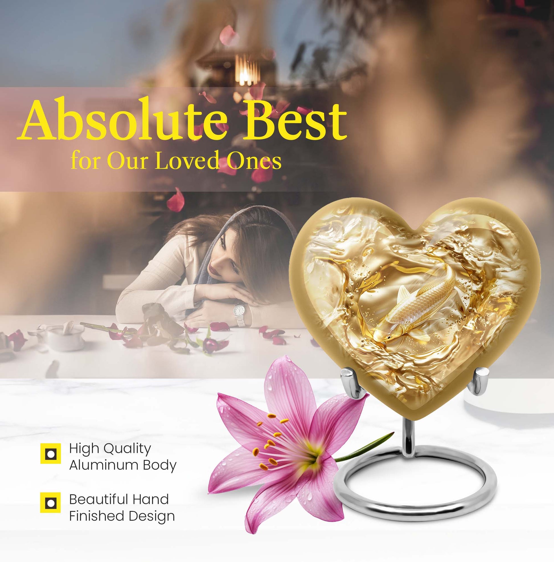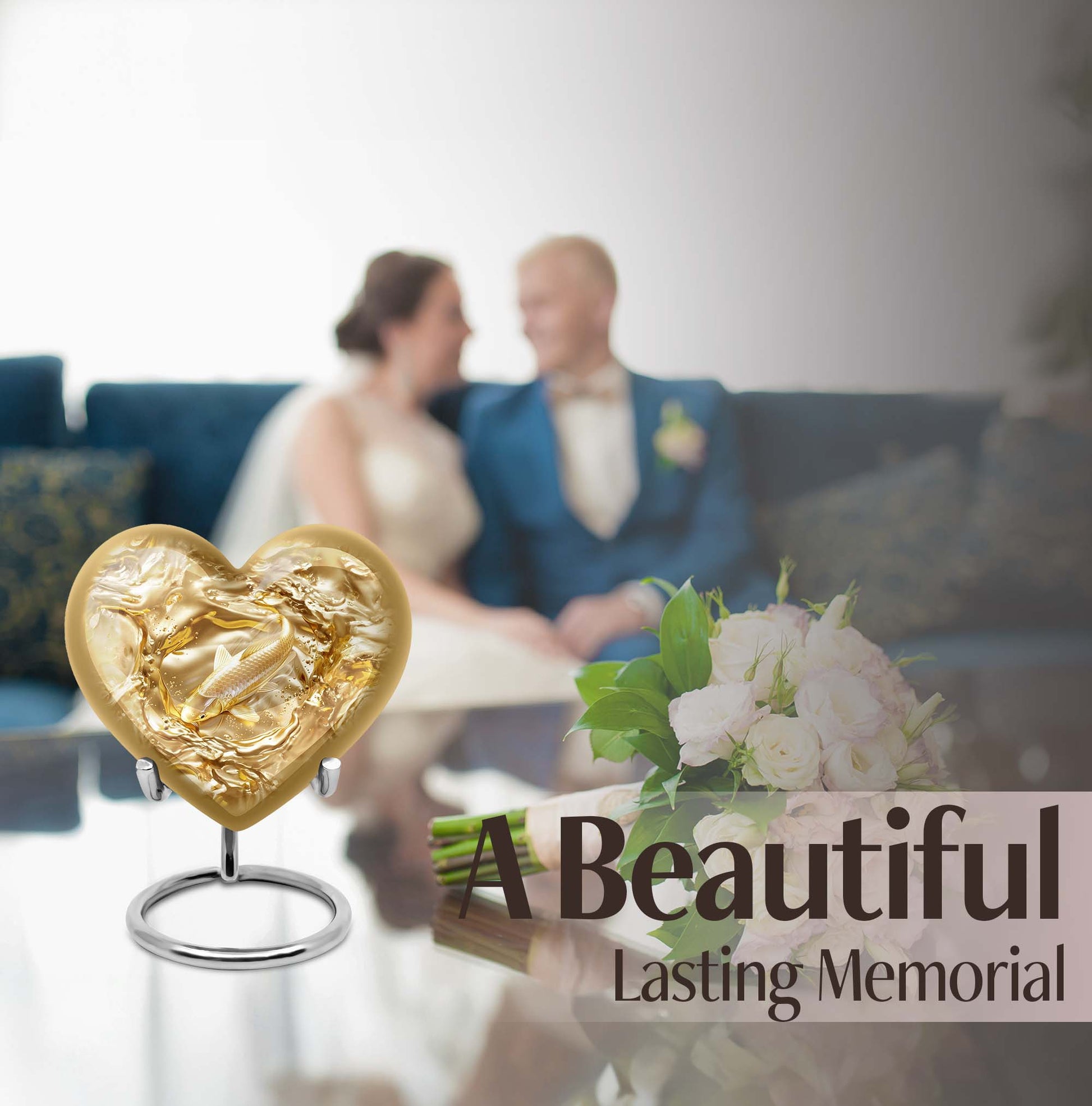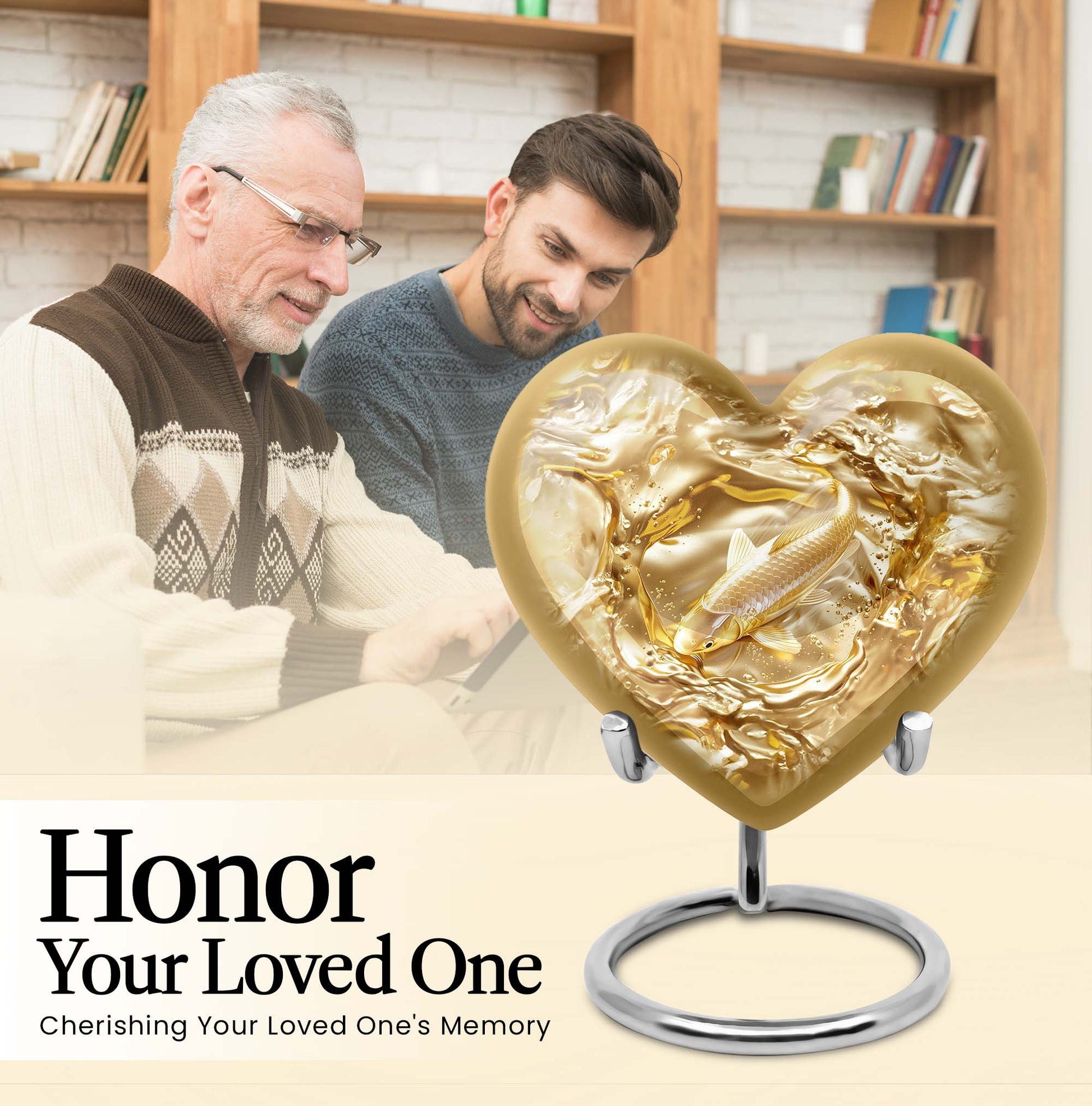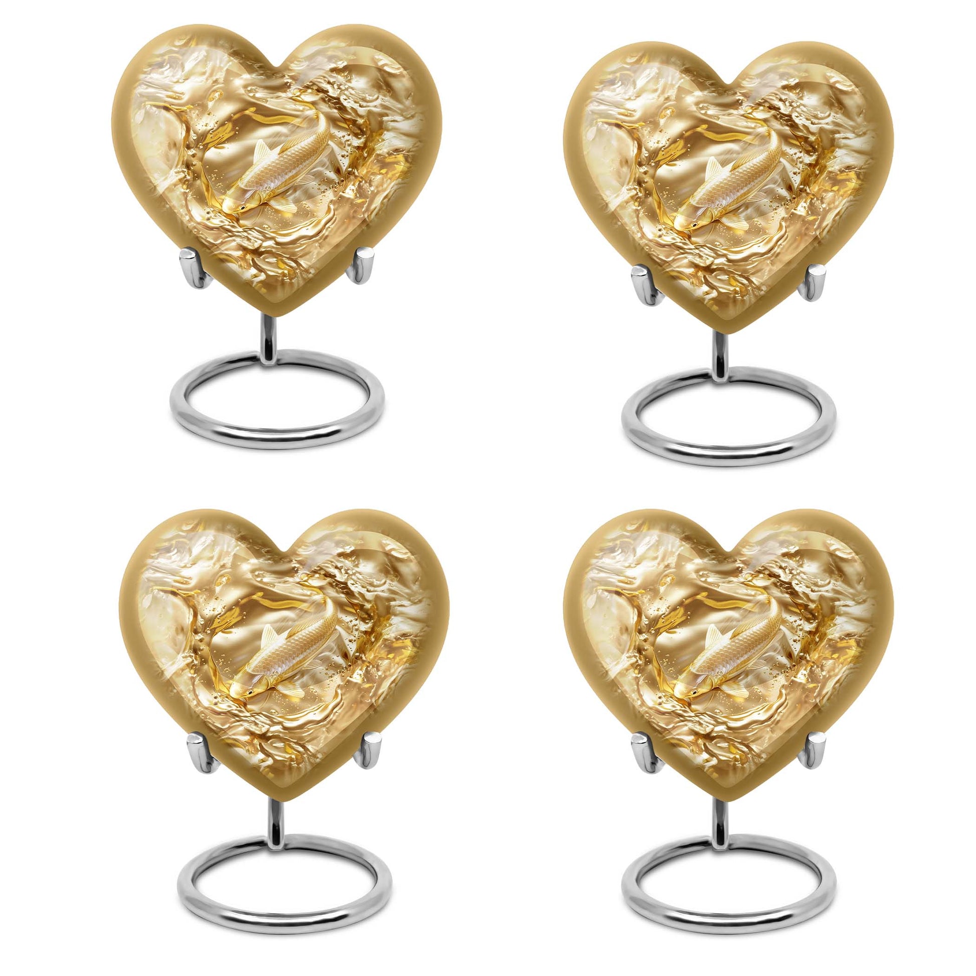 This meticulously crafted 'Gold Fish Urn' rekindles your sentiments for your departed loved ones. It comes in a heart urn themed design, with enchanting butterfly motifs to celebrate their free spirits. This 10-inch large urn, weighing 3.3 pounds, is capable of efficiently containing up to 200 cubic inches of ashes. Made from durable aluminium, this burial urn promises longevity, a dignified homage to your beloved. Each urn arrives with a specially designed velvet pouch to carefully contain the ashes. Highly customizable, it offers the unique feature of personalizing it with engraved names. Its striking allure and robust construction make it an ideal choice for memorial urns and funeral extra large urns alike. As a cremation urn for adult ashes, it appropriately commemorates both men and women, serving as a tangible memory of the departed. Shop this exquisite item to keep the sacred ashes of your humans urn ashes with dignity and love.