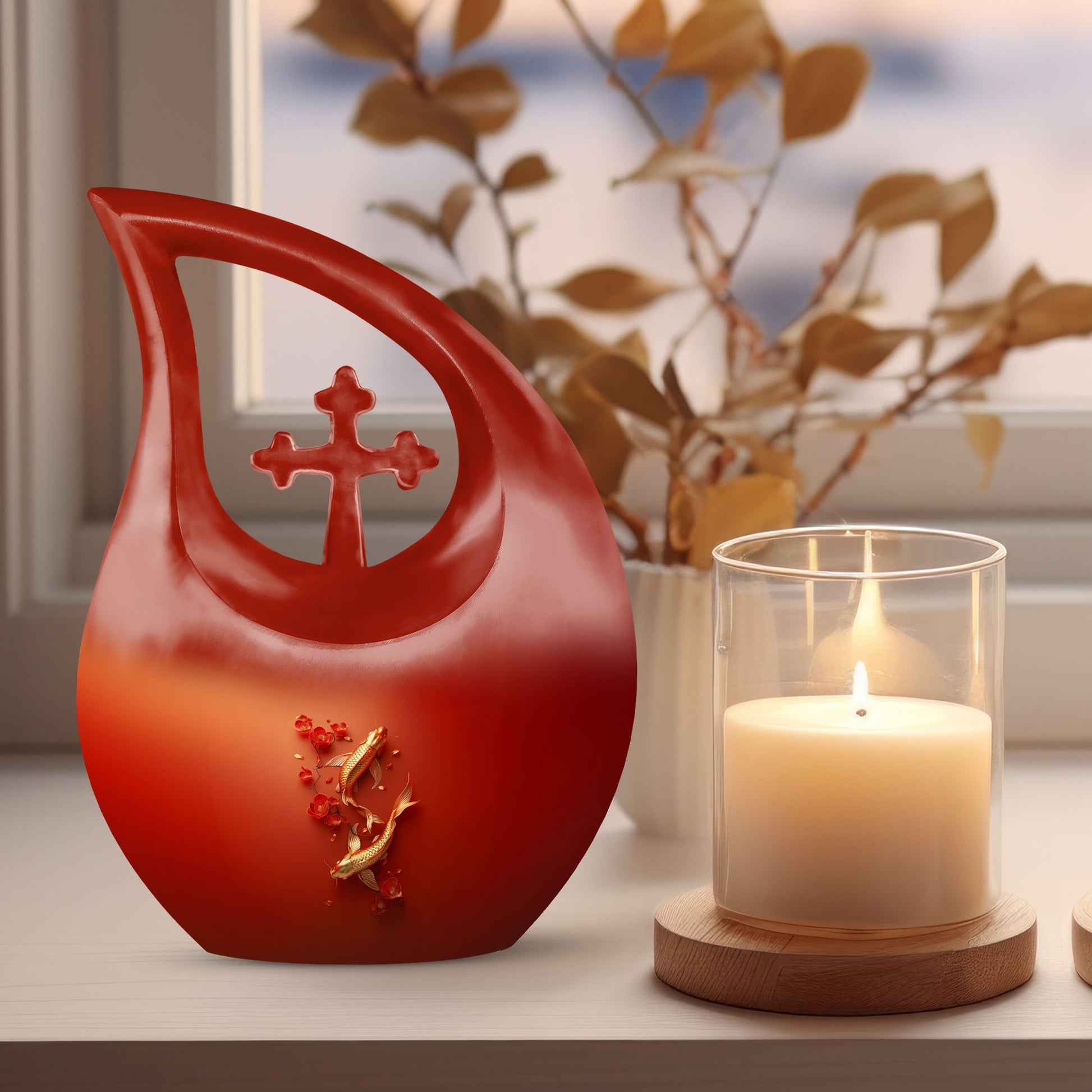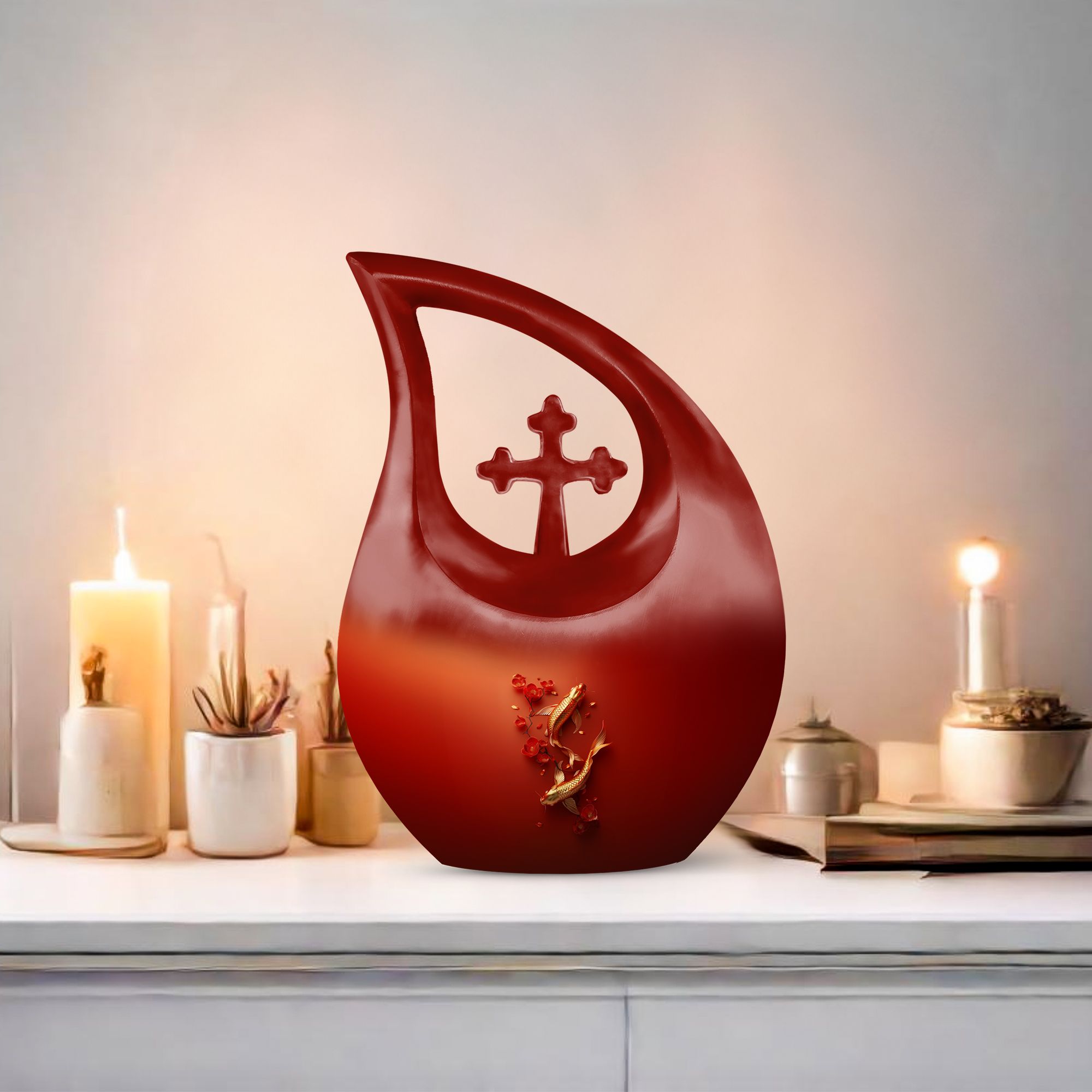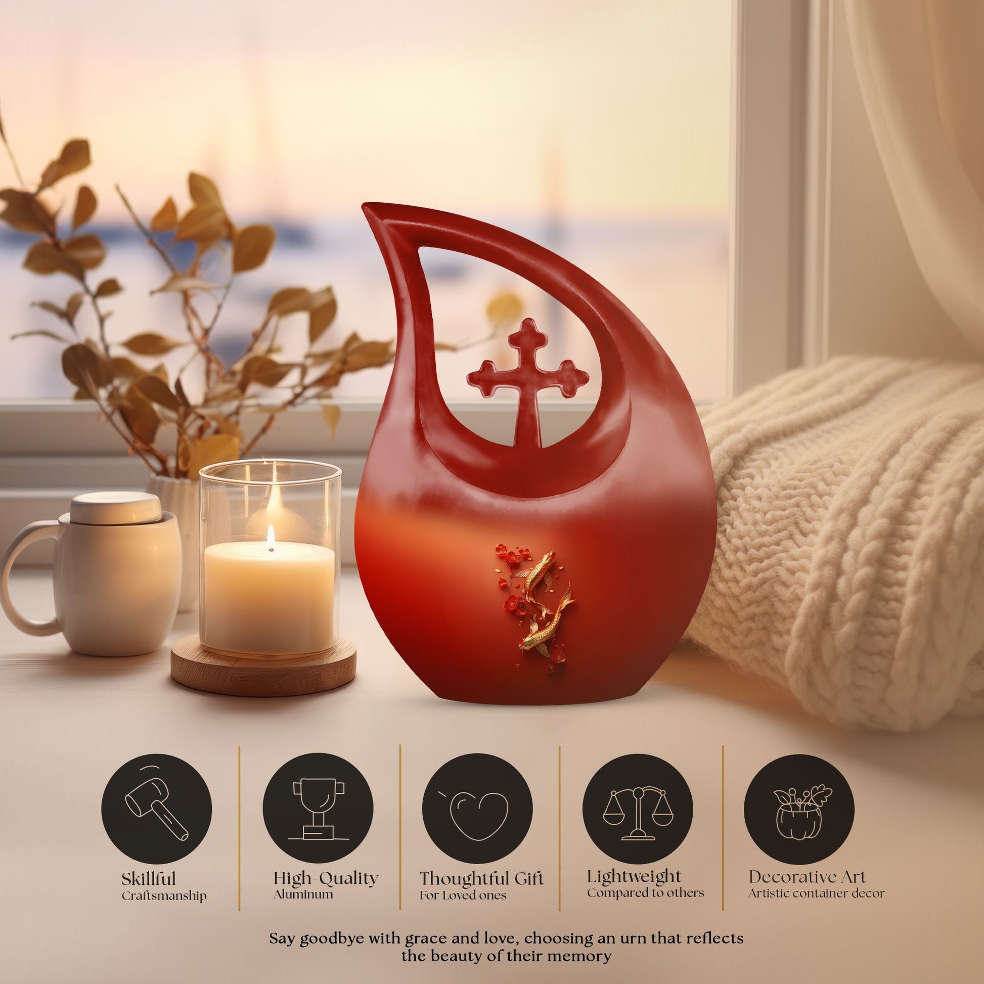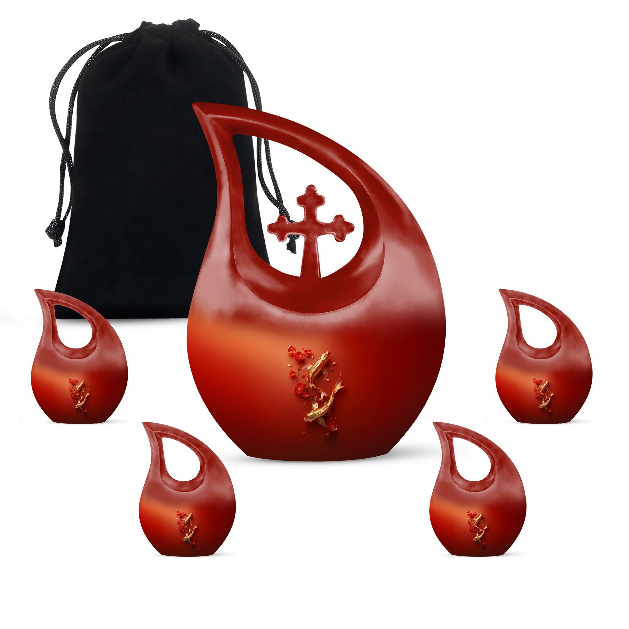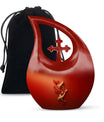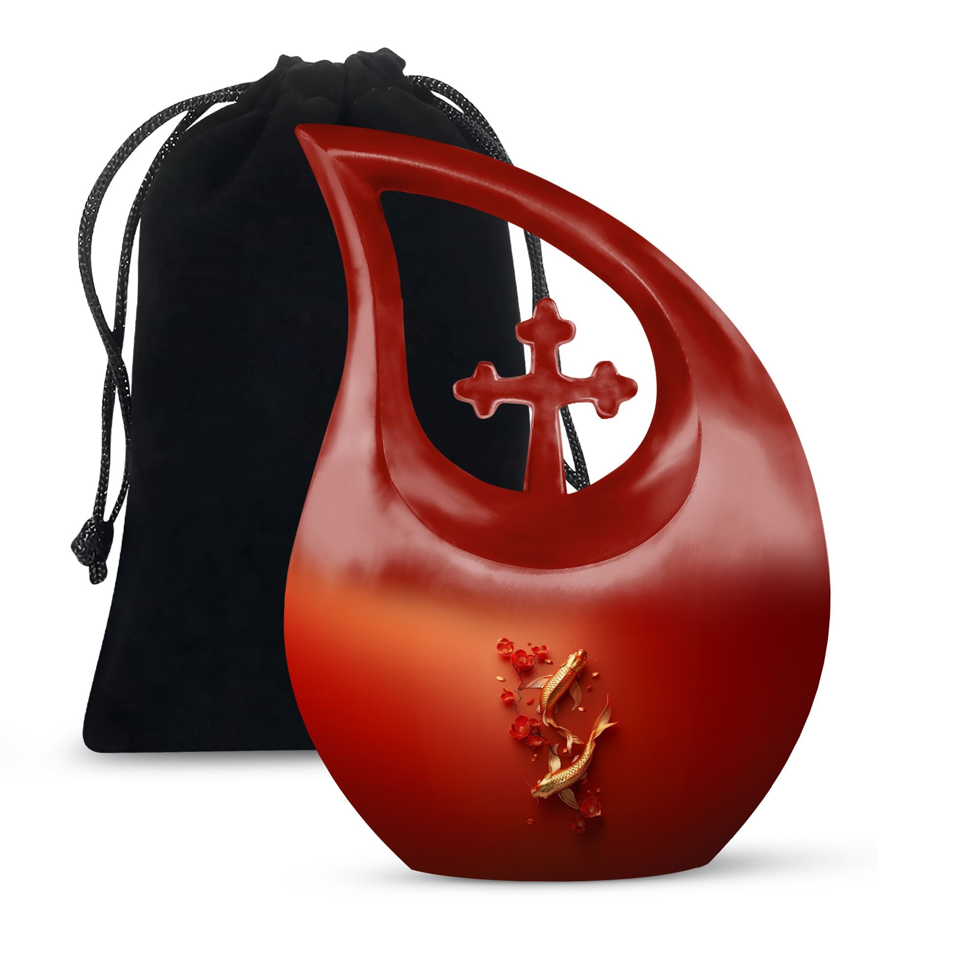 Discover a unique way to honor your loved ones with our Gold Fish Urn – an extraordinary blend of quality craftsmanship and affordability. This large aluminium urn stands at 10 inches high and can hold up to 200 cubic inches of ashes, perfect for adults. Its Cross Drop theme creates an atmosphere of tranquility, making it an ideal choice for memorial ceremonies. We understand the weight of this sensitive time, which is why our urn, although 3.3 pounds in weight, comes with a velvet pouch to ensure careful containment of the ashes. Add a personal touch by engraving names, making this urn a timeless tribute to your loved one's memory. Our urn is not merely a container; it's a true testament of love and respect for those who have touched our lives profoundly. Search terms: Urns For Ashes For Adults, Affordable Cremation Urns, or Cheap Funeral Urns to find this premium yet cheap cremation urn on sale.